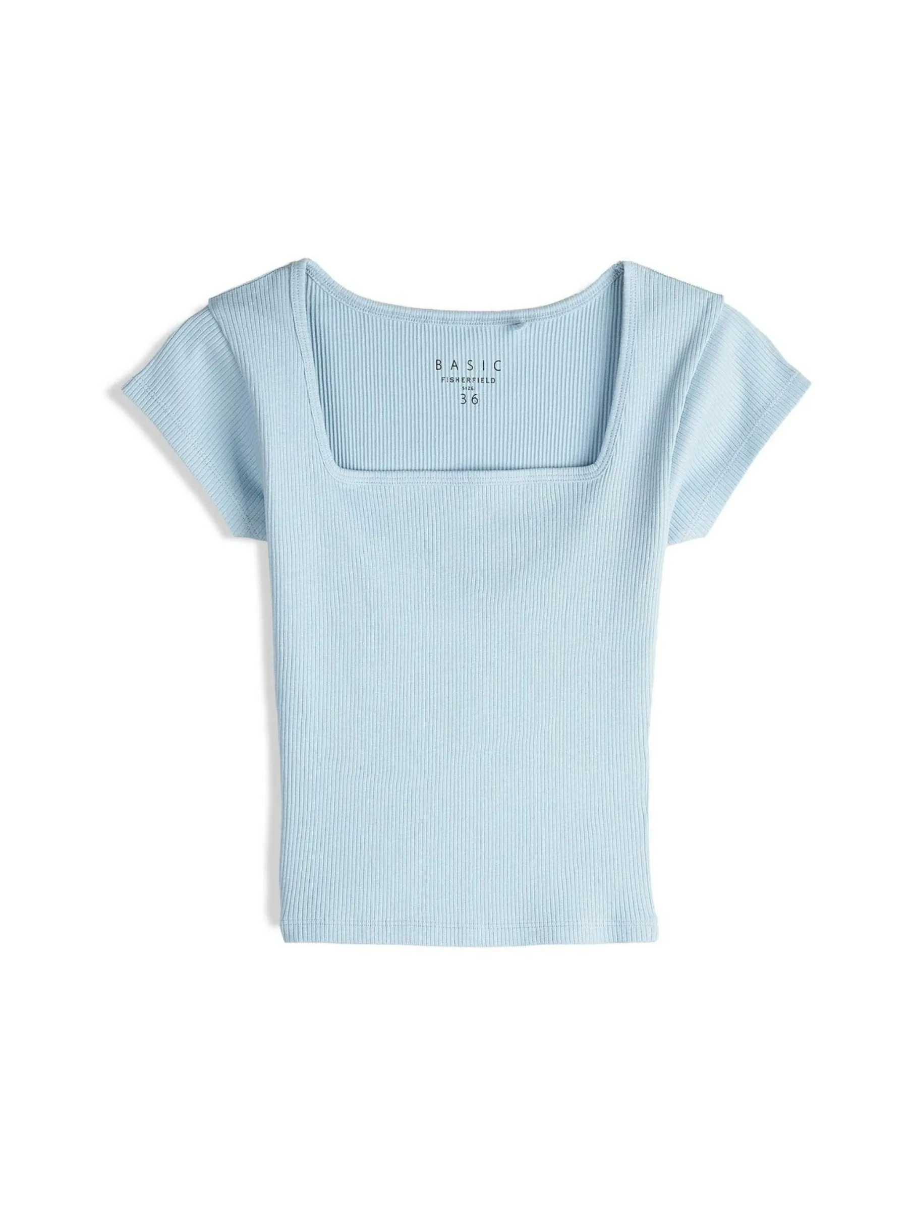 Kolor: niebieskiKrój: regularTyp: koszulkaRekaw: krótki rękawDługość: krótkiPattern style: pojedynczy kolor, żeb…