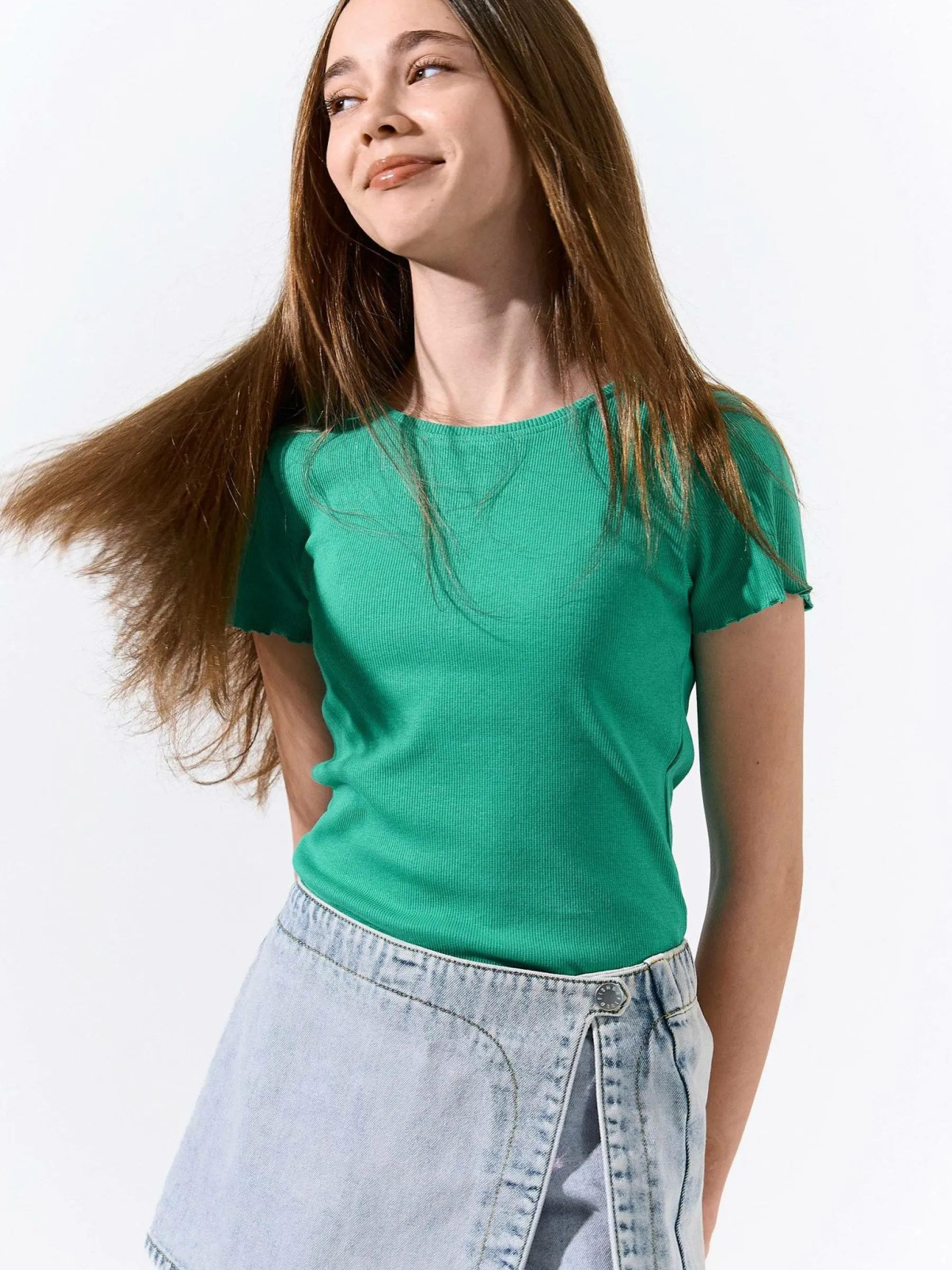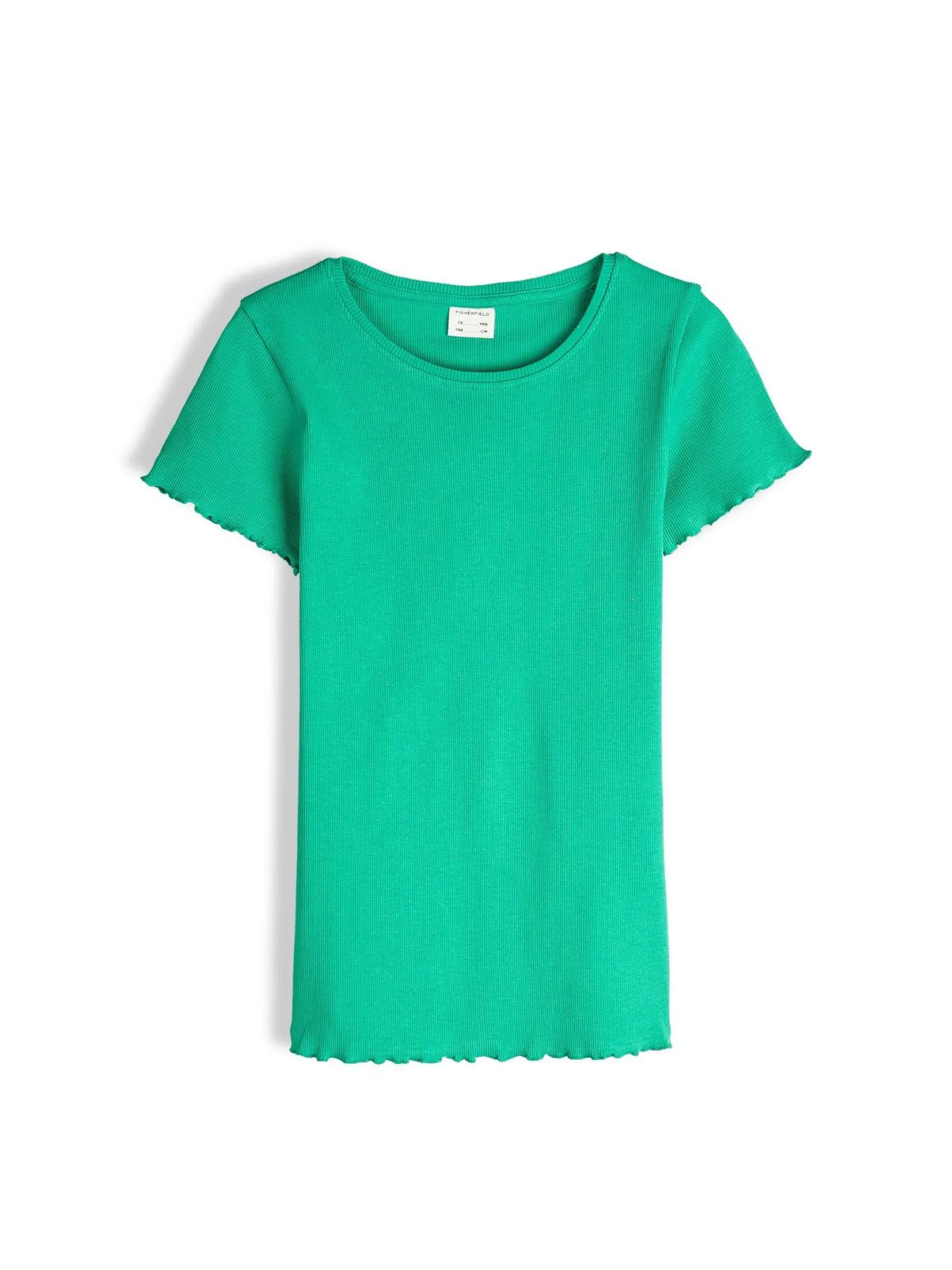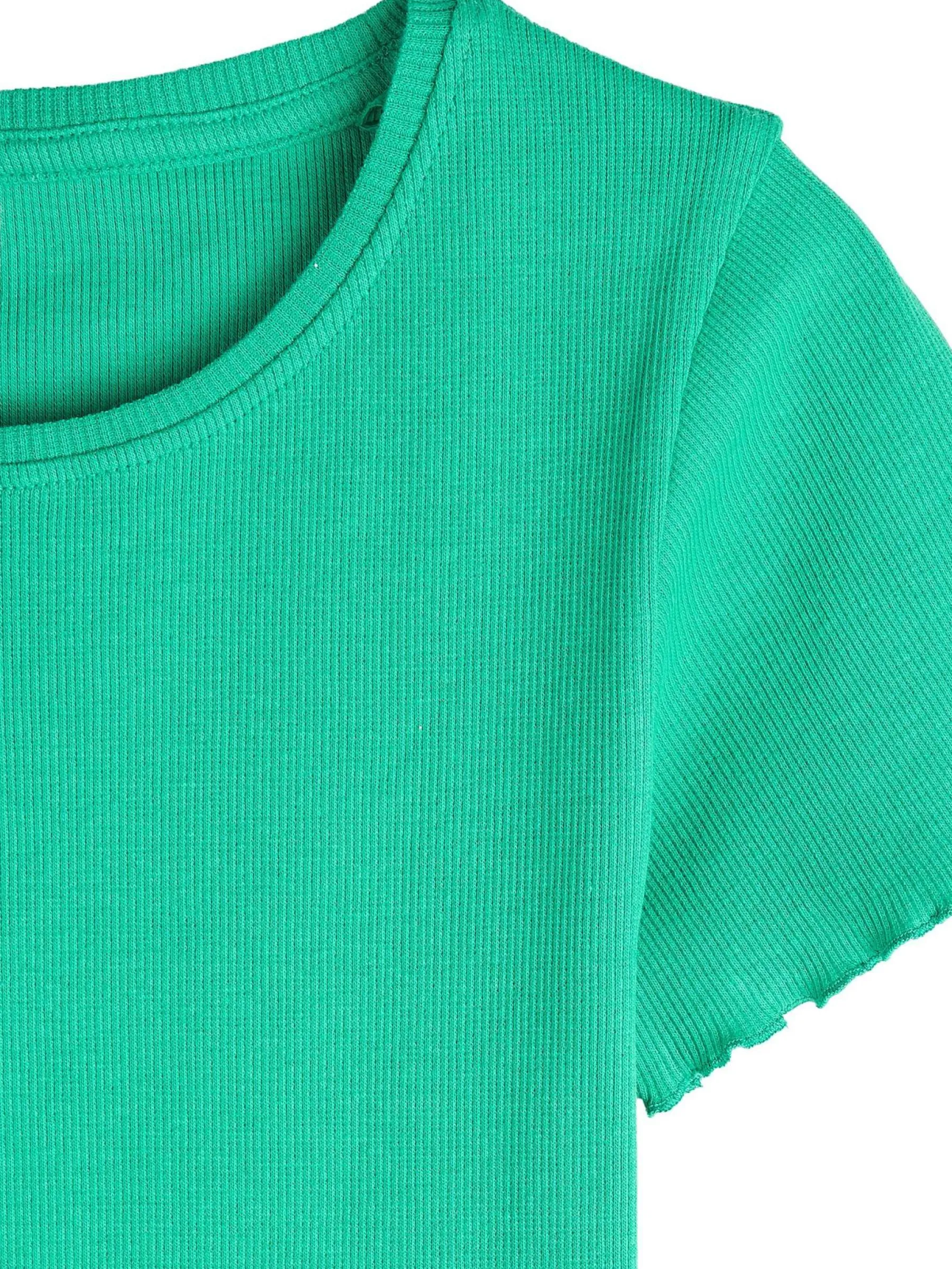 Kolor: zielonyKrój: regularTyp: koszulkaRekaw: krótki rękawDługość: krótkiPattern style: pojedynczy kolor, żebro…