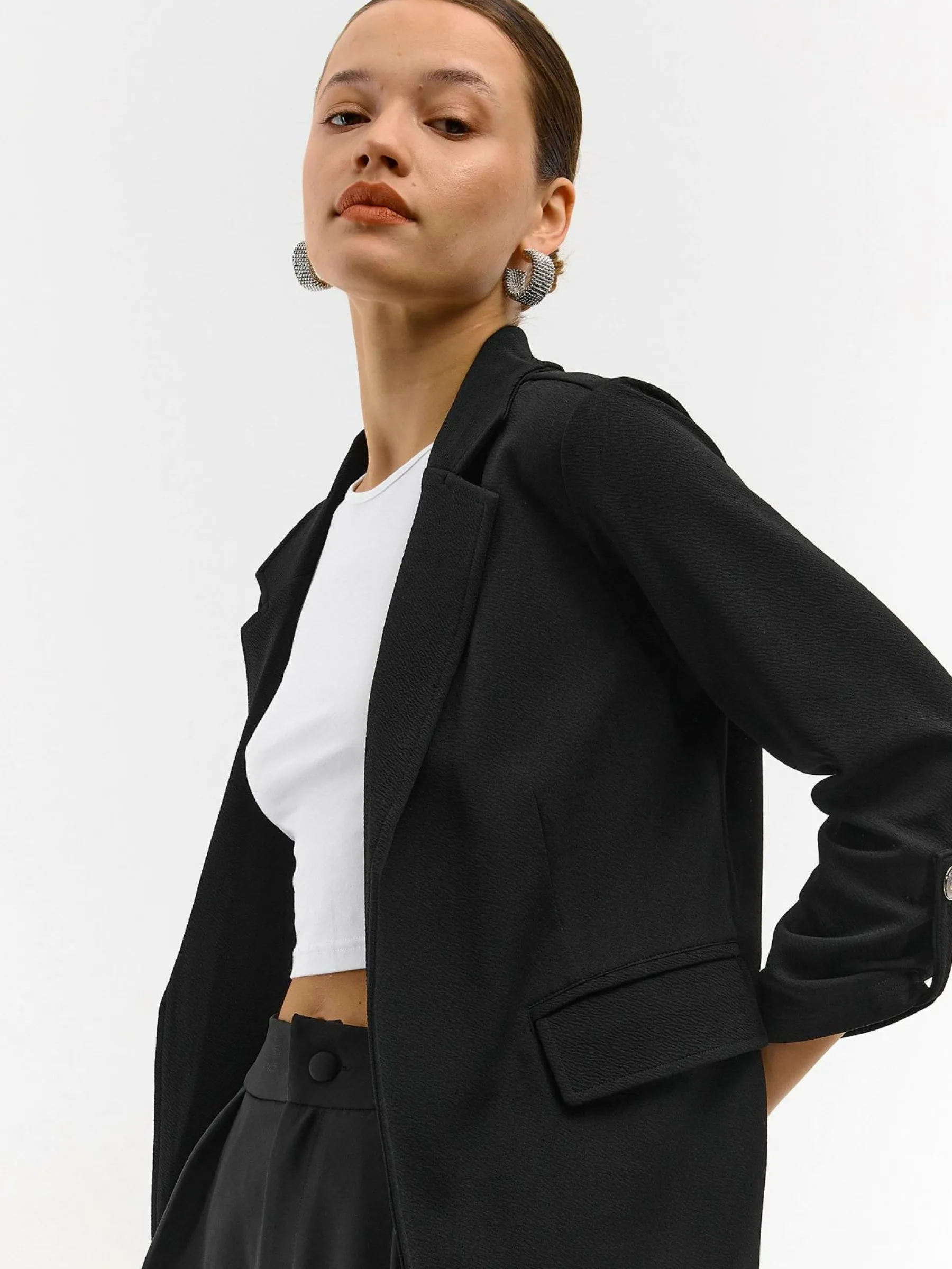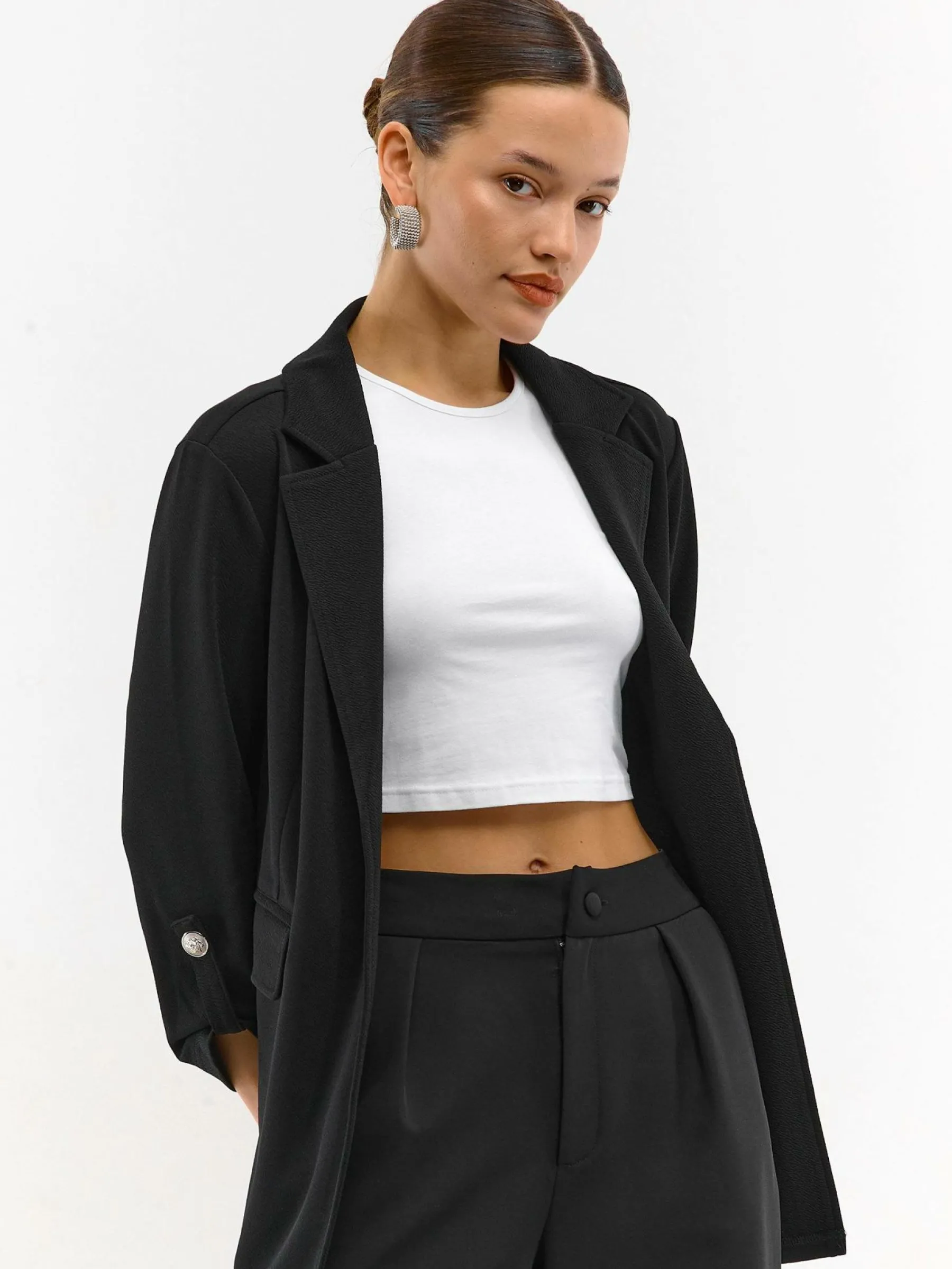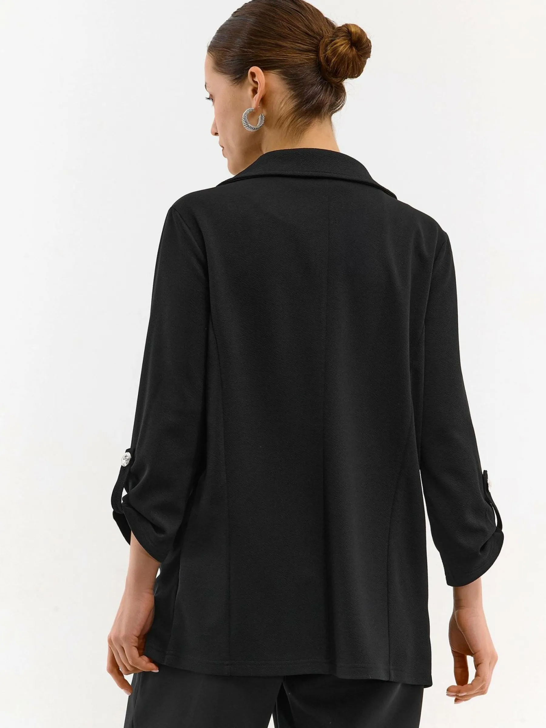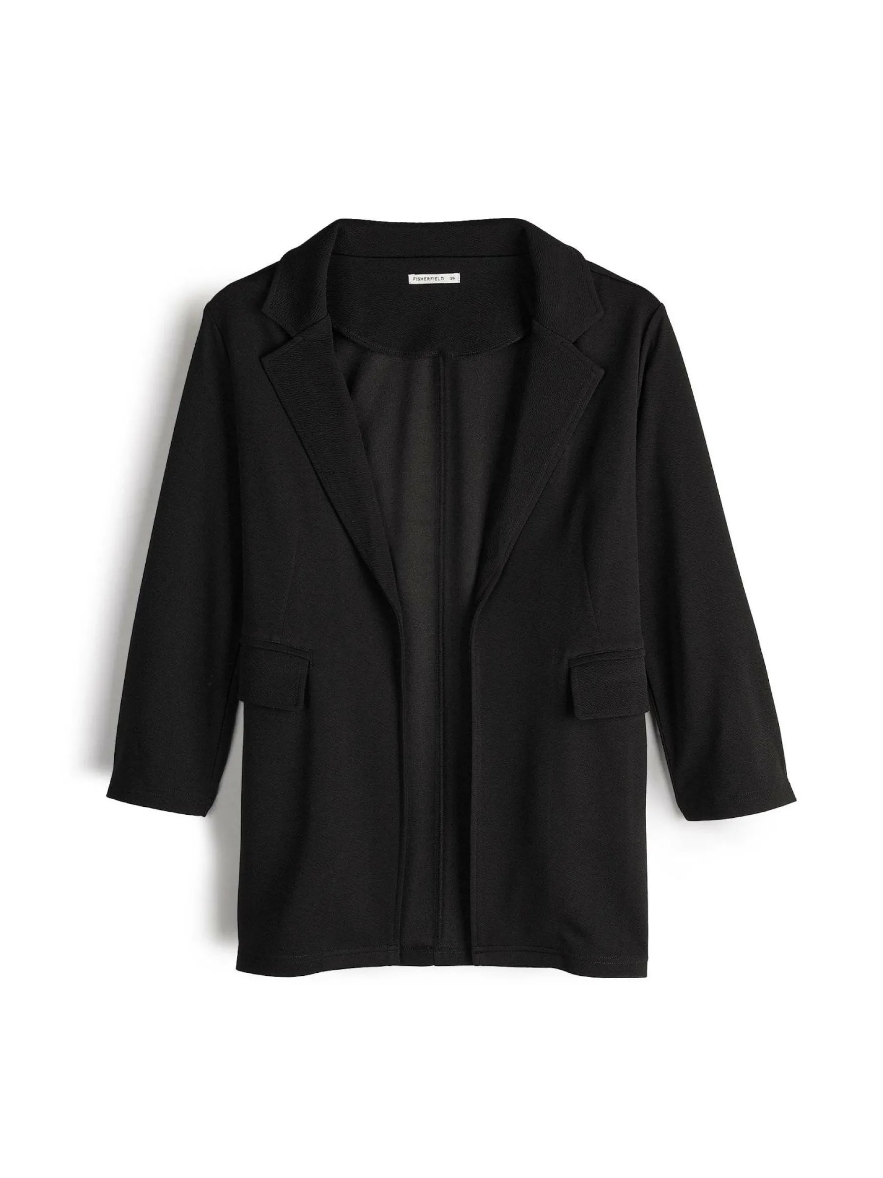 Kolor: czarnyKrój: podstawowyTyp: blezerRekaw: rękaw 3/4Długość: dlugiePattern style: pojedynczy kolorDetal: bez za…