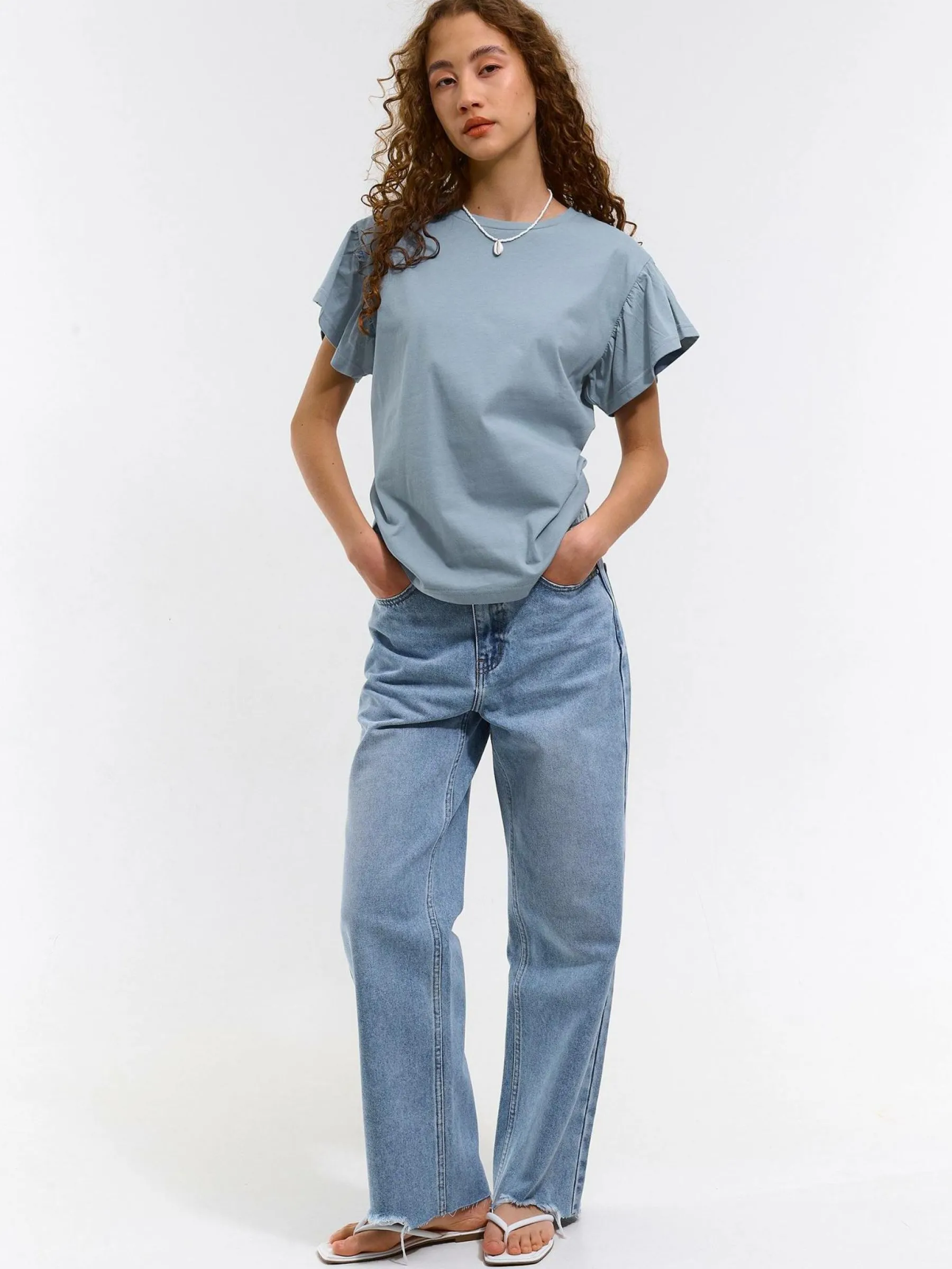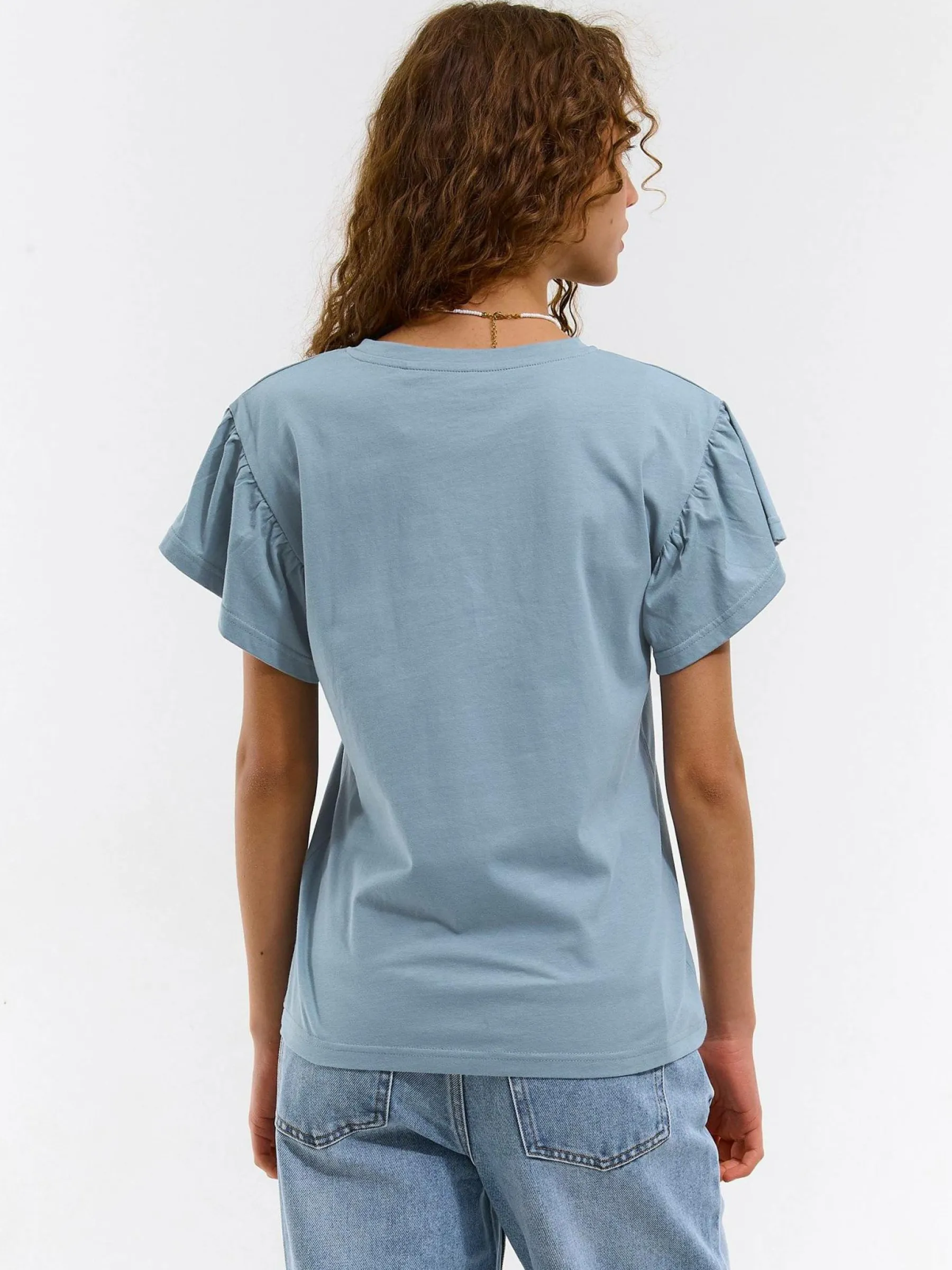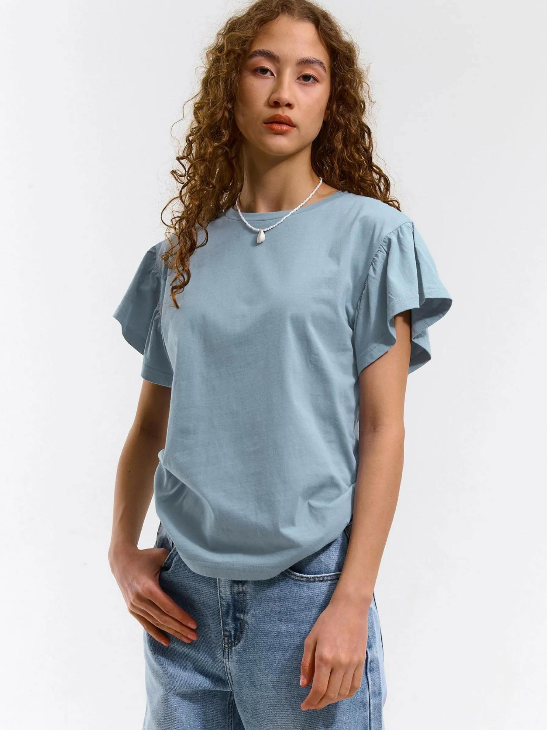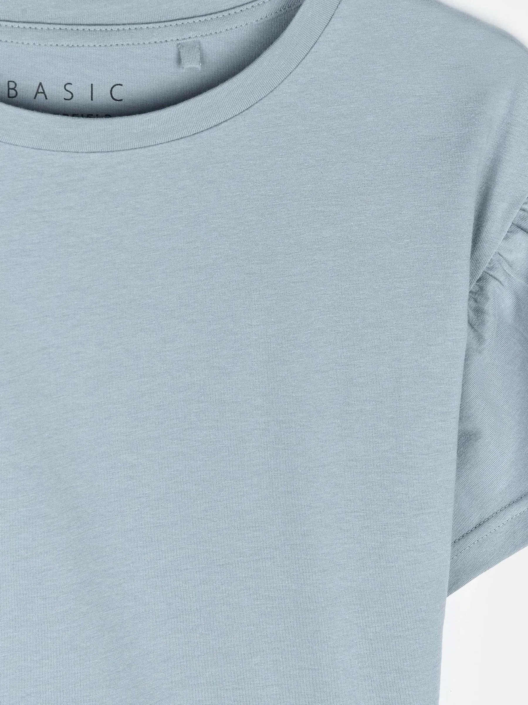 Kolor: niebieskiKrój: z falbanąTyp: koszulkaRekaw: krótki rękawDługość: krótkiPattern style: pojedynczy kolorDet…