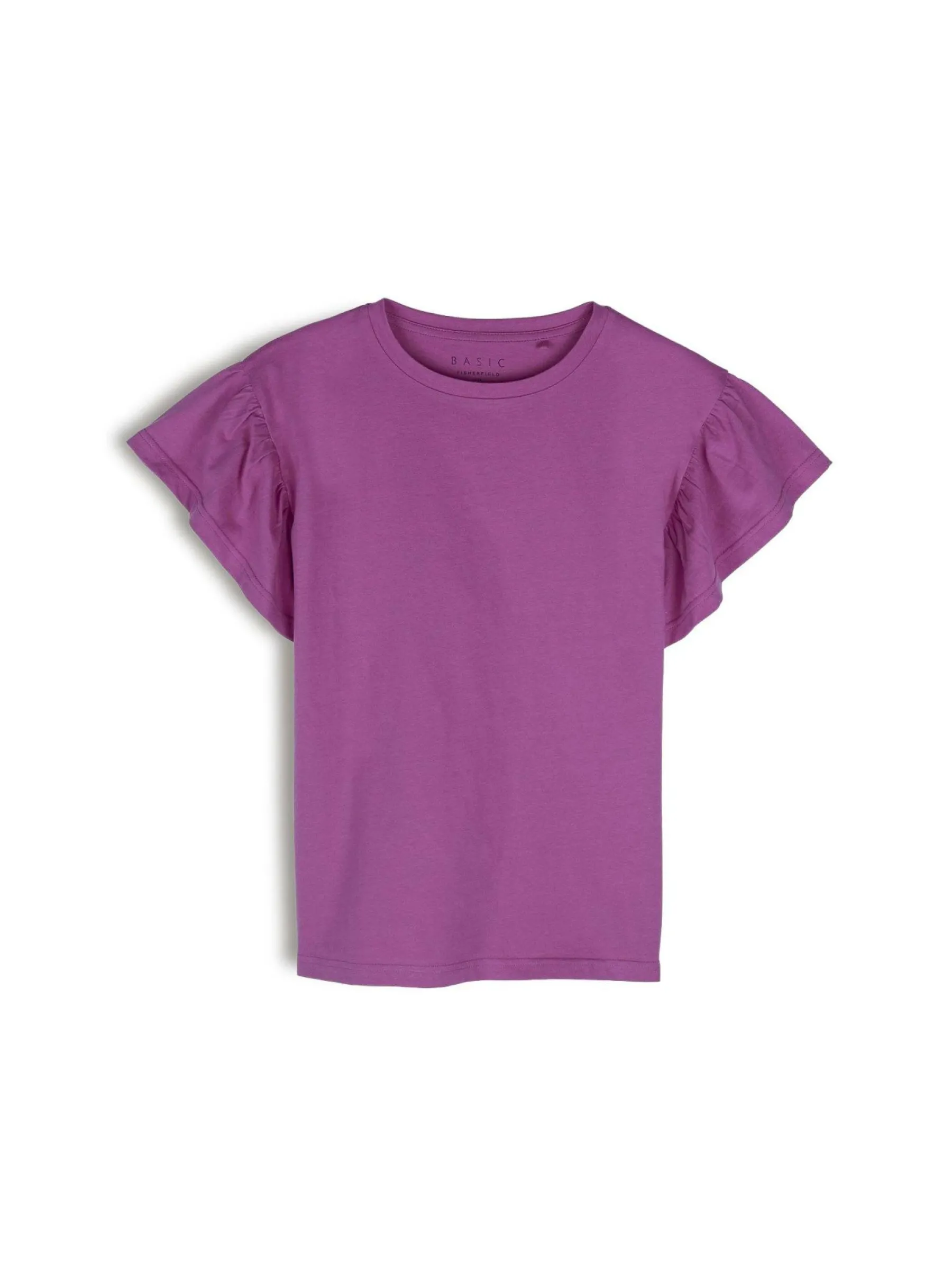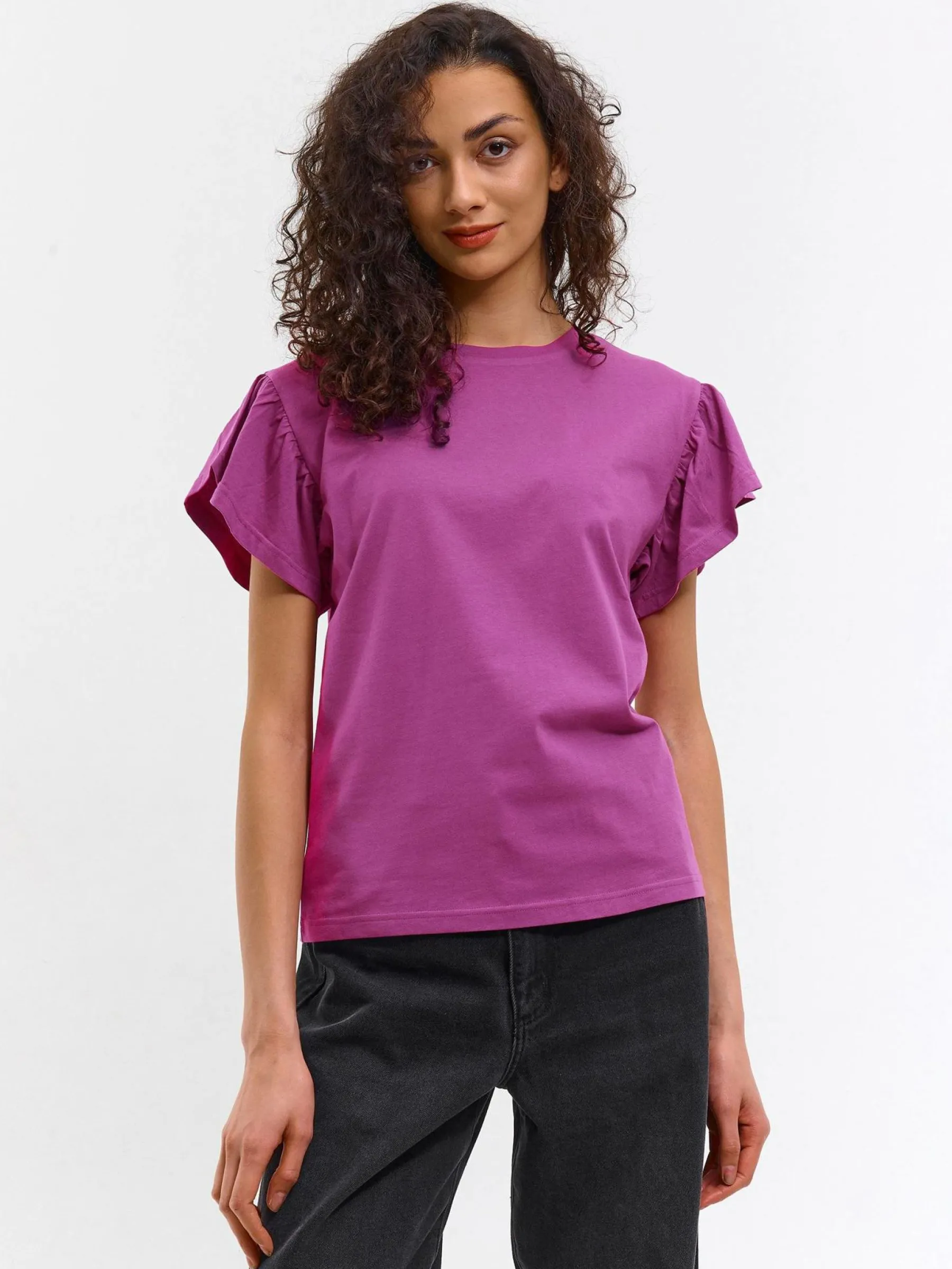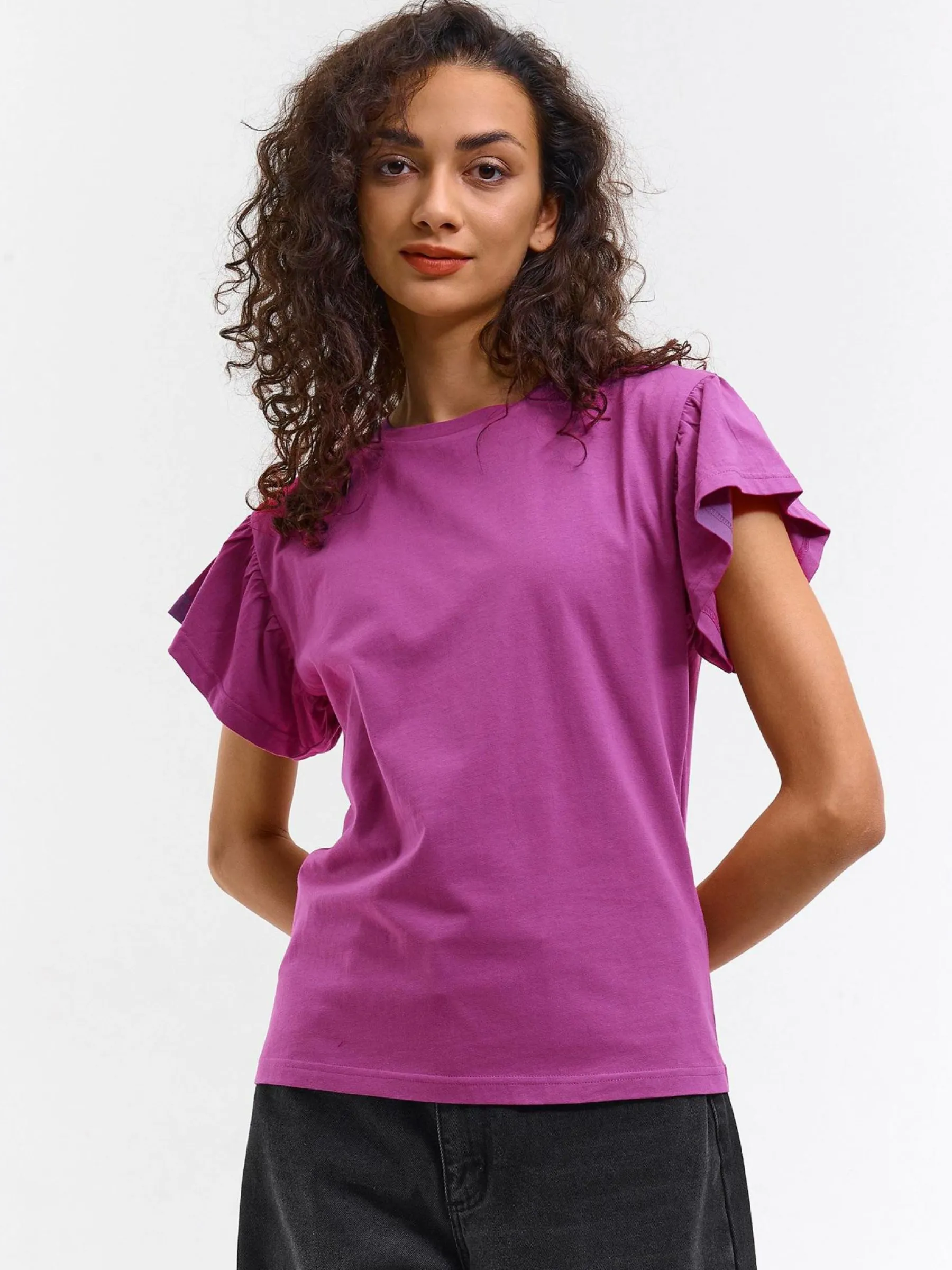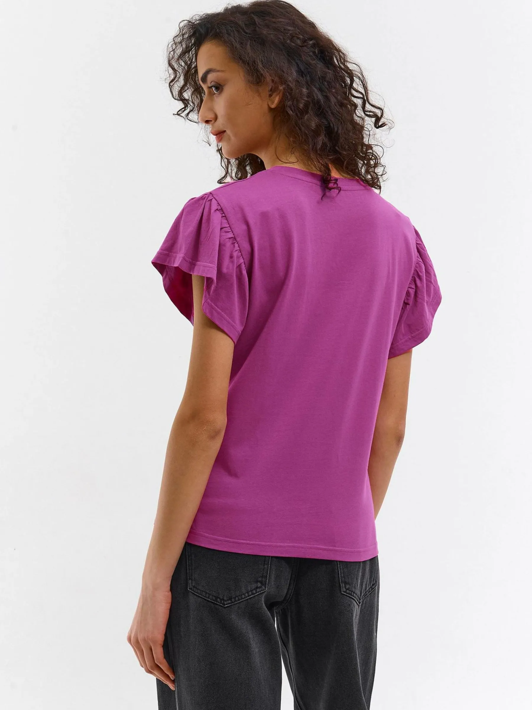 Kolor: różowyKrój: z falbanąTyp: koszulkaRekaw: krótki rękawDługość: krótkiPattern style: pojedynczy kolorDeta…