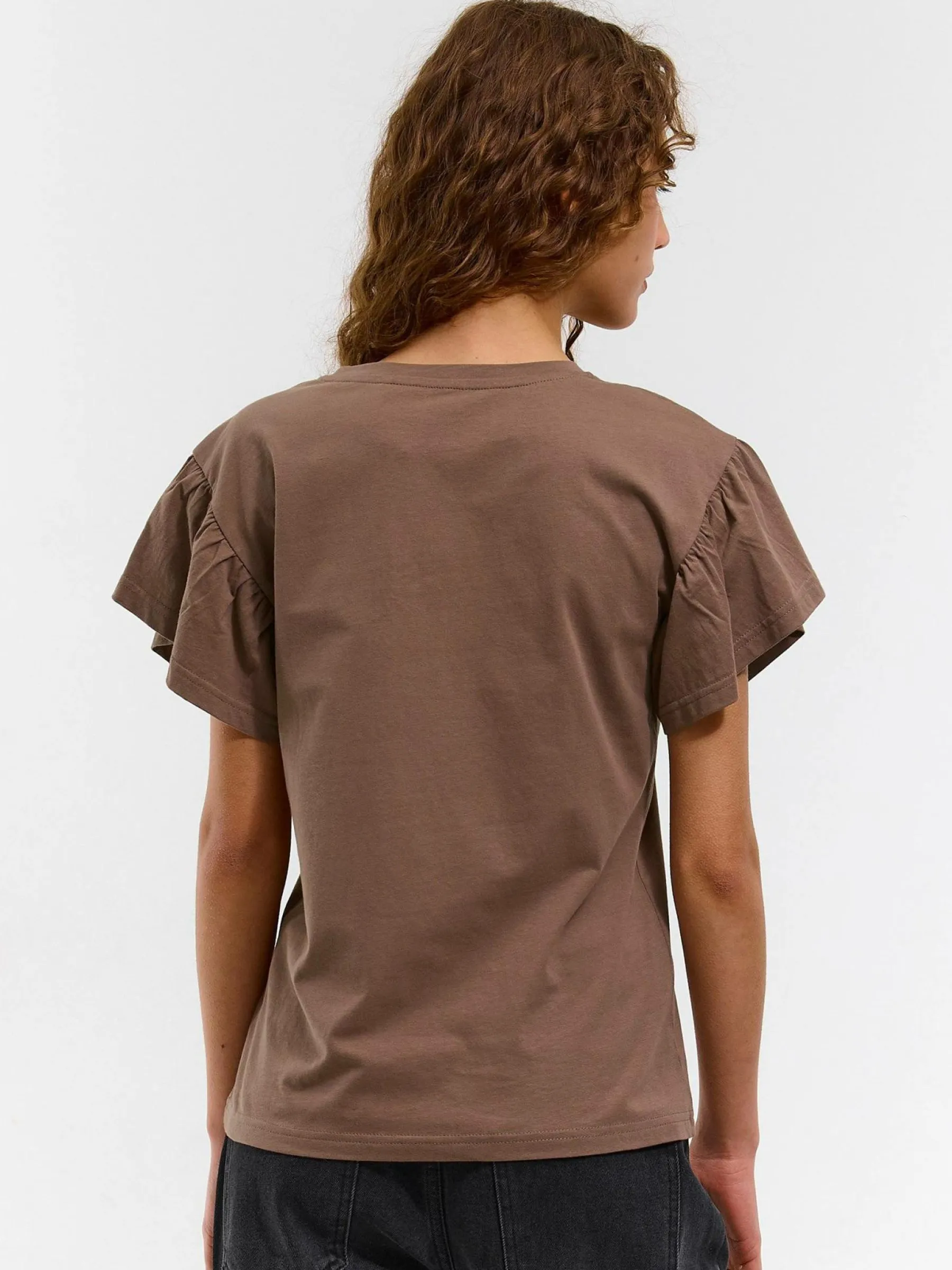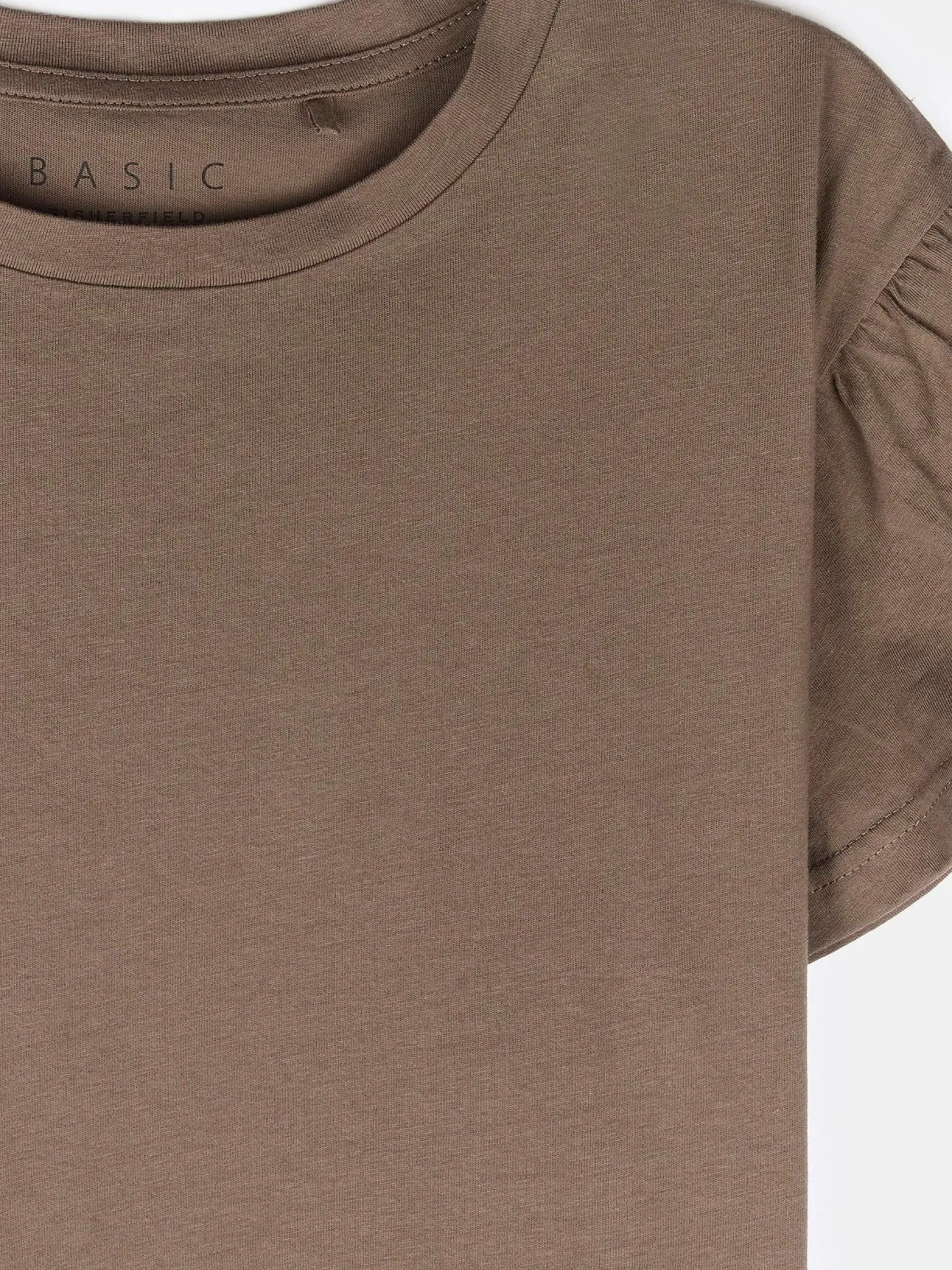 Kolor: brązowyKrój: z falbanąTyp: koszulkaRekaw: krótki rękawDługość: krótkiPattern style: pojedynczy kolorDeta…