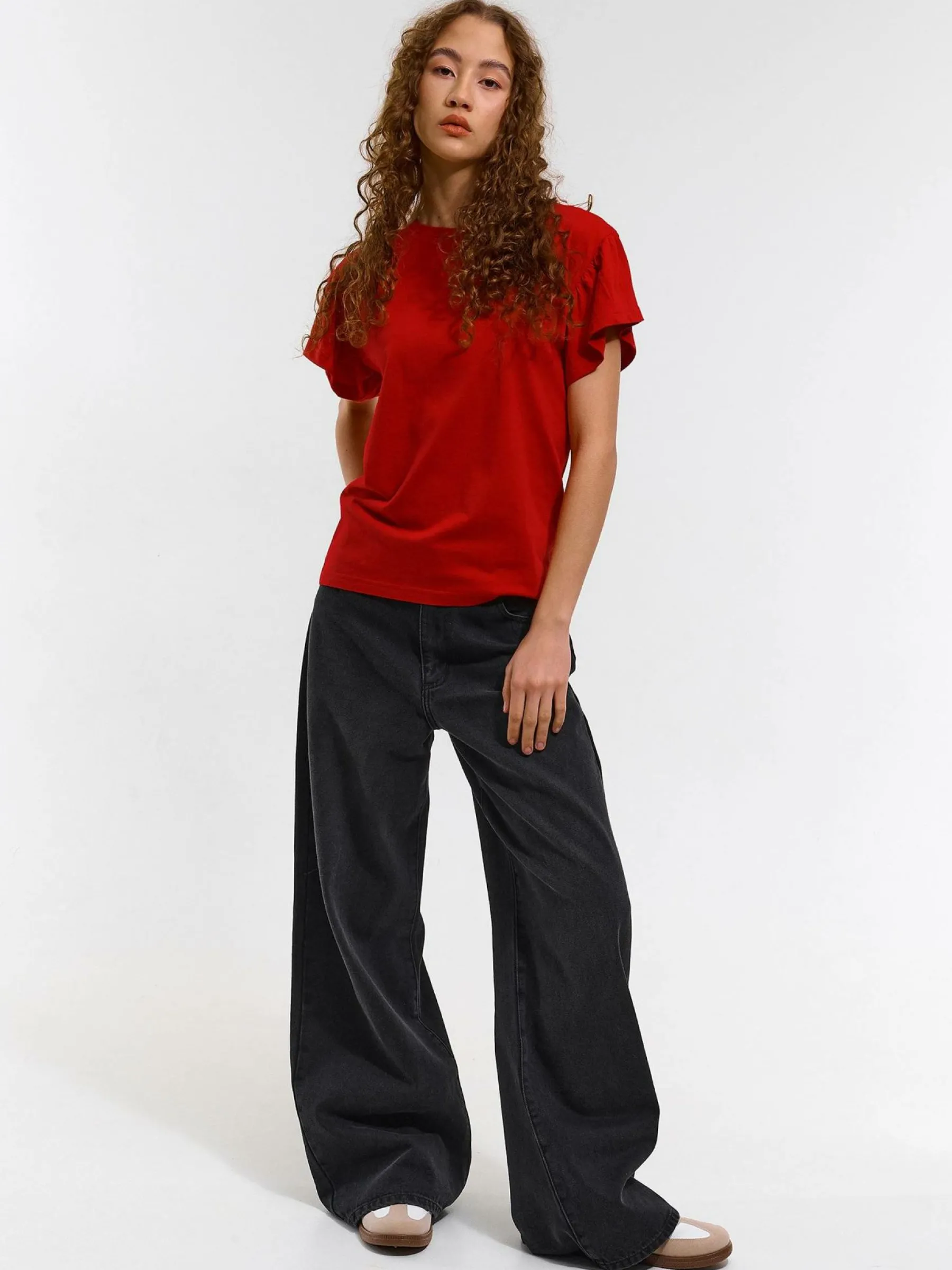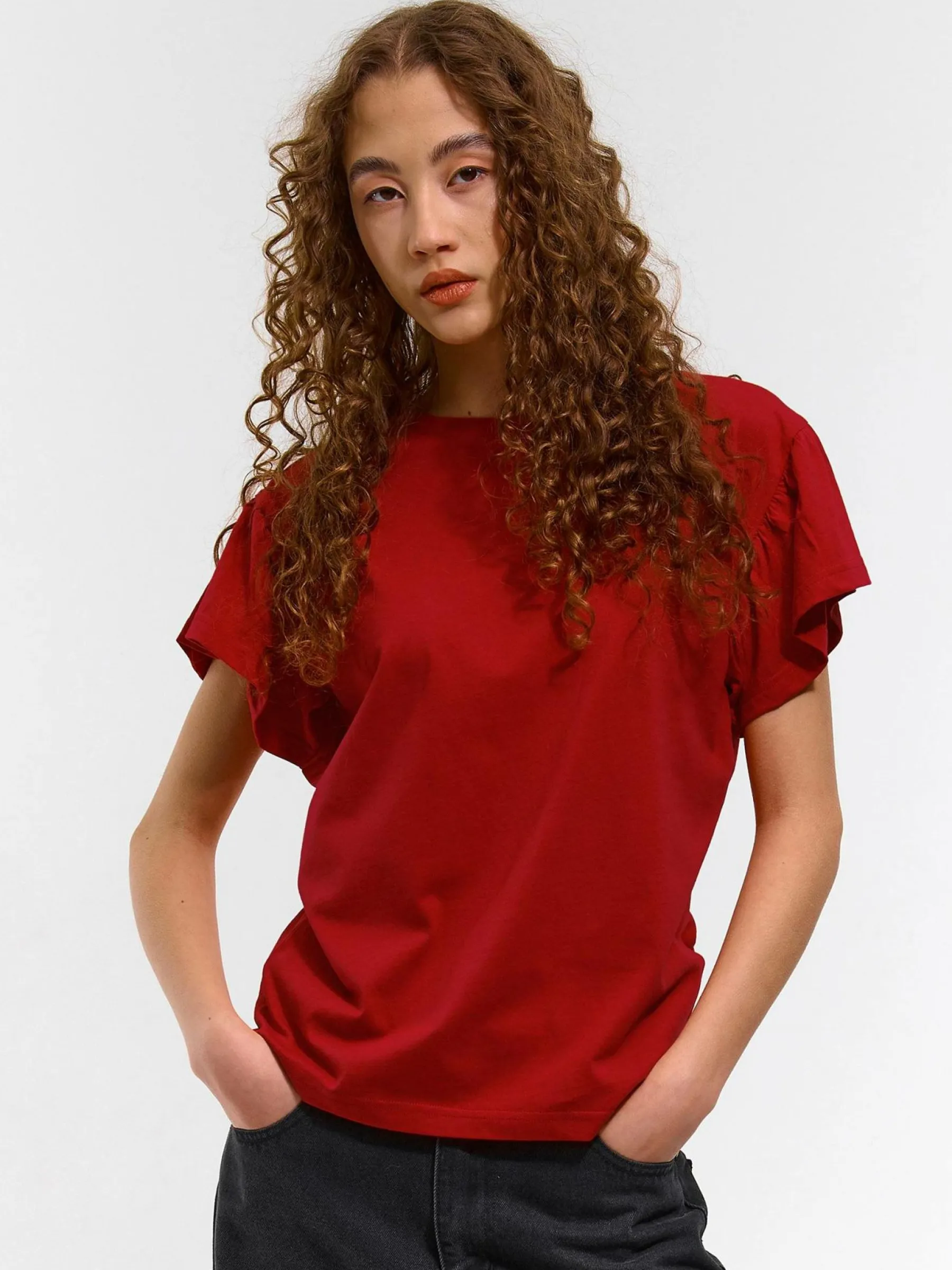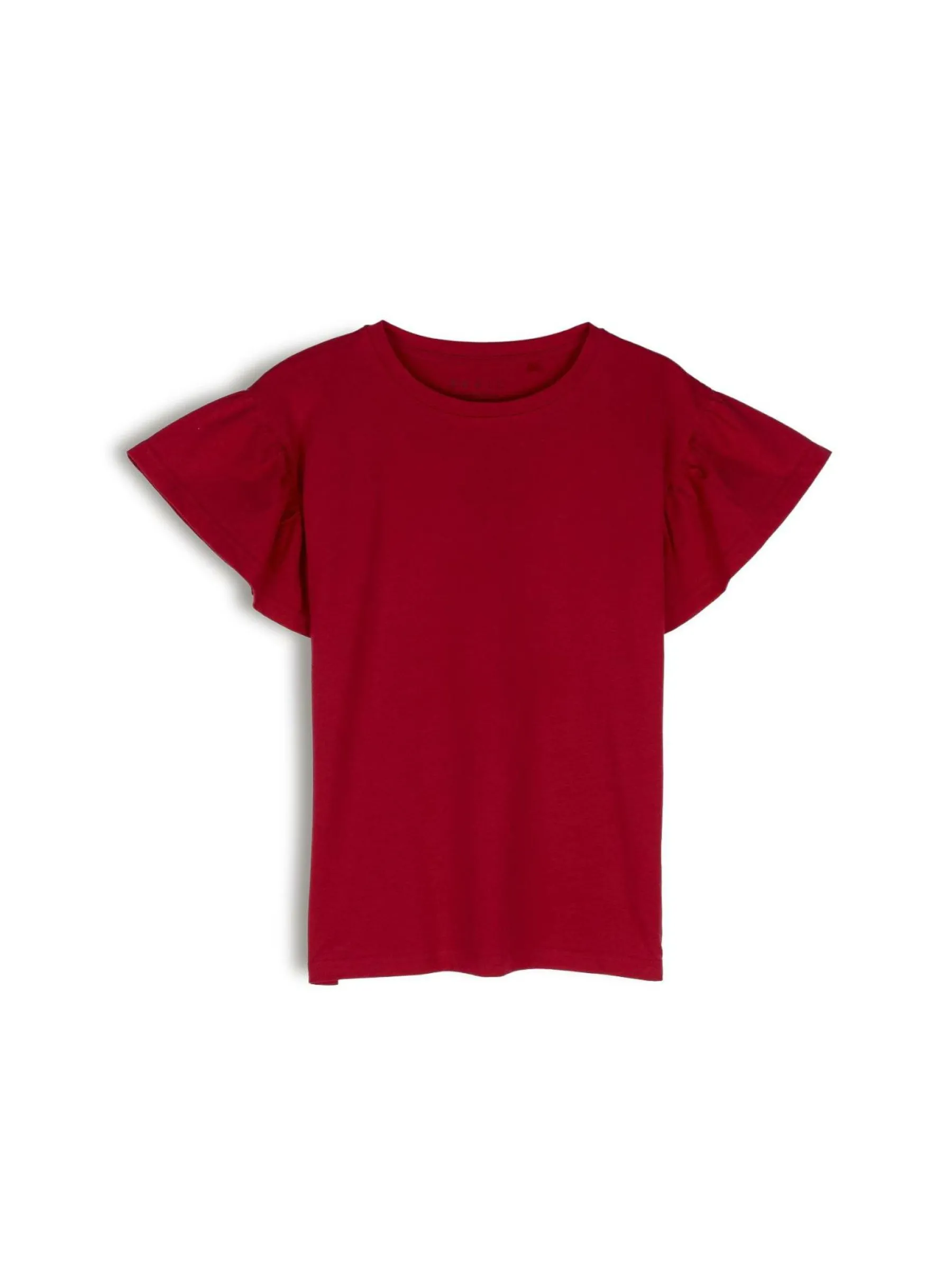 Zdjęcia z modelką mogą nie odpowiadać rzeczywistemu kolorowi produktu.Kolor: czerwonyKrój: z falbanąTyp: koszulkaR…