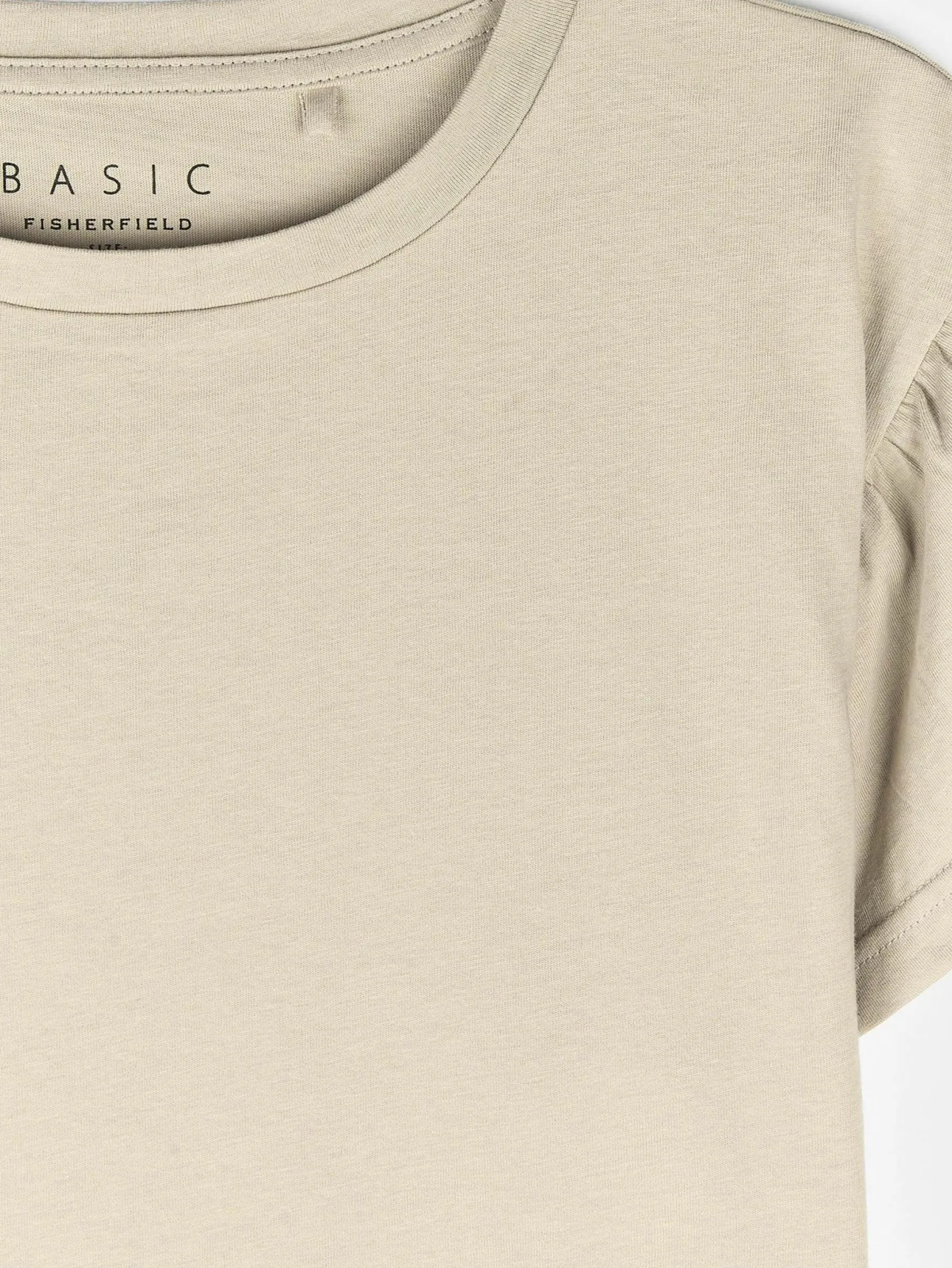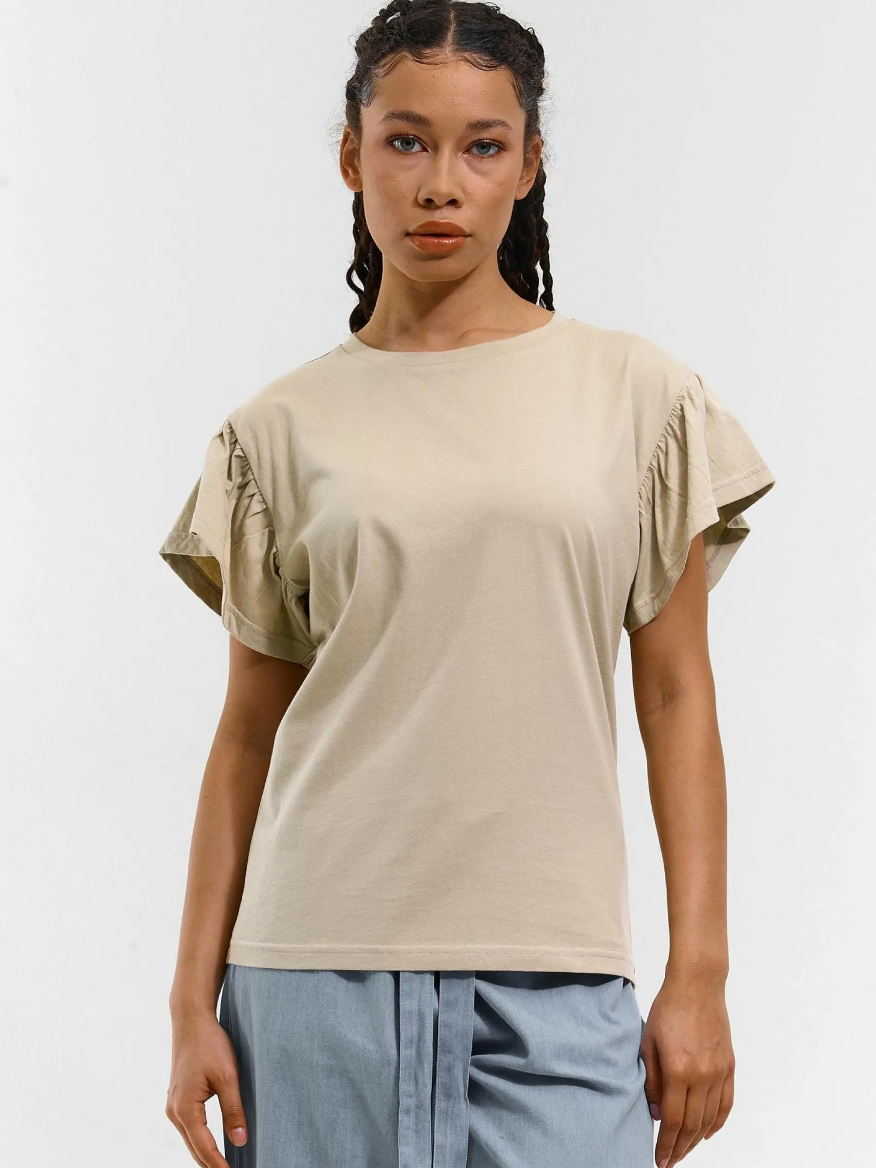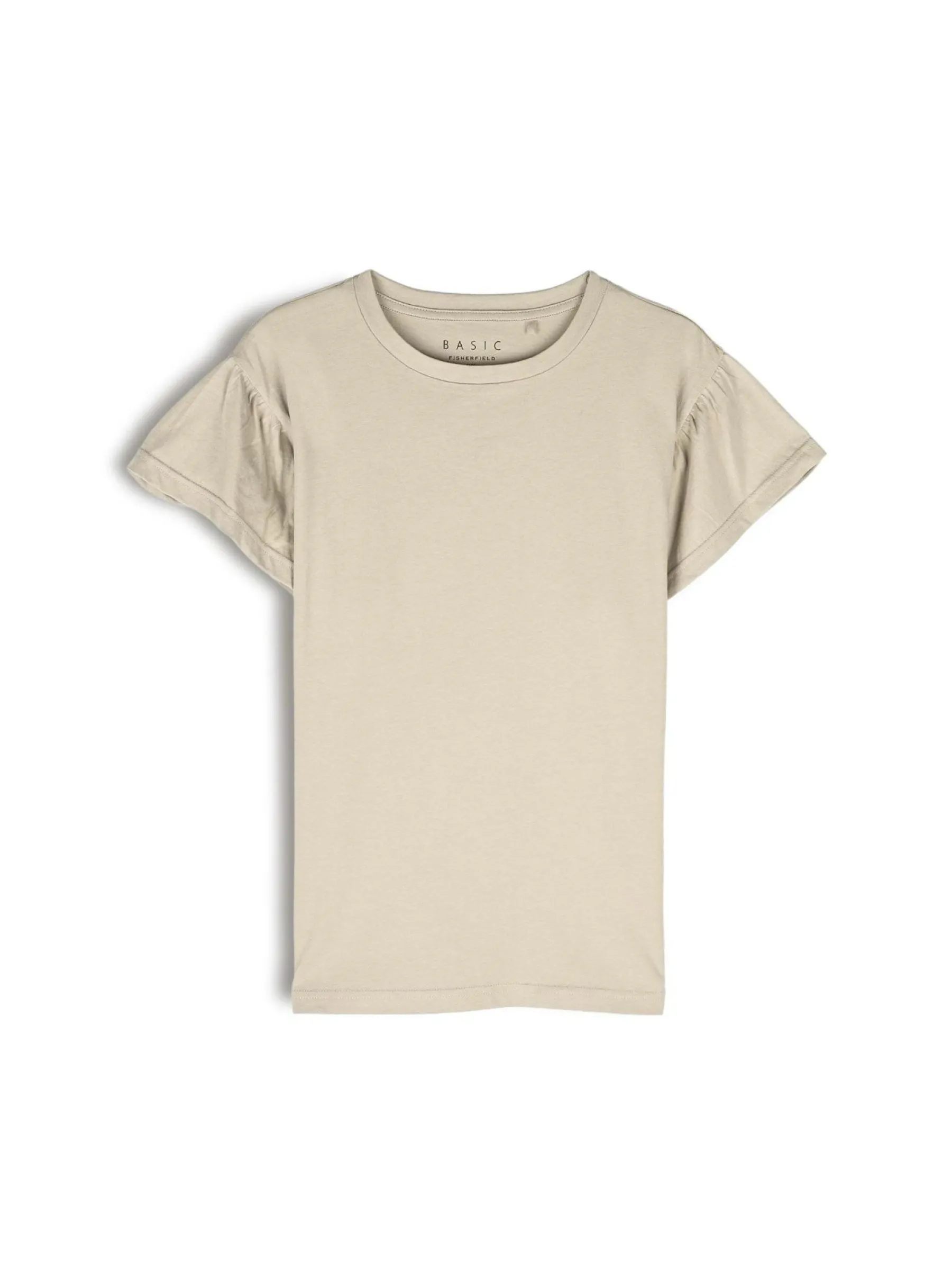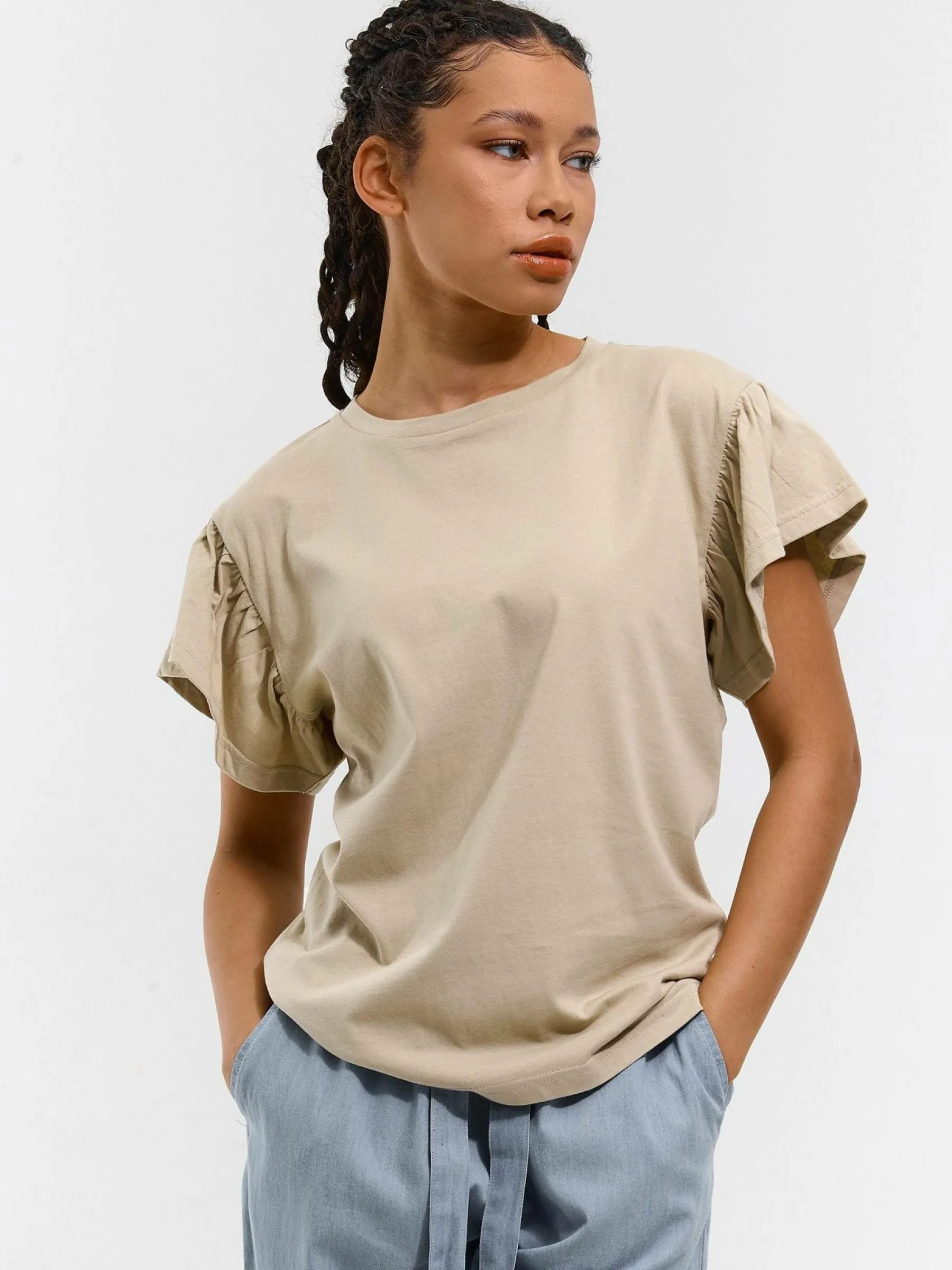 Kolor: beżowyKrój: z falbanąTyp: koszulkaRekaw: krótki rękawDługość: krótkiPattern style: pojedynczy kolorDetal…