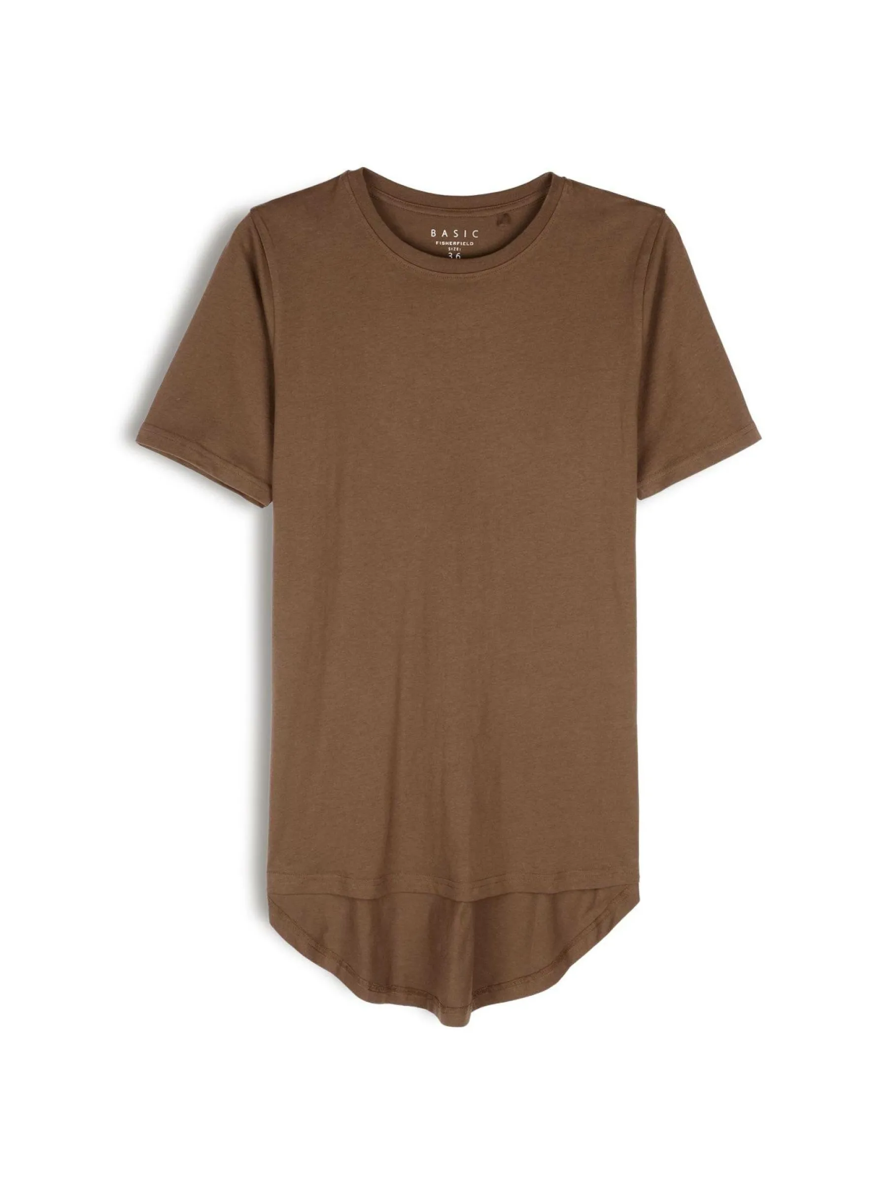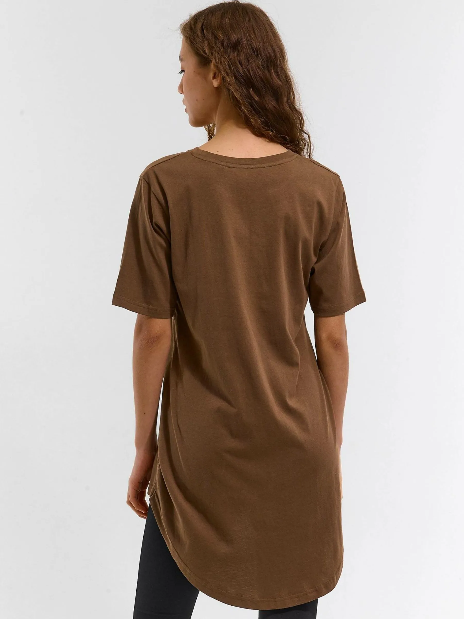Kolor: brązowyKrój: asymetryczneTyp: koszulkaRekaw: krótki rękawDługość: dlugiePattern style: pojedynczy kolorDet…