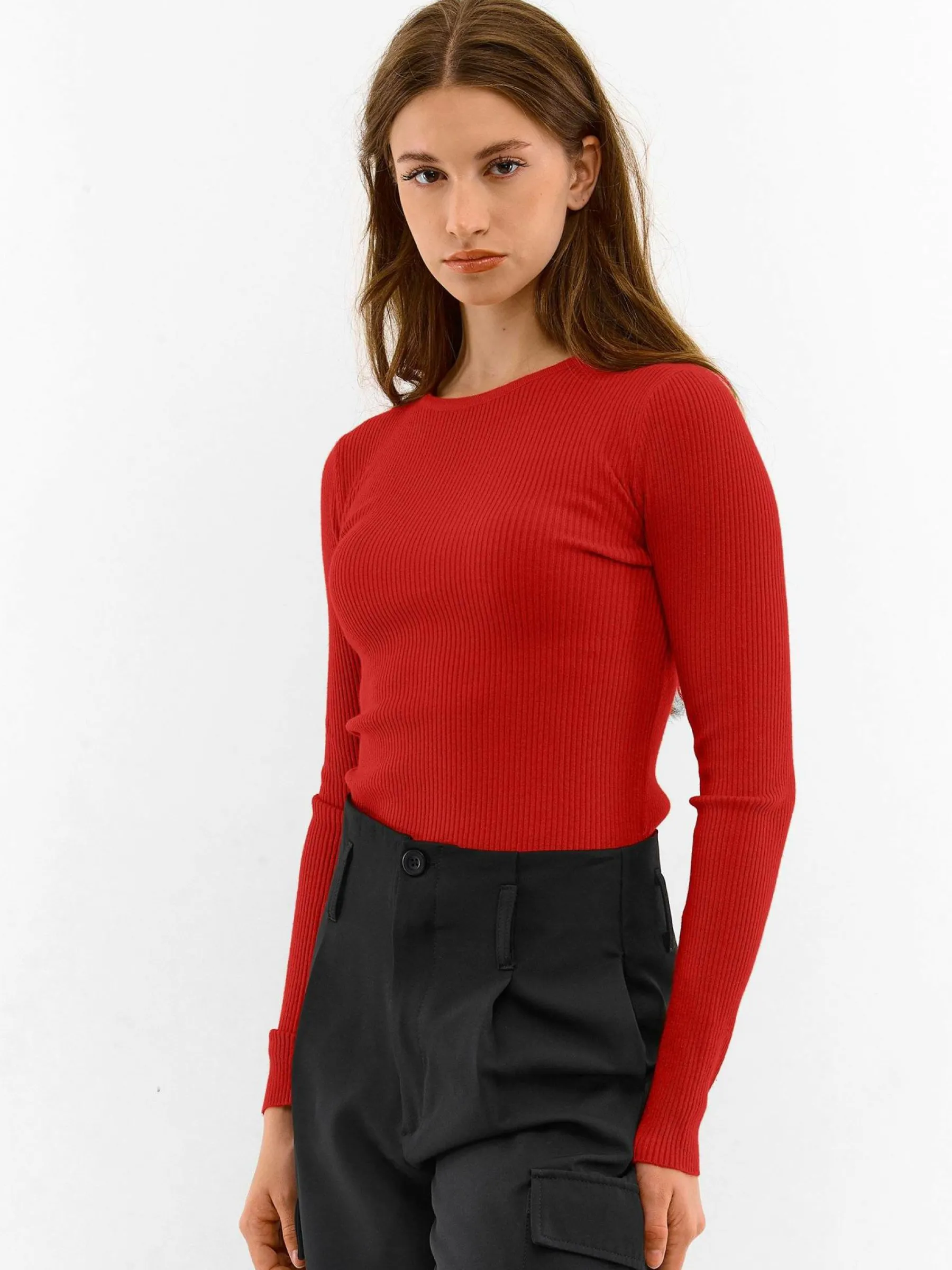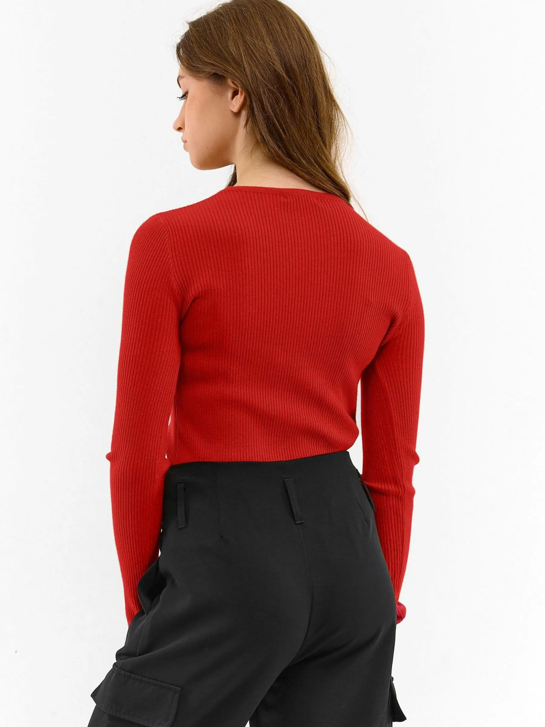 Kolor: czerwonyKrój: regularTyp: swetryRekaw: długi rękawDługość: krótkiPattern style: pojedynczy kolor, żebrowa…
