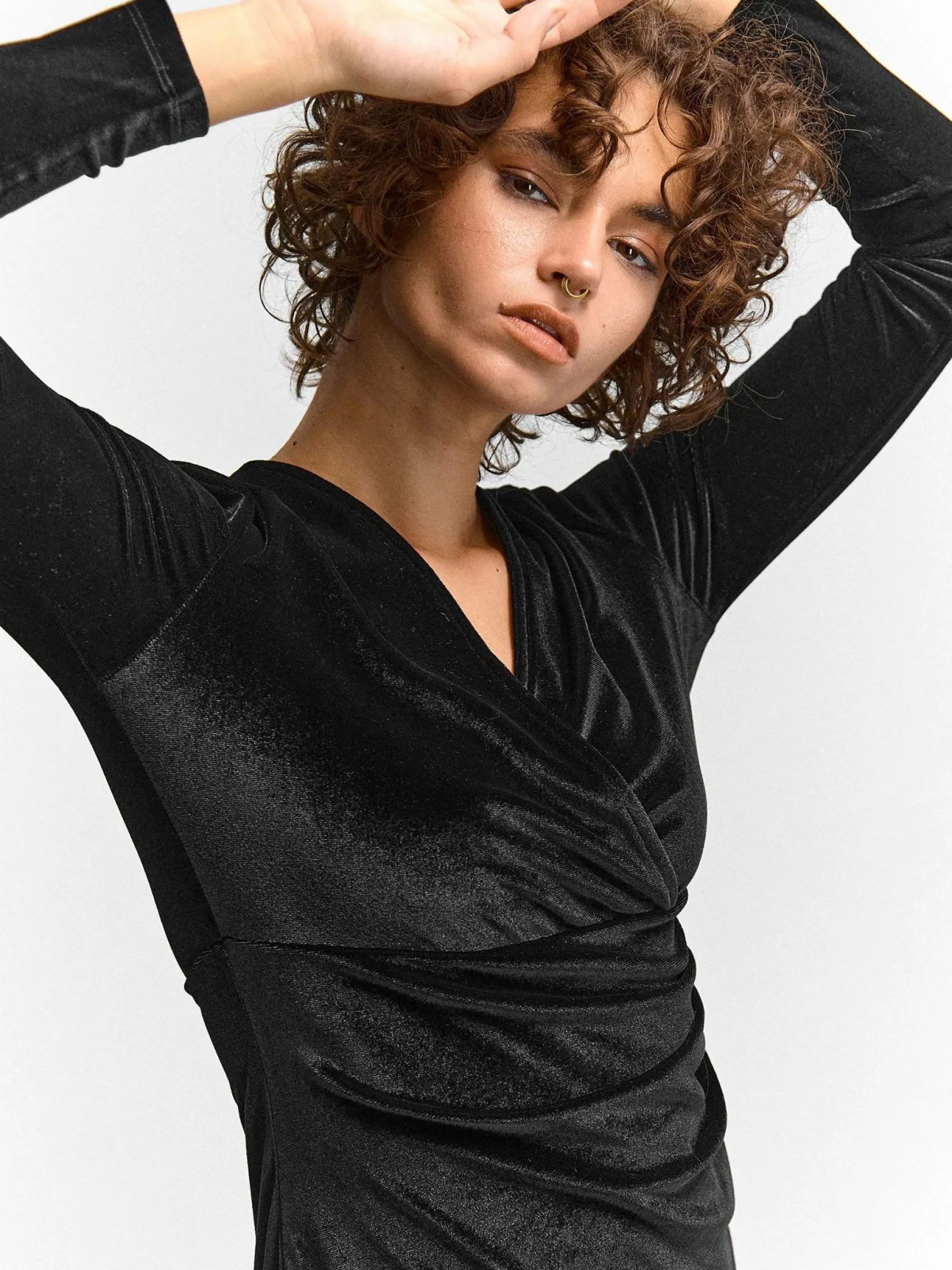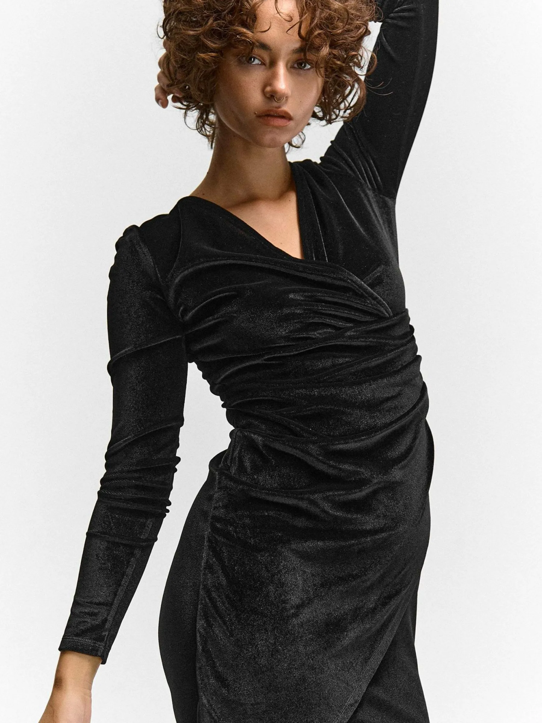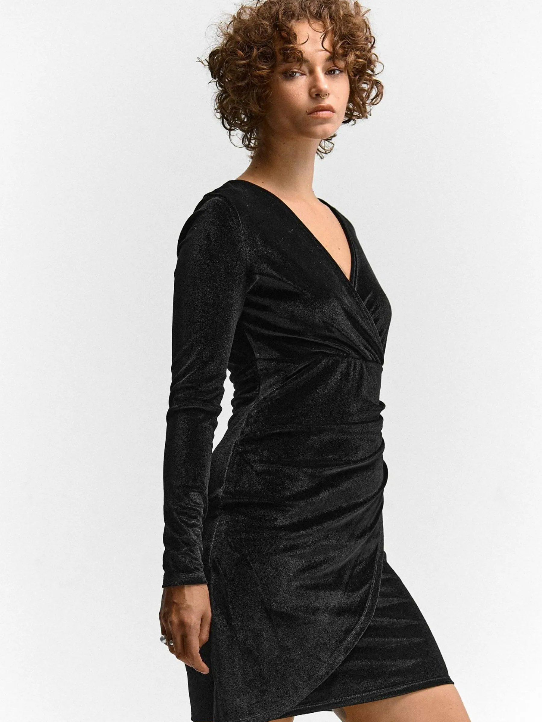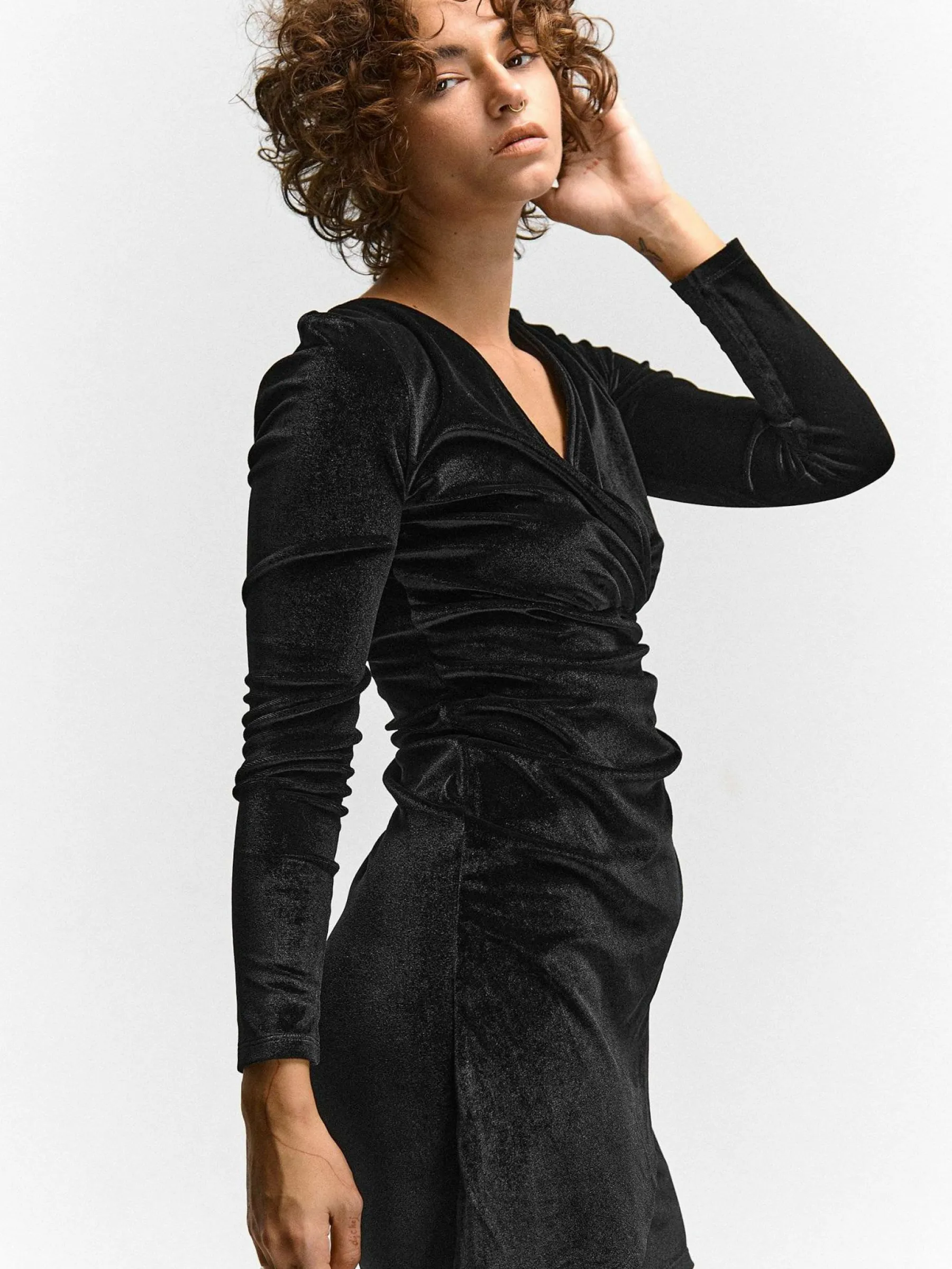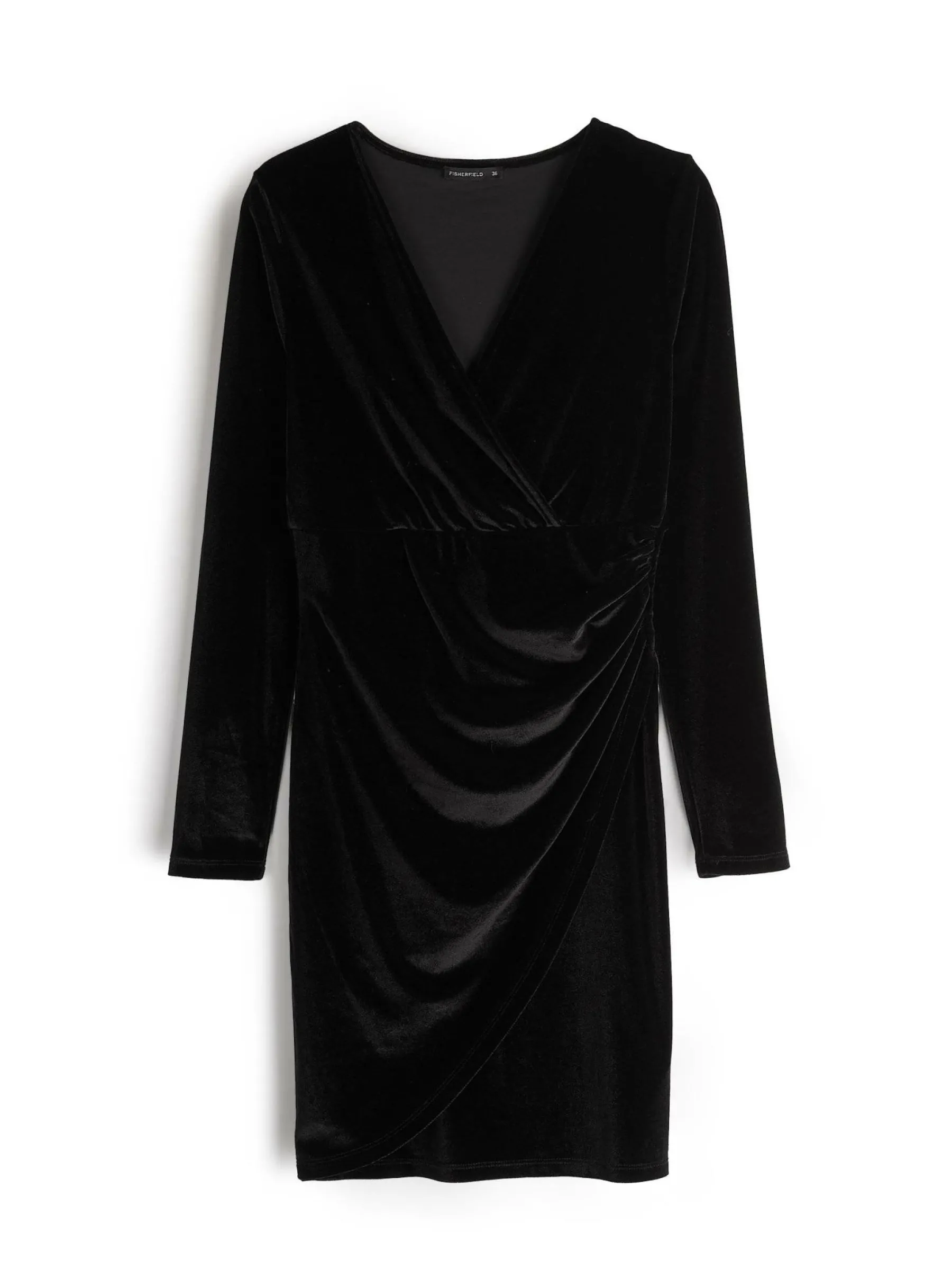 Kolor: czarnyKrój: kopertówki, z marszczeniemTyp: sukienkaRekaw: długi rękawDługość: miniPattern style: pojedyncz…