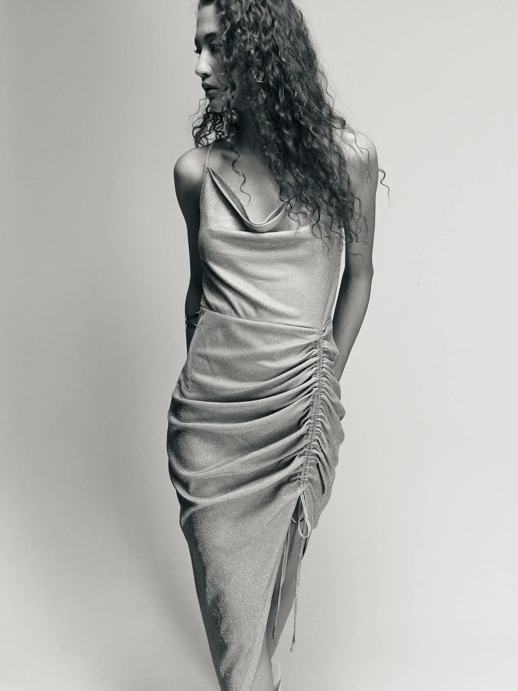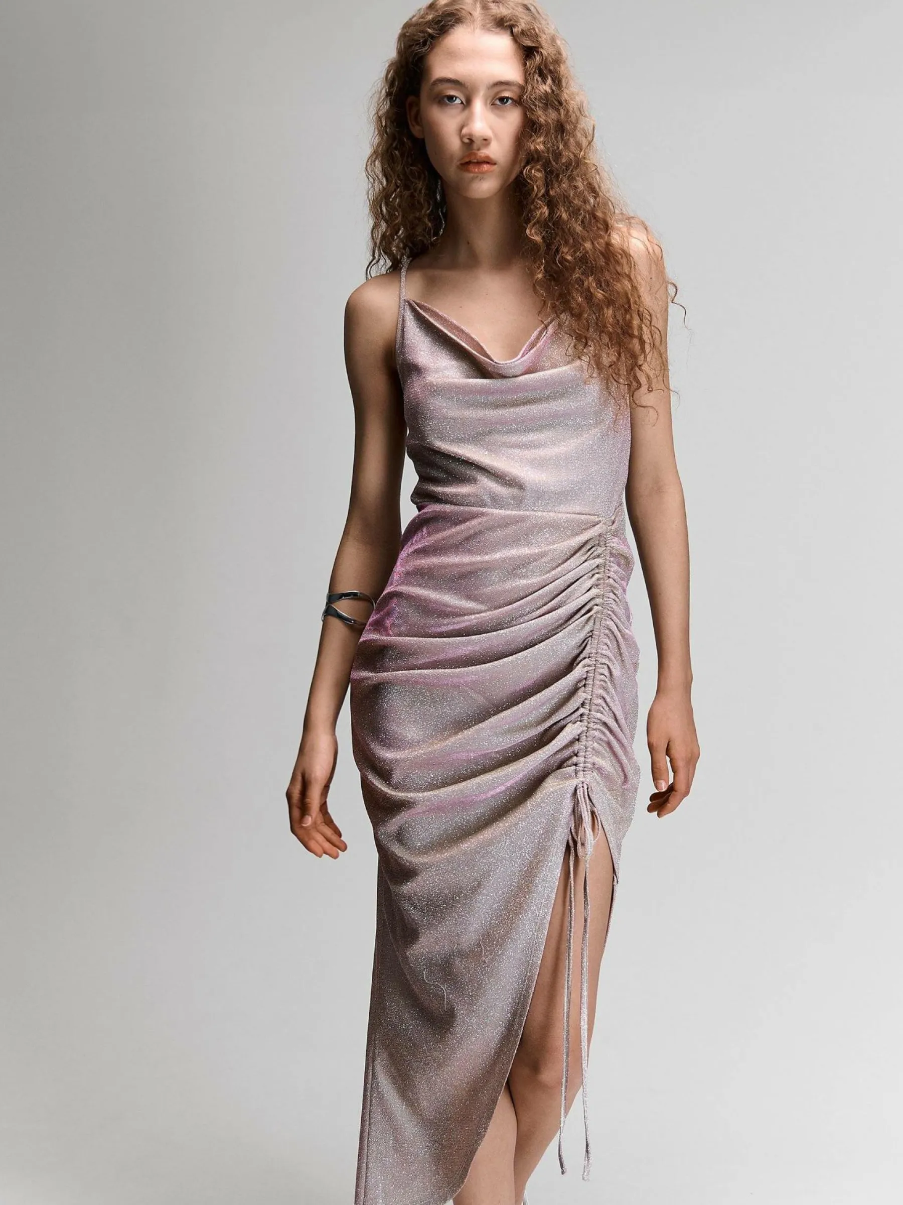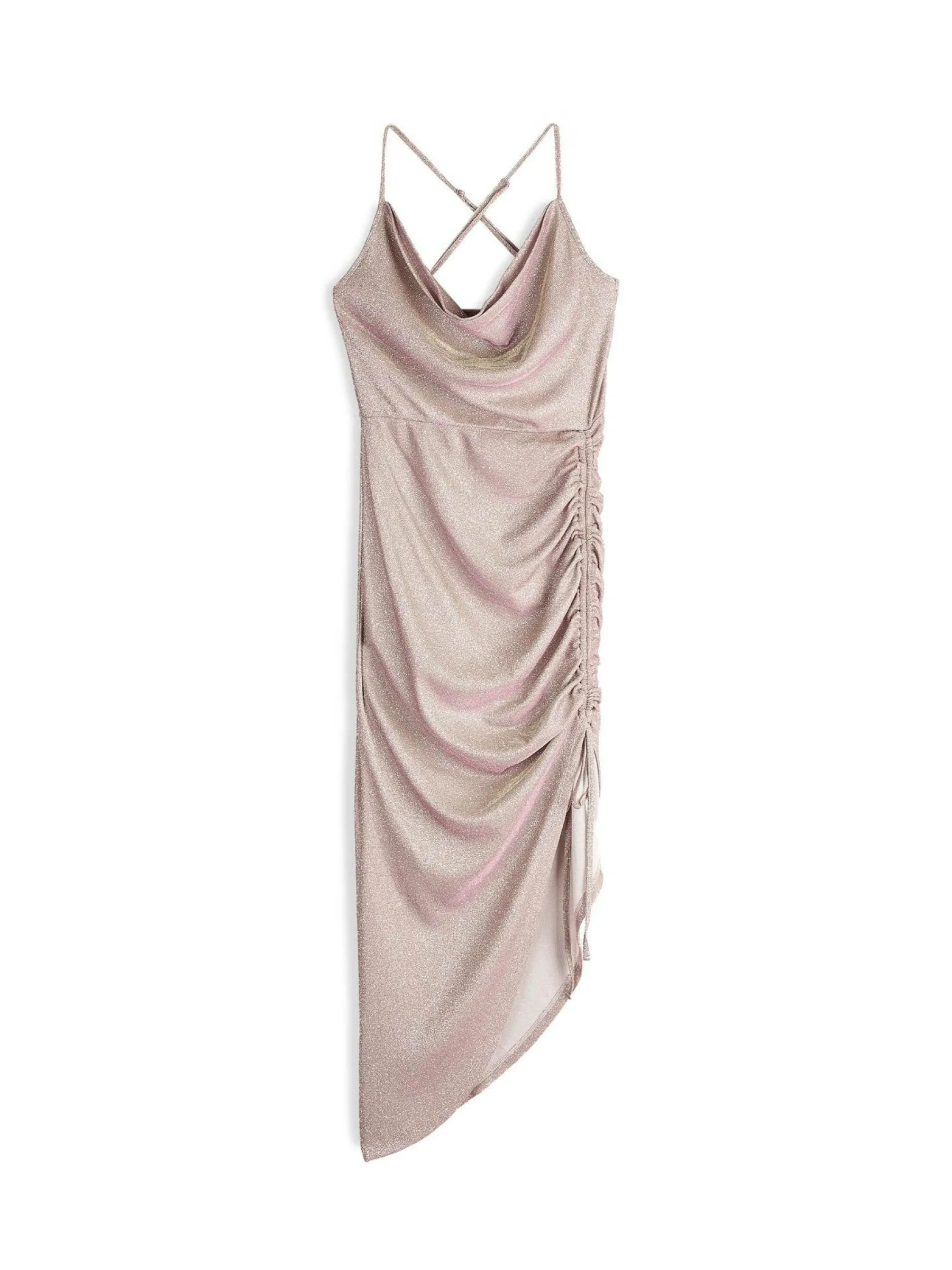 Kolor: różowyKrój: asymetryczne, z marszczeniemTyp: sukienkaRekaw: bez rękawówDługość: midiPattern style: pojedy…