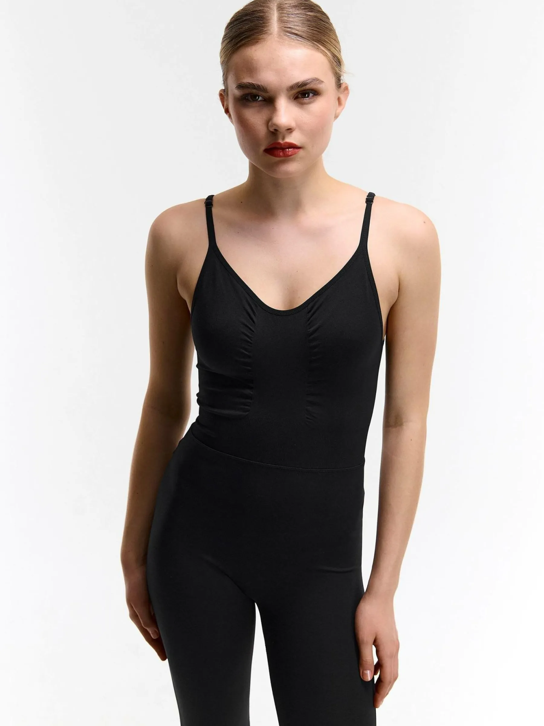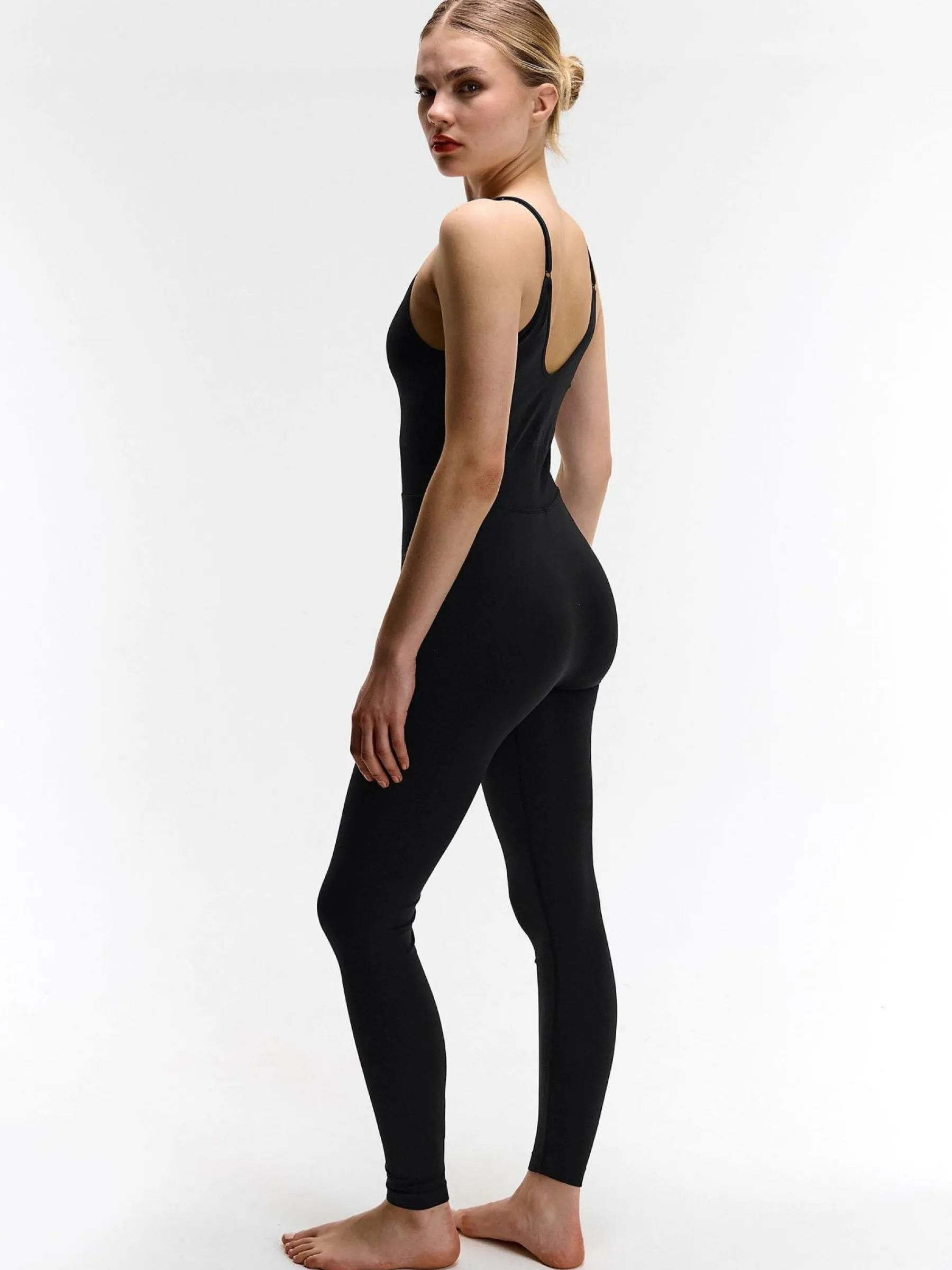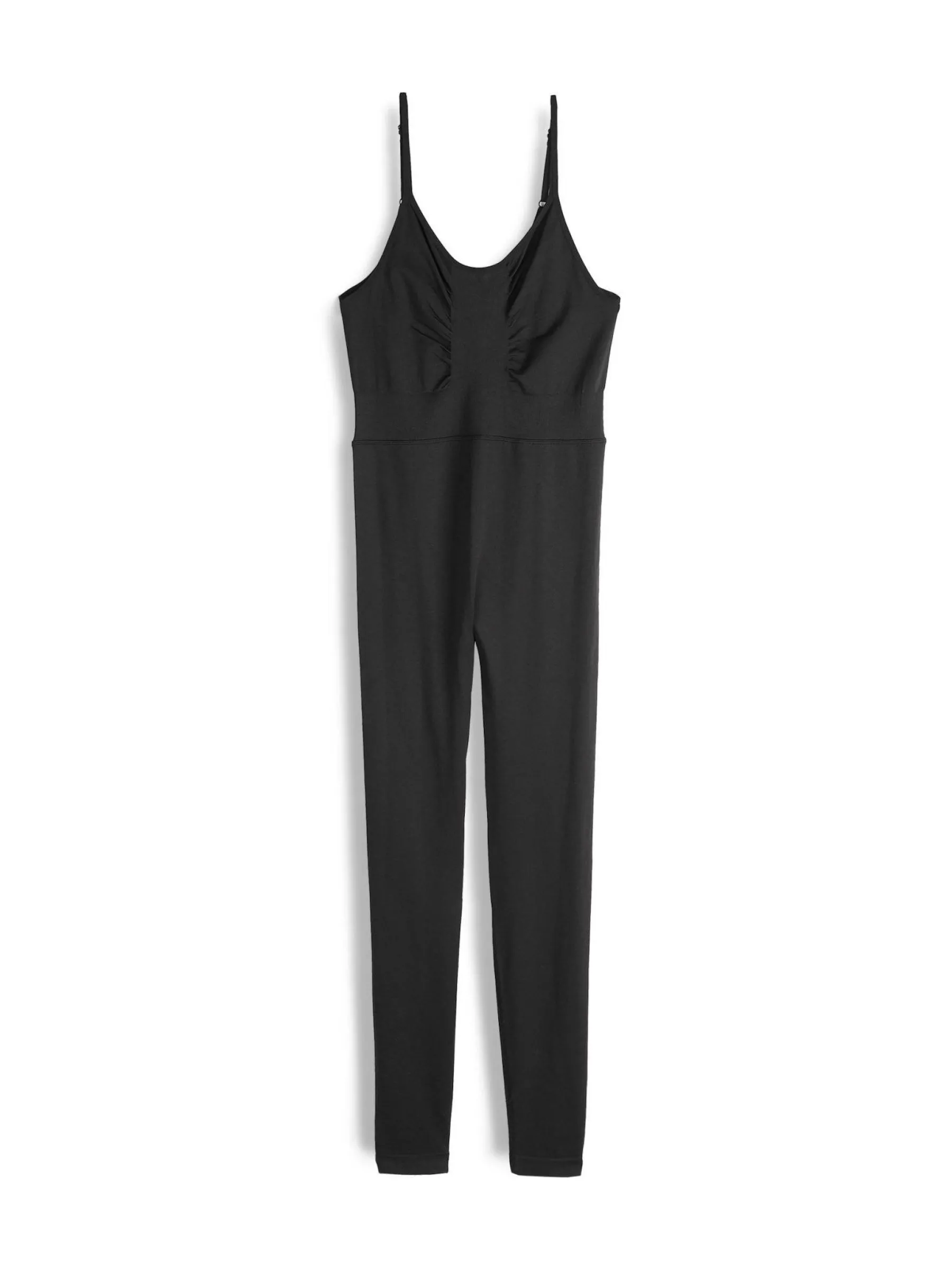 Kolor: czarnyKrój: slimTyp: kombinezonRekaw: bez rękawówDługość: dlugiePattern style: pojedynczy kolorDetal: nad g…