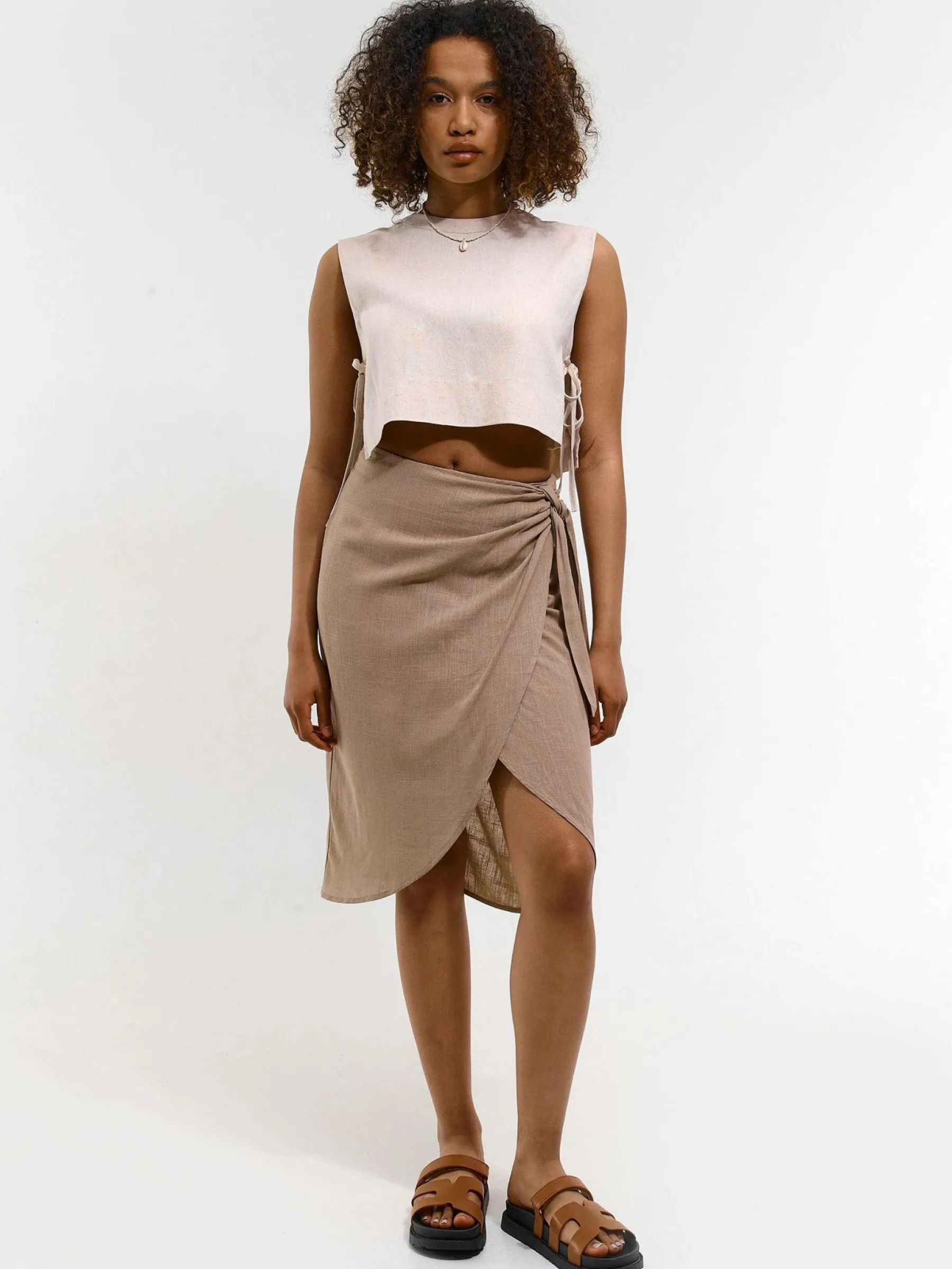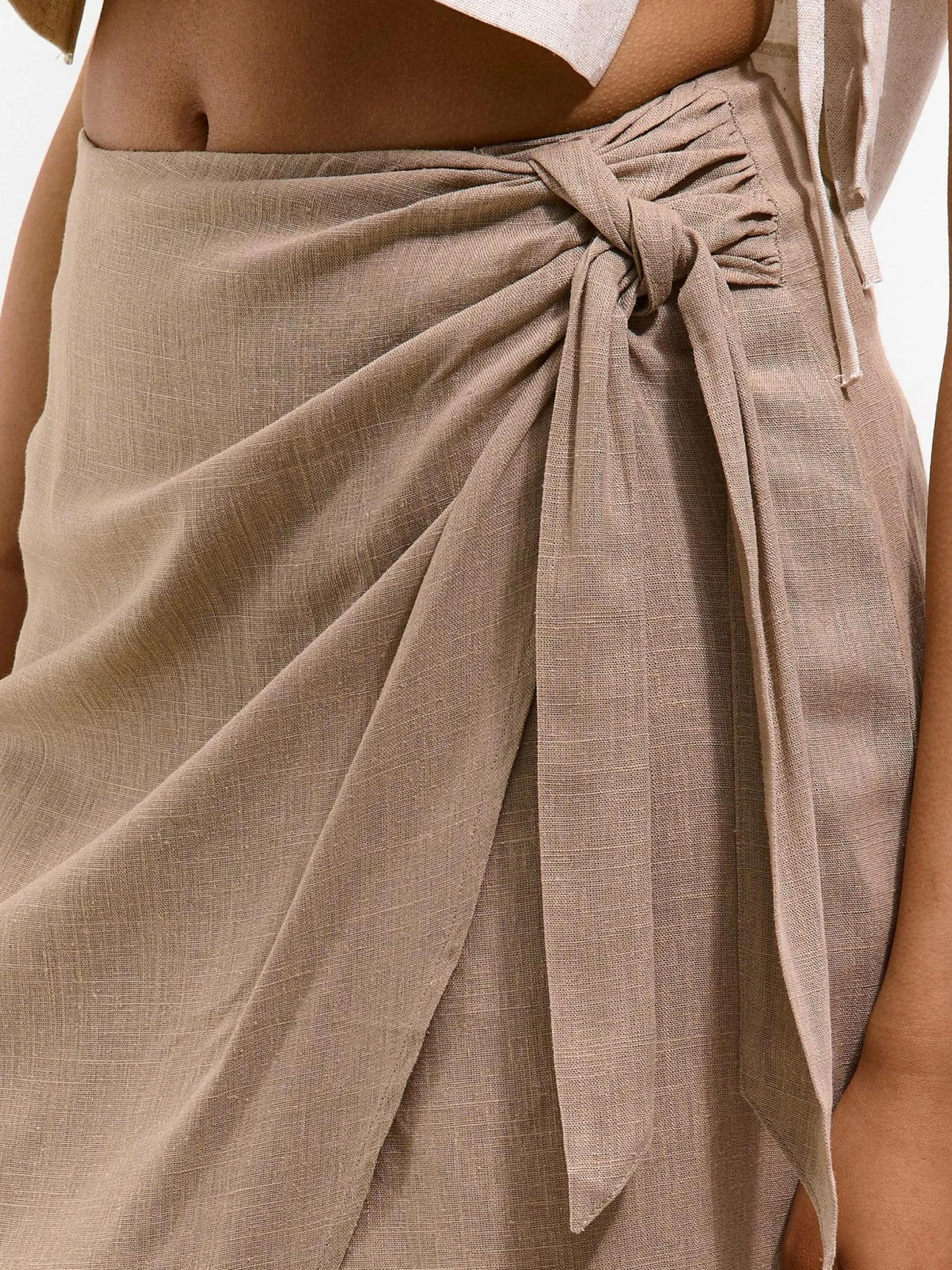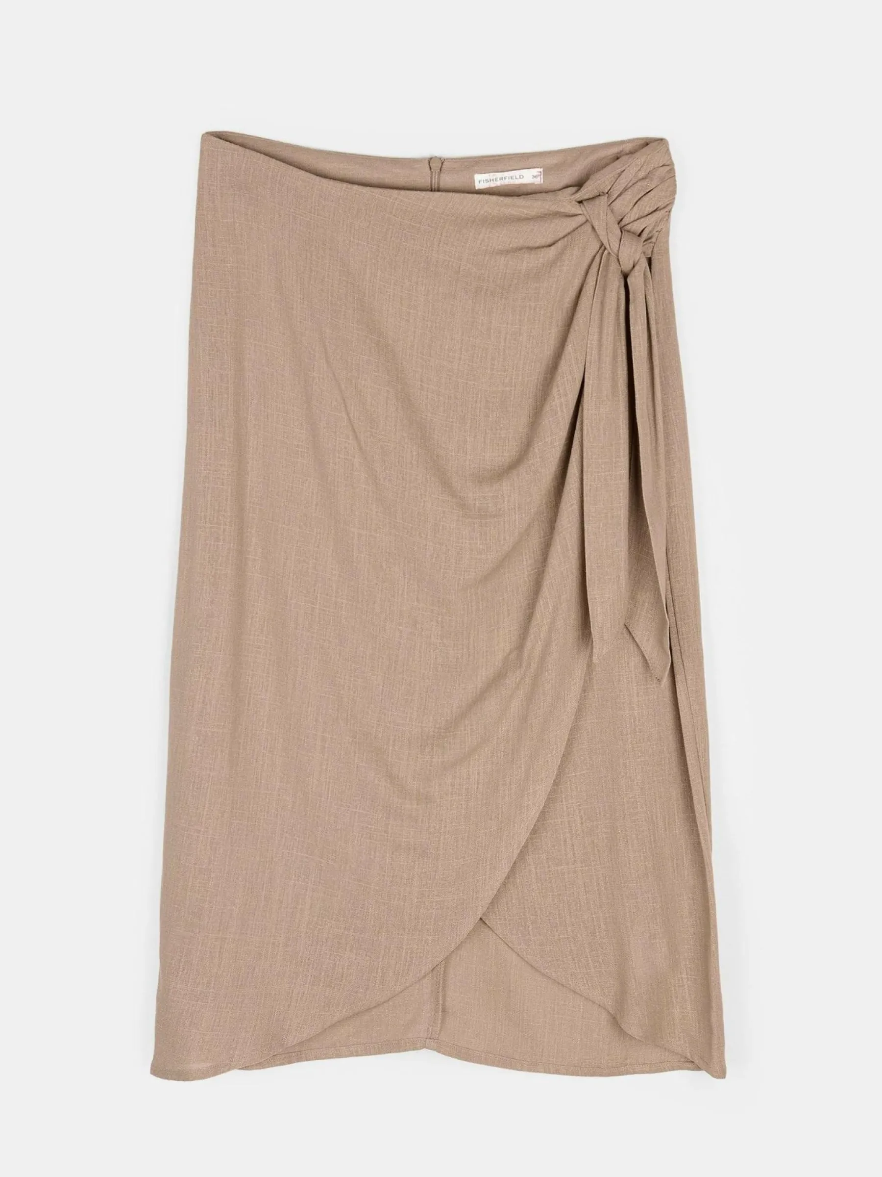 Kolor: beżowy, brązowyKrój: kopertówkiTyp: spódnicaDługość: midiPattern style: pojedynczy kolorDetal: z falbanka…