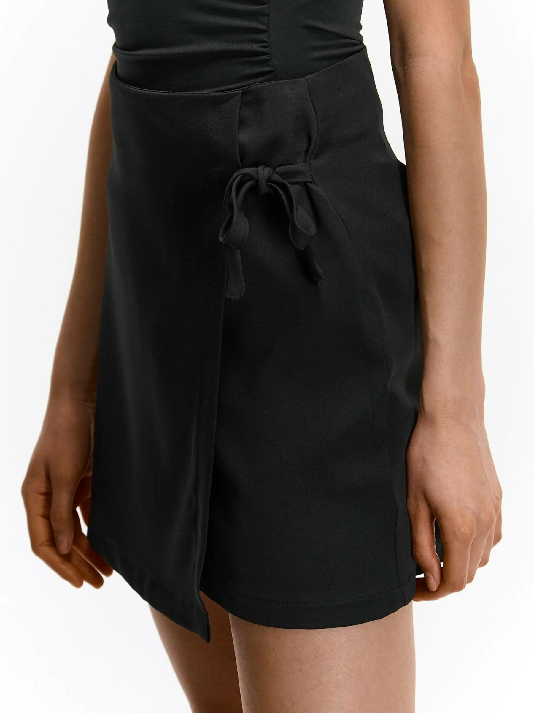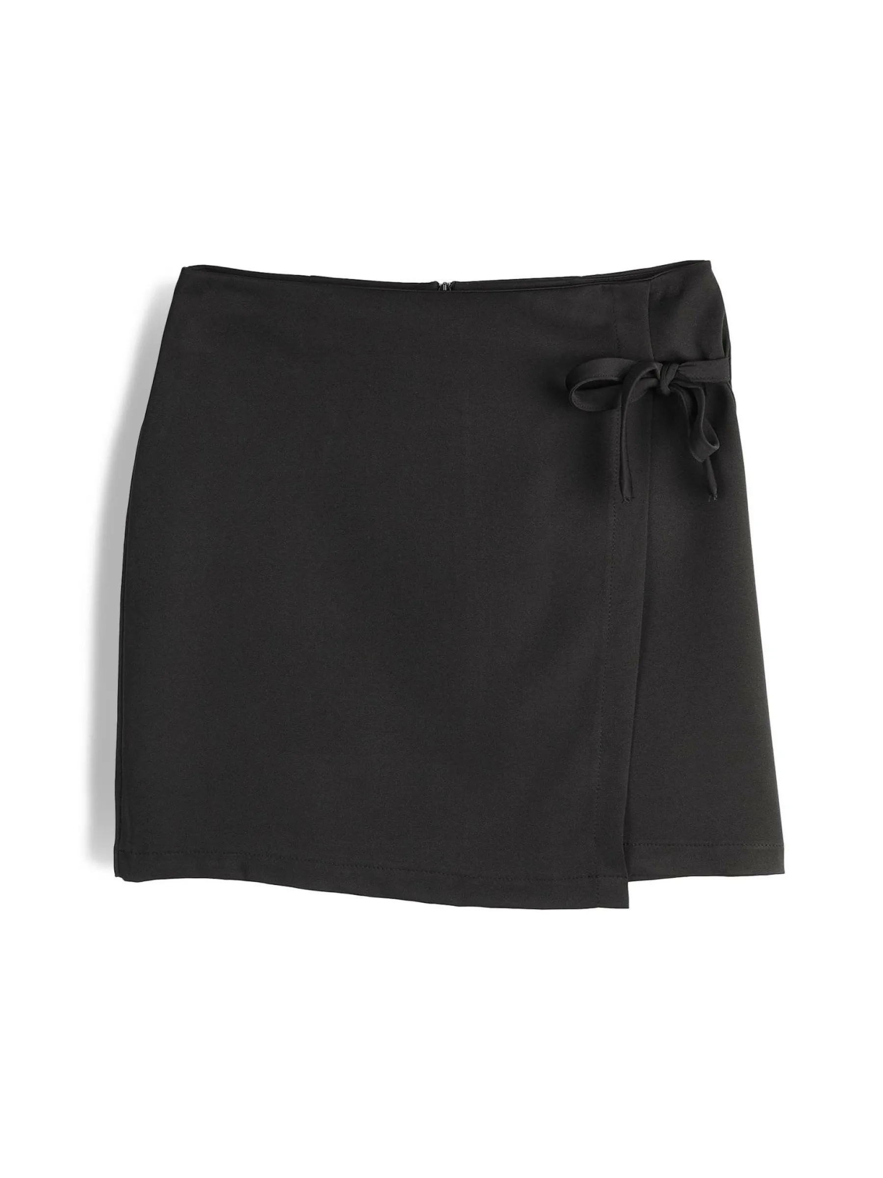 Kolor: czarnyKrój: kopertówkiTyp: spódnicaDługość: miniPattern style: pojedynczy kolorDetal: na zamekMateriał: sy…