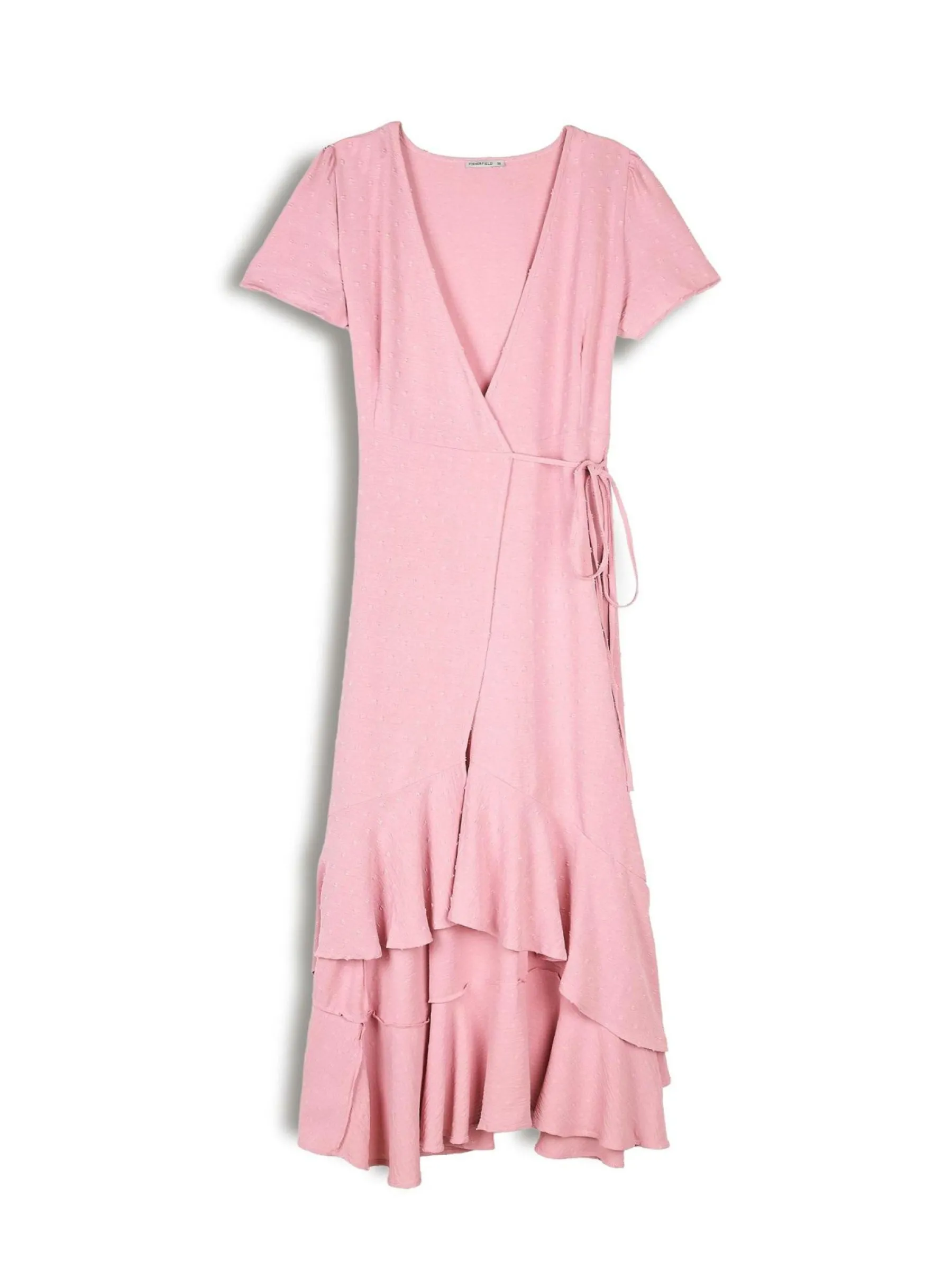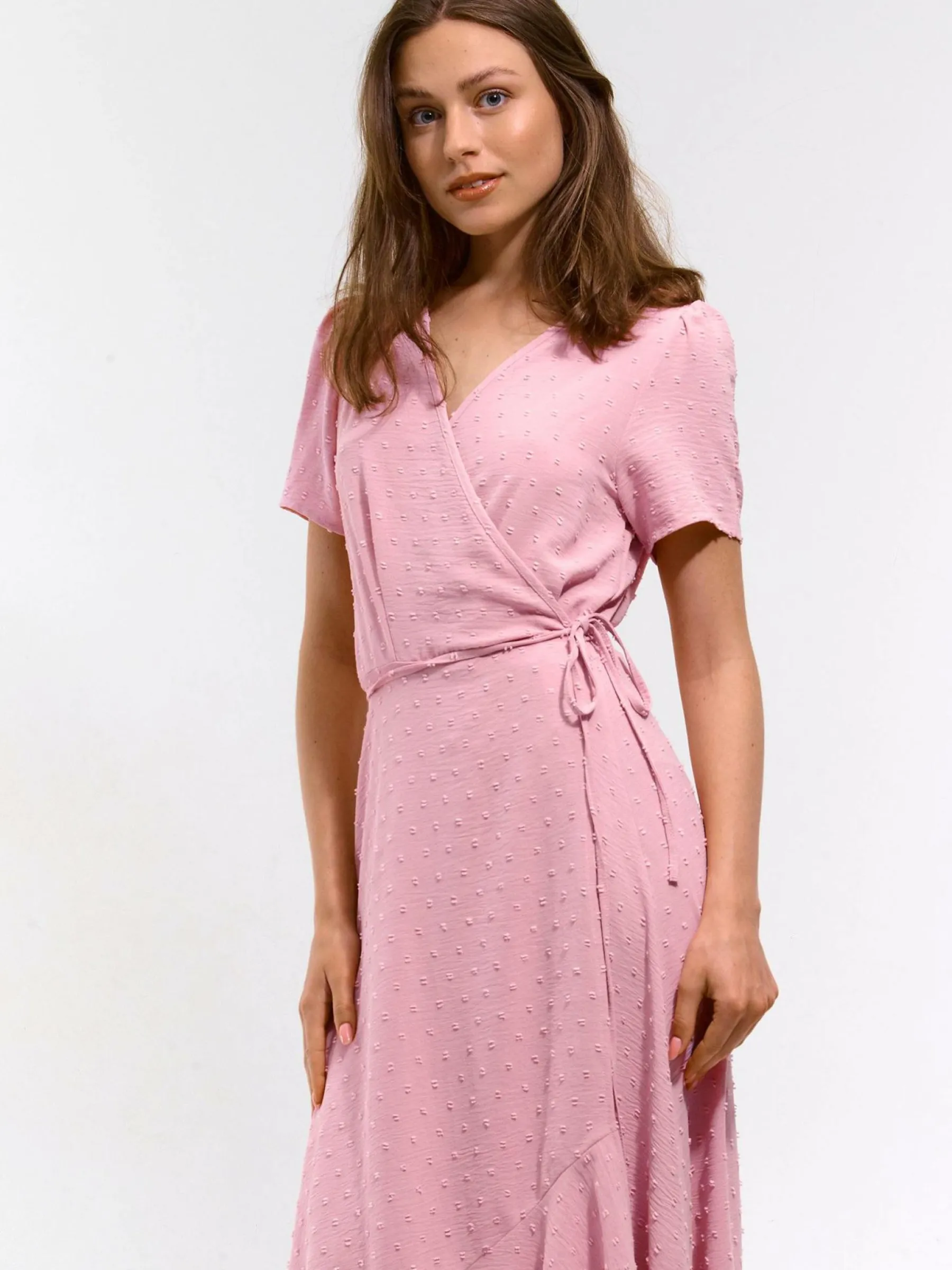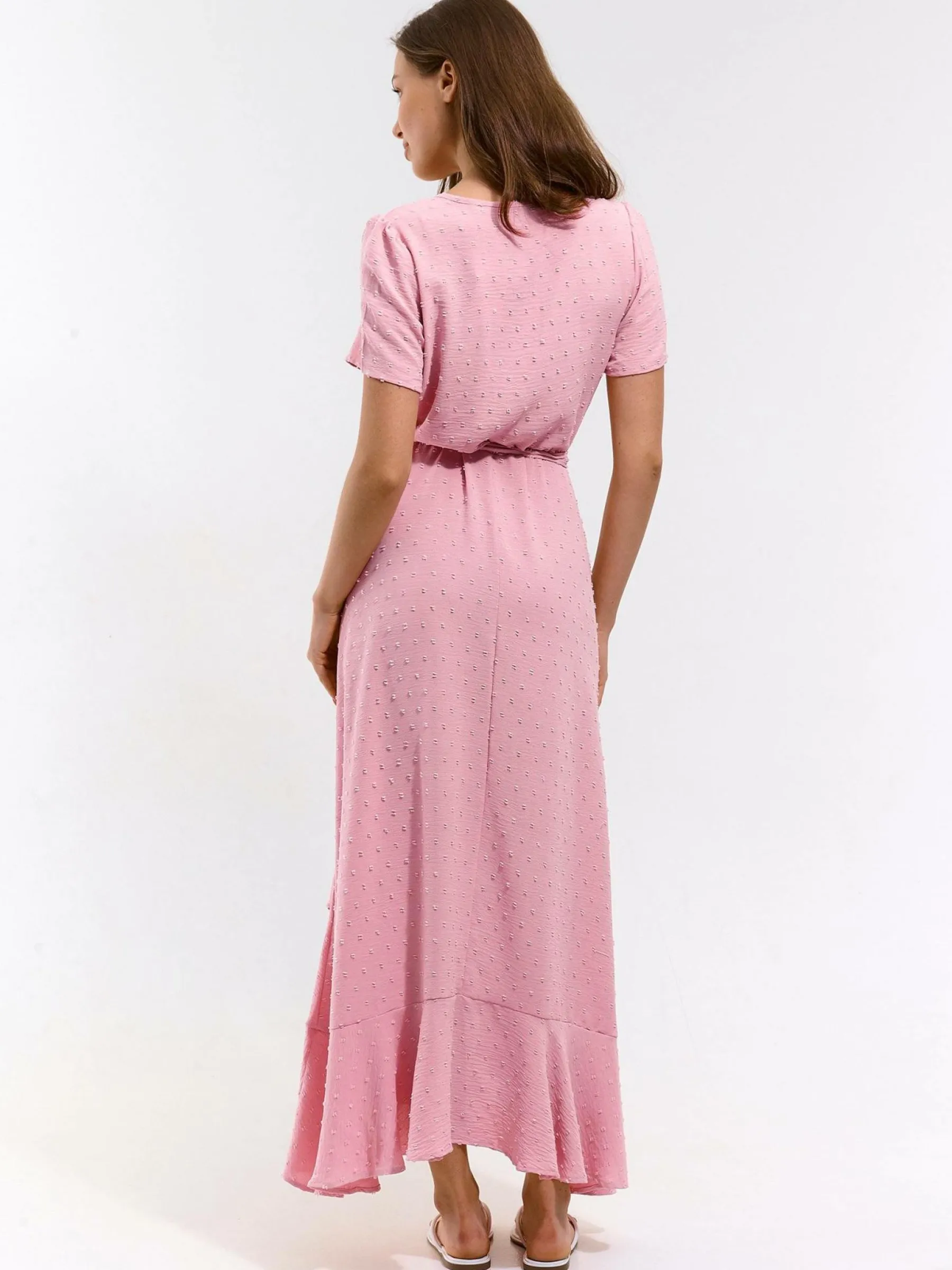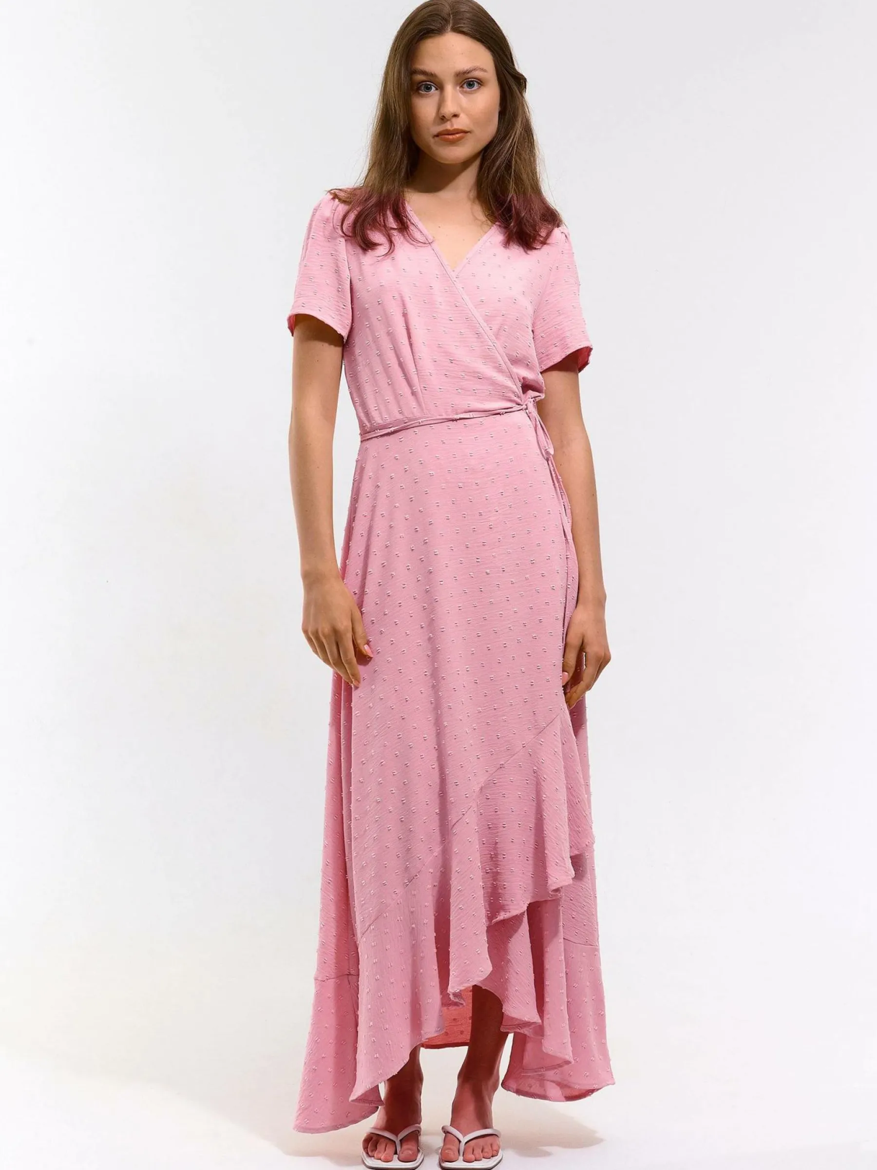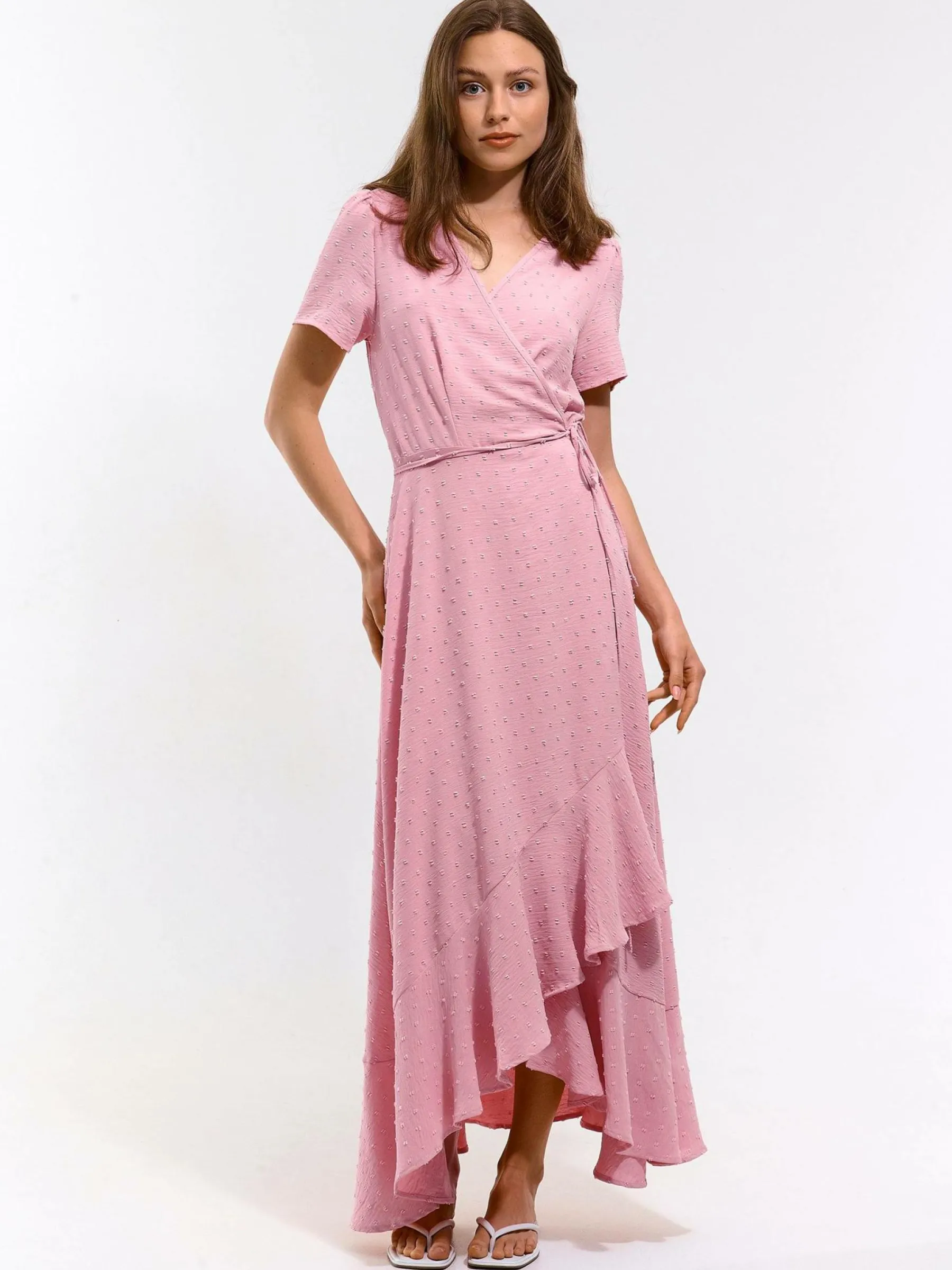 Kolor: różowyKrój: kopertówki, asymetryczneTyp: sukienkaRekaw: krótki rękawDługość: maxiPattern style: pojedync…