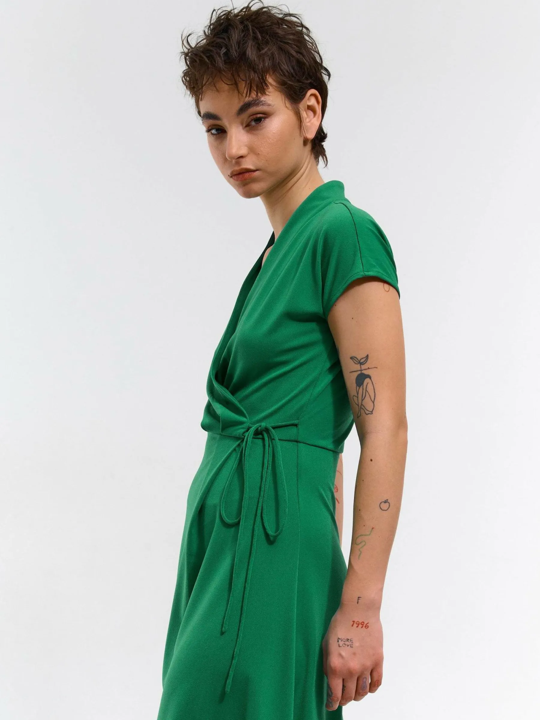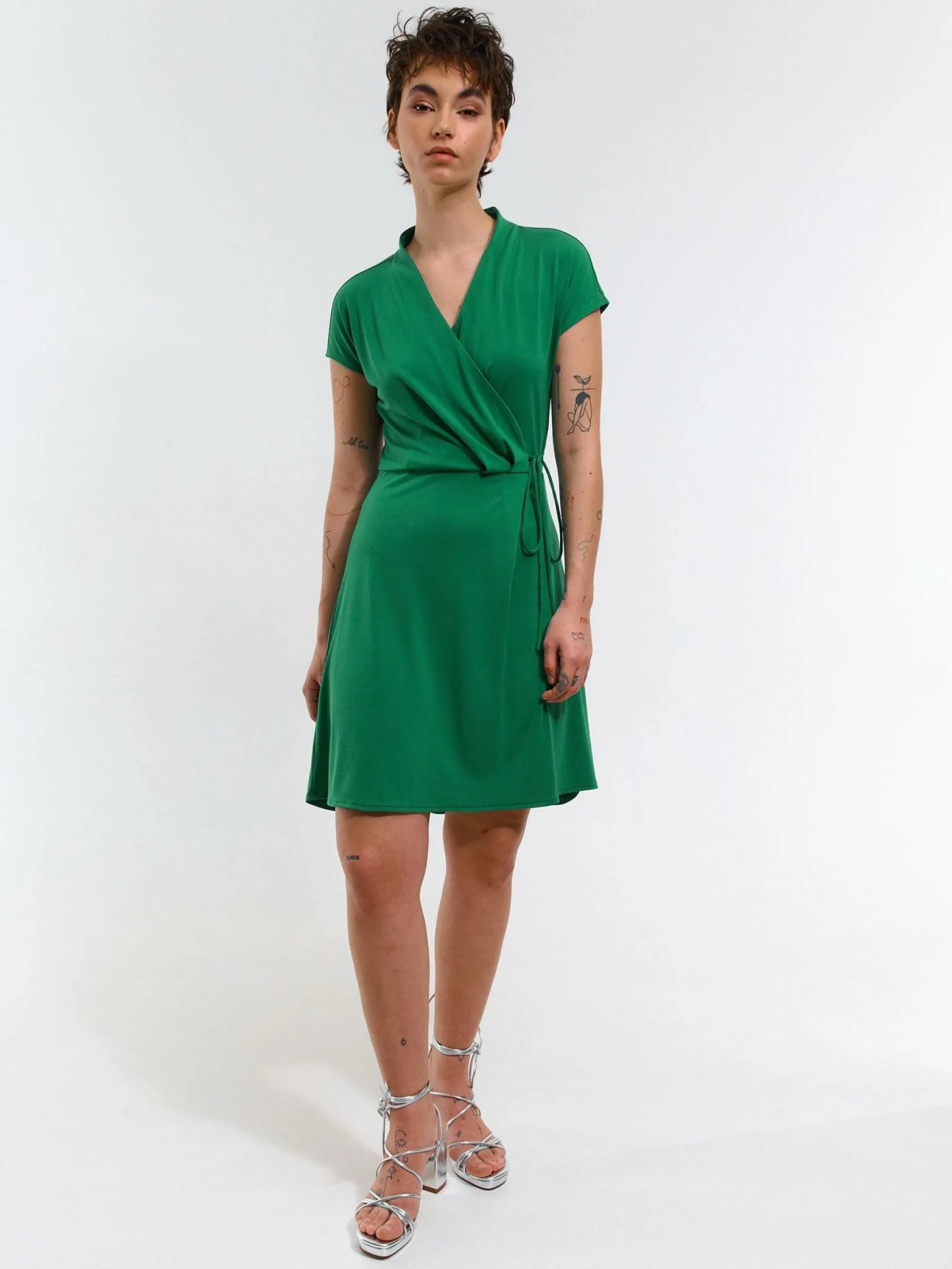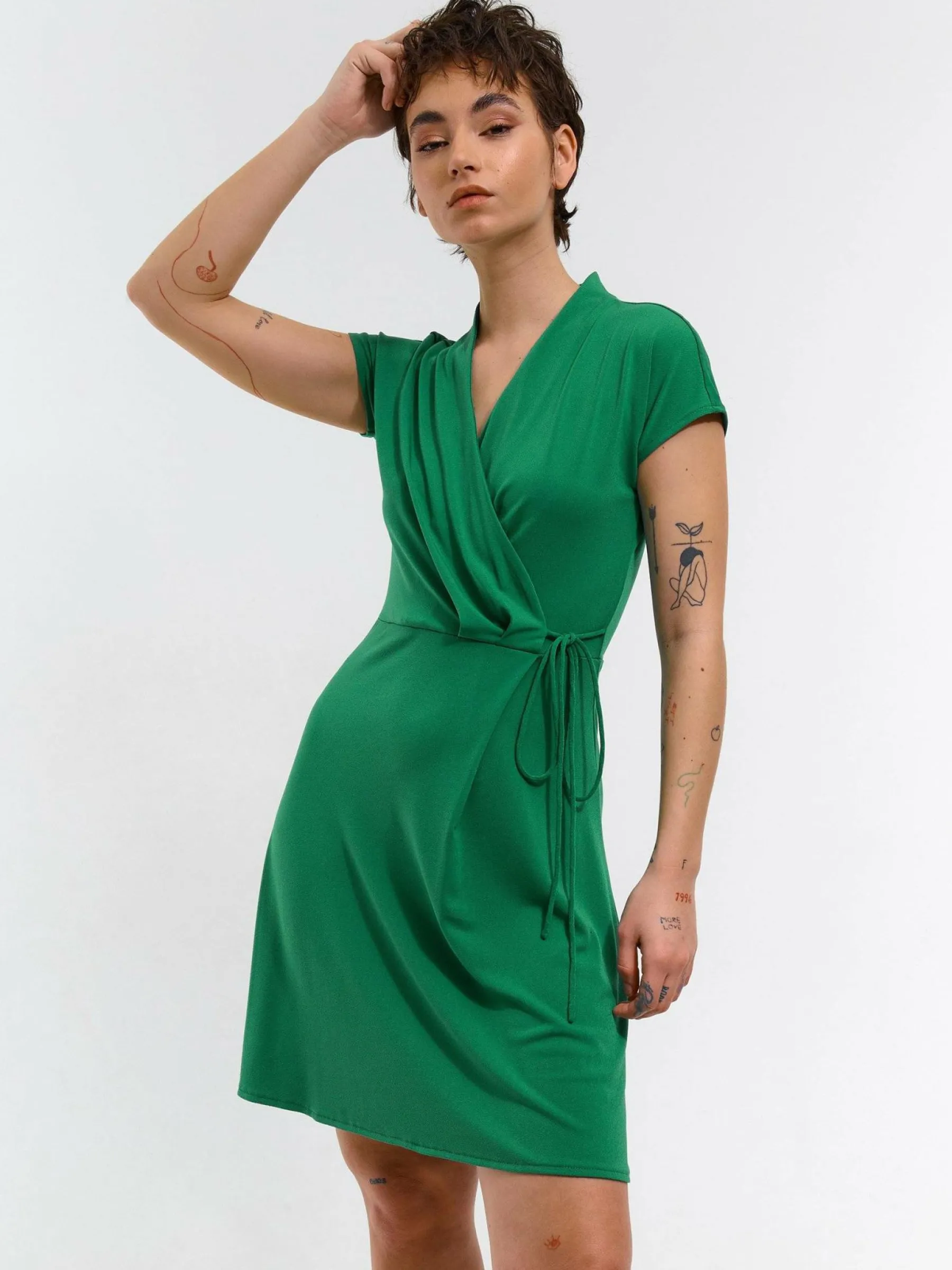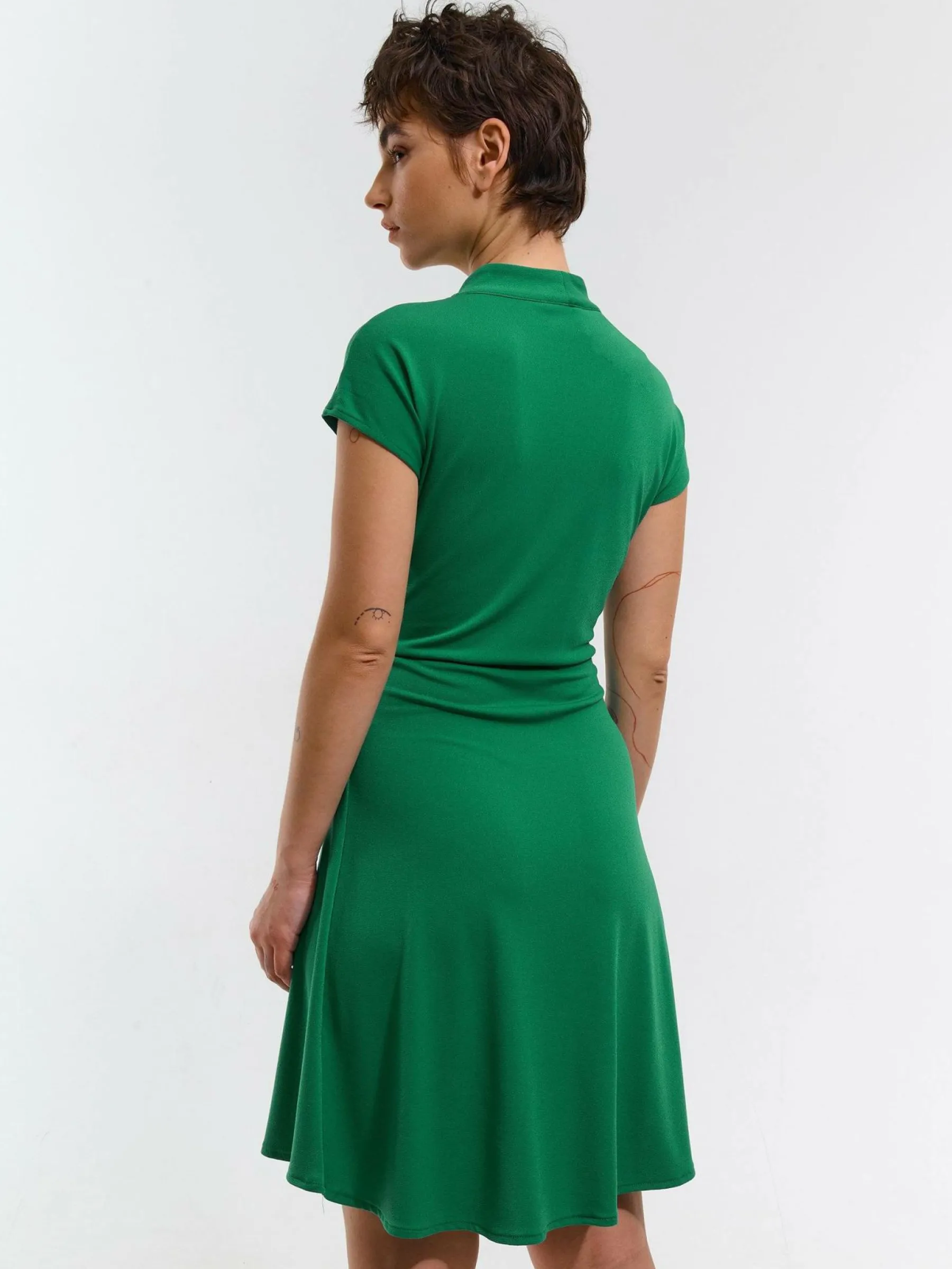 Kolor: zielonyKrój: kopertówkiTyp: sukienkaRekaw: krótki rękawDługość: miniPattern style: pojedynczy kolorMateria…