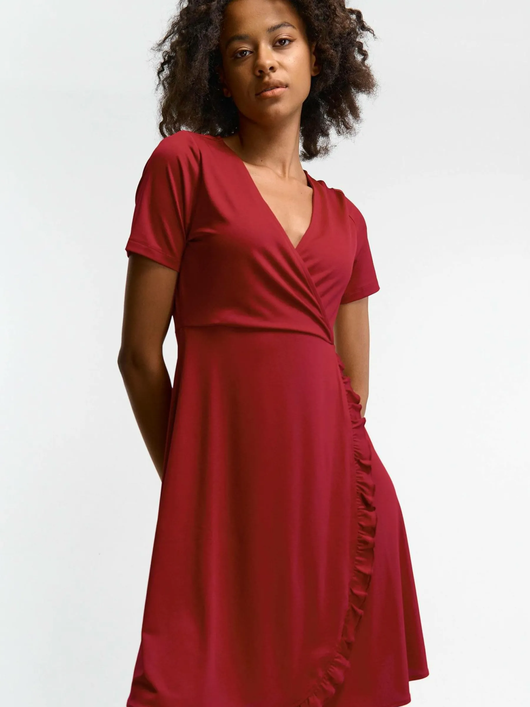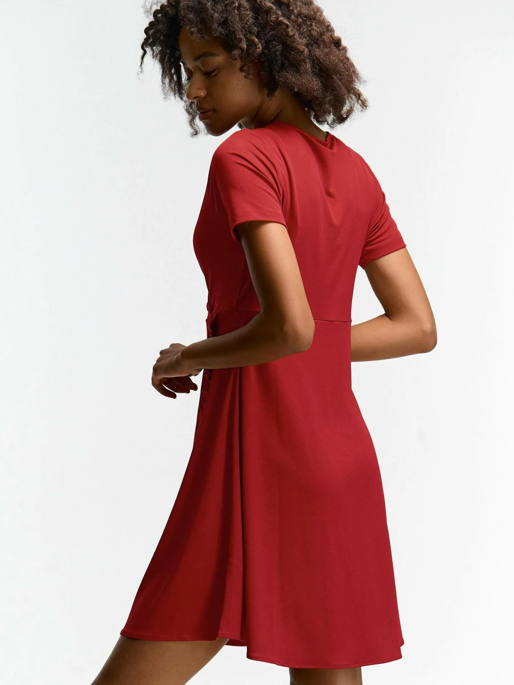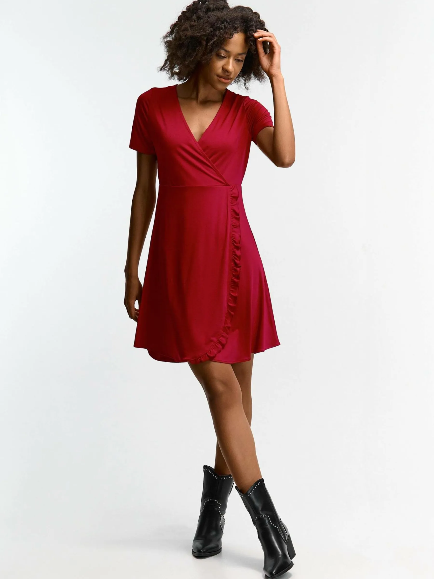 Kolor: czerwonyKrój: kopertówkiTyp: sukienkaRekaw: krótki rękawDługość: miniPattern style: pojedynczy kolorDetal:…