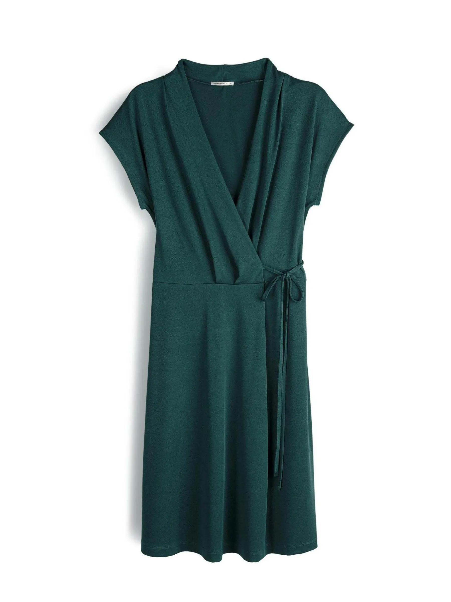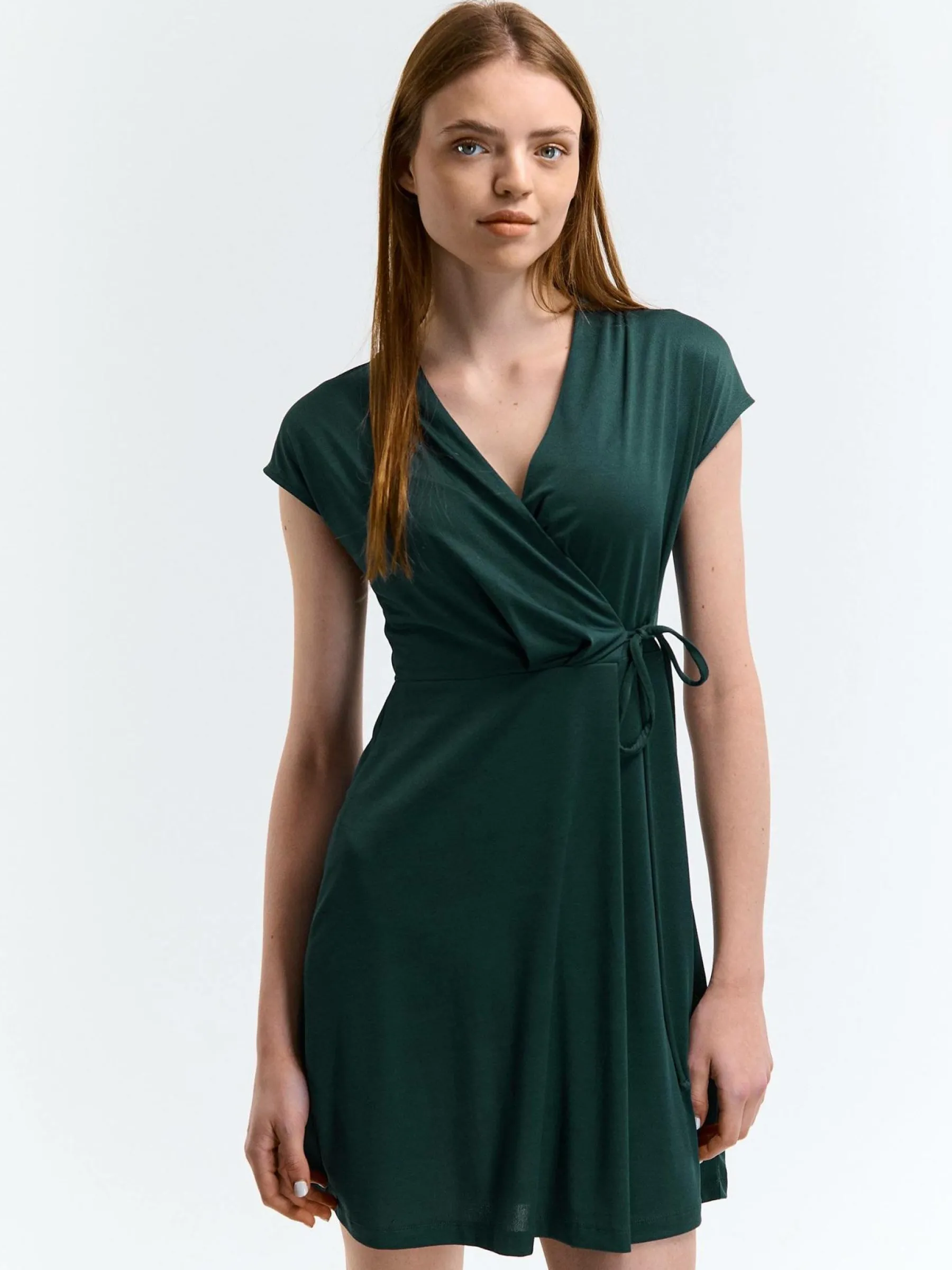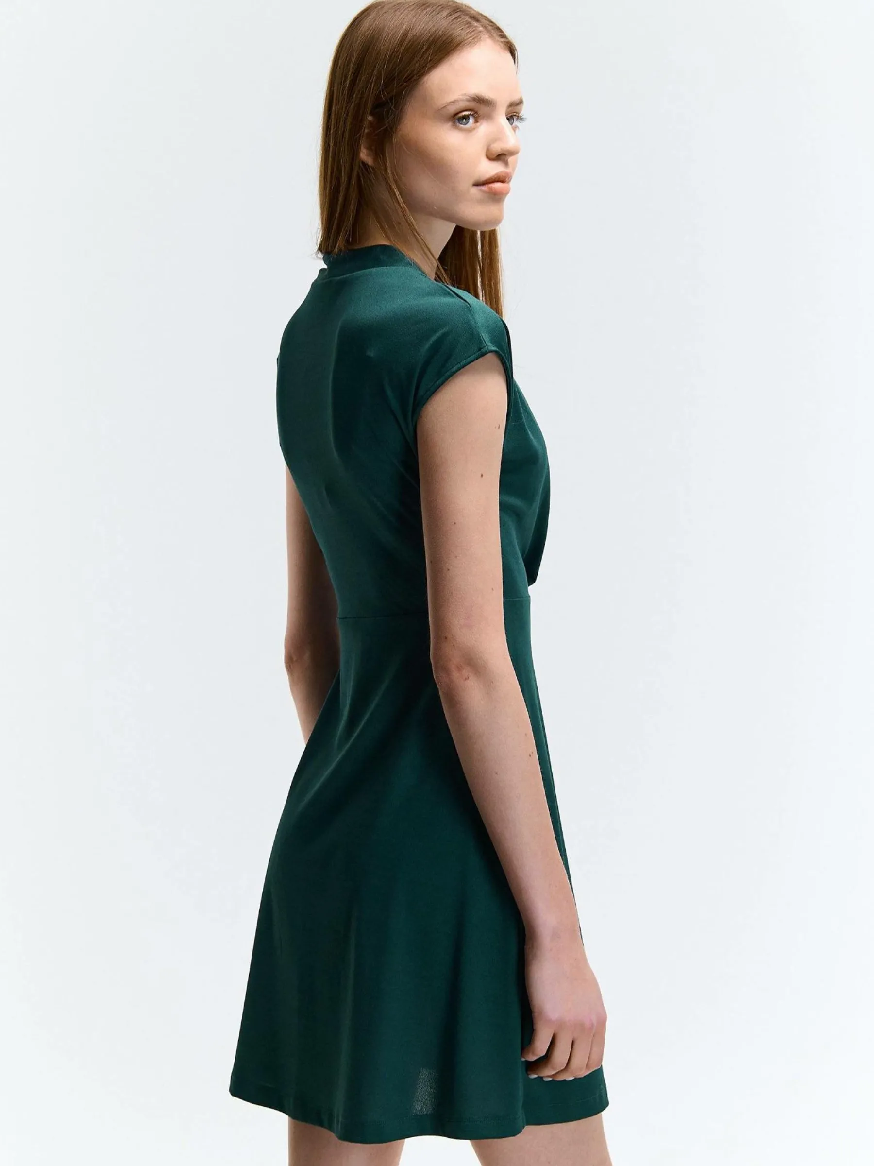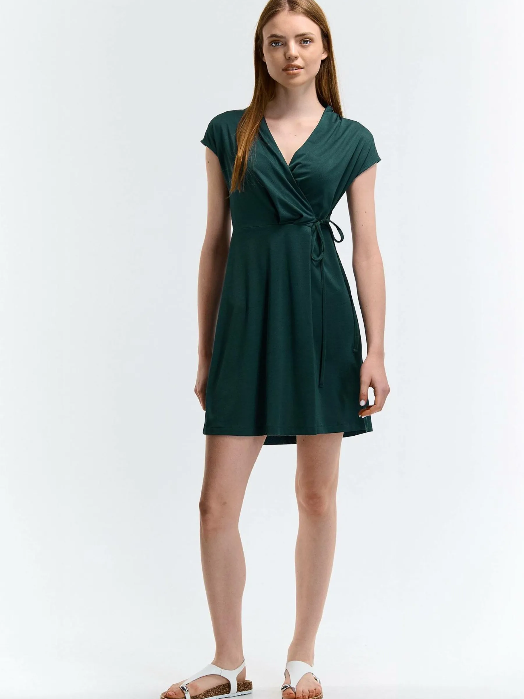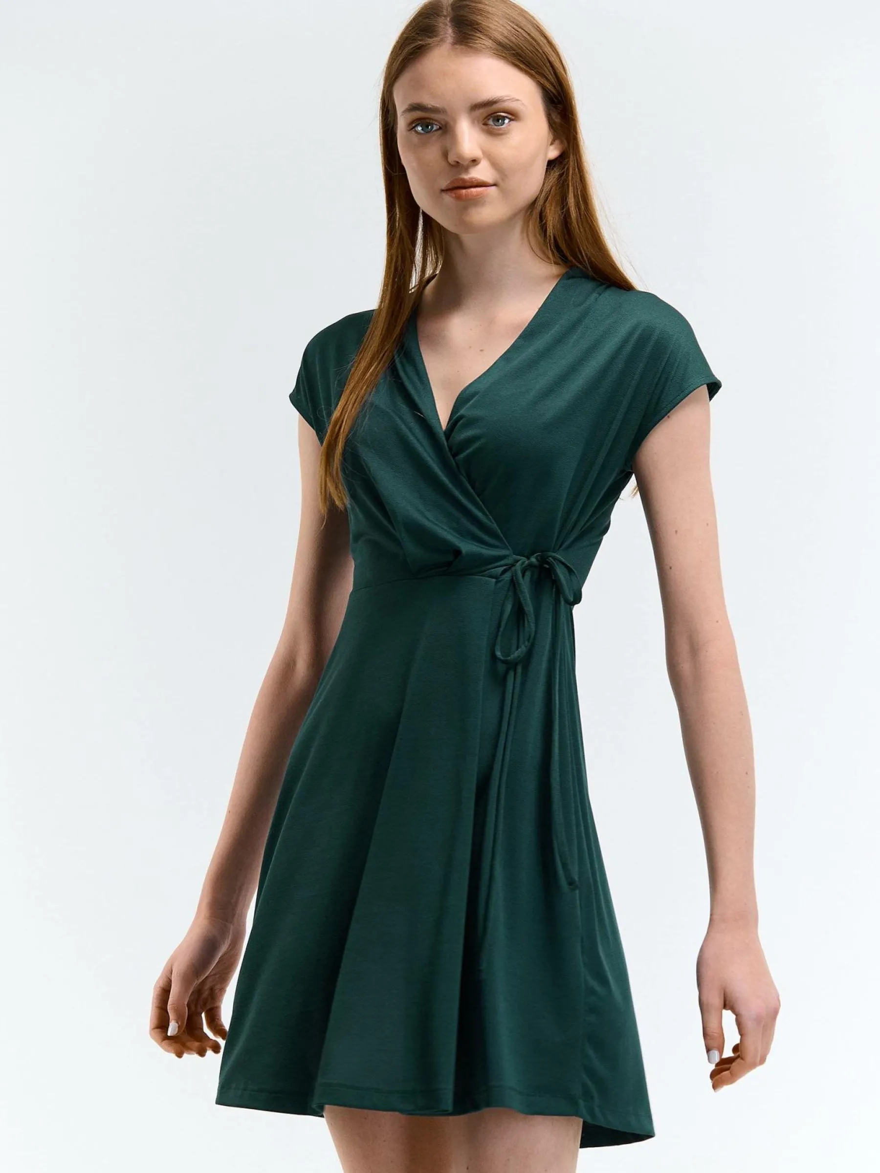 Kolor: zielonyKrój: kopertówkiTyp: sukienkaRekaw: krótki rękawDługość: miniPattern style: pojedynczy kolorDetal: …
