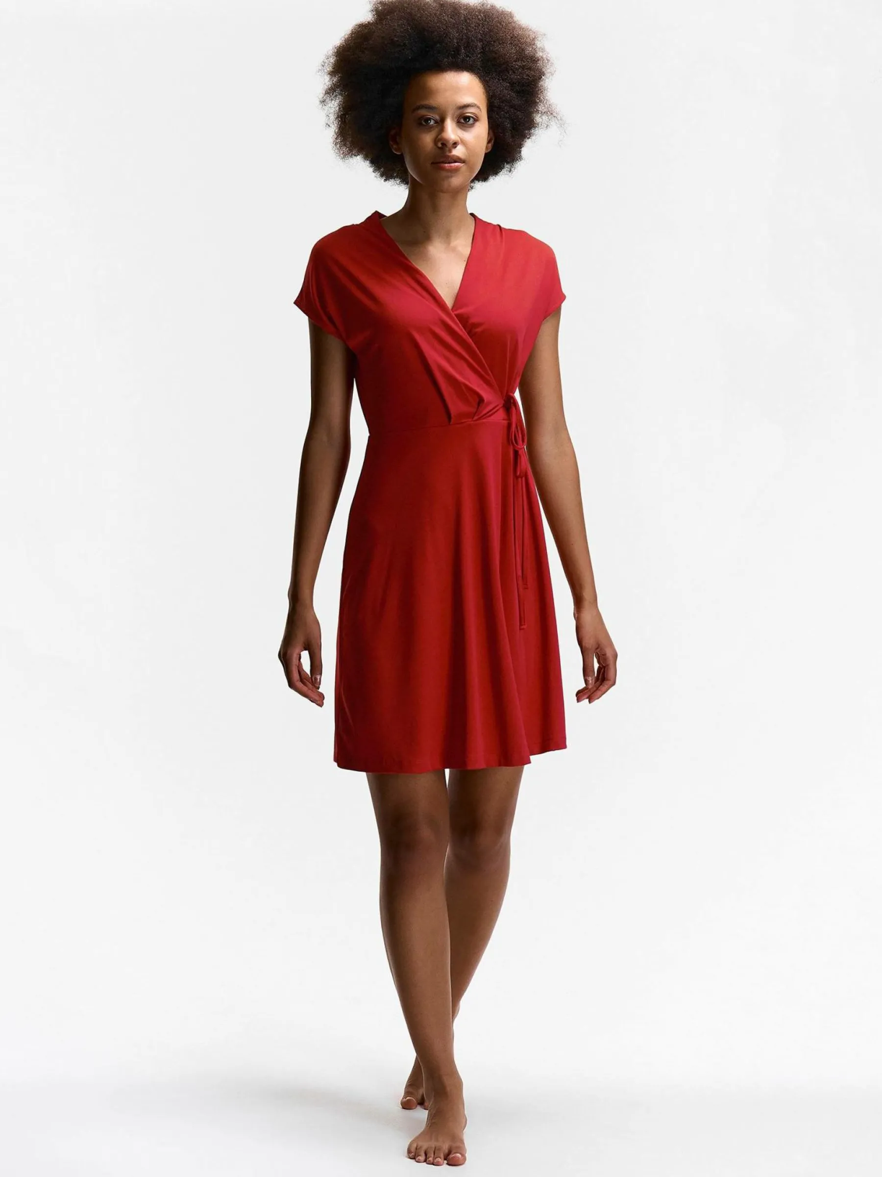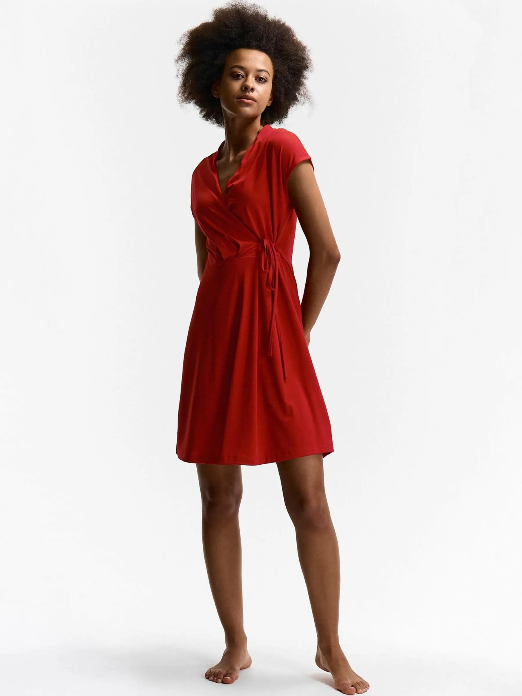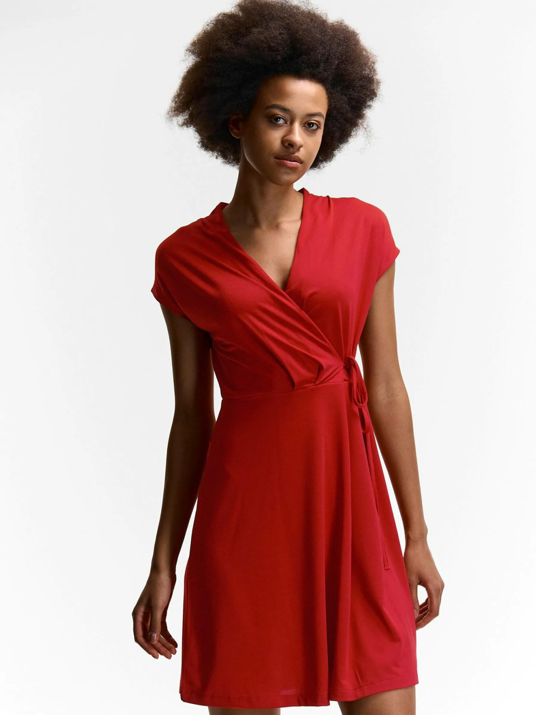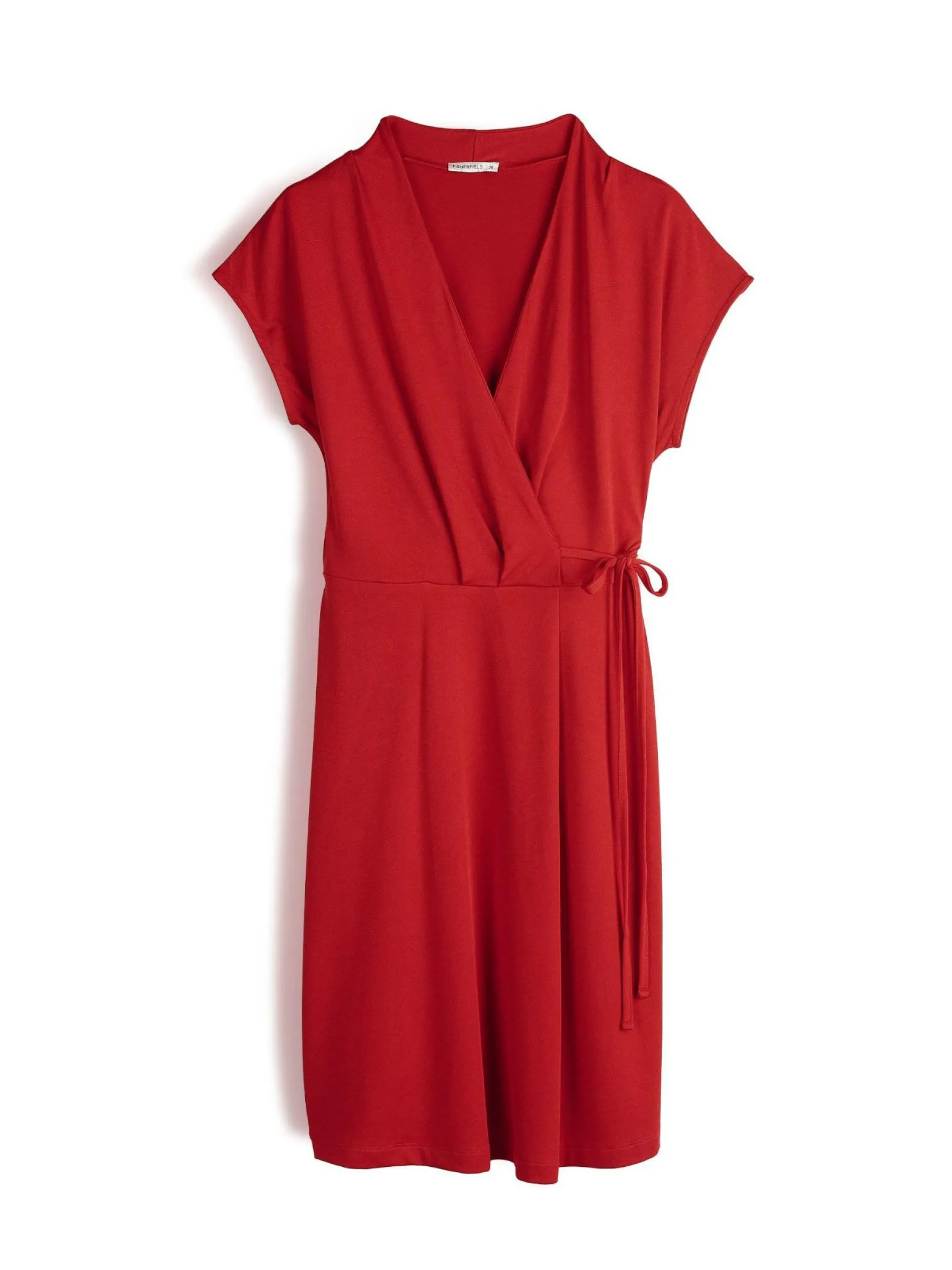 Kolor: czerwonyKrój: kopertówkiTyp: sukienkaRekaw: krótki rękawDługość: miniPattern style: pojedynczy kolorDetal:…