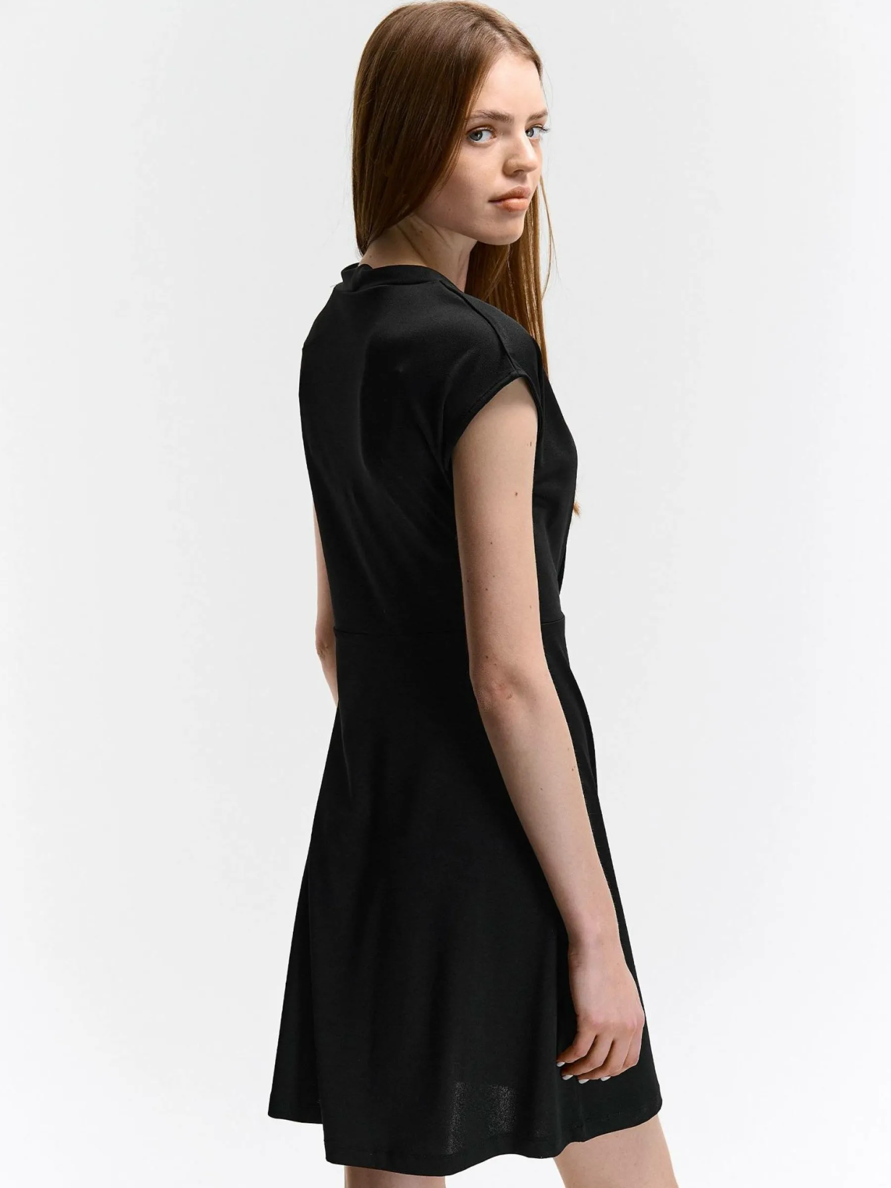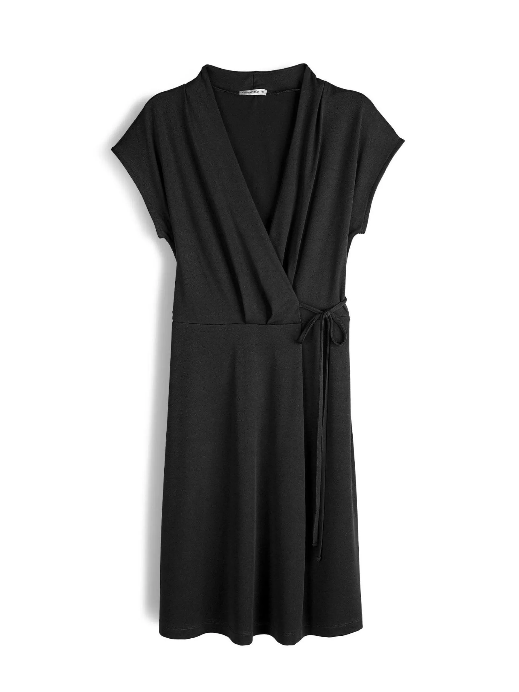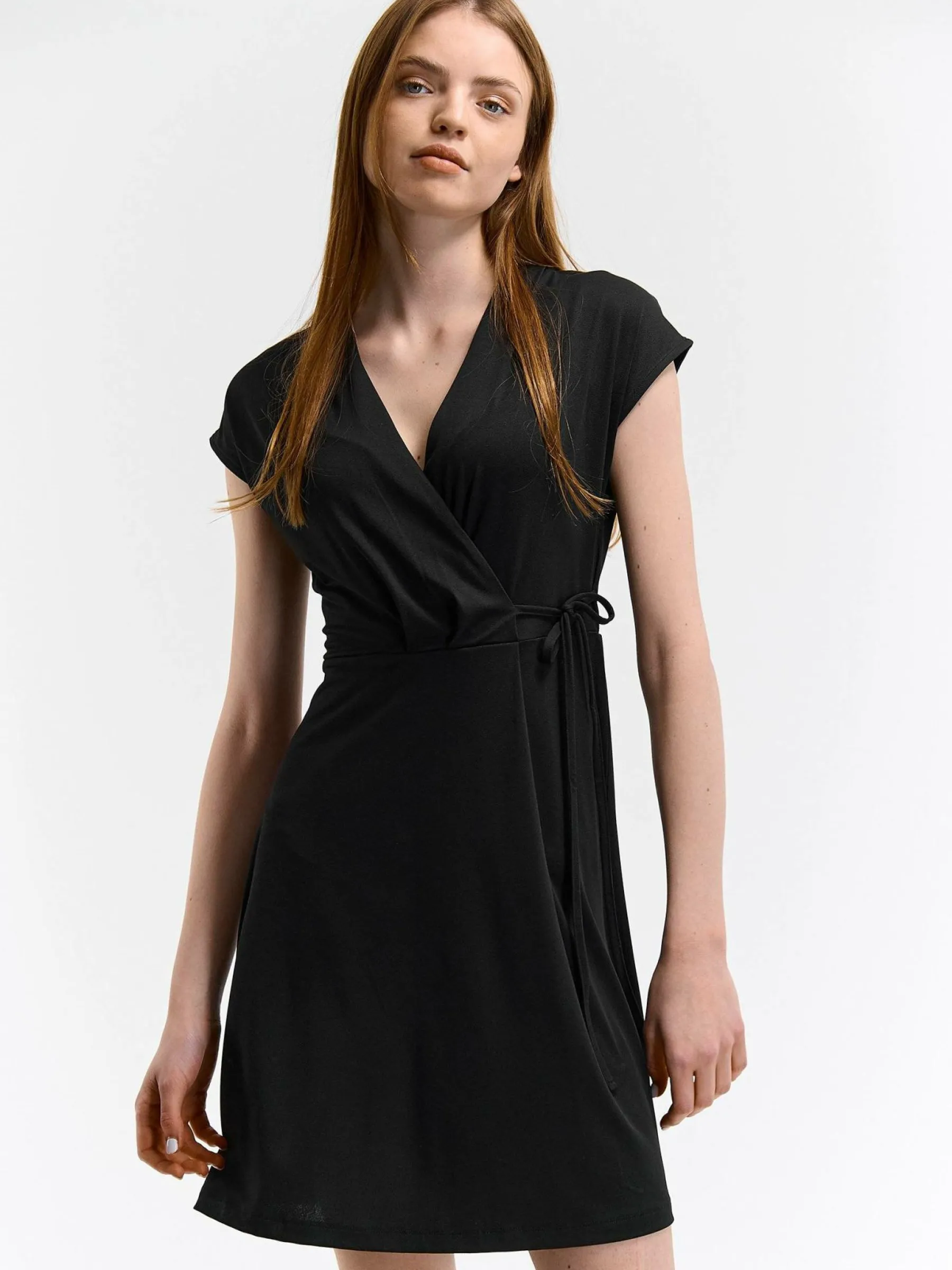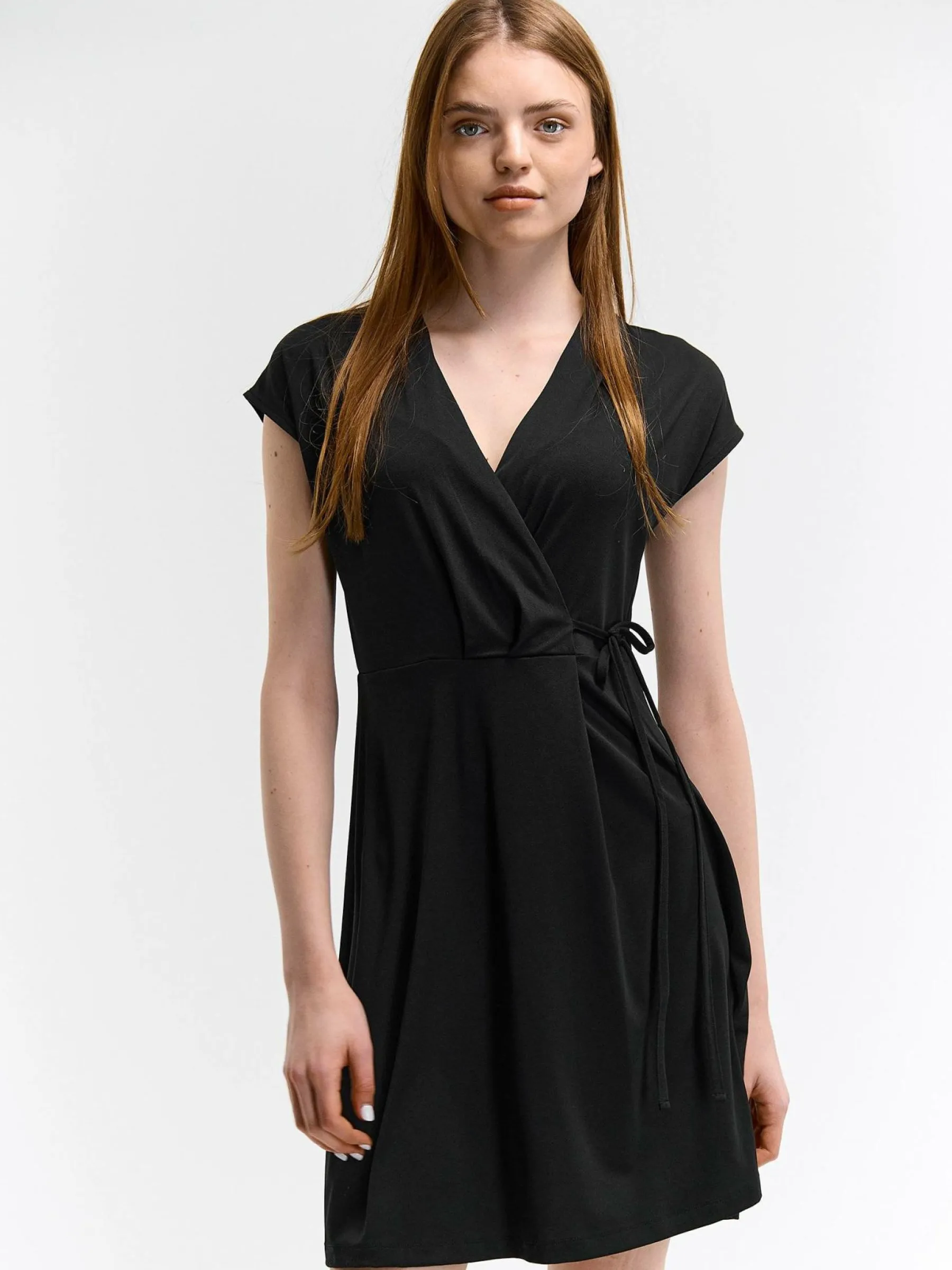 Kolor: czarnyKrój: kopertówkiTyp: sukienkaRekaw: krótki rękawDługość: miniPattern style: pojedynczy kolorDetal: v…