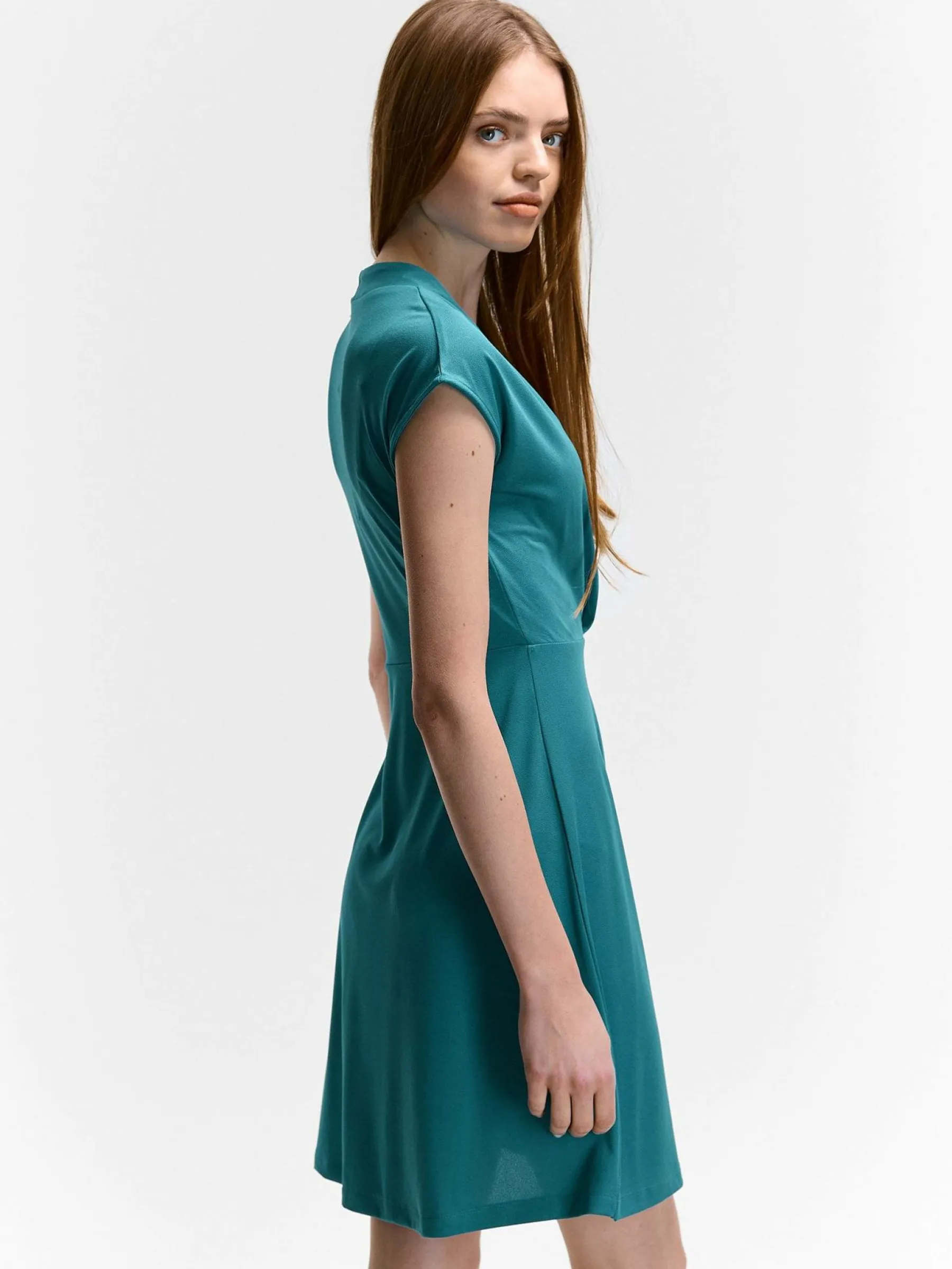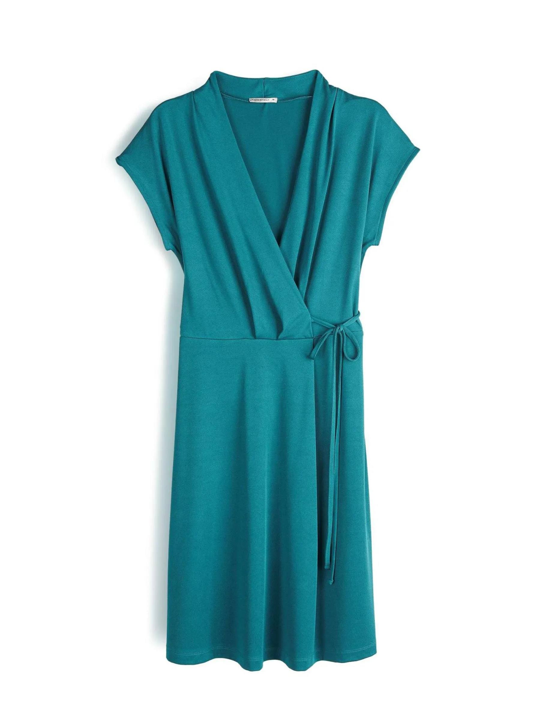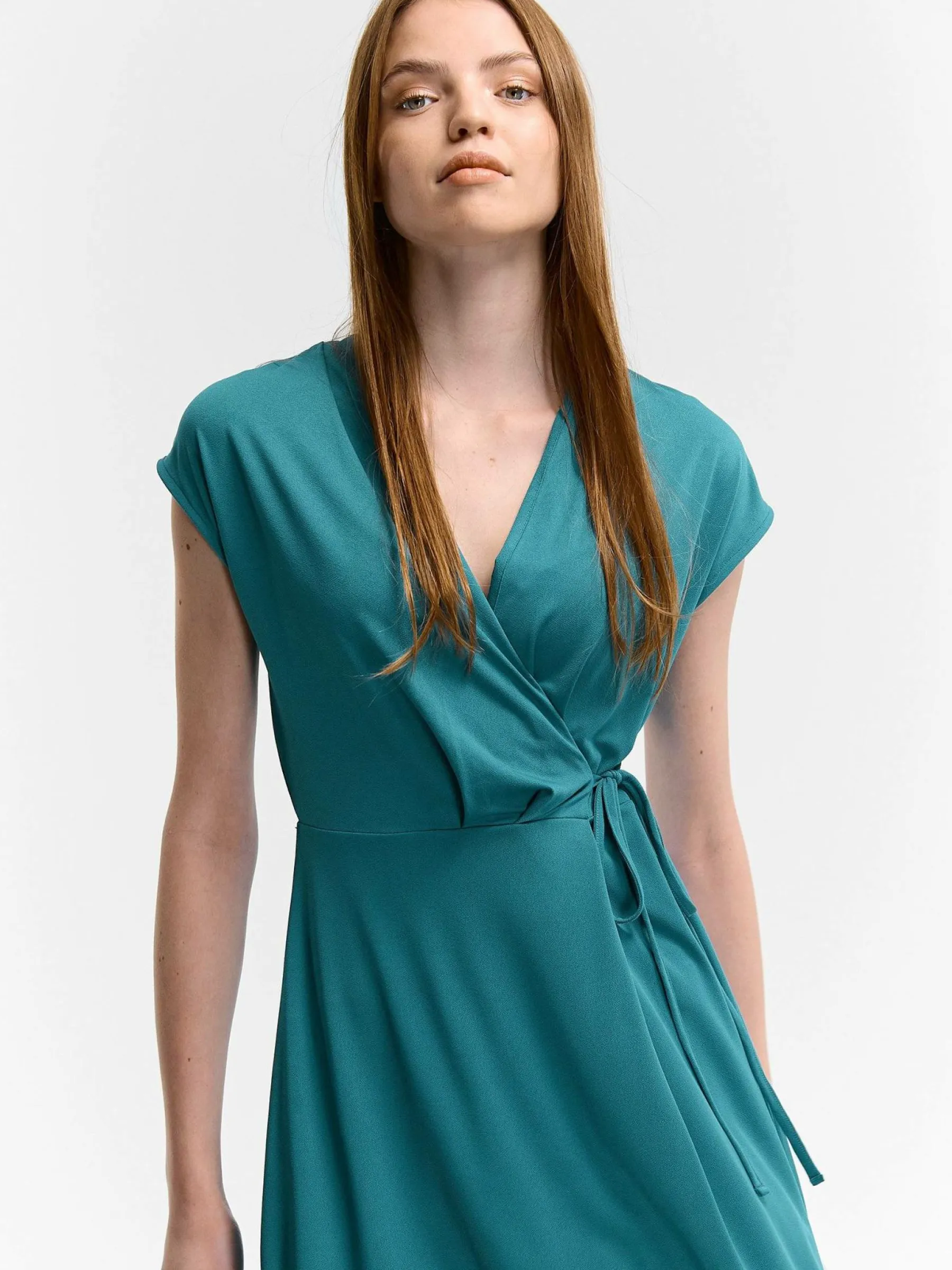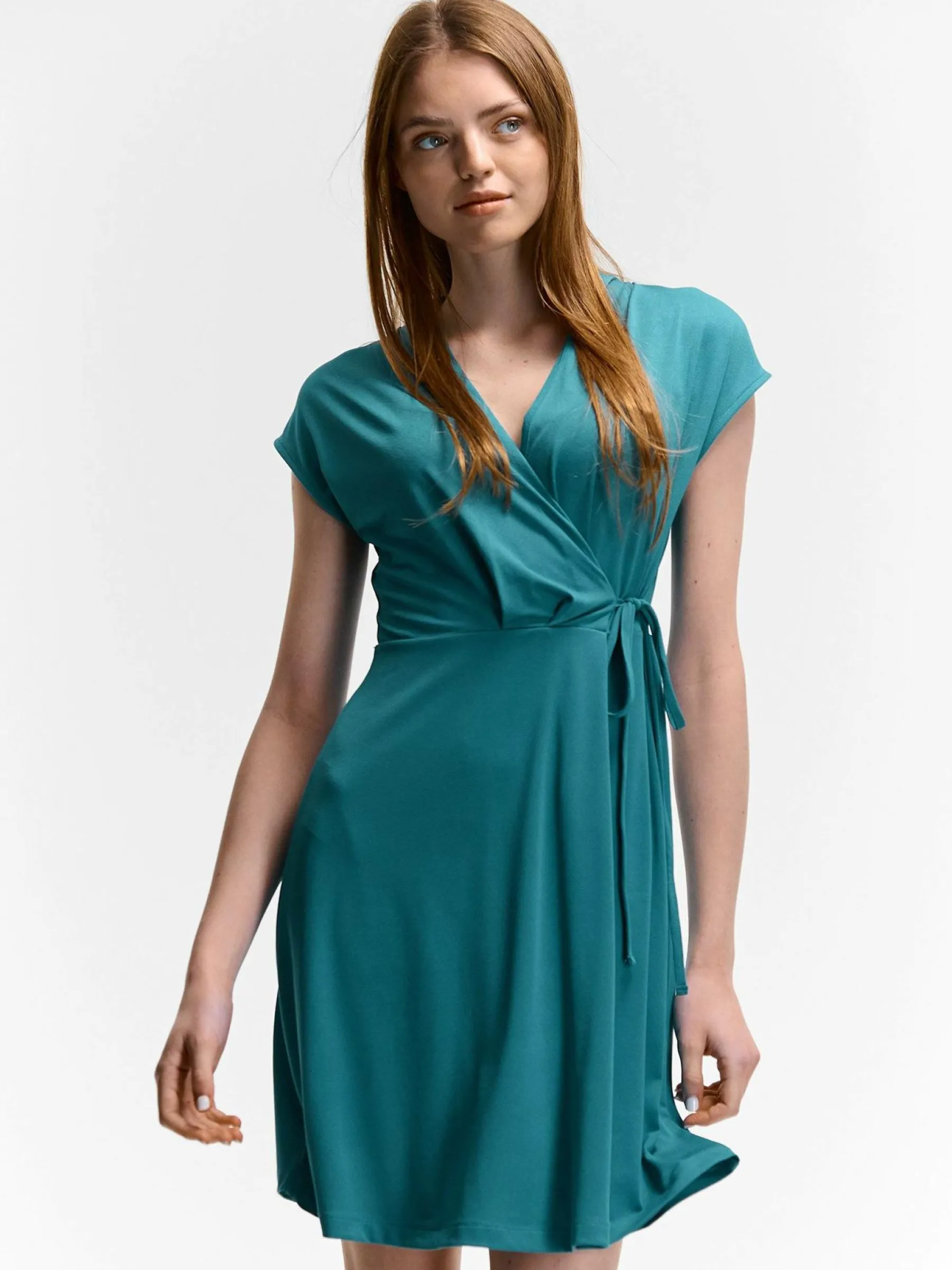 Kolor: niebieskiKrój: kopertówkiTyp: sukienkaRekaw: krótki rękawDługość: miniPattern style: pojedynczy kolorDetal…