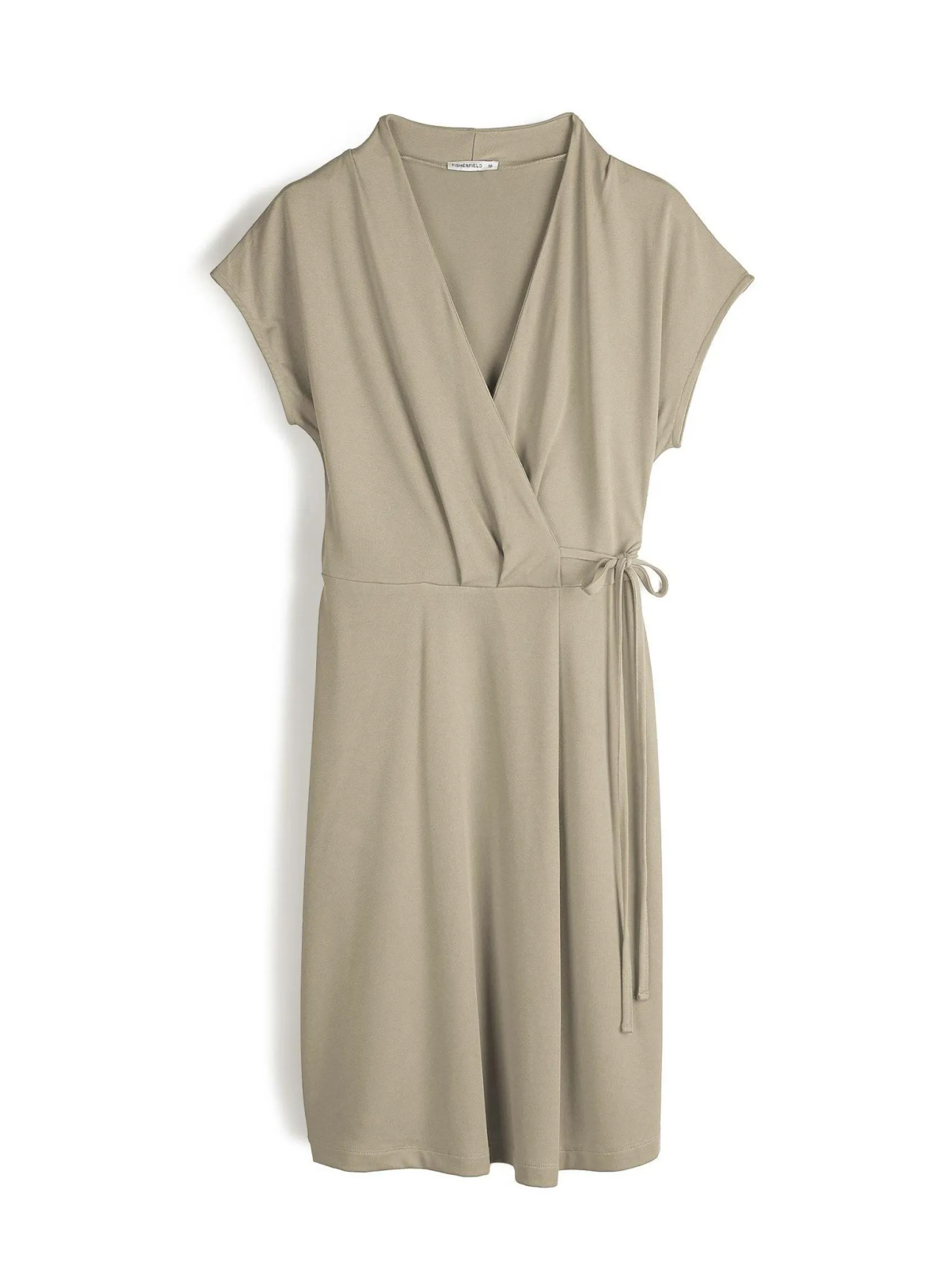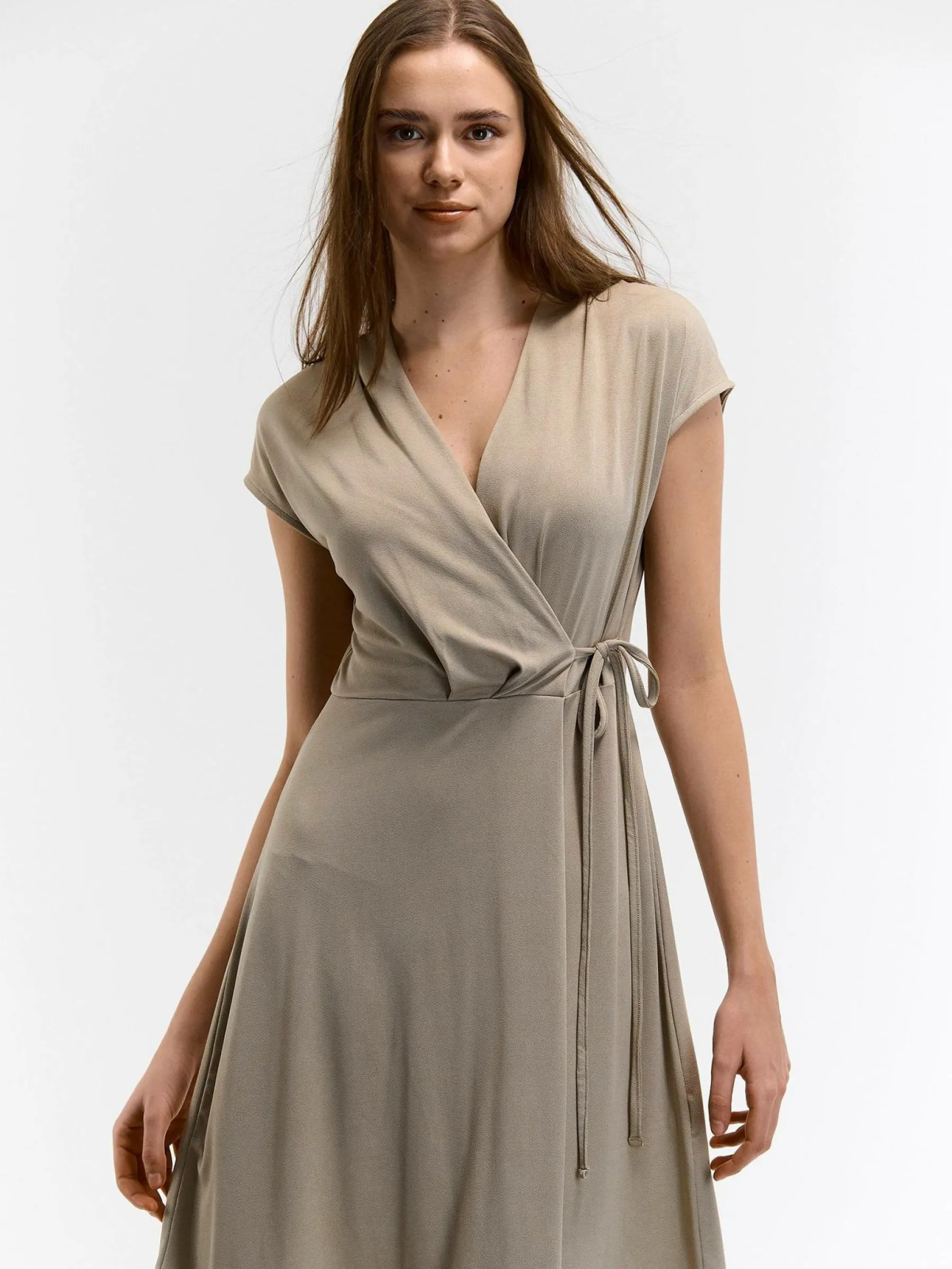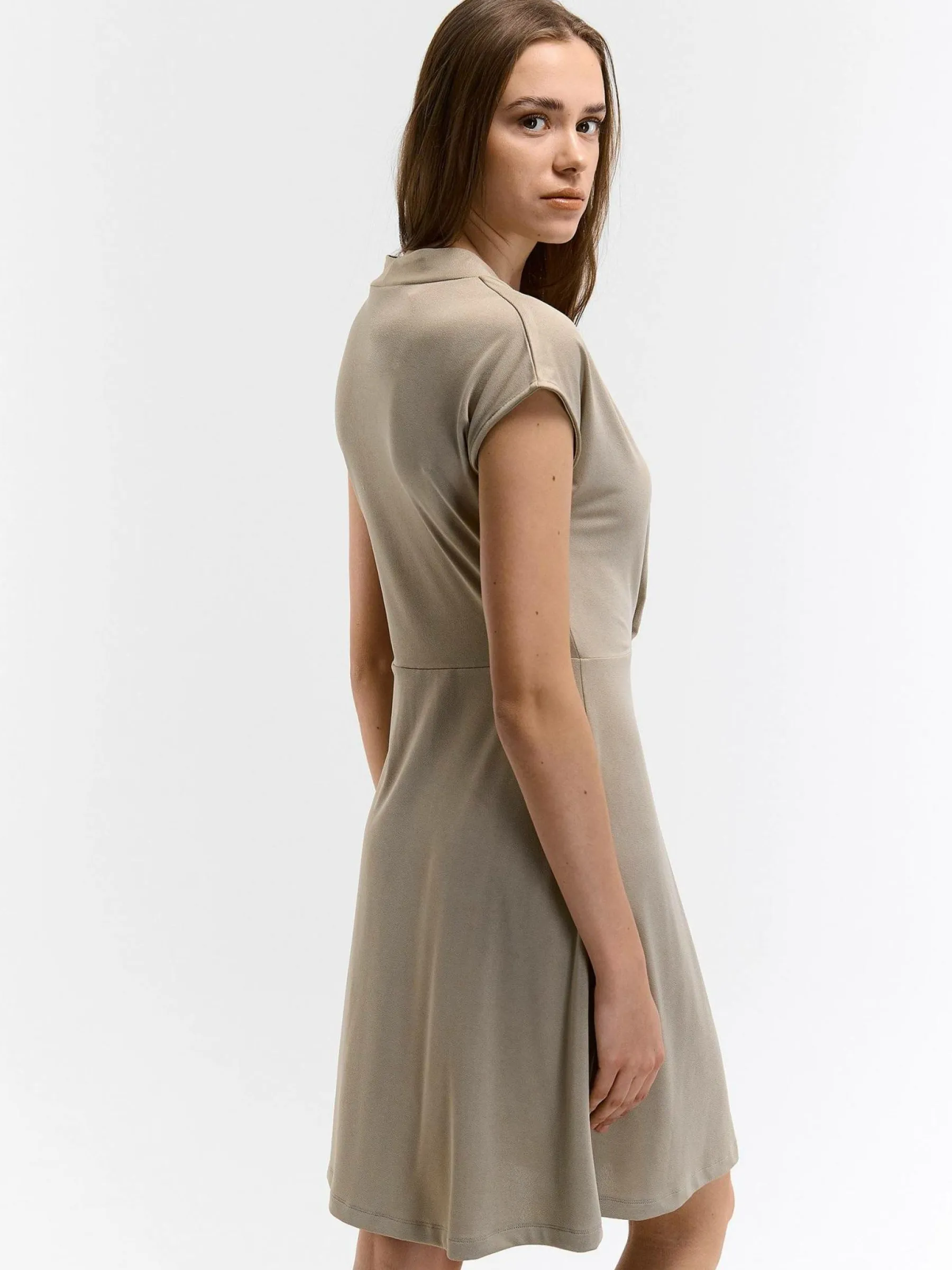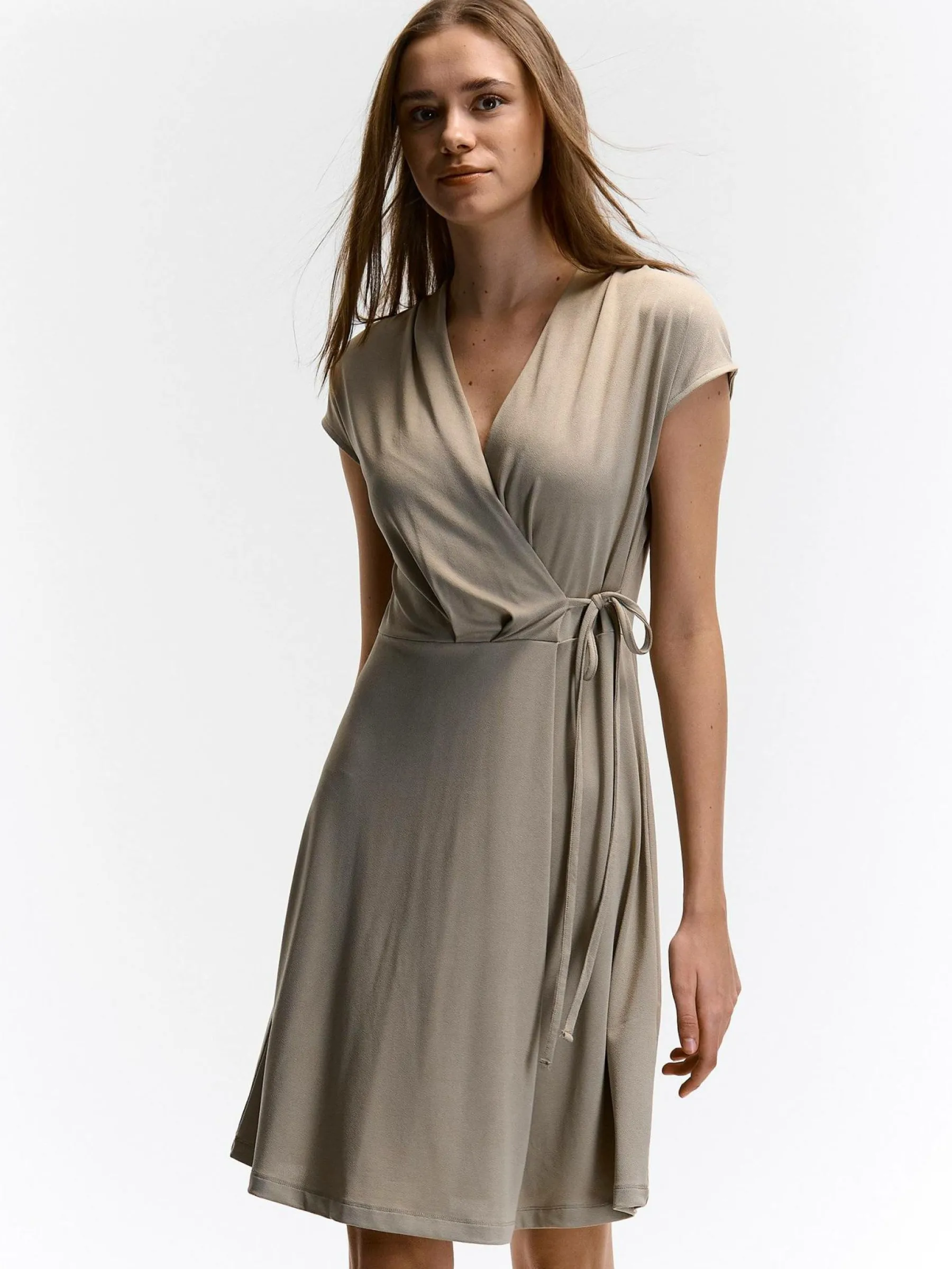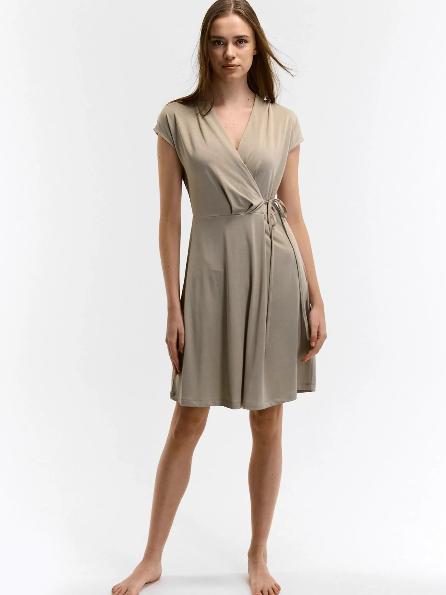 Kolor: beżowyKrój: kopertówkiTyp: sukienkaRekaw: krótki rękawDługość: miniPattern style: pojedynczy kolorDetal: …
