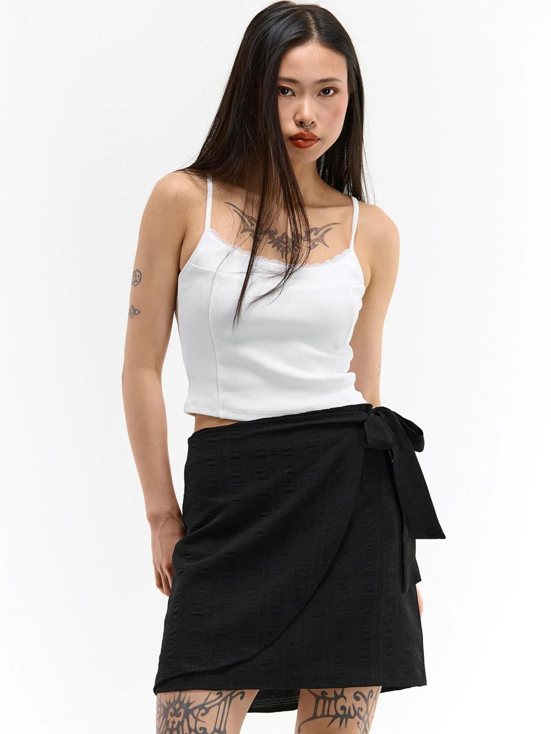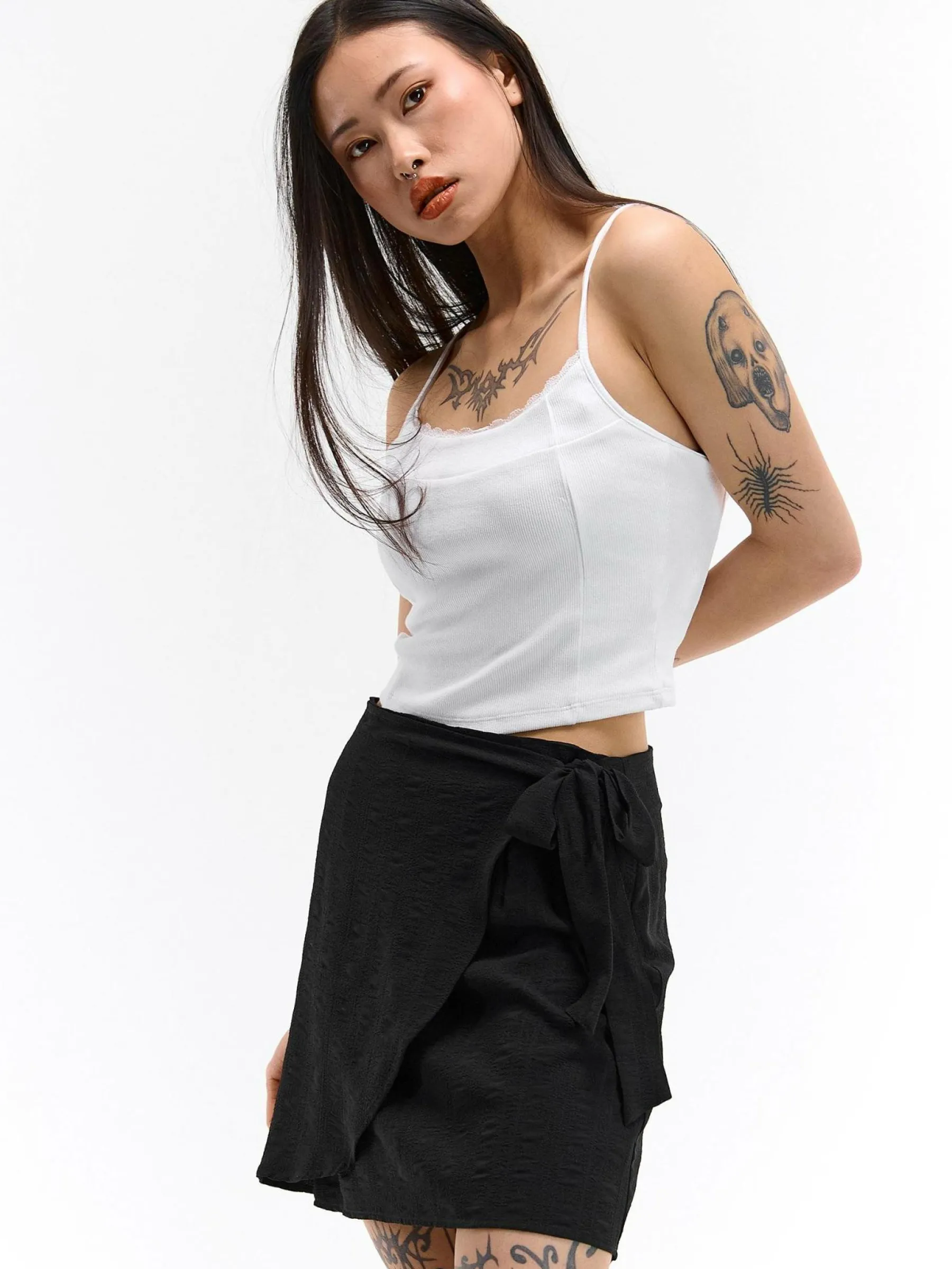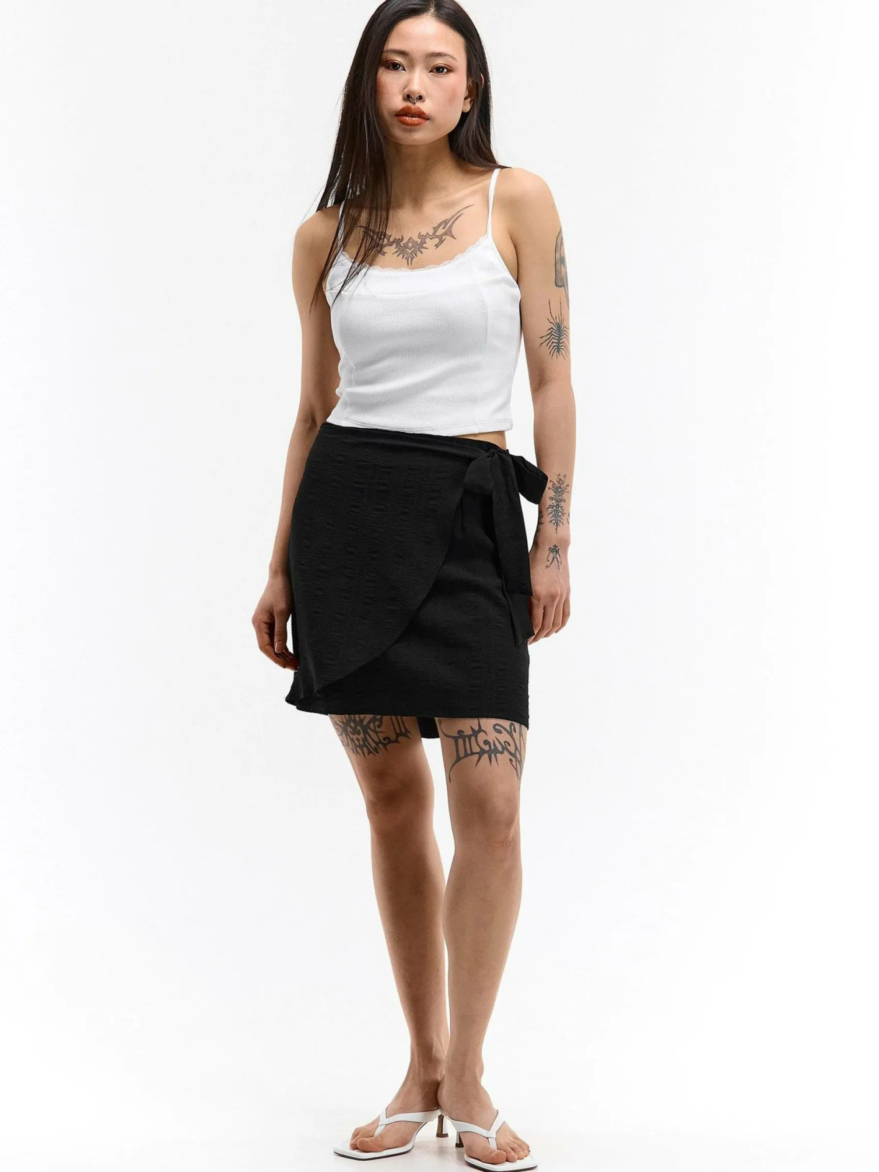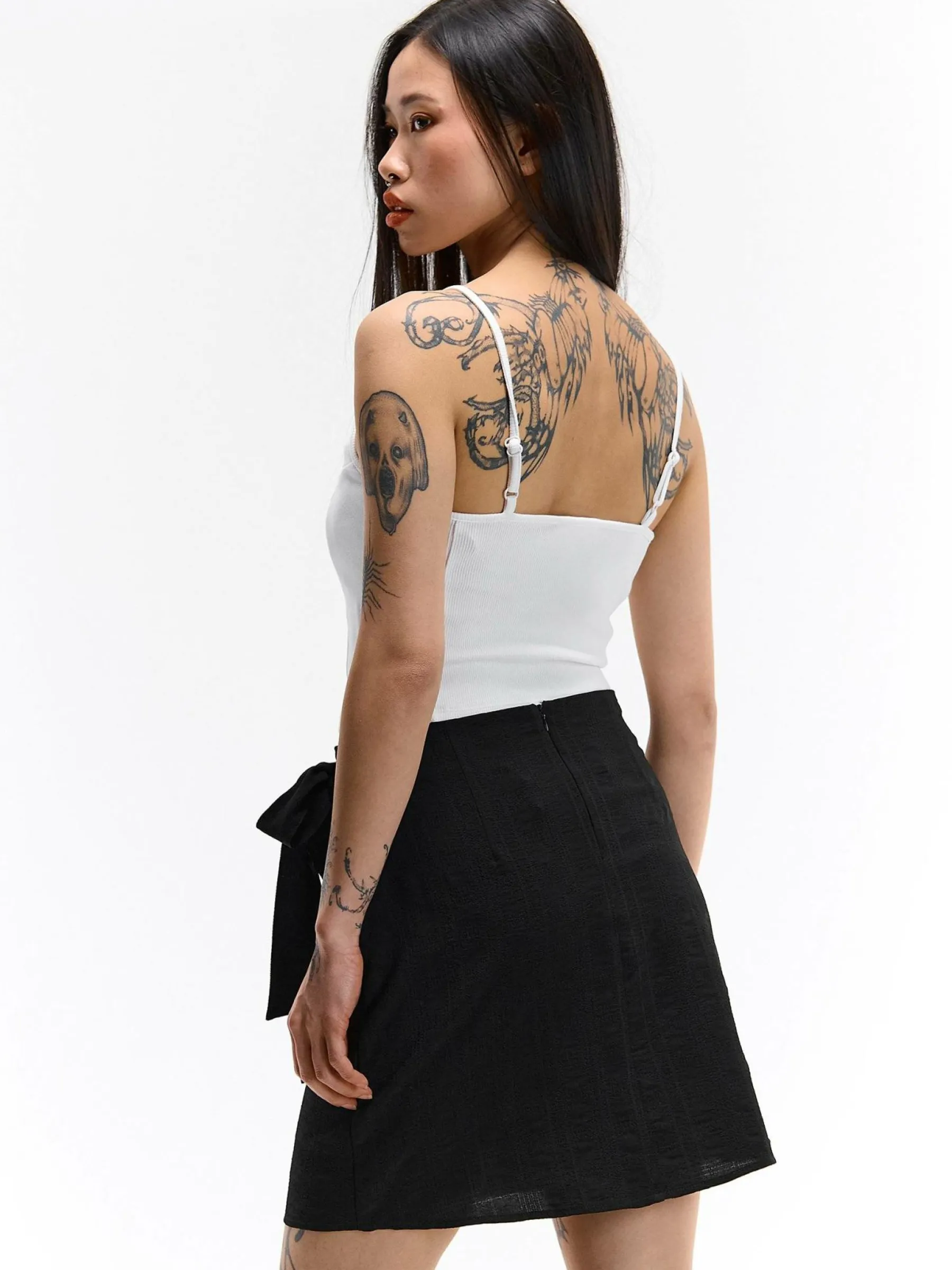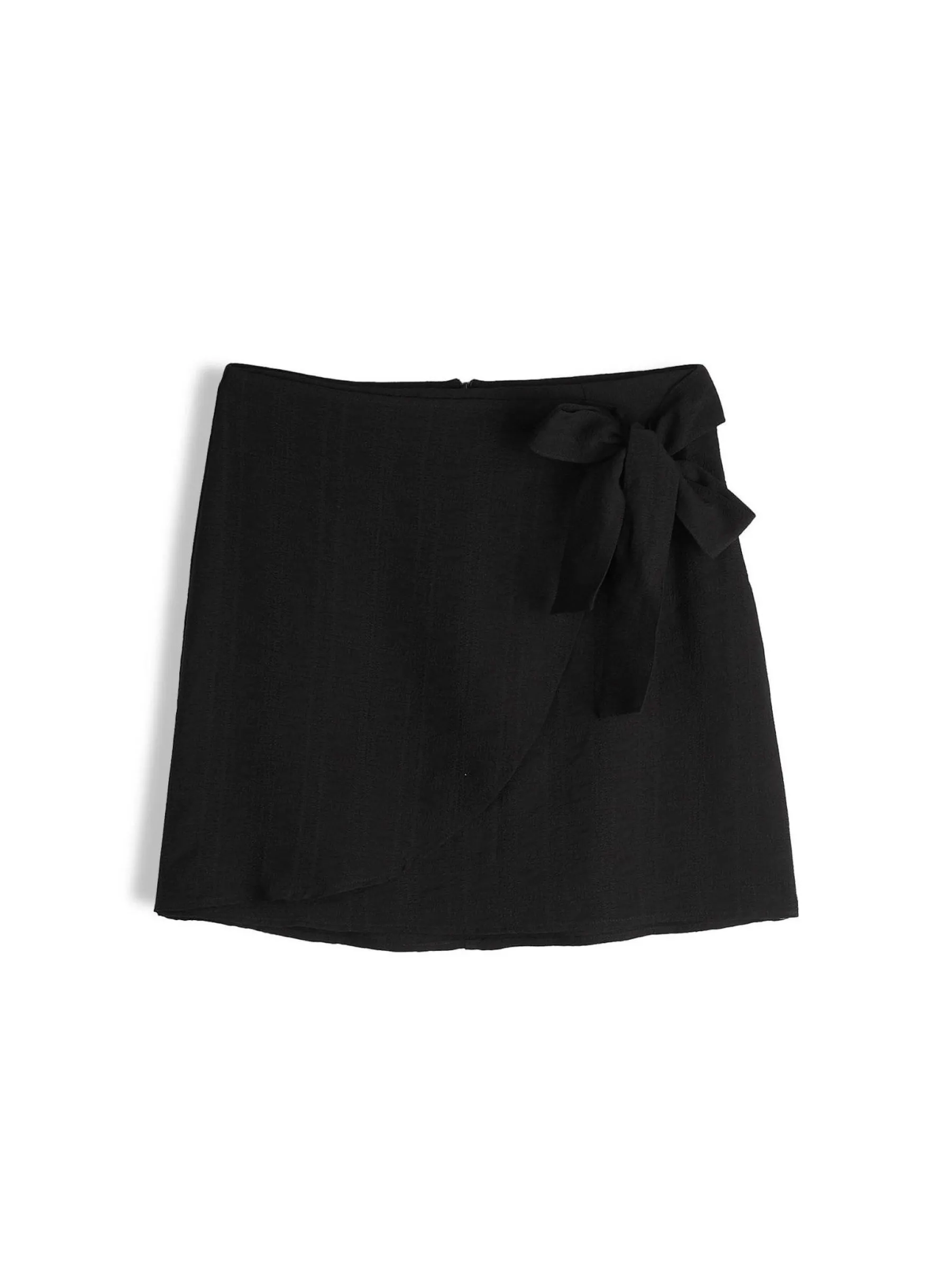 Kolor: czarnyKrój: kopertówkiTyp: spódnicaDługość: miniPattern style: pojedynczy kolorDetal: na zamek, z kokardką…