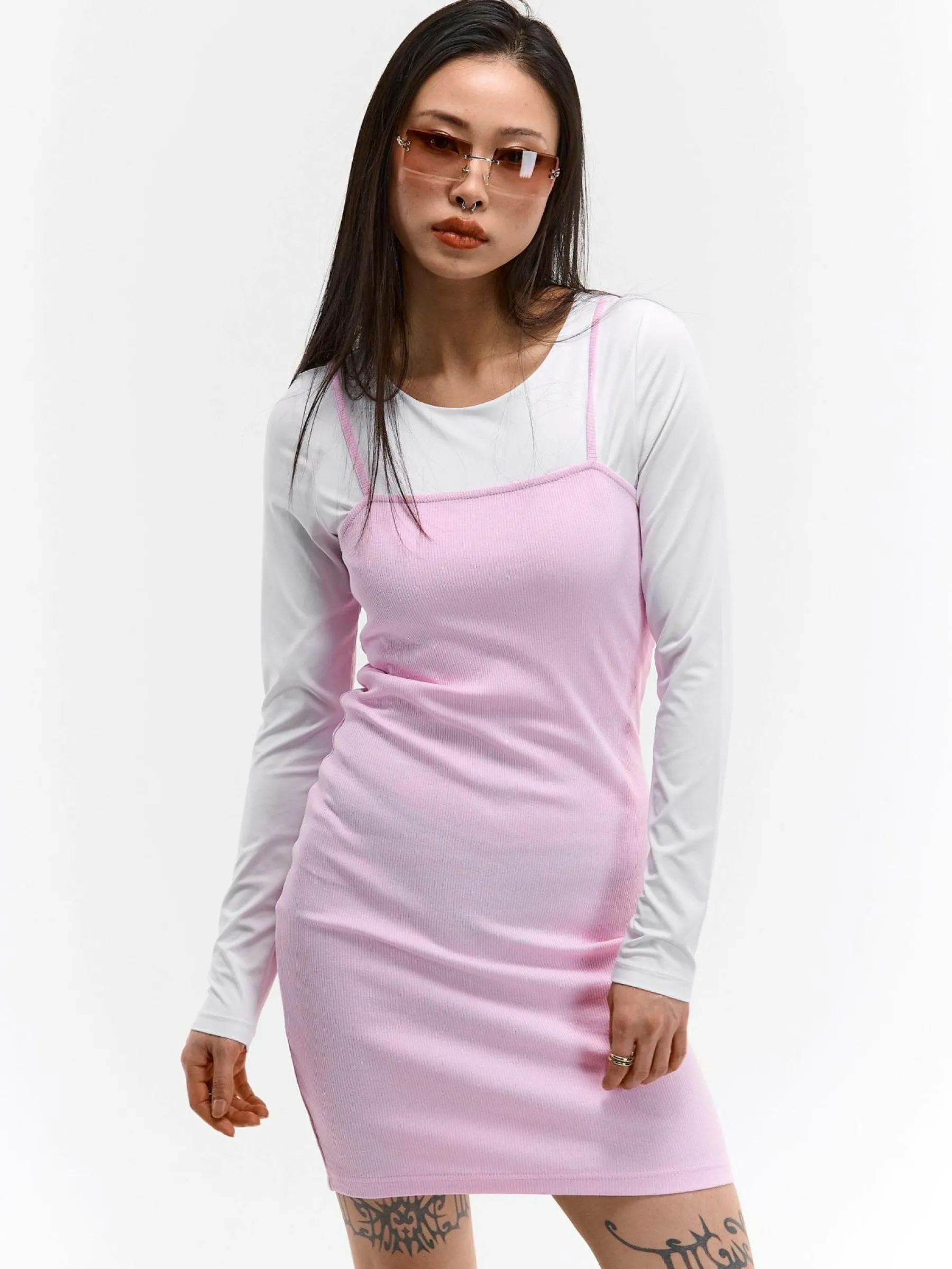 Kolor: różowyKrój: ołówkoweTyp: sukienkaRekaw: bez rękawówDługość: miniPattern style: pojedynczy kolor, żebro…