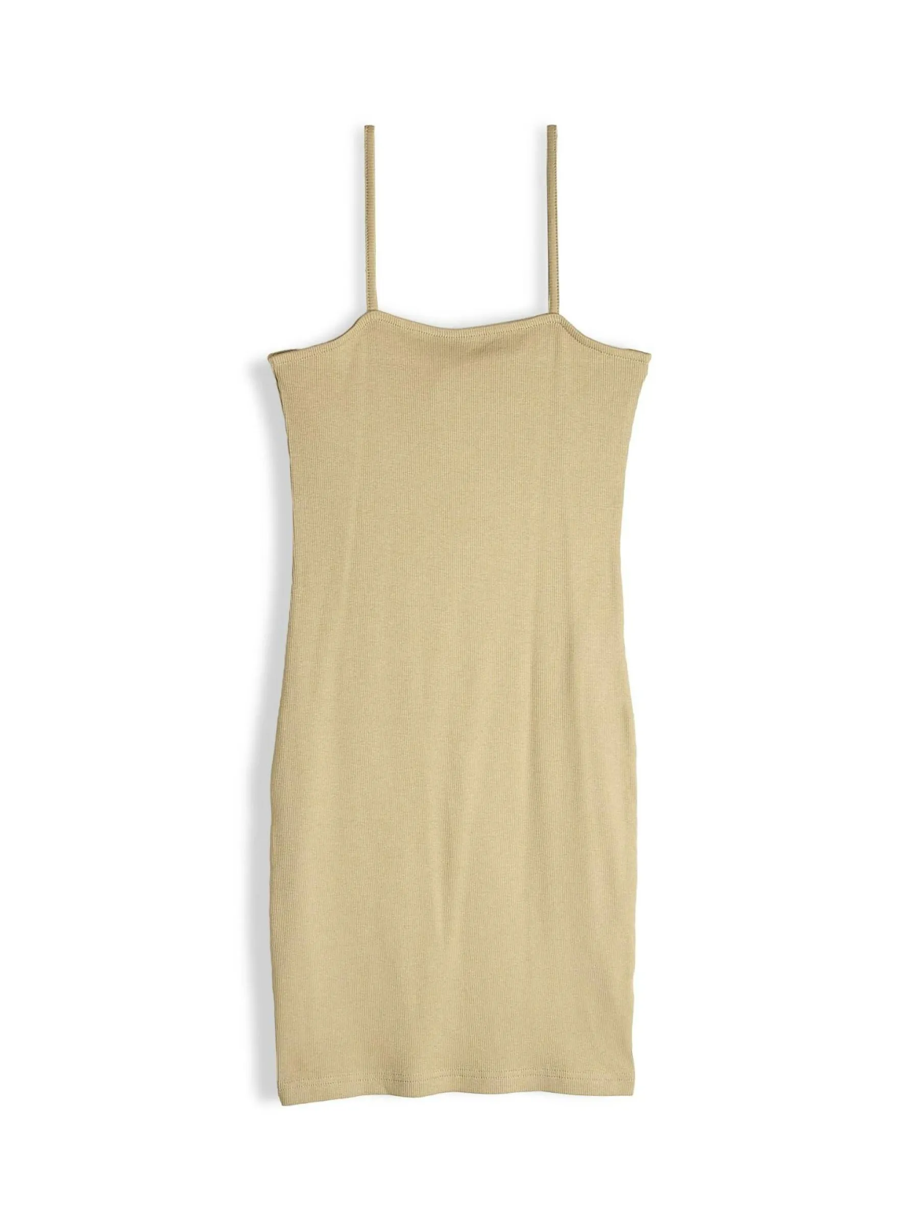 Kolor: beżowyKrój: ołówkoweTyp: sukienkaRekaw: bez rękawówDługość: miniPattern style: pojedynczy kolor, żebrow…