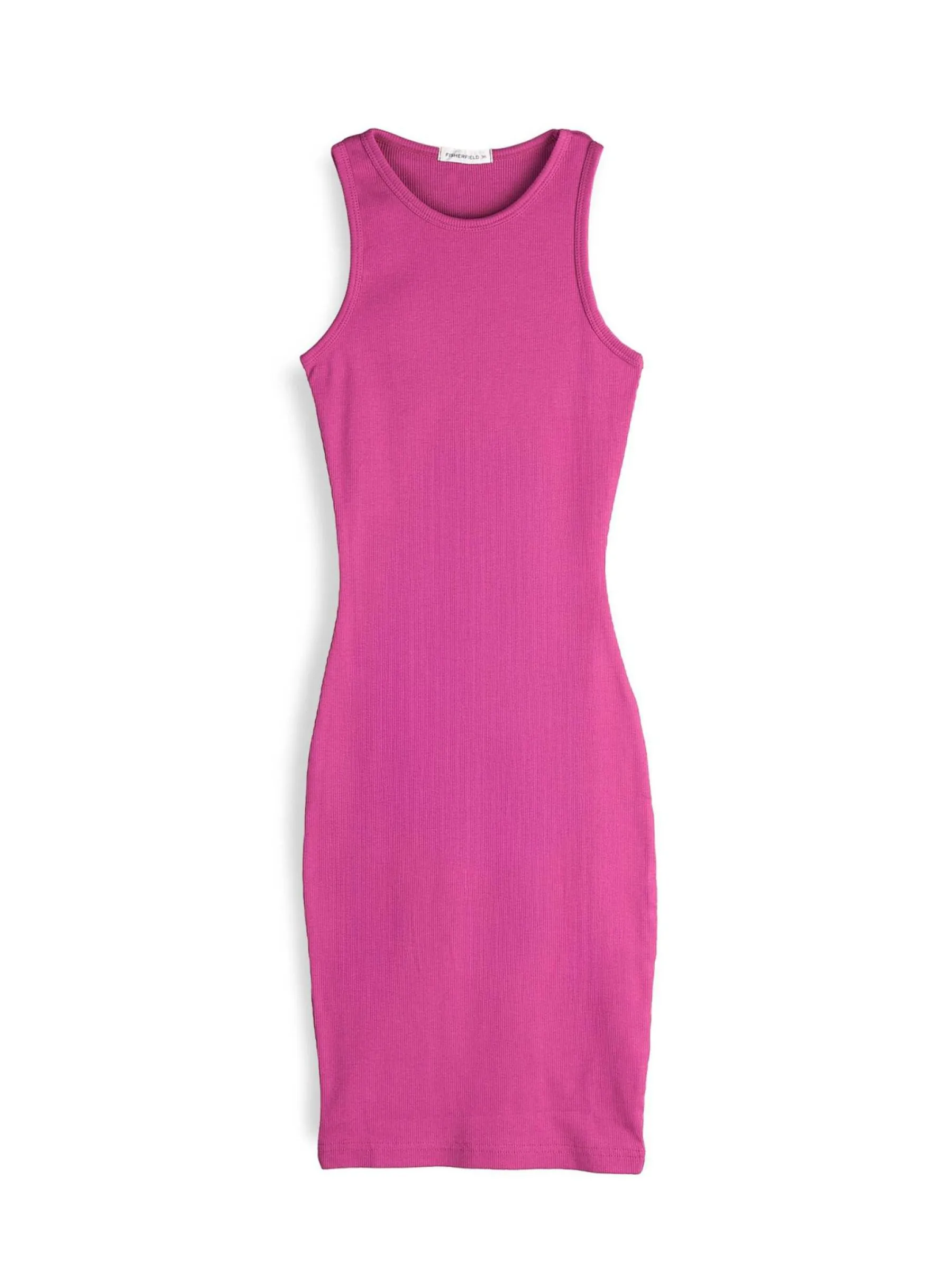 Kolor: różowyKrój: ołówkoweTyp: sukienkaRekaw: bez rękawówDługość: miniPattern style: pojedynczy kolor, żebro…