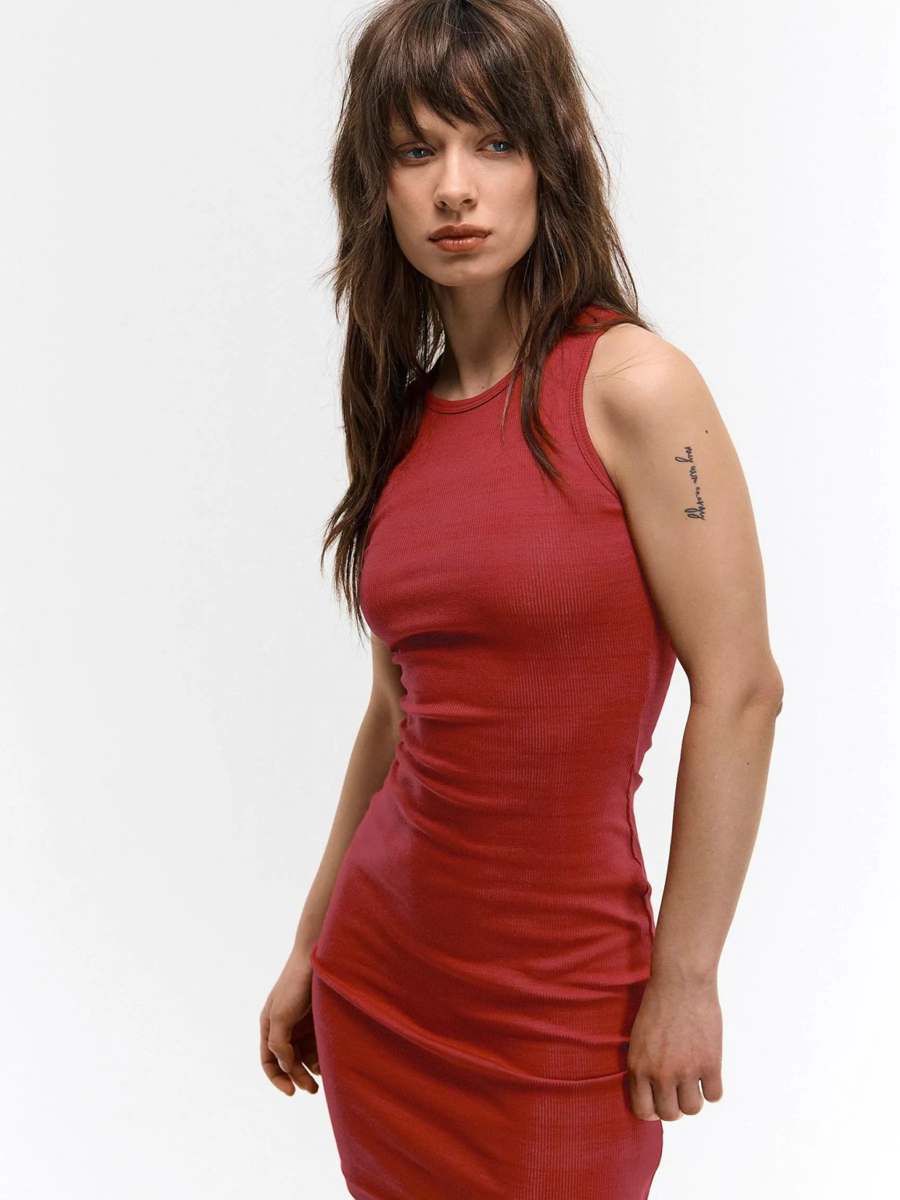 Kolor: czerwonyKrój: ołówkoweTyp: sukienkaRekaw: bez rękawówDługość: miniPattern style: pojedynczy kolor, żebro…