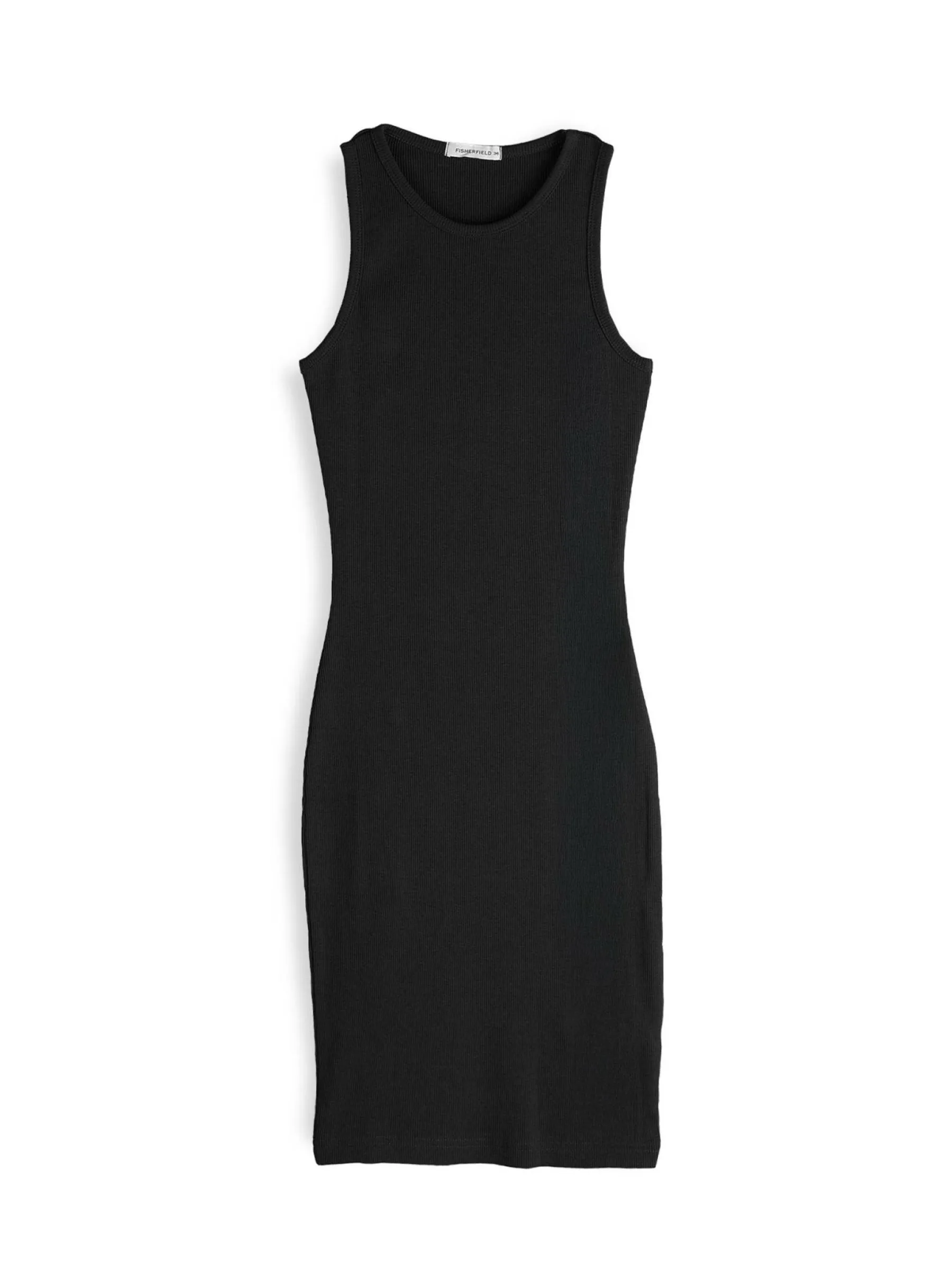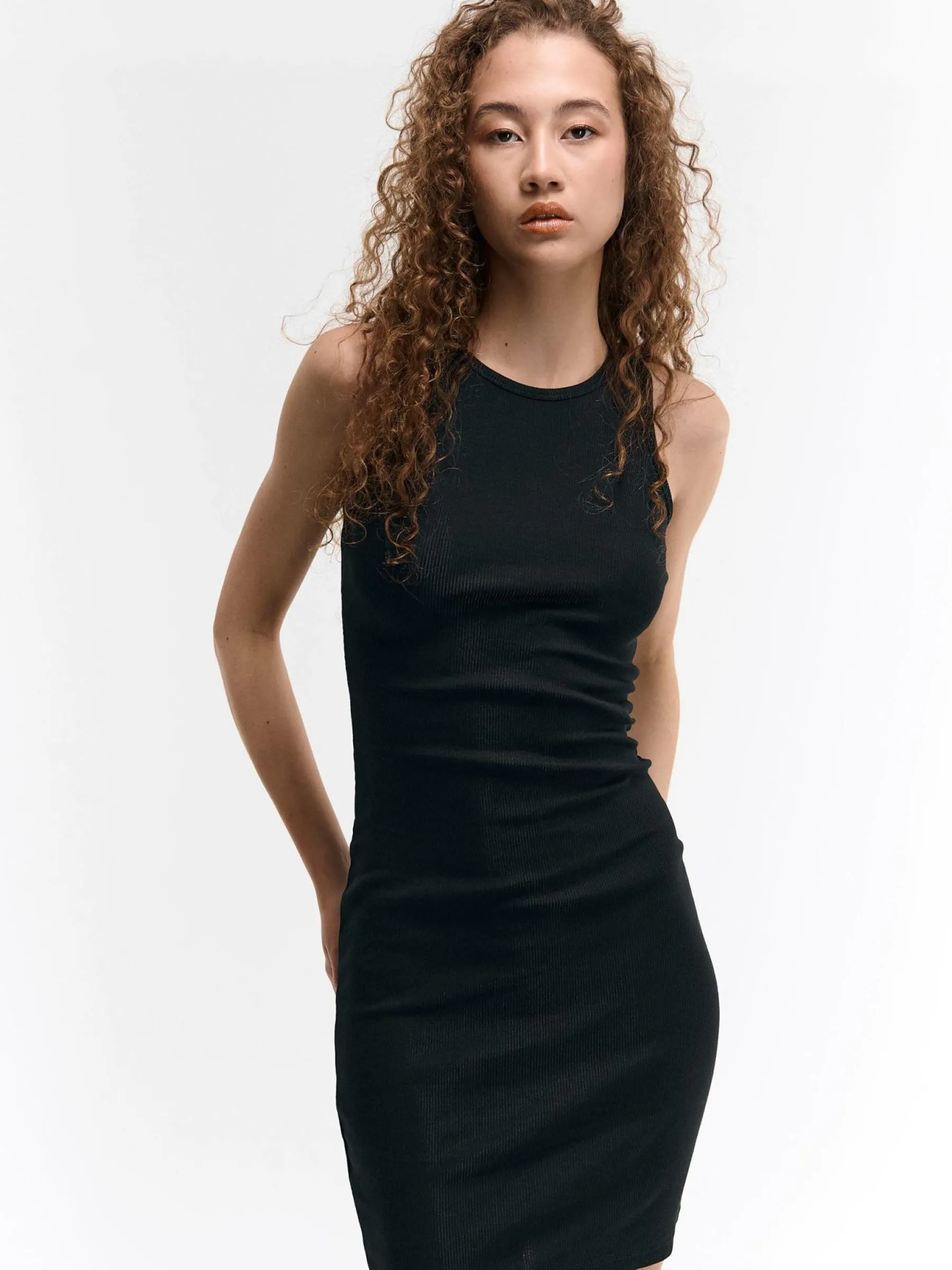Kolor: czarnyKrój: ołówkoweTyp: sukienkaRekaw: bez rękawówDługość: miniPattern style: pojedynczy kolor, żebrowa…