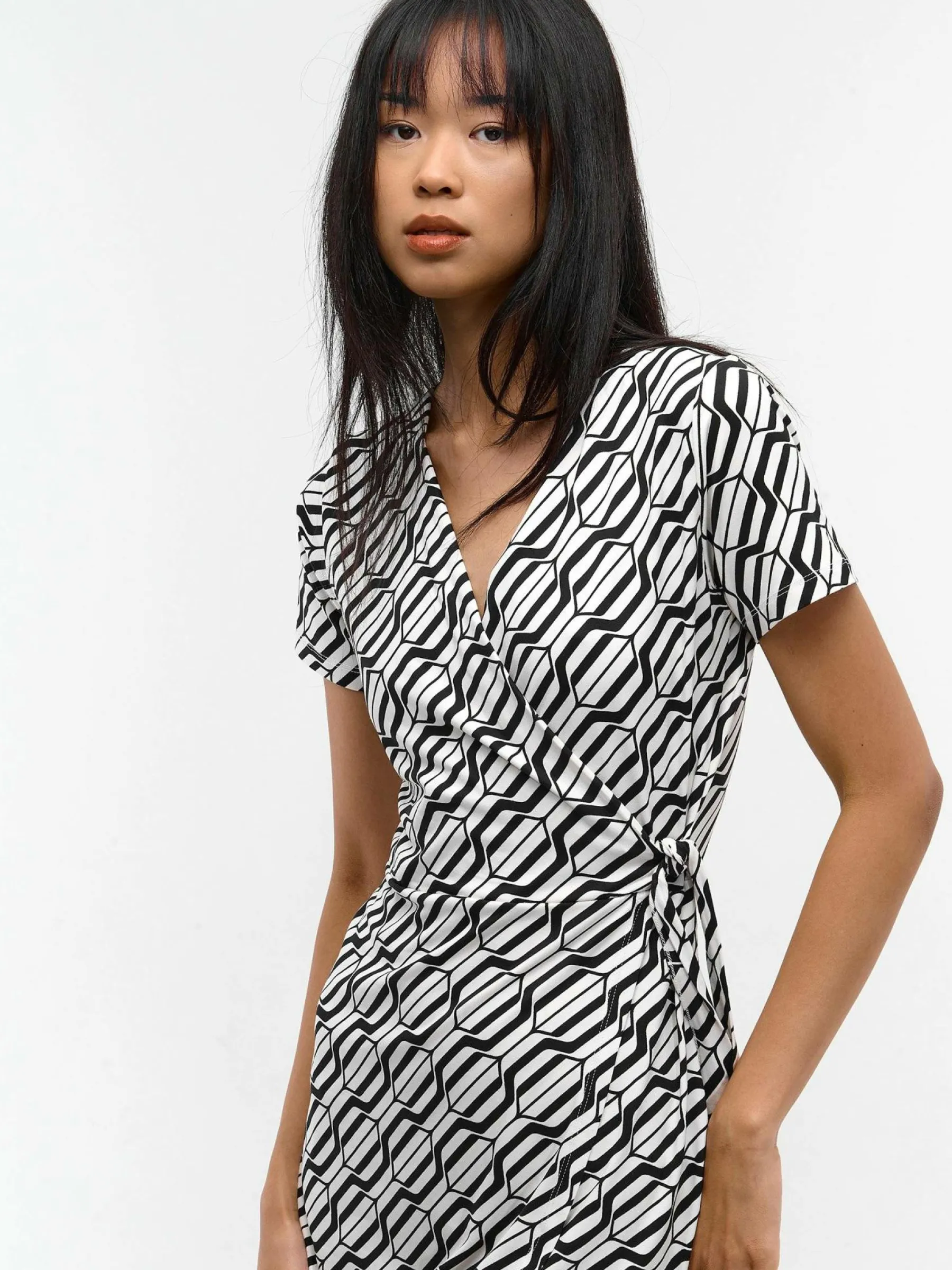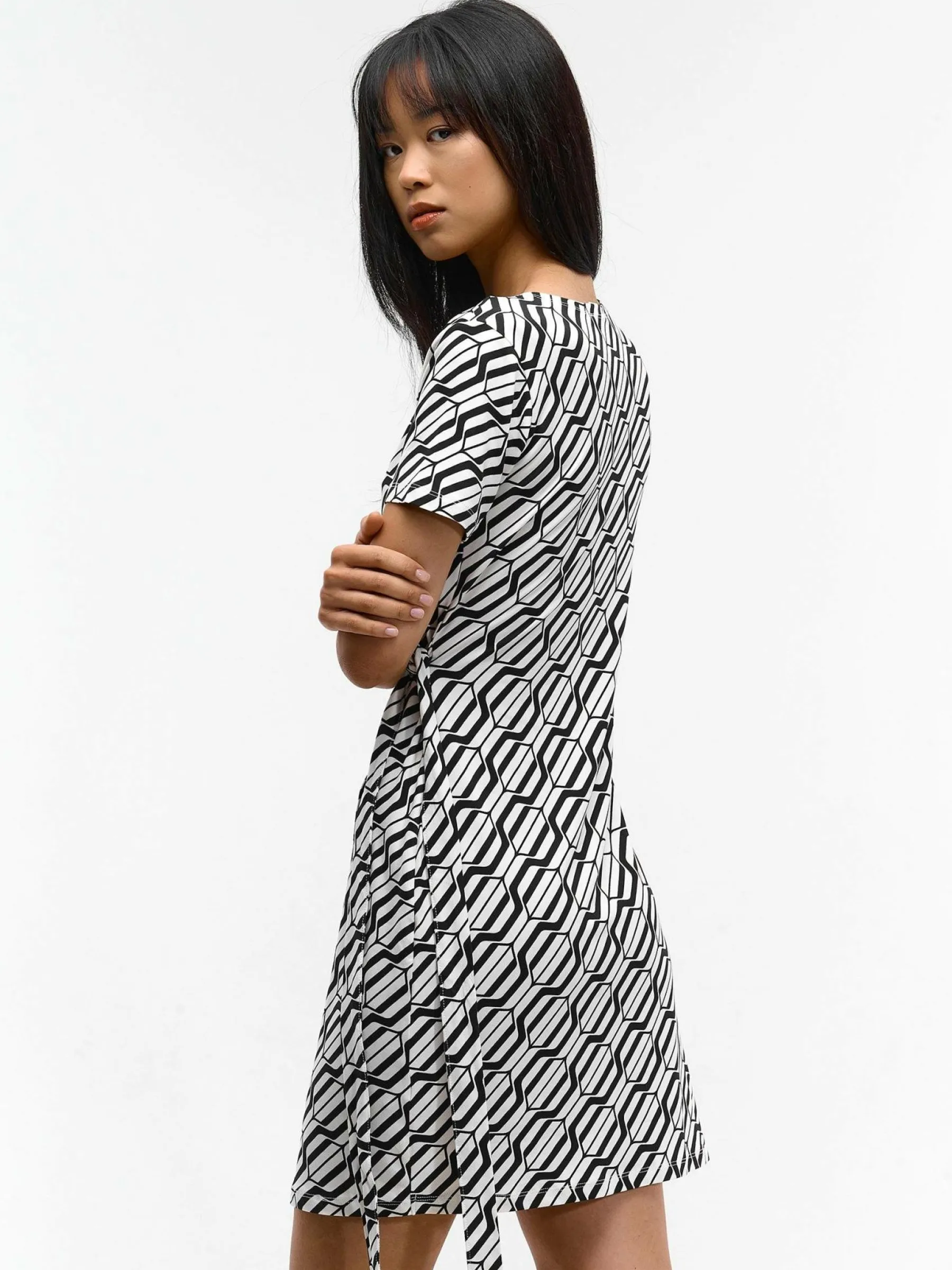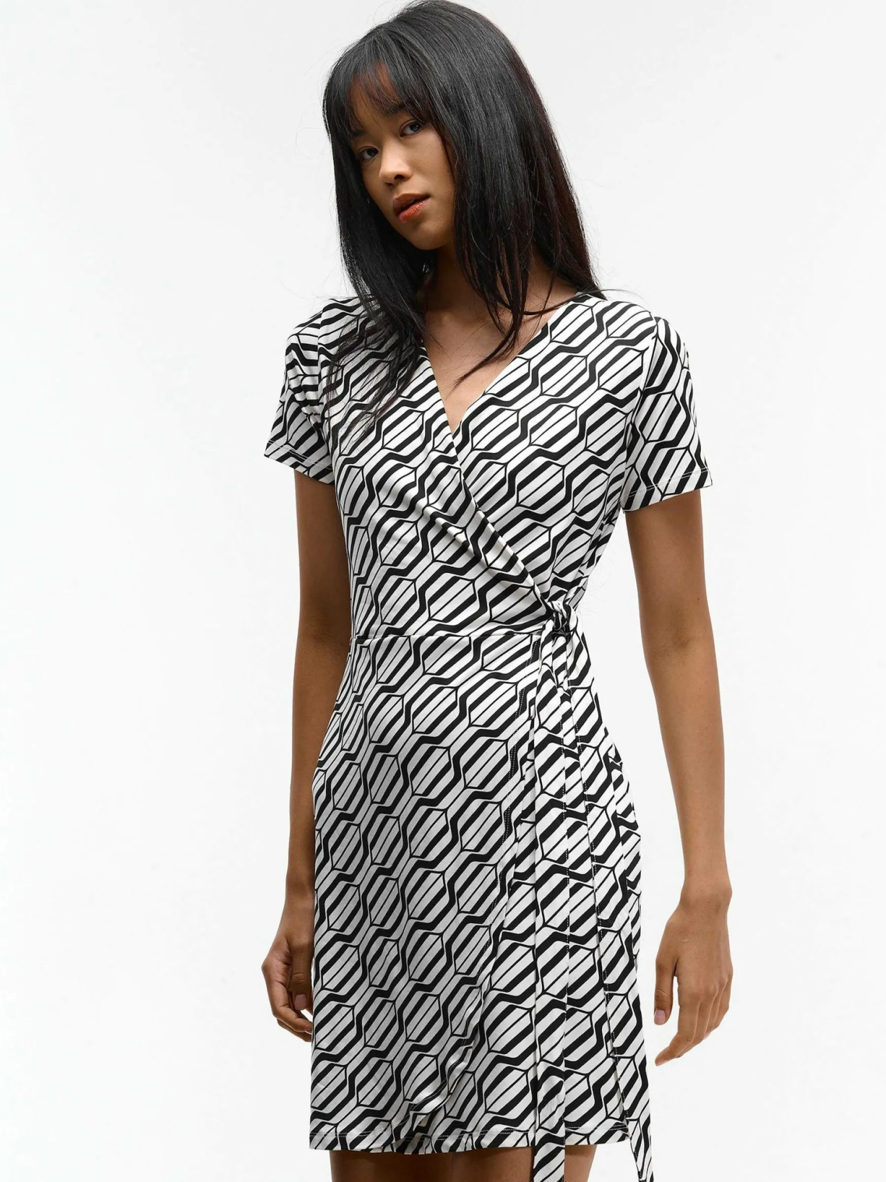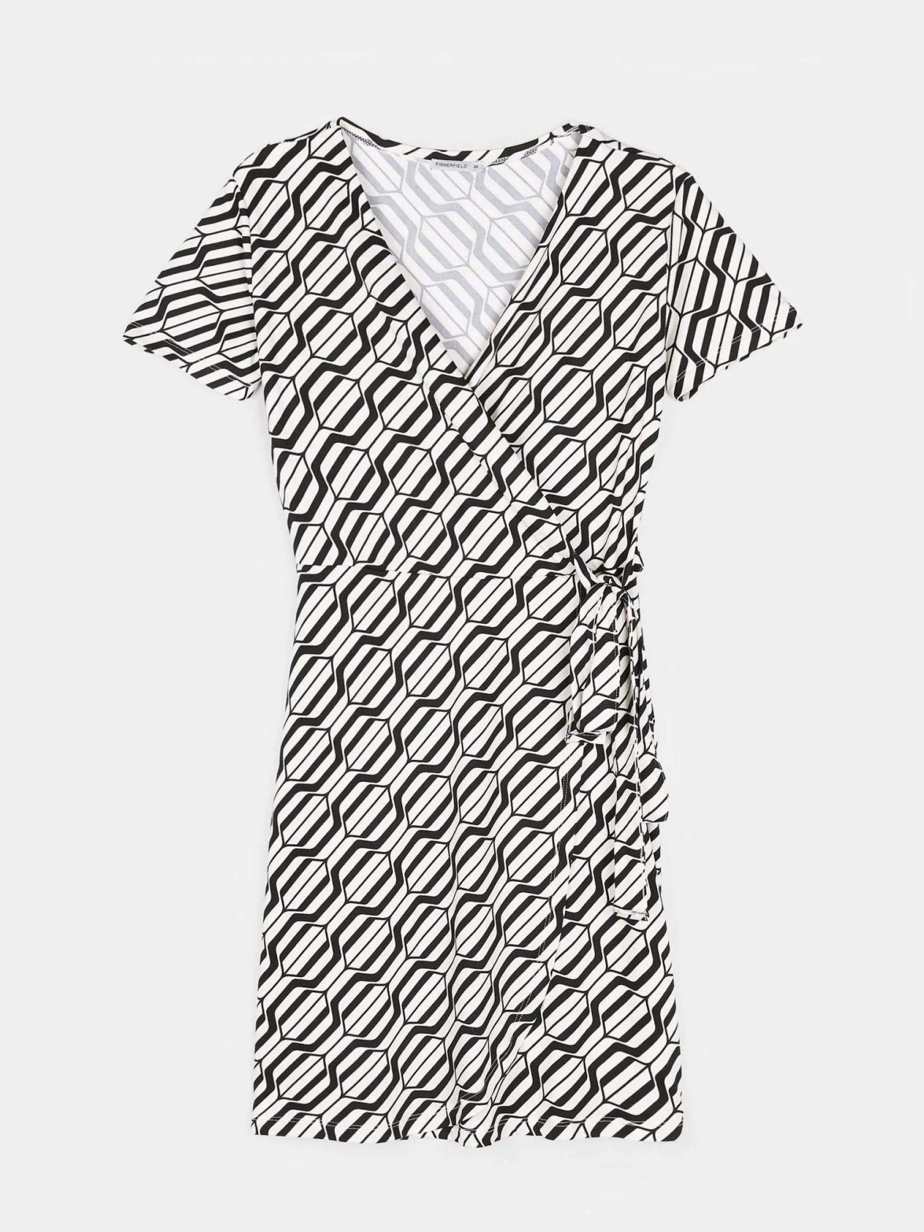 Kolor: beżowy, czarnyKrój: kopertówkiTyp: sukienkaRekaw: krótki rękawDługość: miniPattern style: z nadrukiemDeta…
