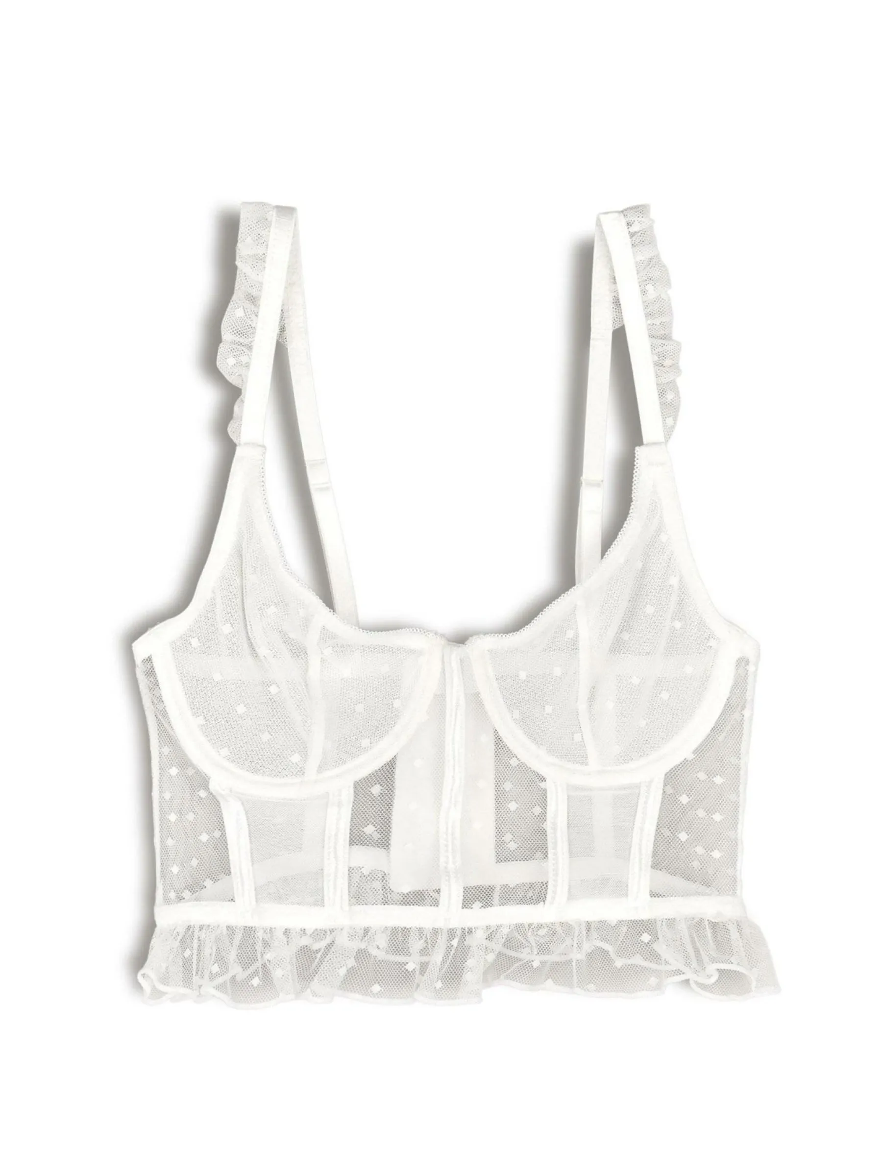 Kolor: białyKrój: z falbanąTyp: gorsetPattern style: w grochyDetal: z kośćmi, na haczykachMateriał: w sieci, synte…