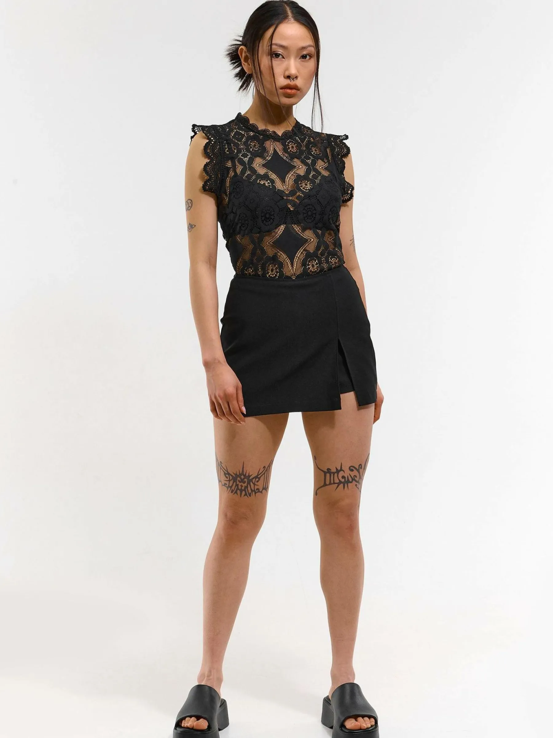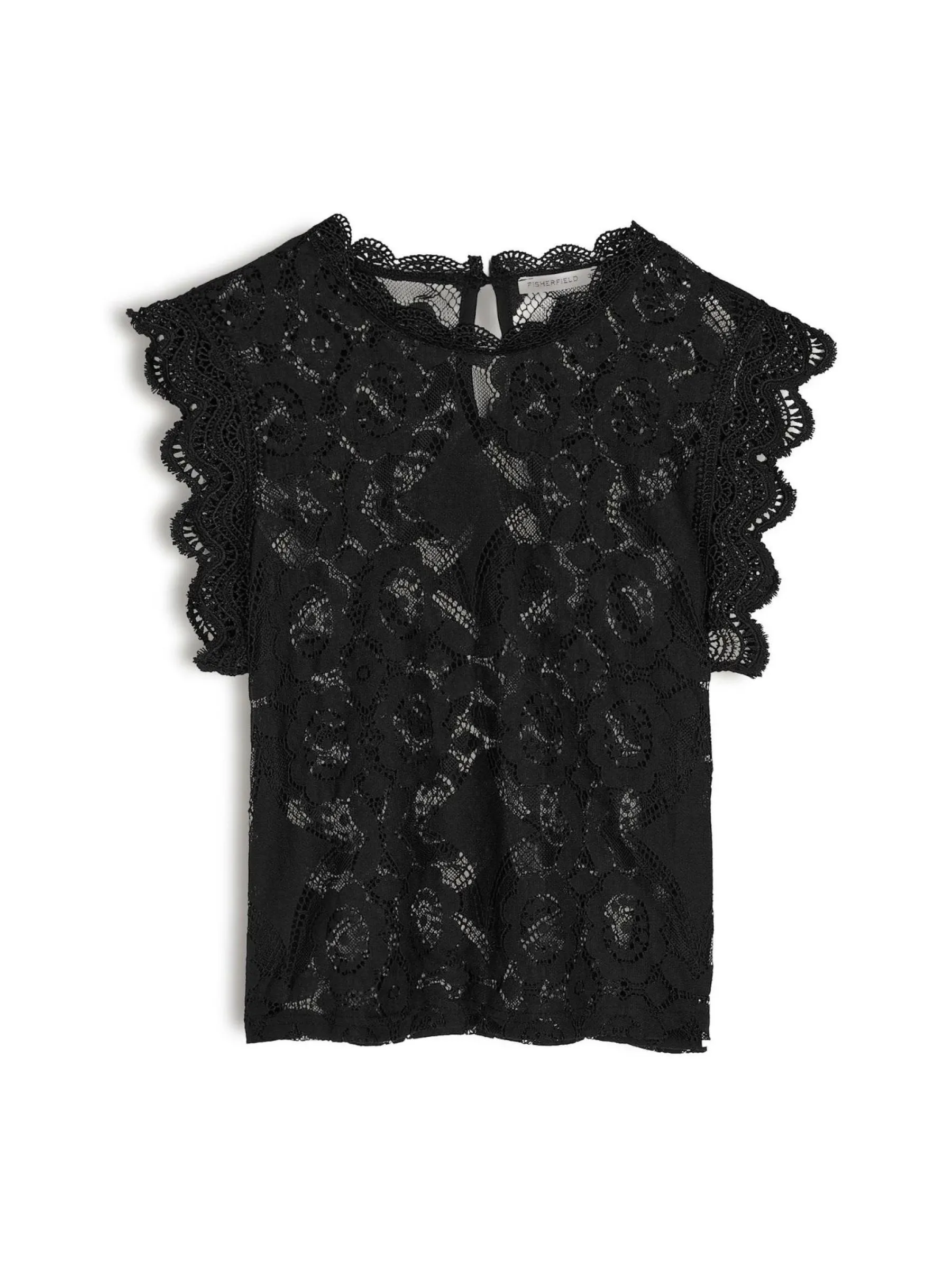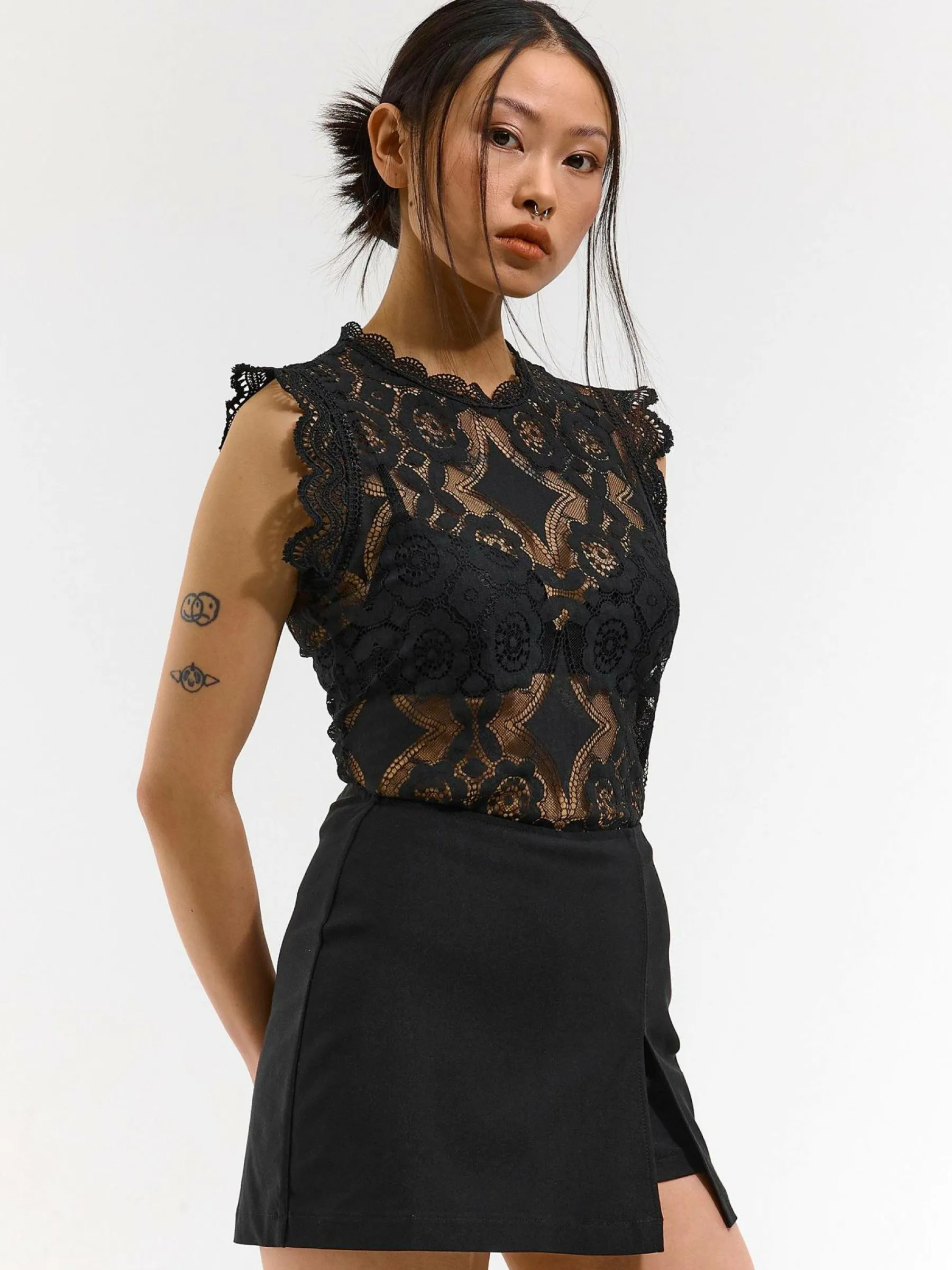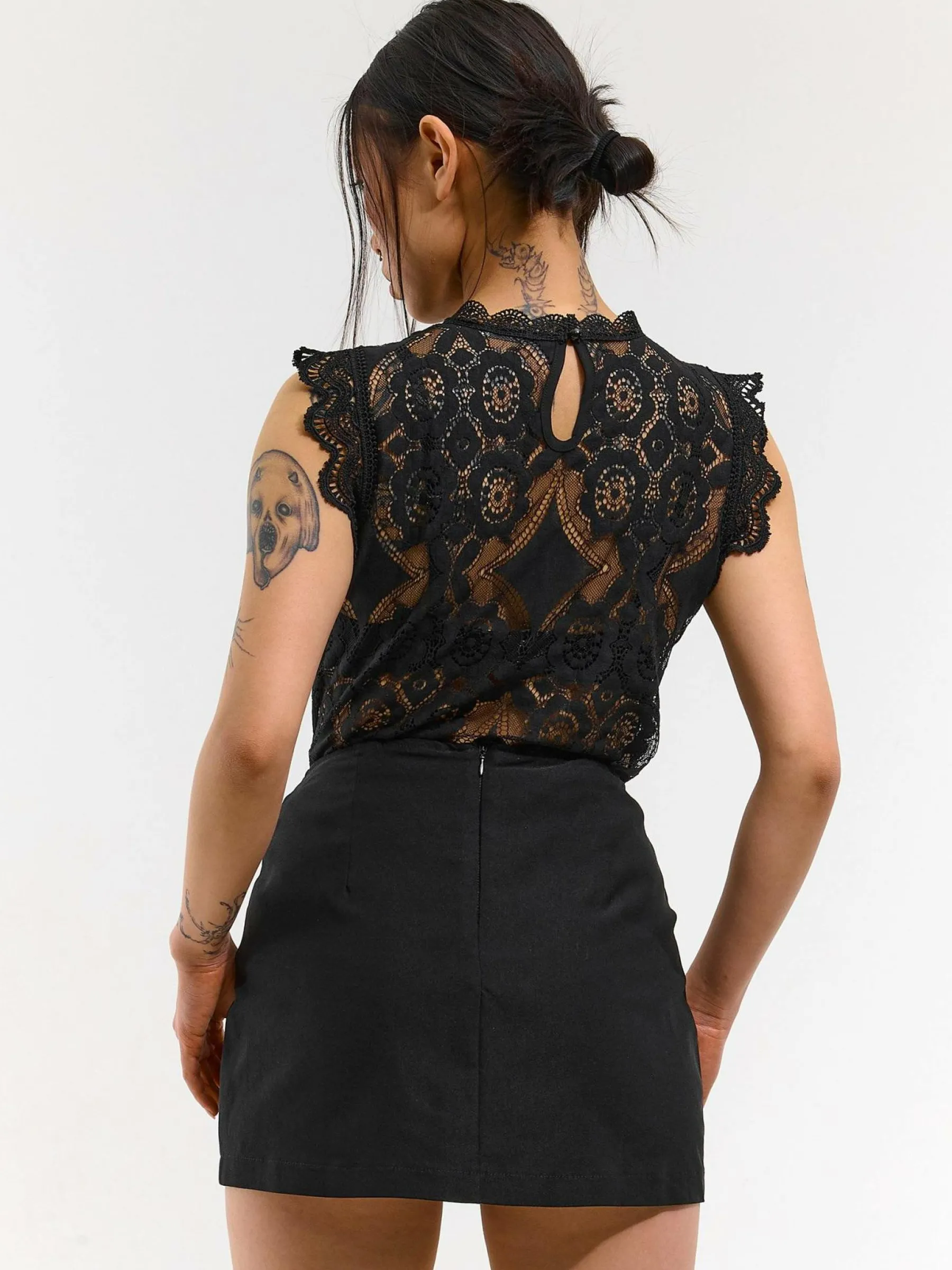 Kolor: czarnyKrój: regular, z falbanąTyp: topRekaw: bez rękawówDługość: krótkiPattern style: pojedynczy kolorDet…