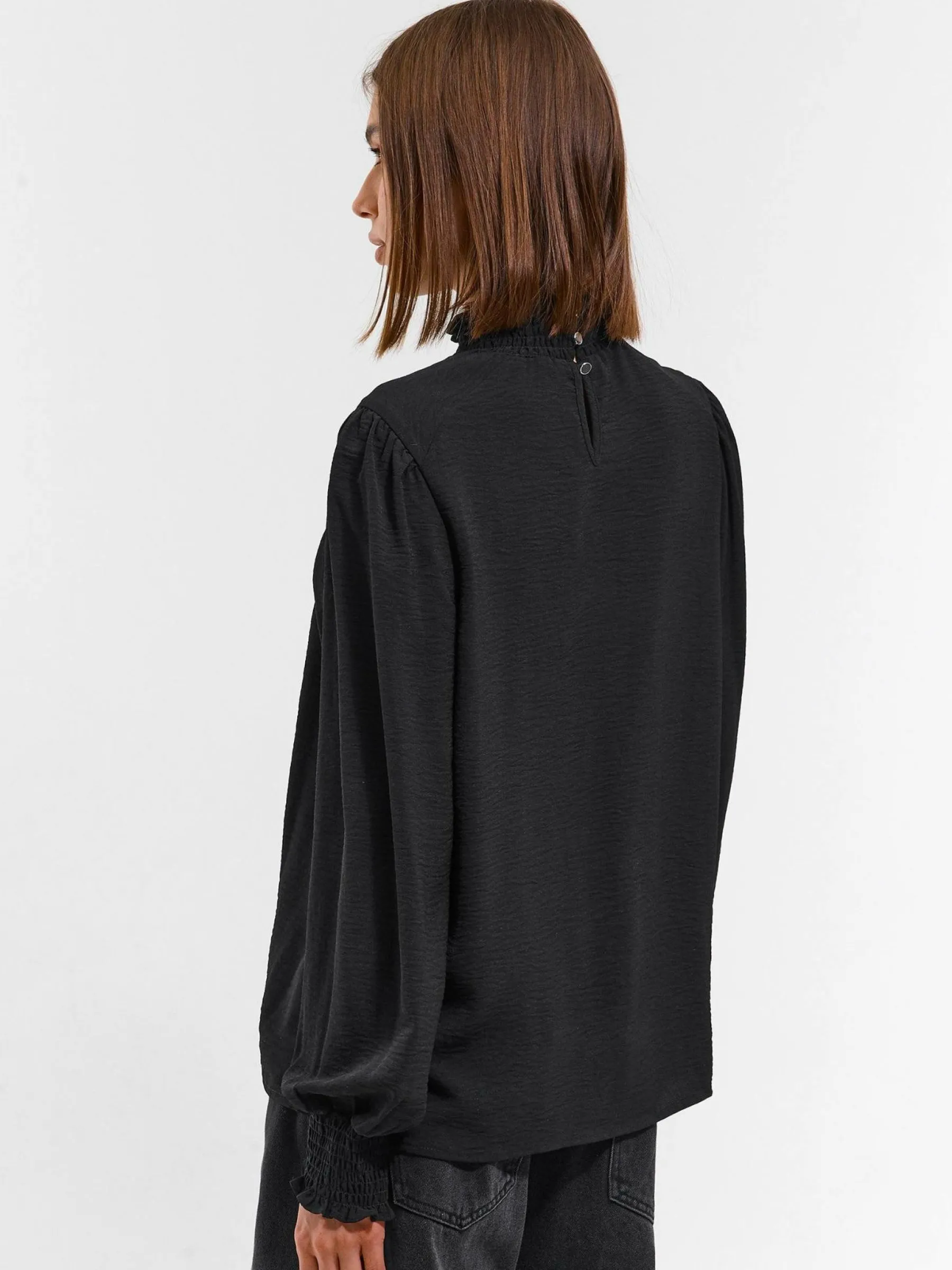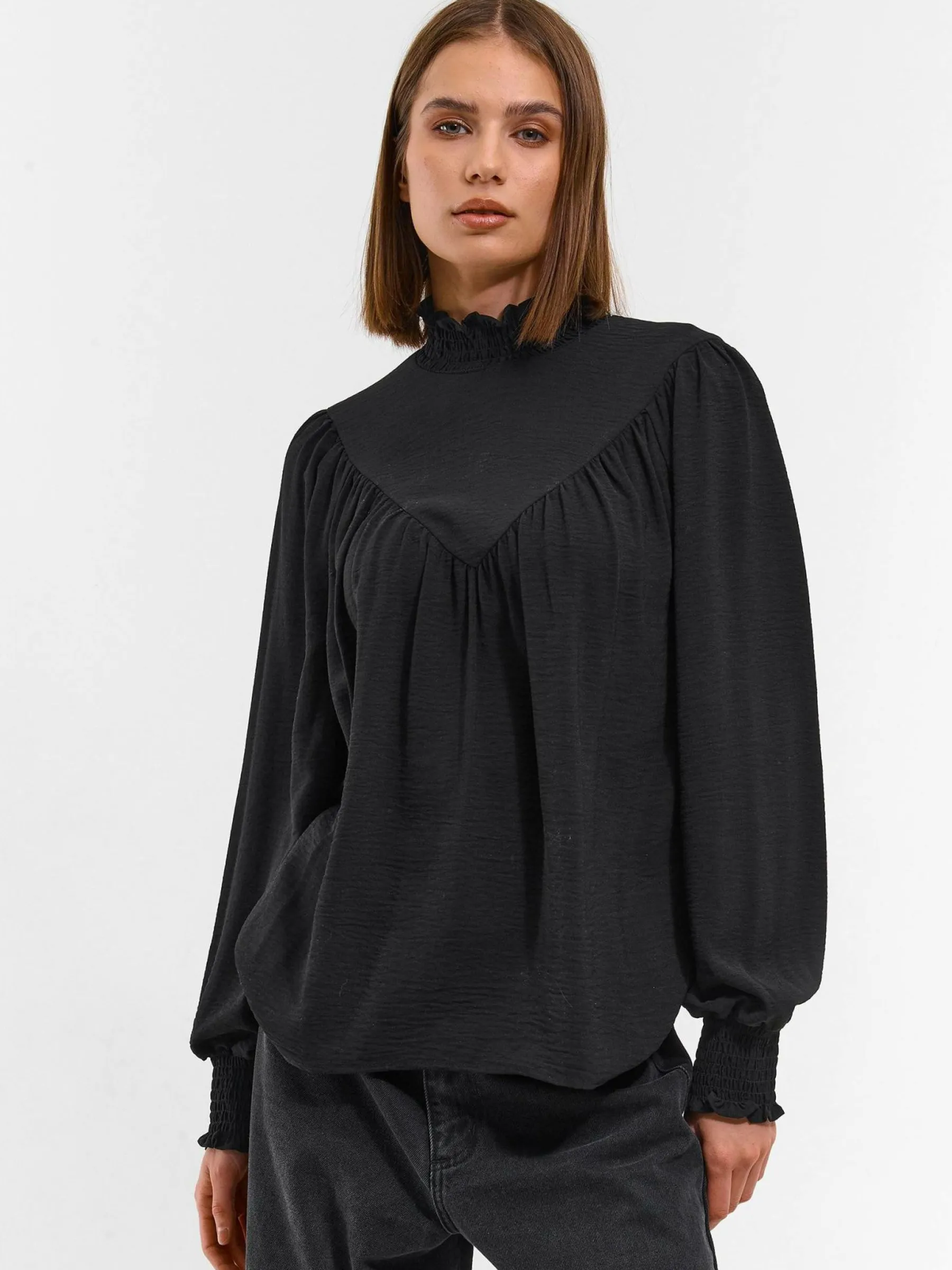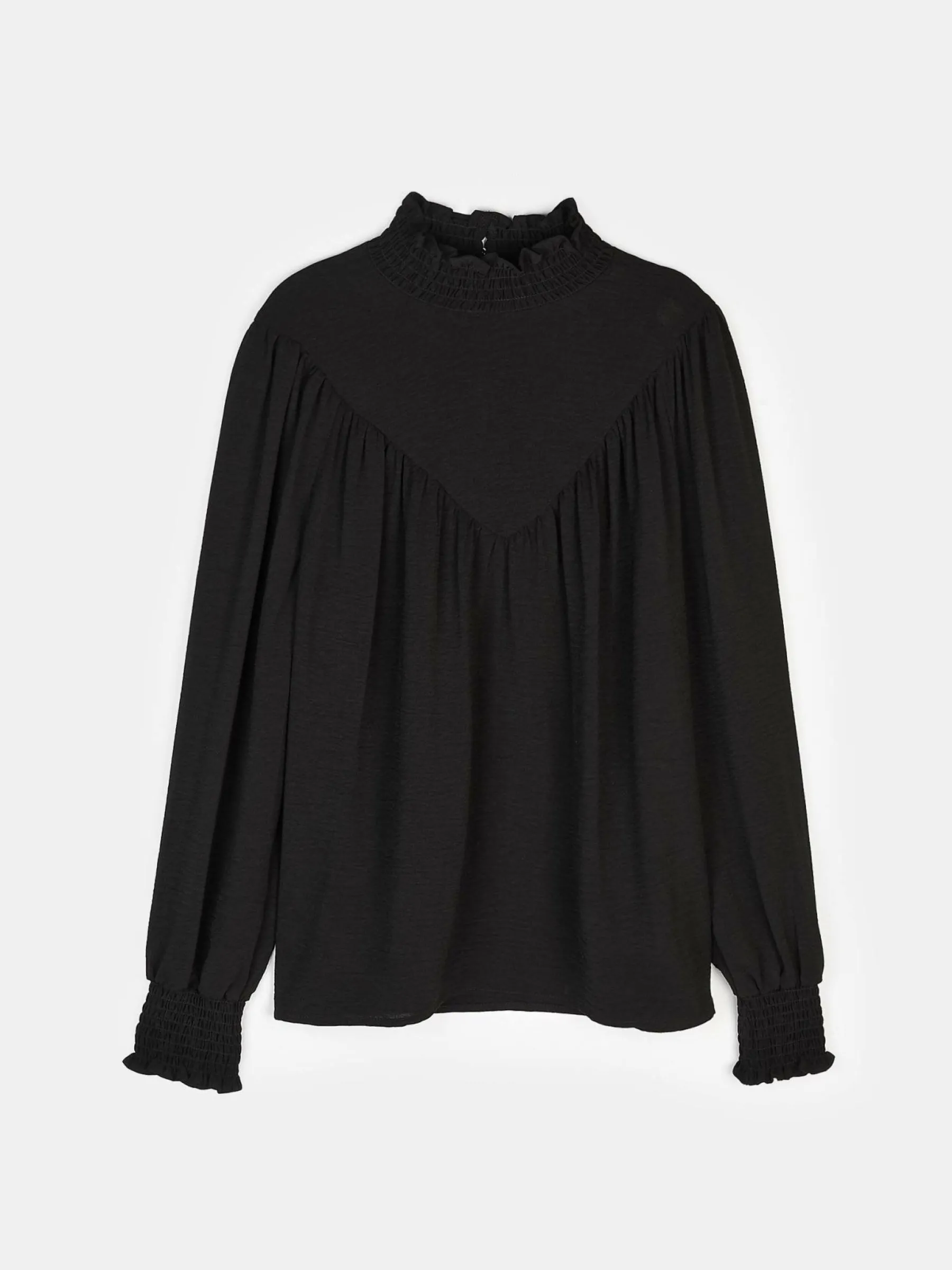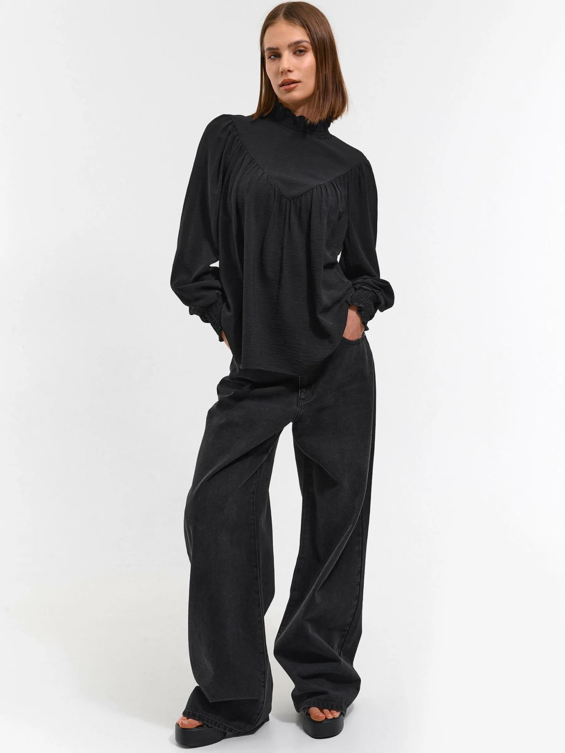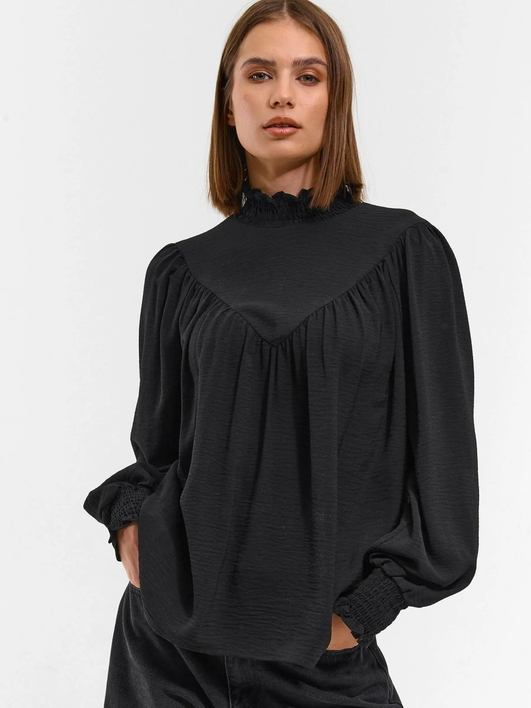 Kolor: czarnyKrój: z marszczeniemTyp: bluzka, topRekaw: długi rękawDługość: krótkiPattern style: pojedynczy kolor…
