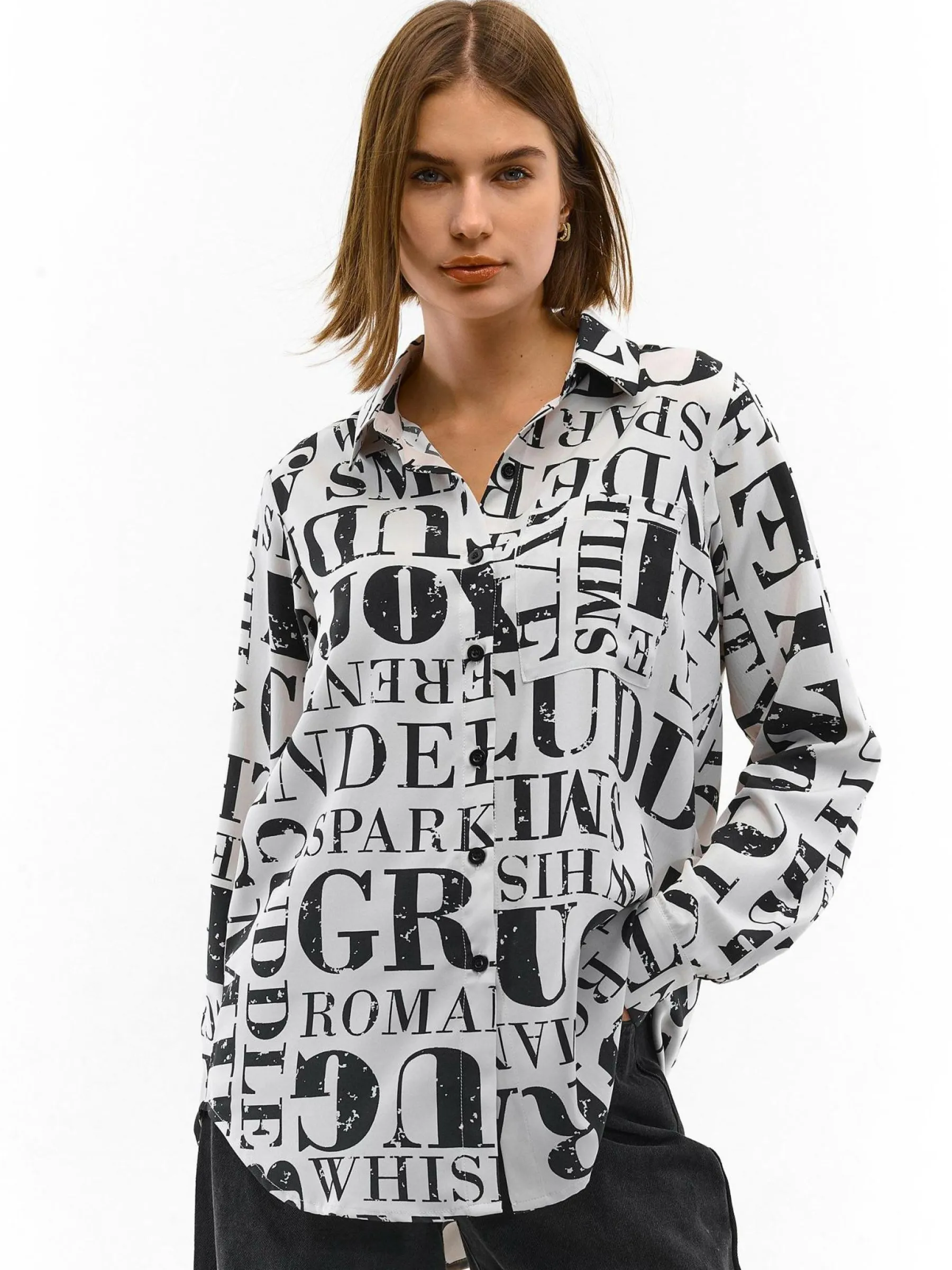 Kolor: beżowyKrój: asymetryczneTyp: bluzkaRekaw: długi rękawDługość: dlugiePattern style: z nadrukiemDetal: na gu…