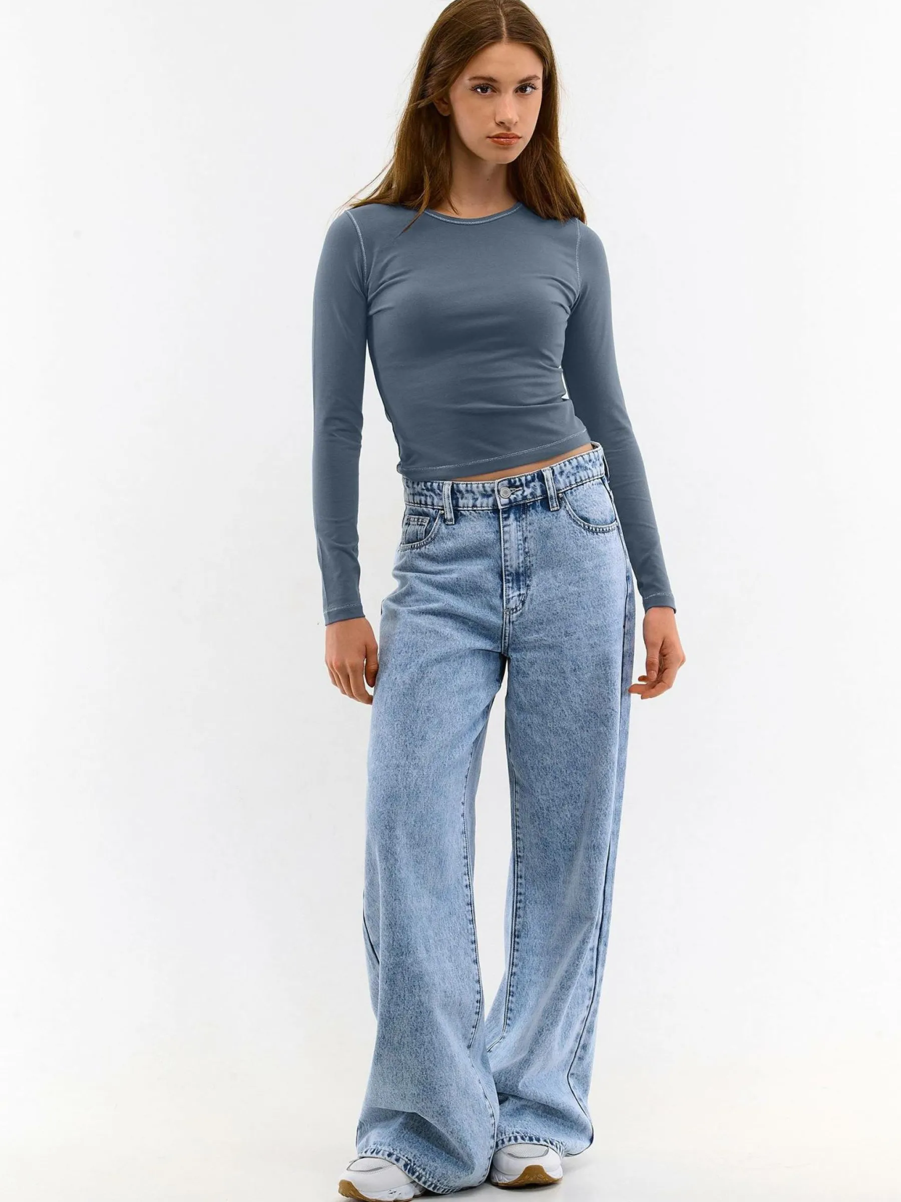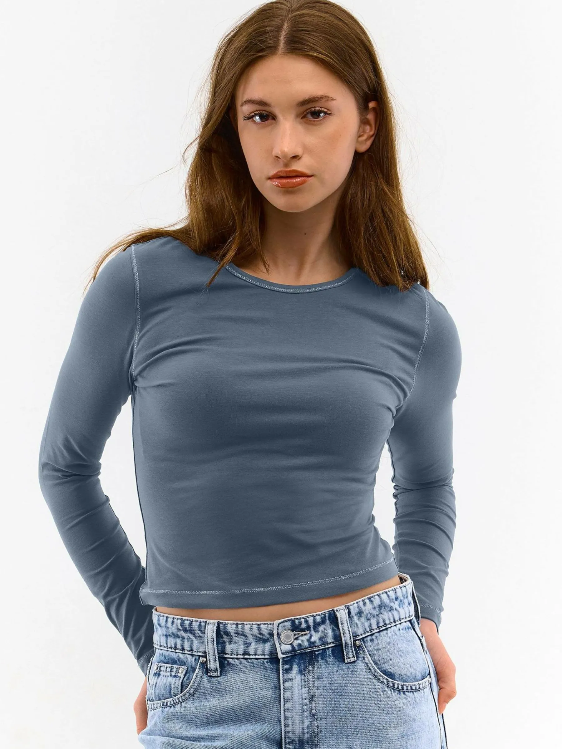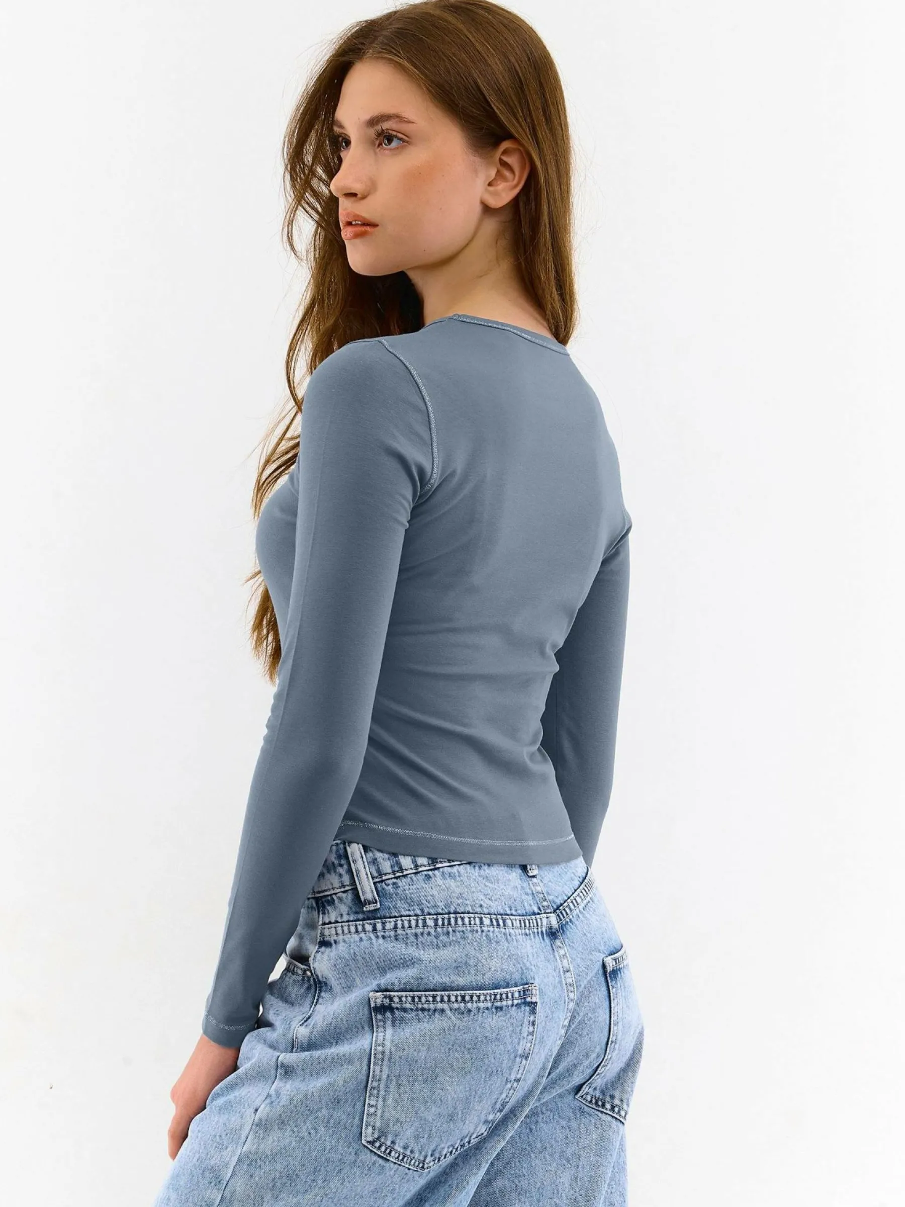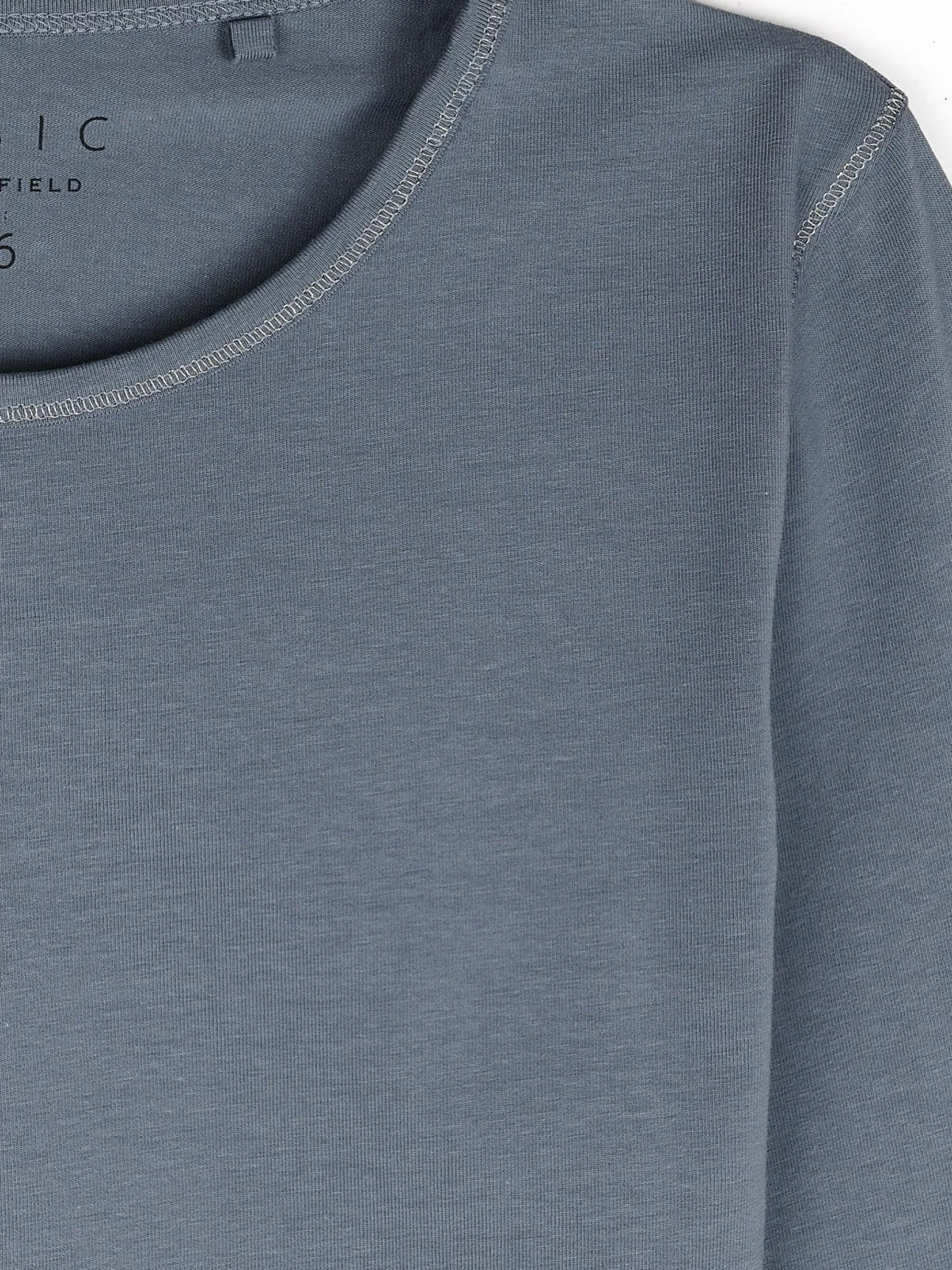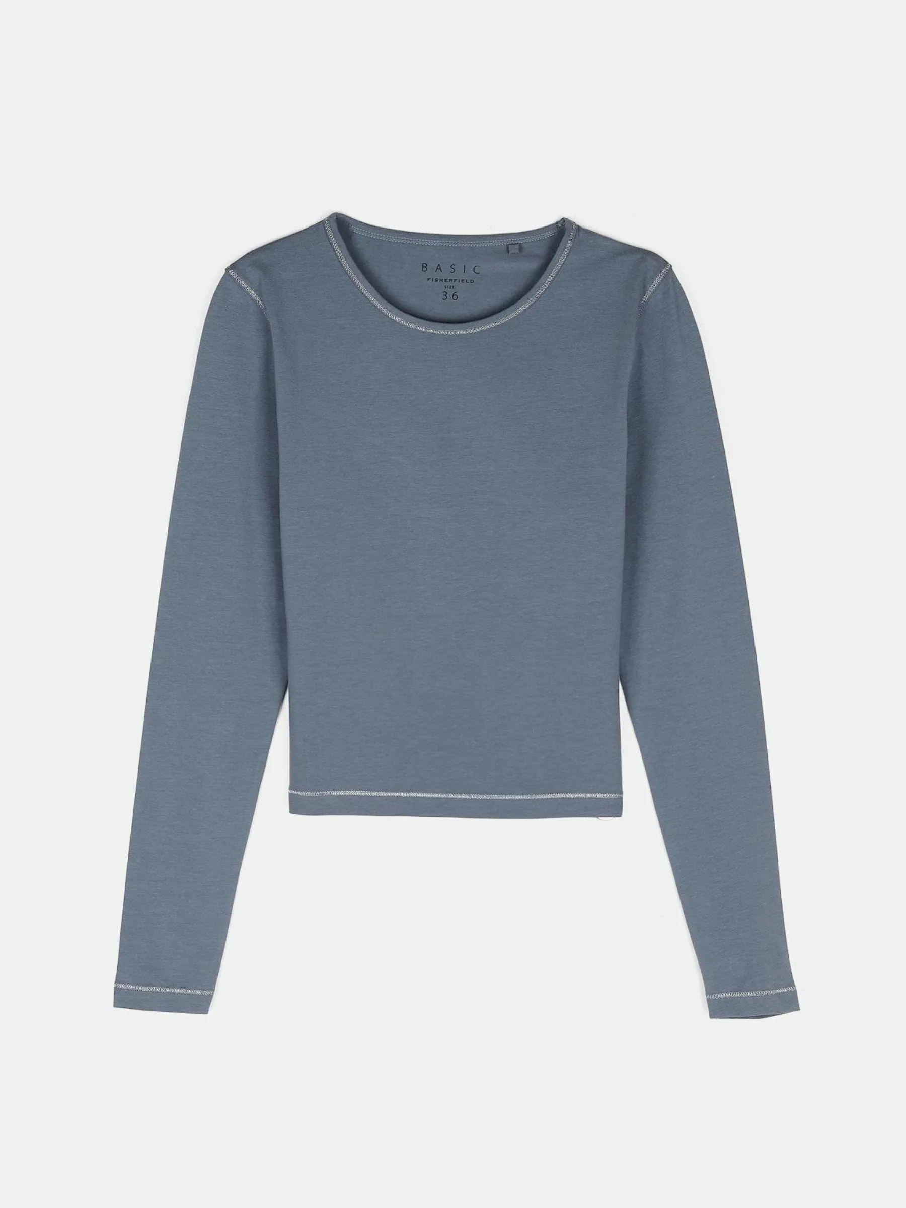 Kolor: niebieskiKrój: podstawowyTyp: koszulkaRekaw: długi rękawDługość: krótkiPattern style: pojedynczy kolorDeta…