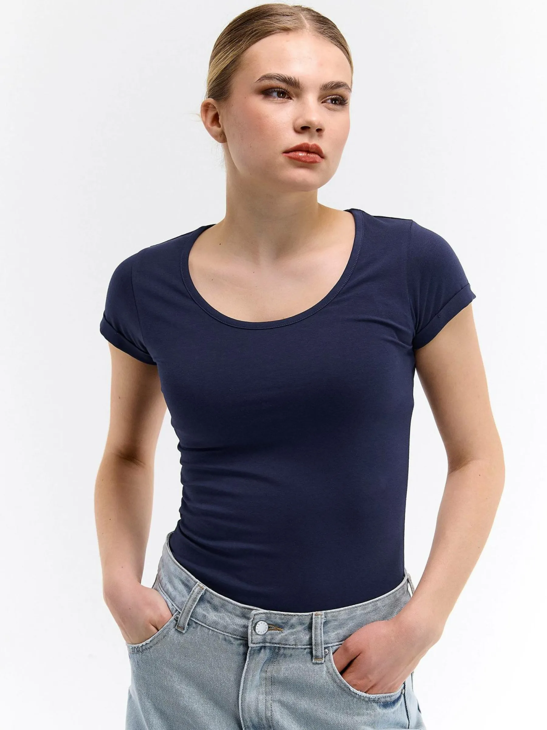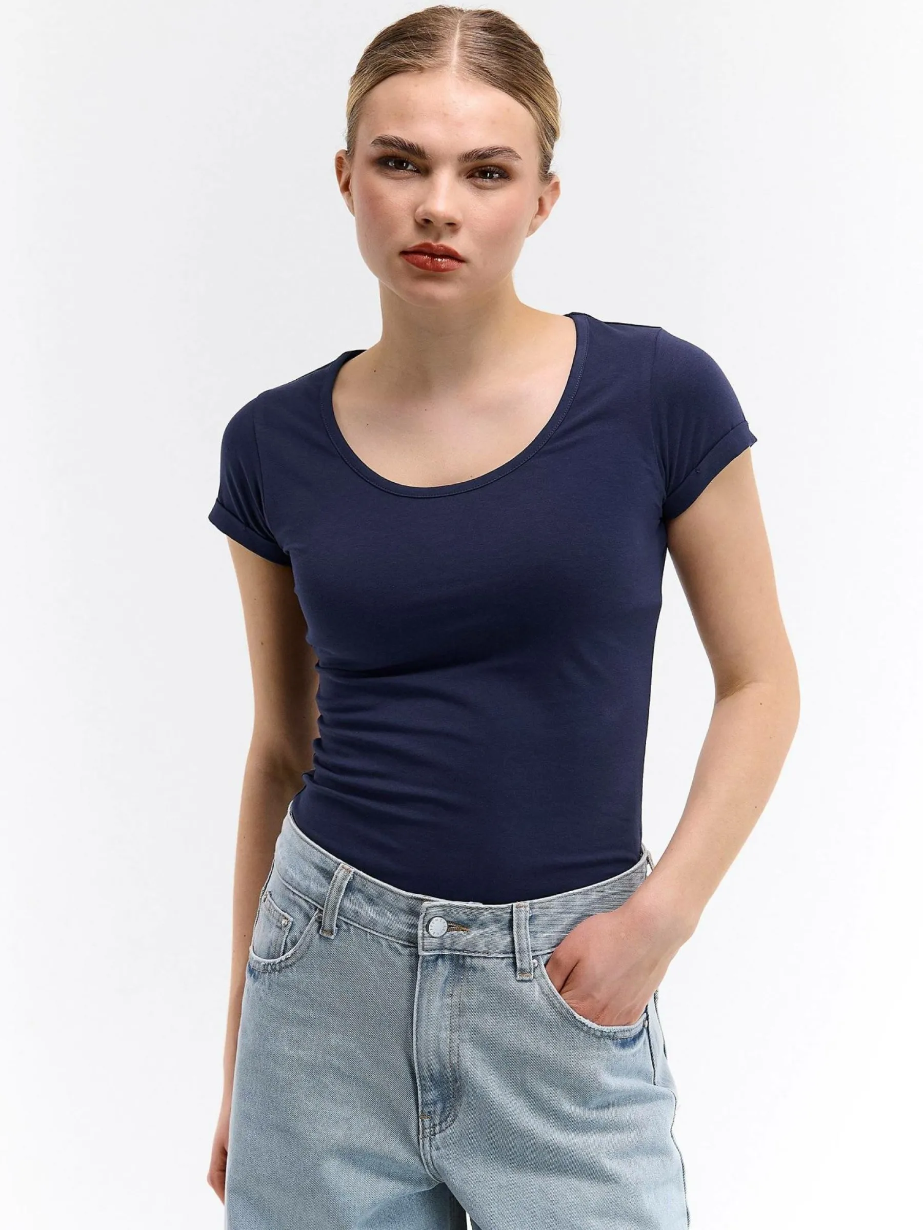 Kolor: granatowyKrój: regularTyp: koszulkaRekaw: krótki rękawDługość: krótkiPattern style: pojedynczy kolorDetal:…