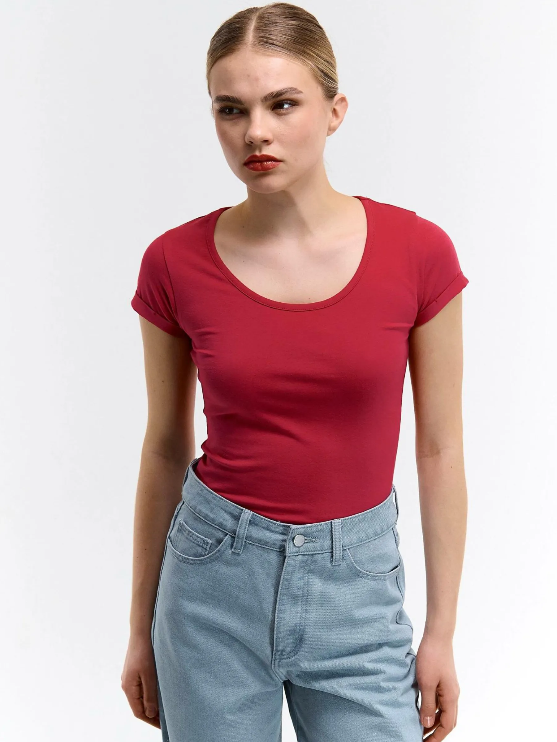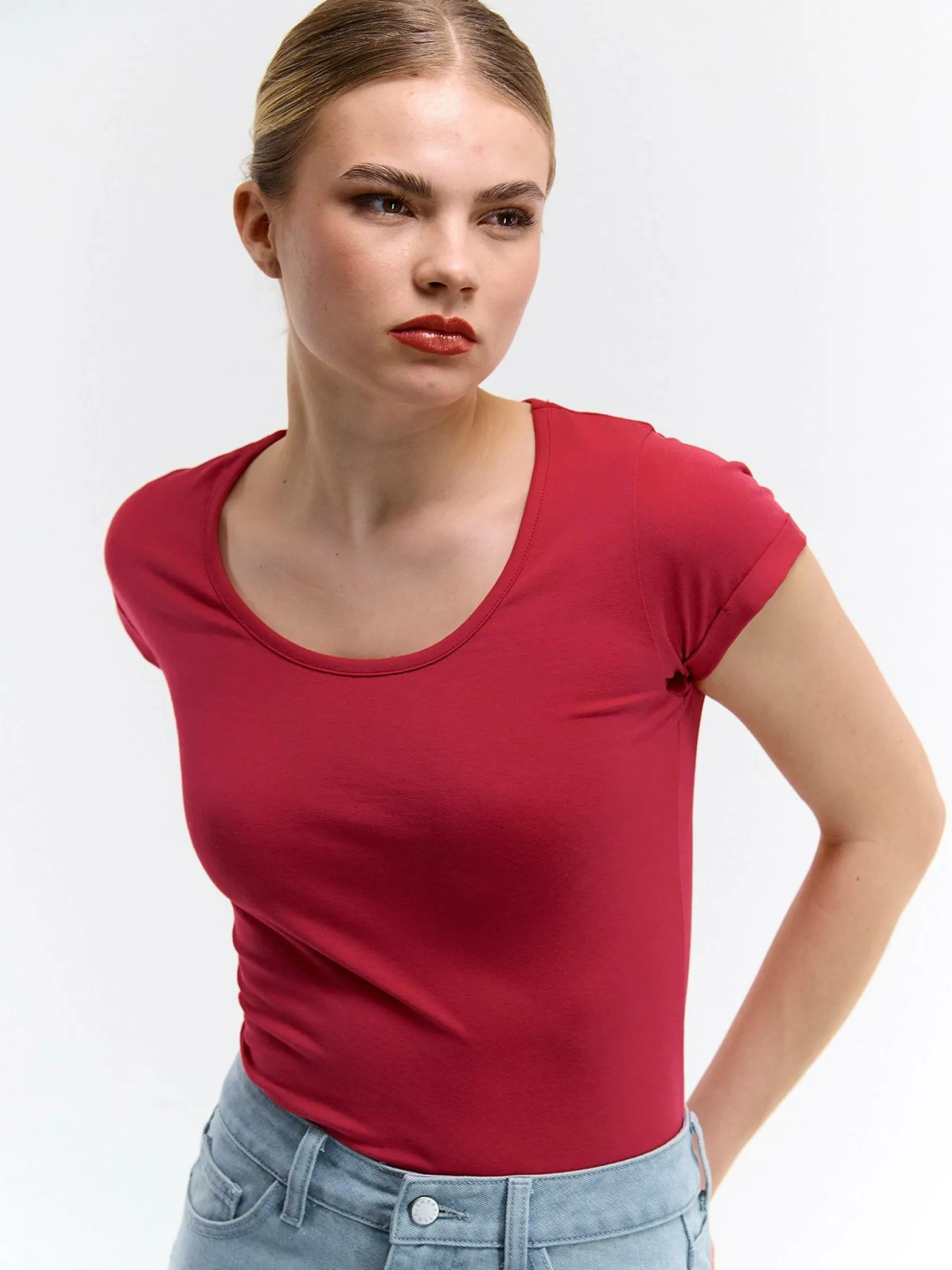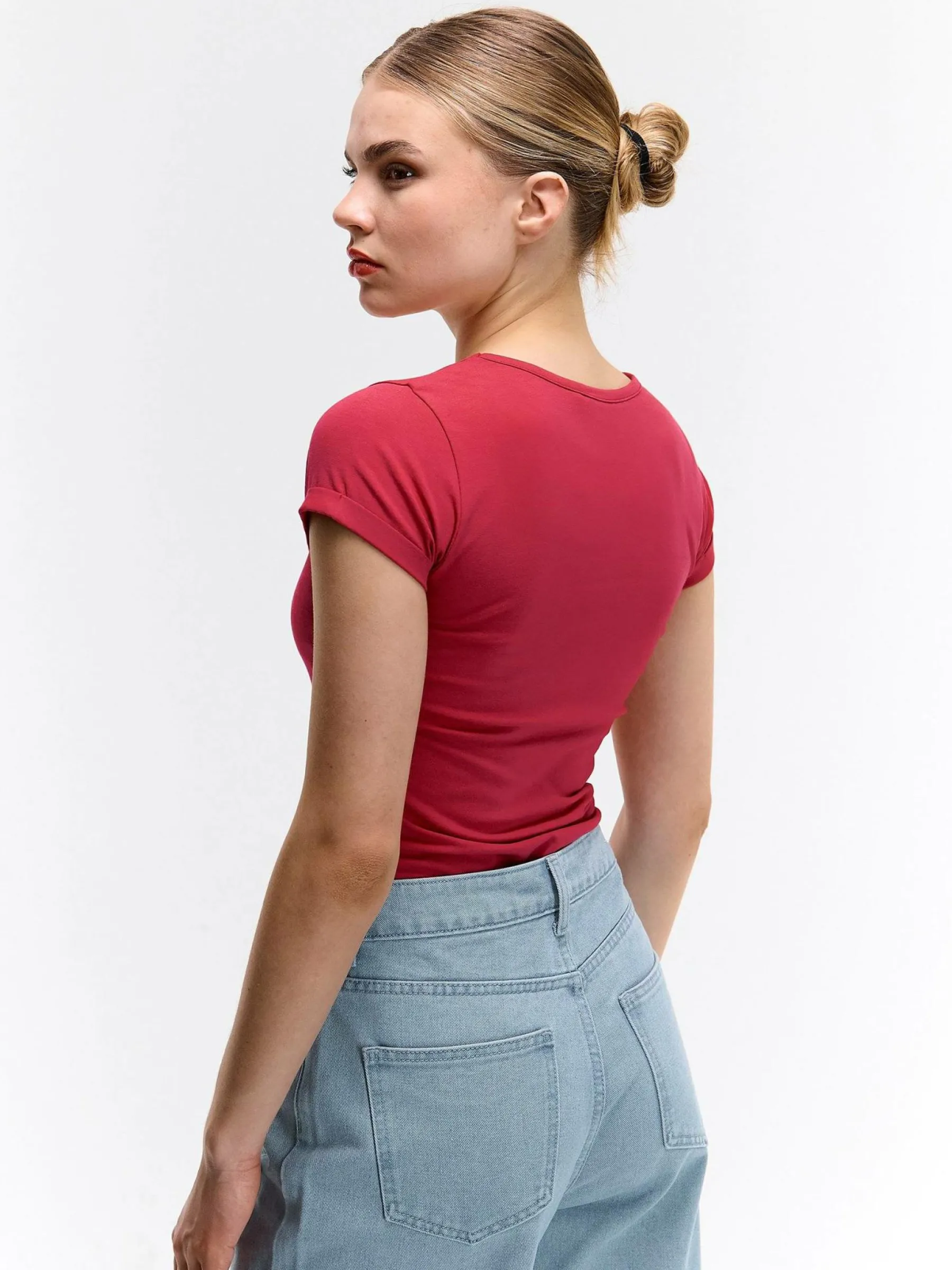 Kolor: czerwonyKrój: regularTyp: koszulkaRekaw: krótki rękawDługość: krótkiPattern style: pojedynczy kolorDetal: …