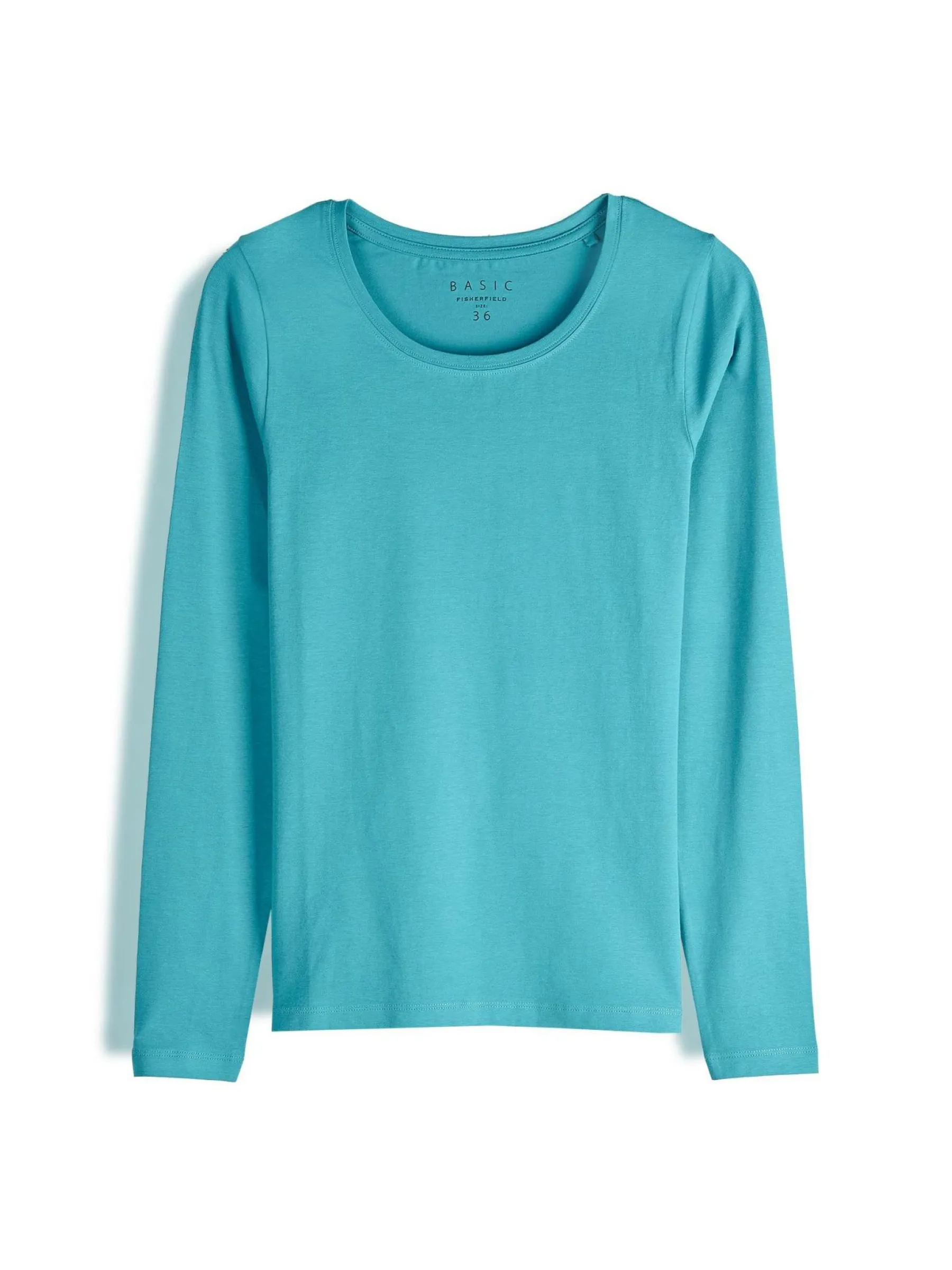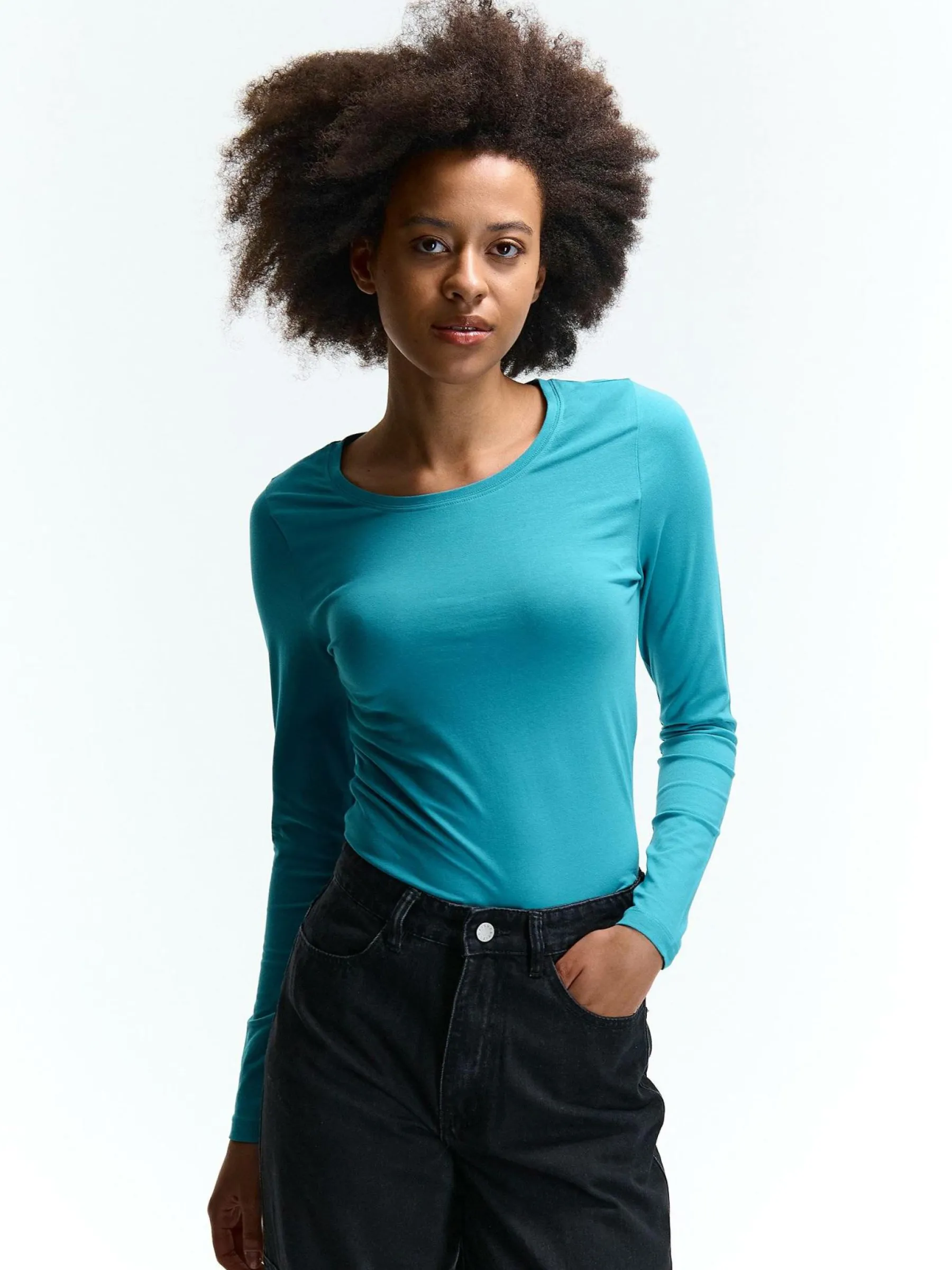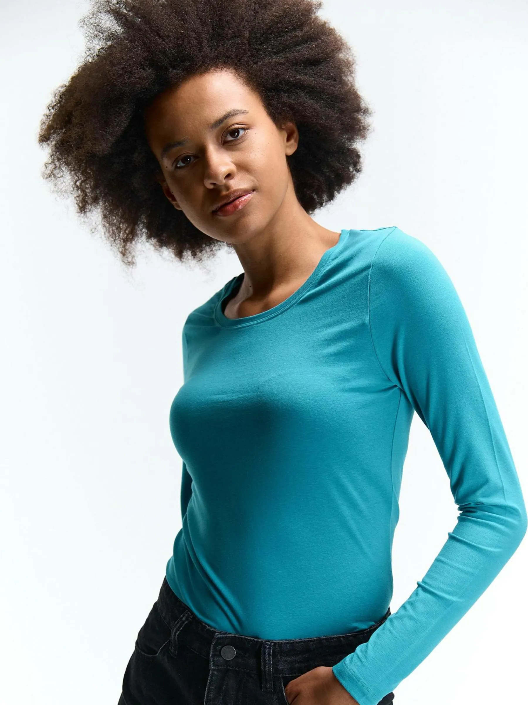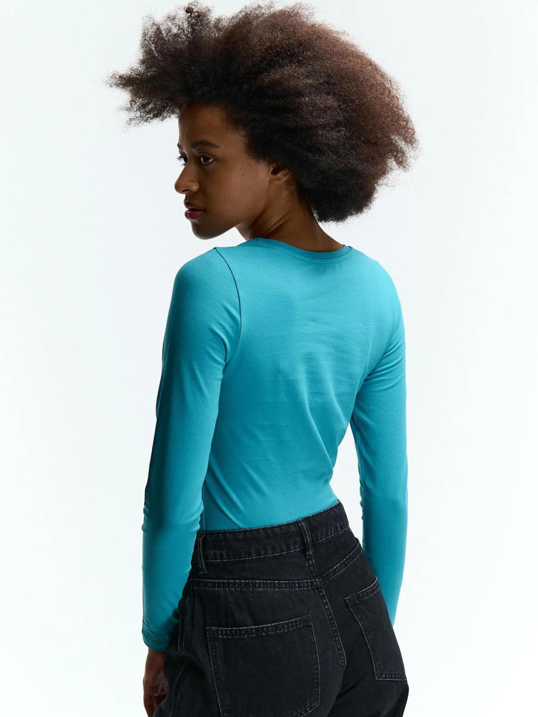 Kolor: niebieskiKrój: podstawowyTyp: koszulkaRekaw: długi rękawDługość: krótkiPattern style: pojedynczy kolorDeta…