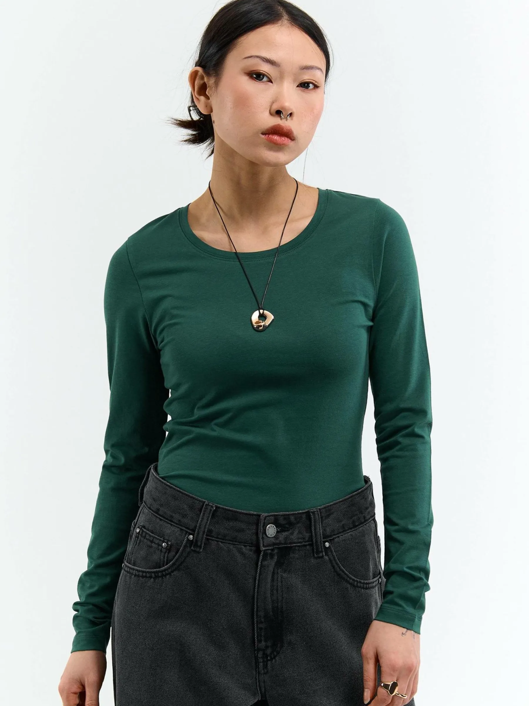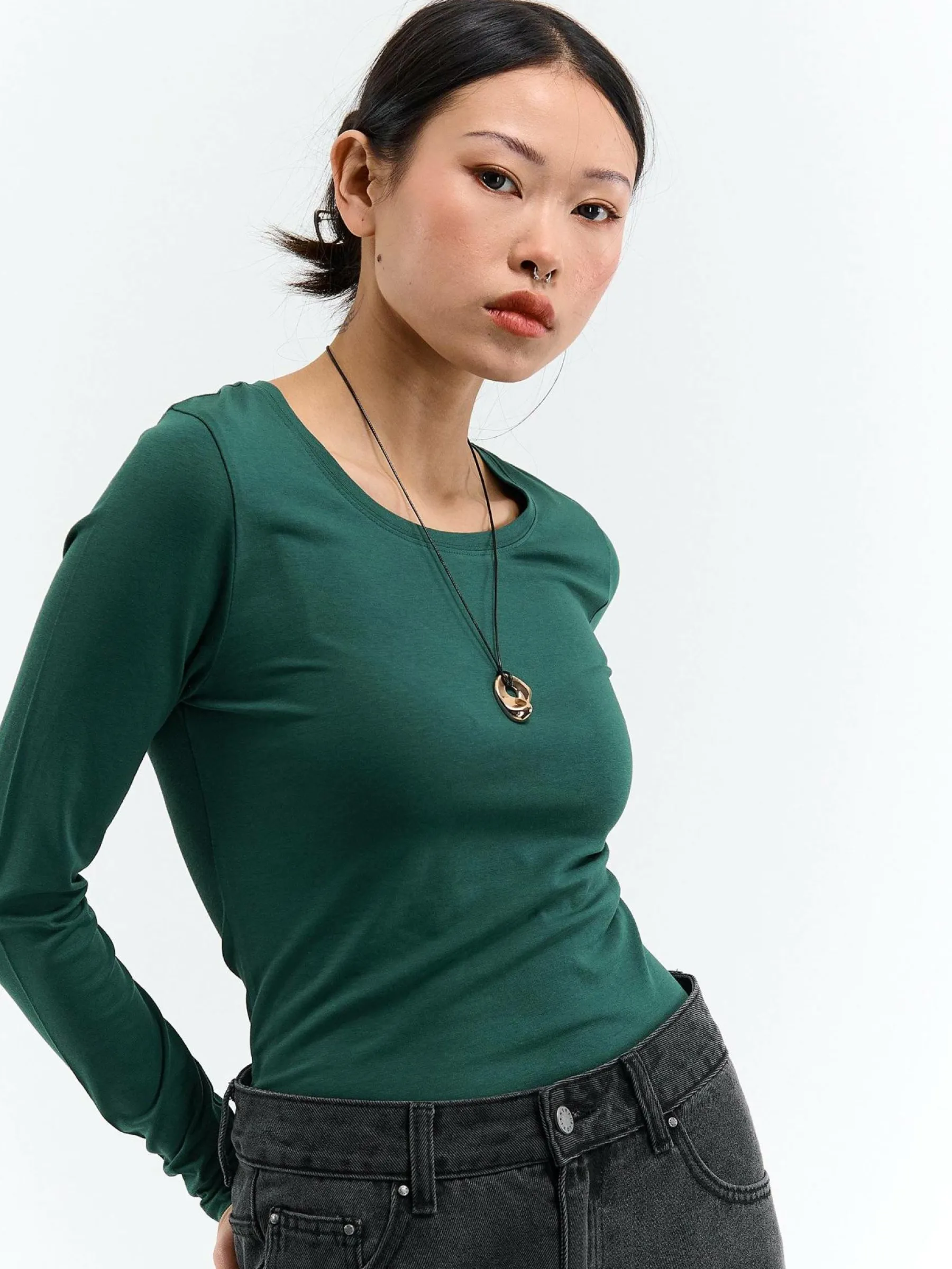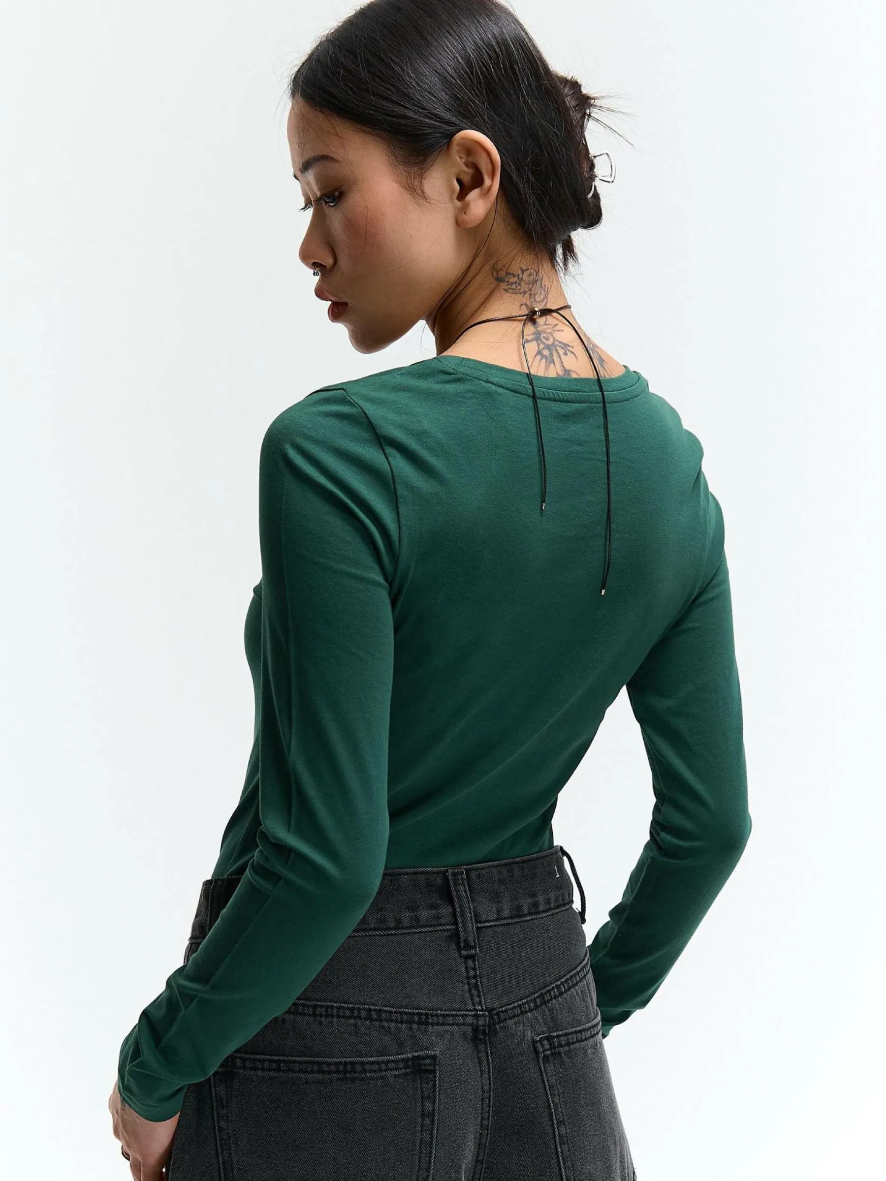 Kolor: zielonyKrój: regularTyp: koszulkaRekaw: długi rękawDługość: krótkiPattern style: pojedynczy kolorDetal: na…