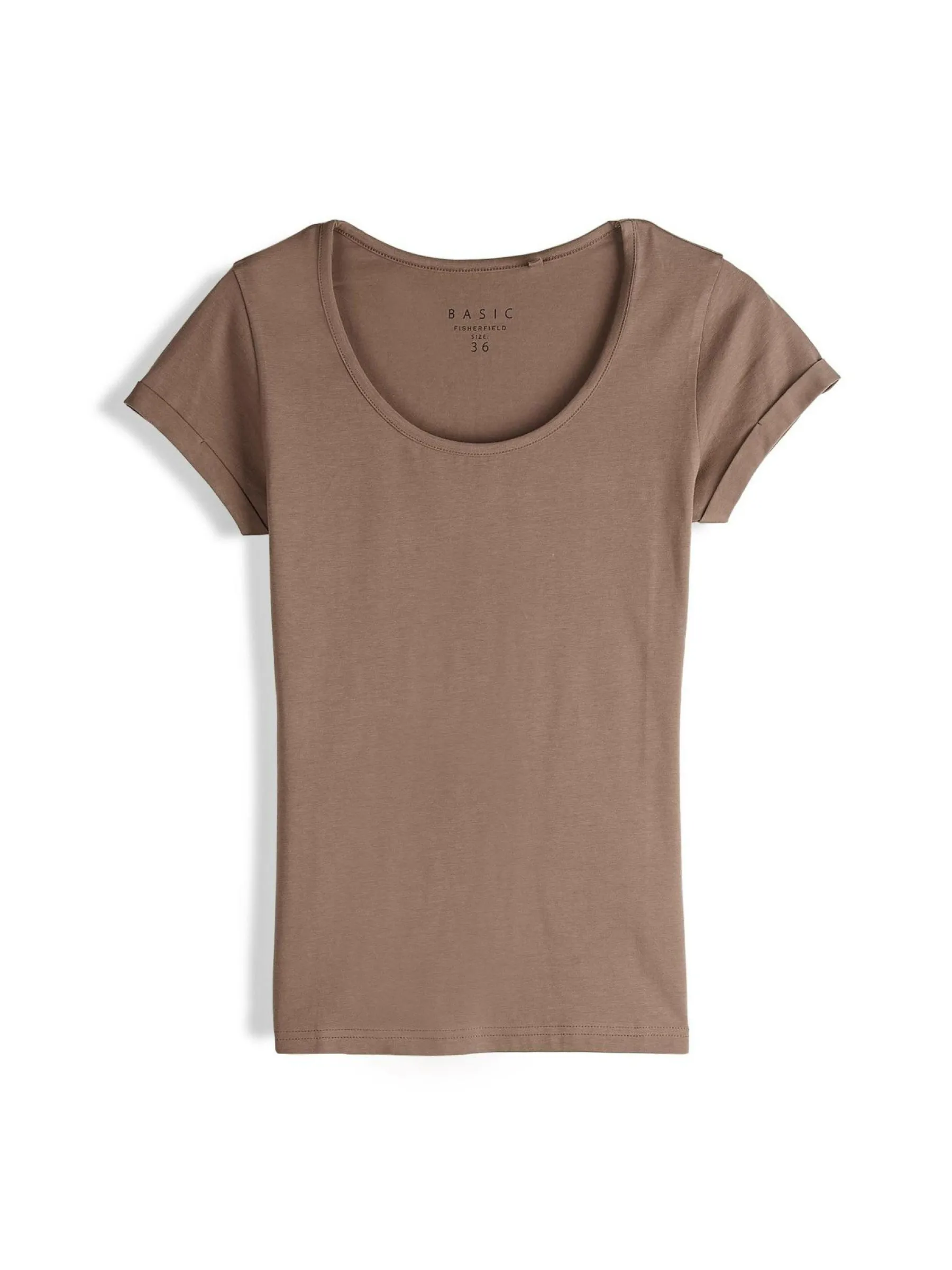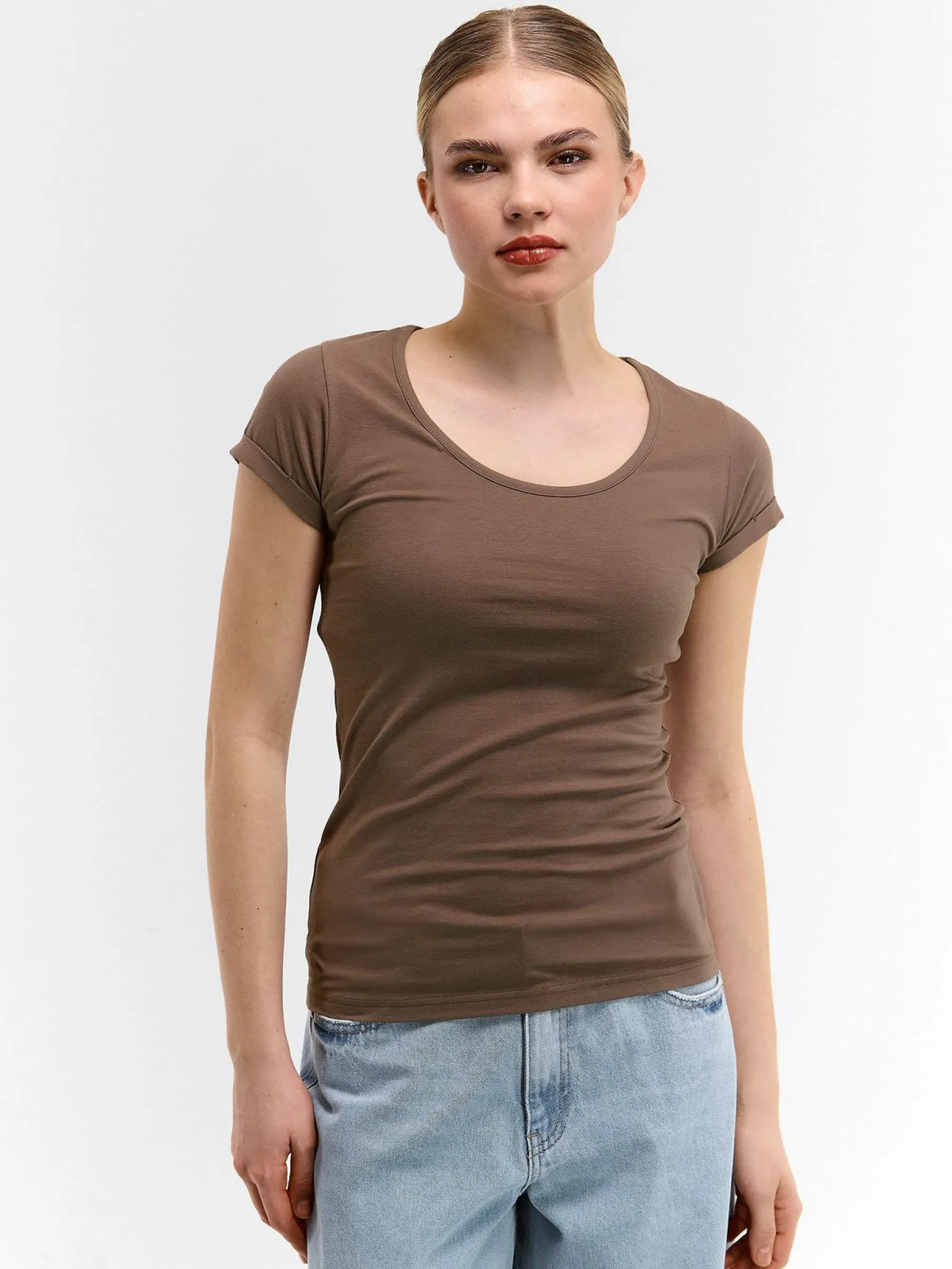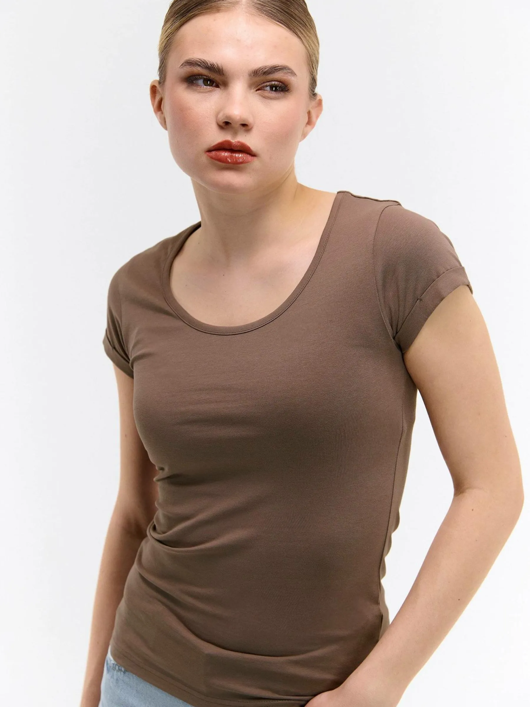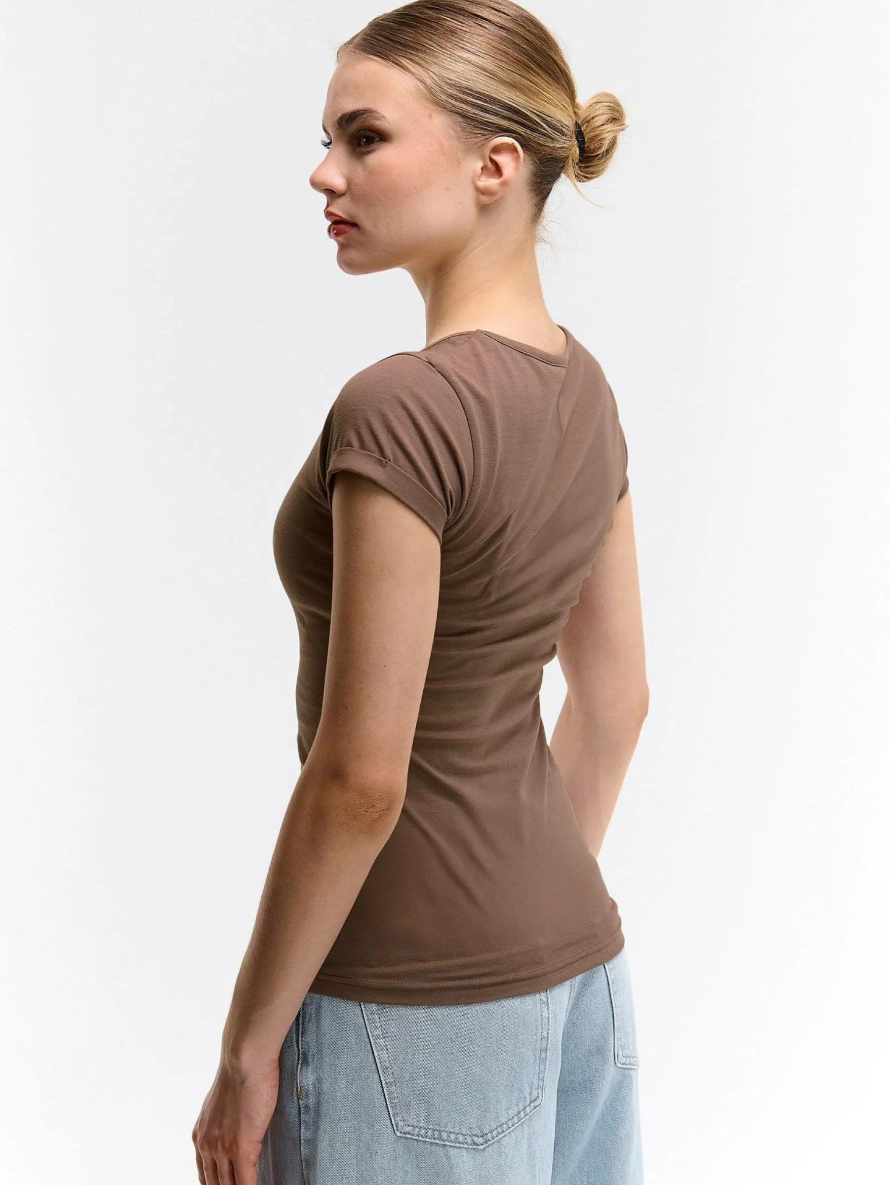 Kolor: brązowyKrój: regularTyp: koszulkaRekaw: krótki rękawDługość: krótkiPattern style: pojedynczy kolorDetal: …