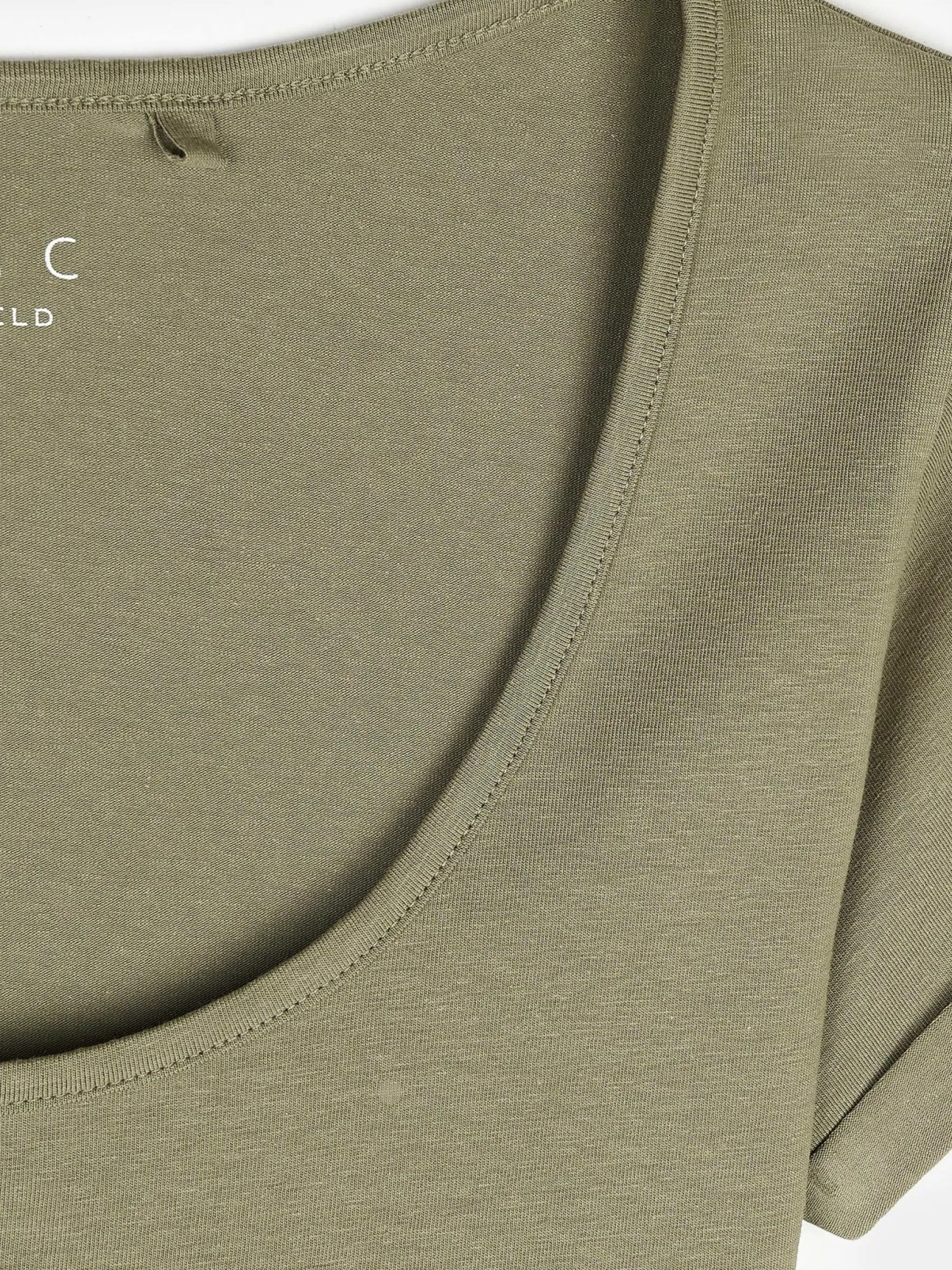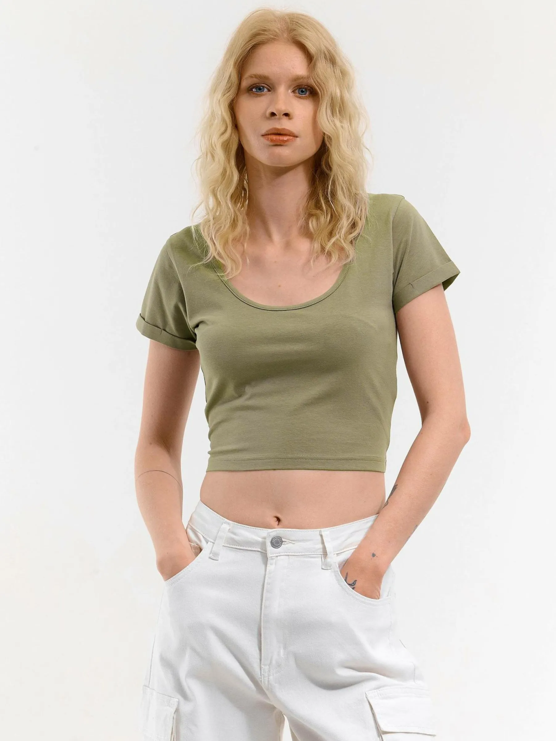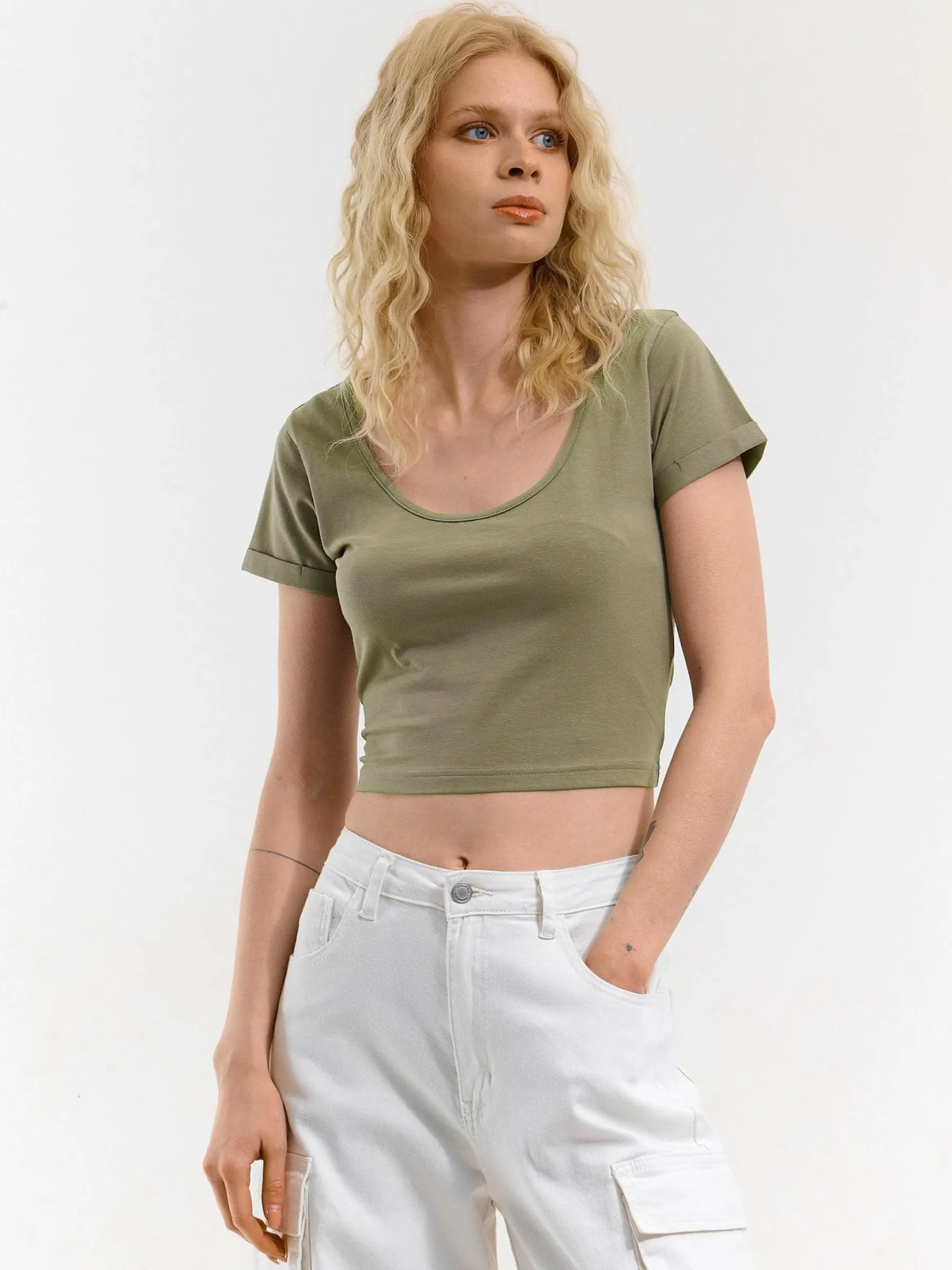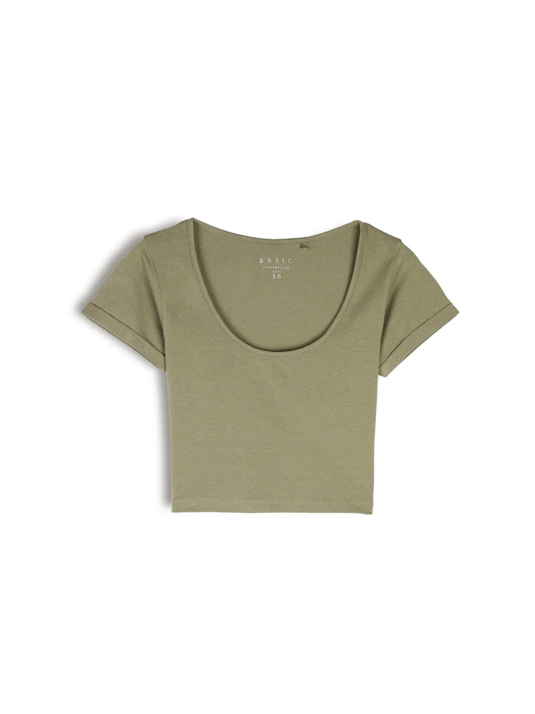 Kolor: khaki, zielonyKrój: regularTyp: koszulkaRekaw: bez rękawówDługość: krótki topPattern style: pojedynczy kol…