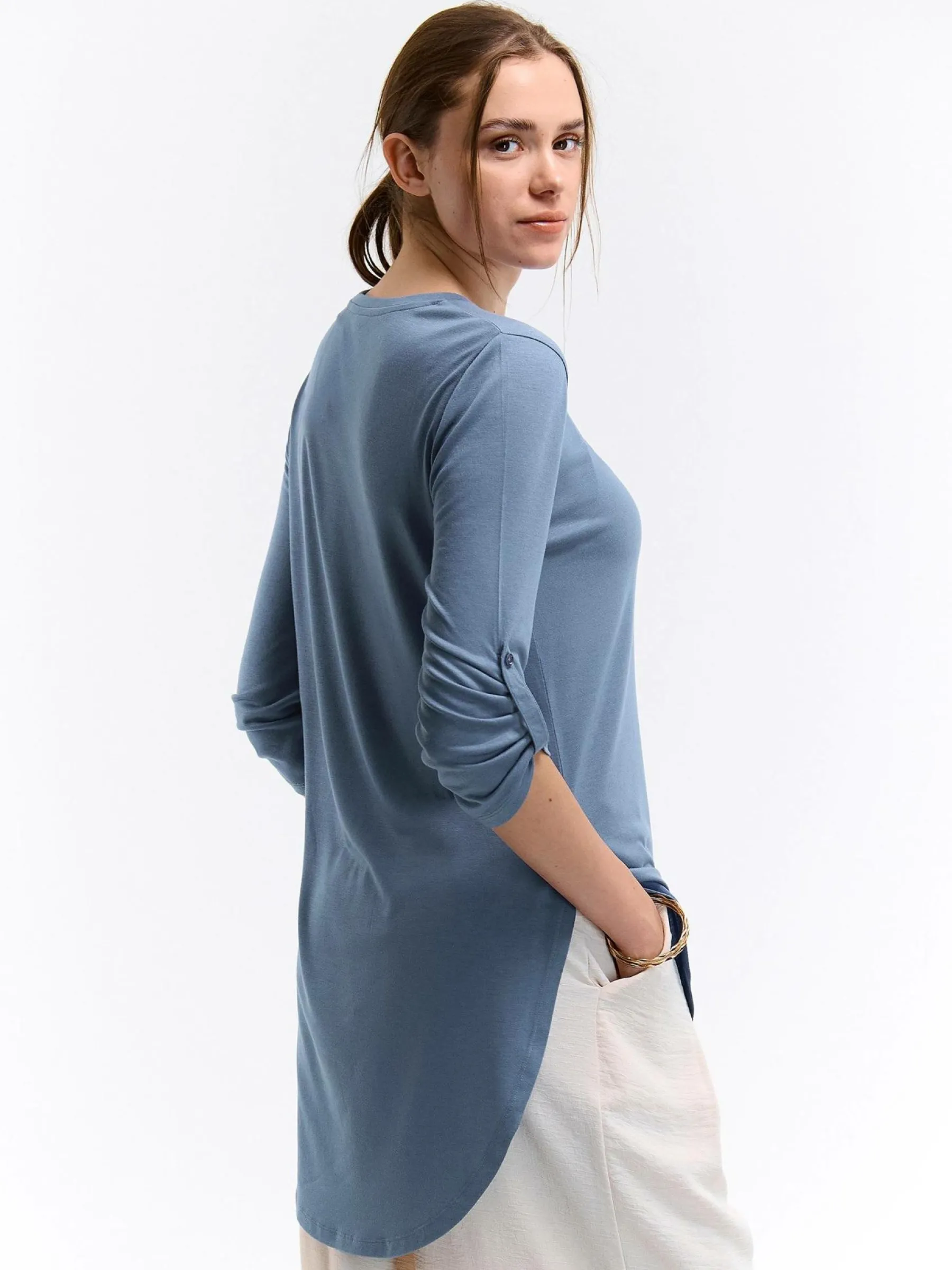 Kolor: niebieskiKrój: asymetryczneTyp: koszulkaRekaw: rękaw 3/4Długość: dlugiePattern style: pojedynczy kolorDetal:…
