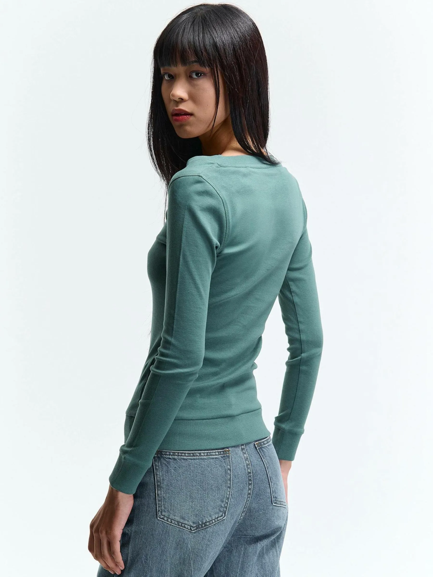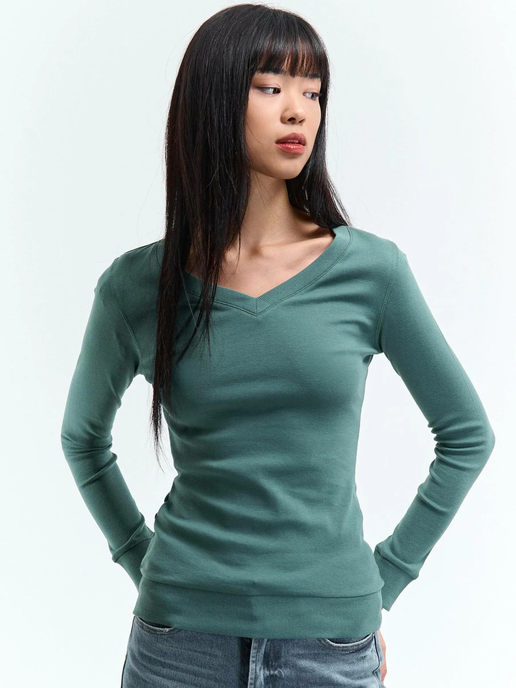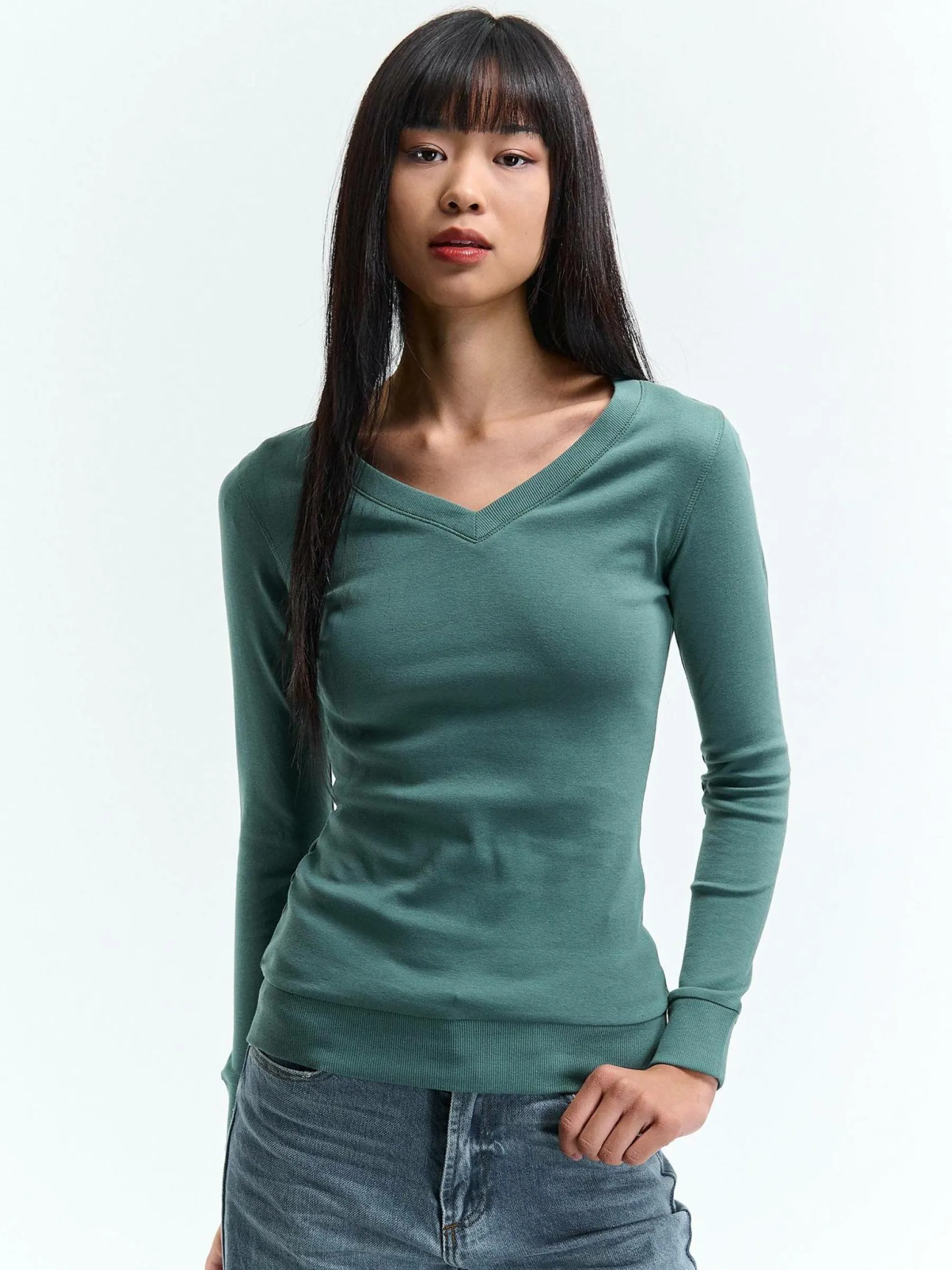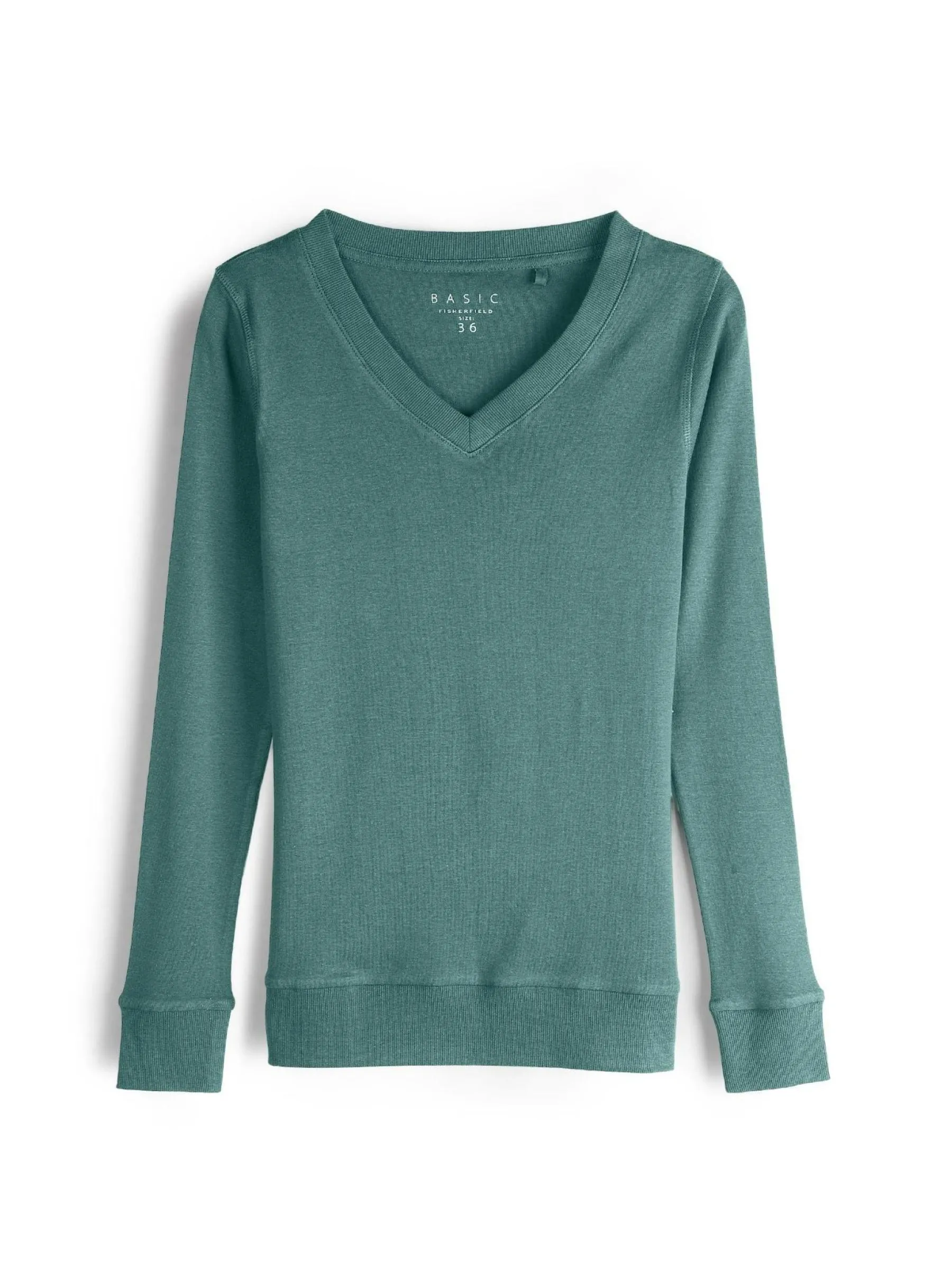 Kolor: zielonyKrój: regularTyp: koszulkaRekaw: długi rękawDługość: krótkiPattern style: pojedynczy kolorDetal: v-…