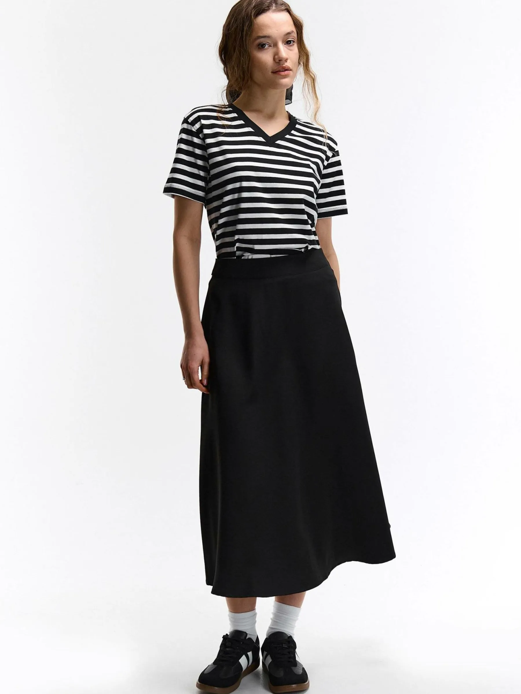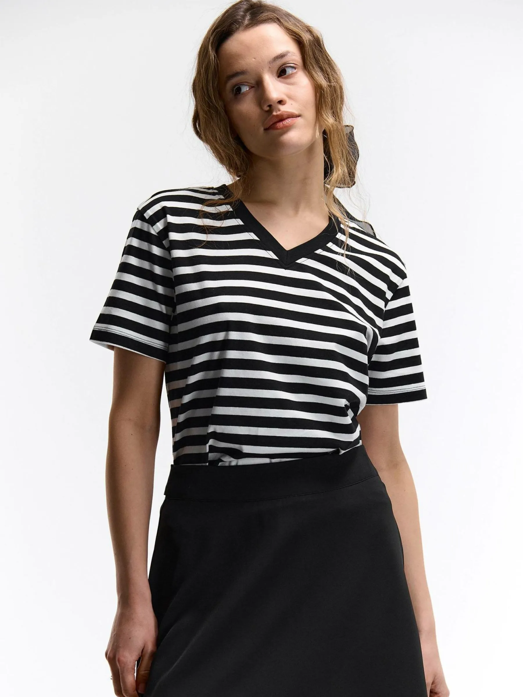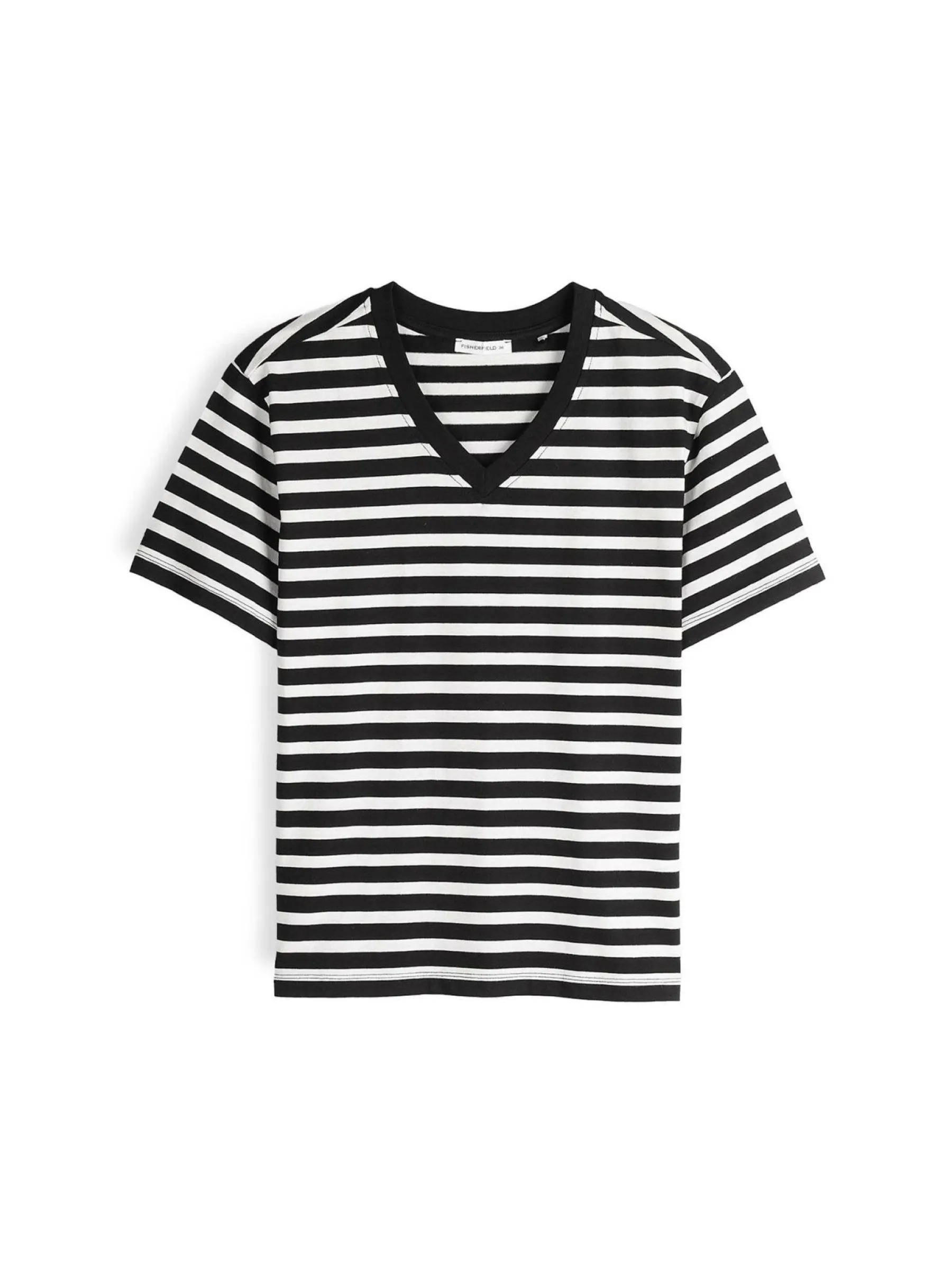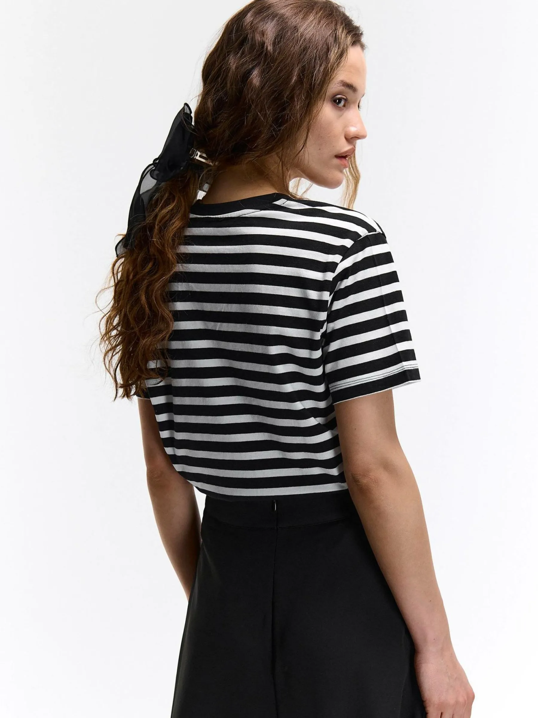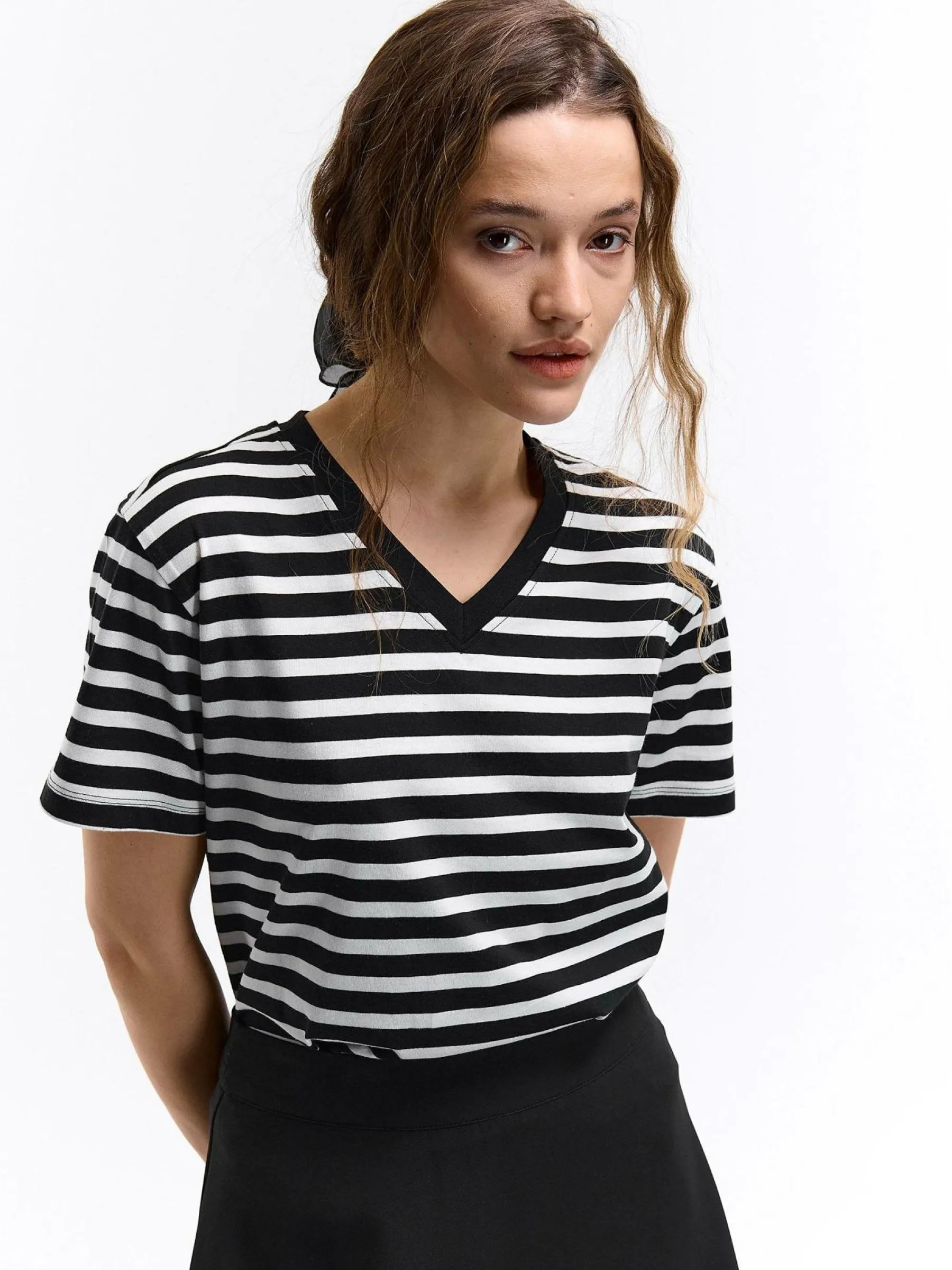 Kolor: czarnyKrój: regularTyp: koszulkaRekaw: krótki rękawDługość: krótkiPattern style: w prążkiDetal: nad gło…
