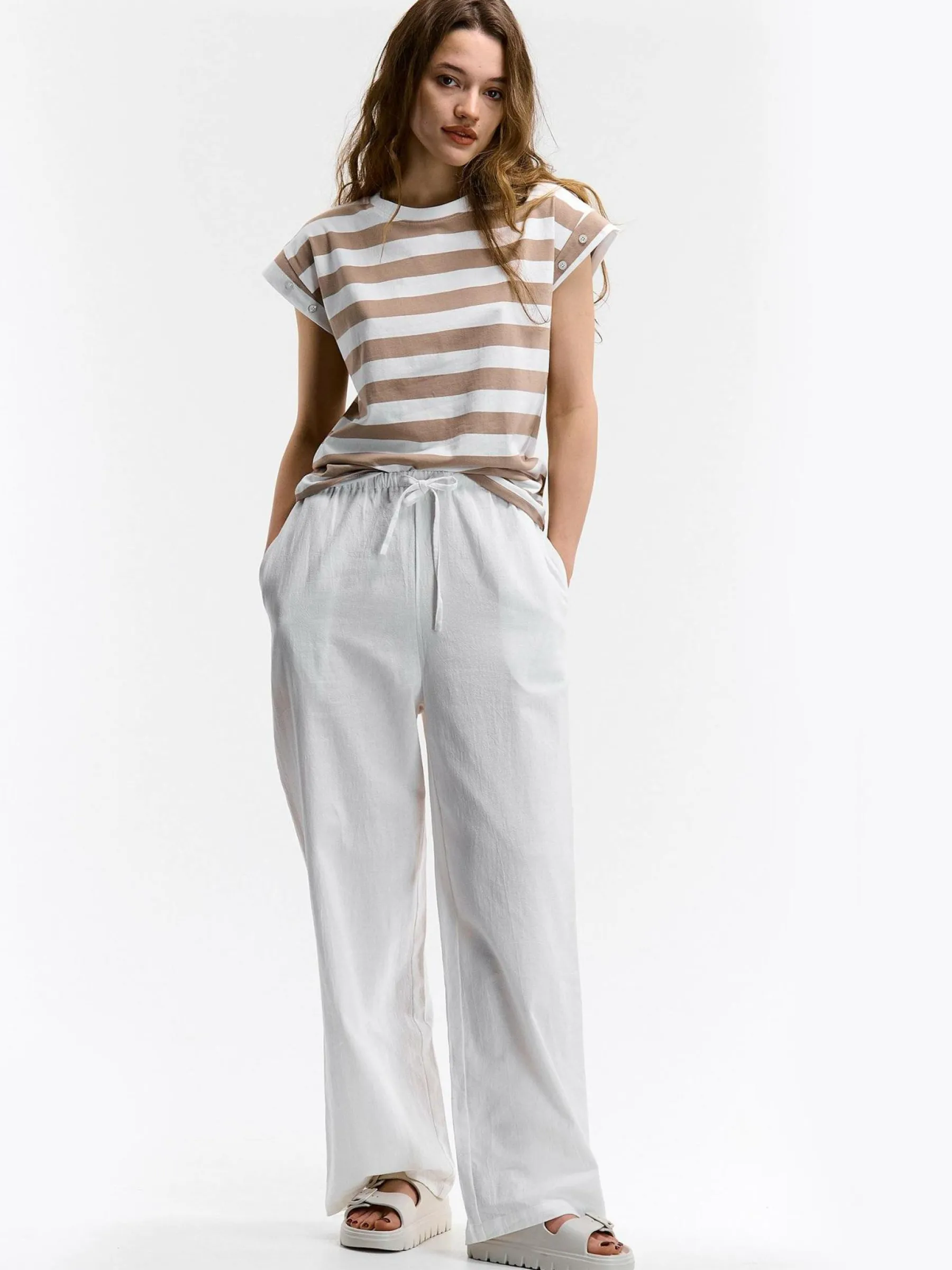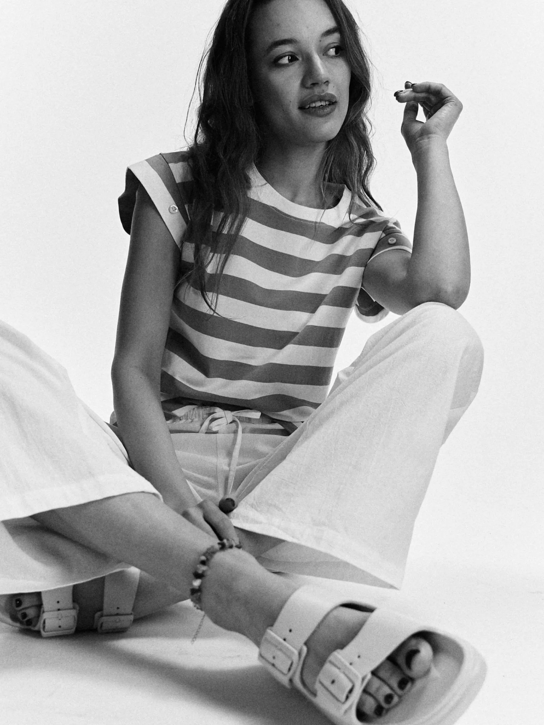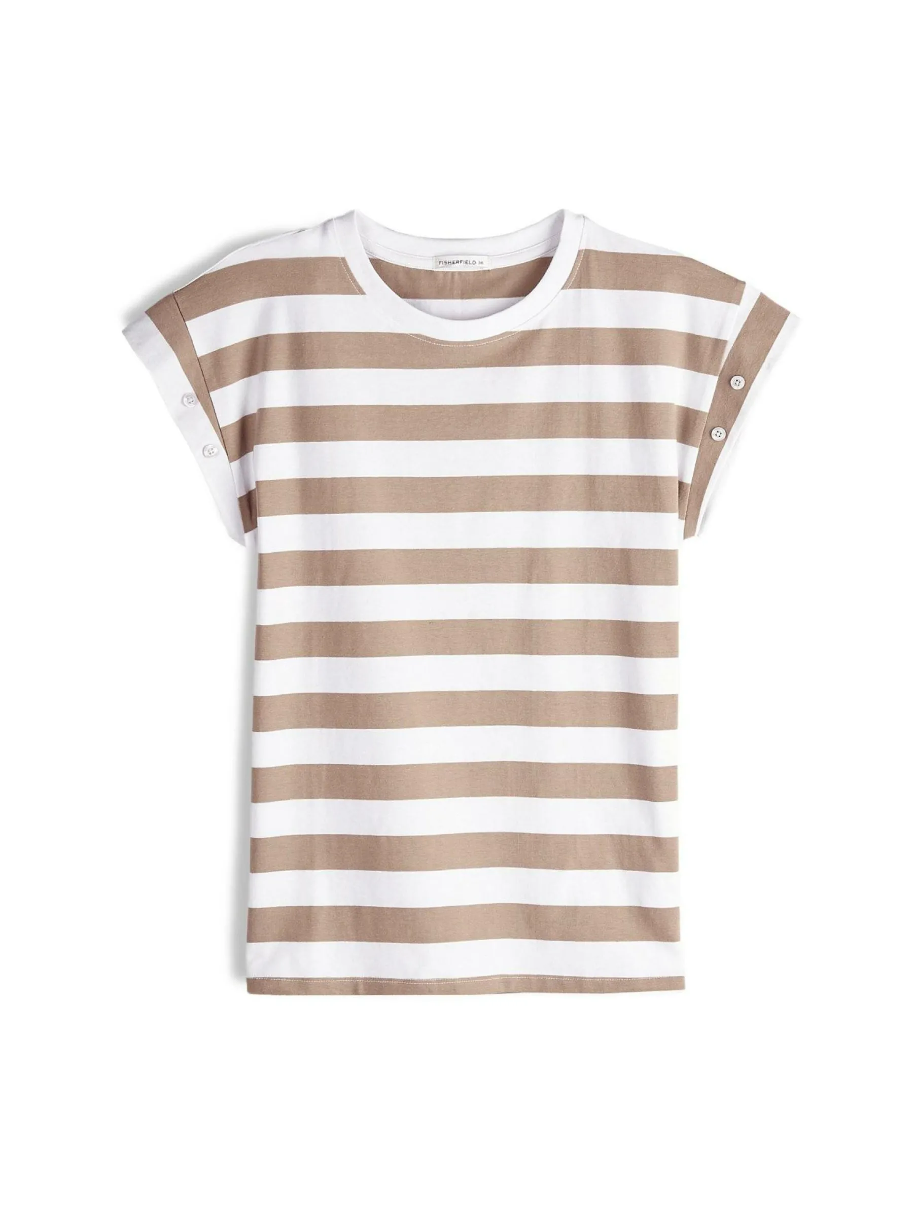 Kolor: beżowyKrój: regularTyp: koszulkaRekaw: krótki rękawDługość: krótkiPattern style: w prążkiDetal: nad gł…