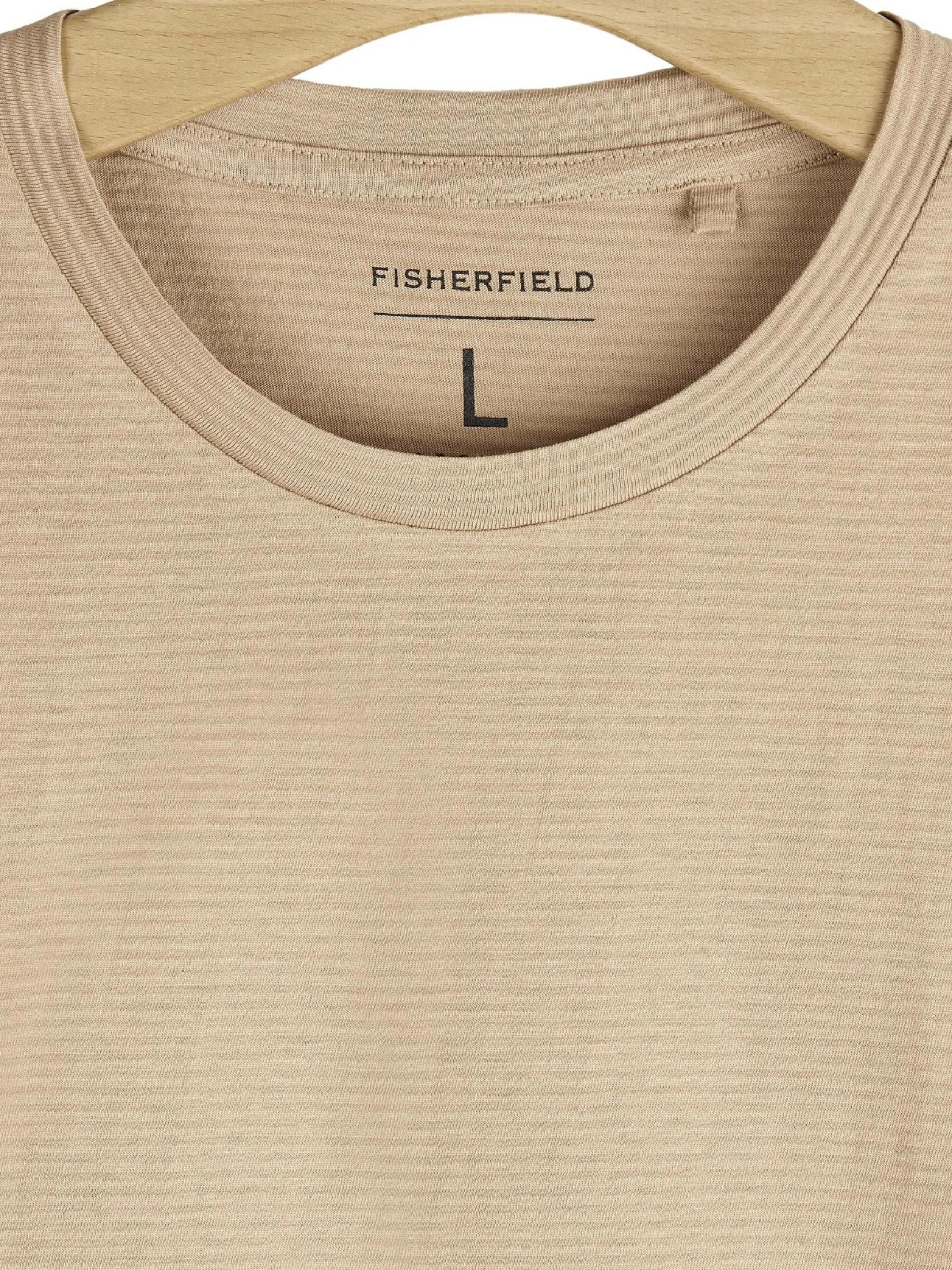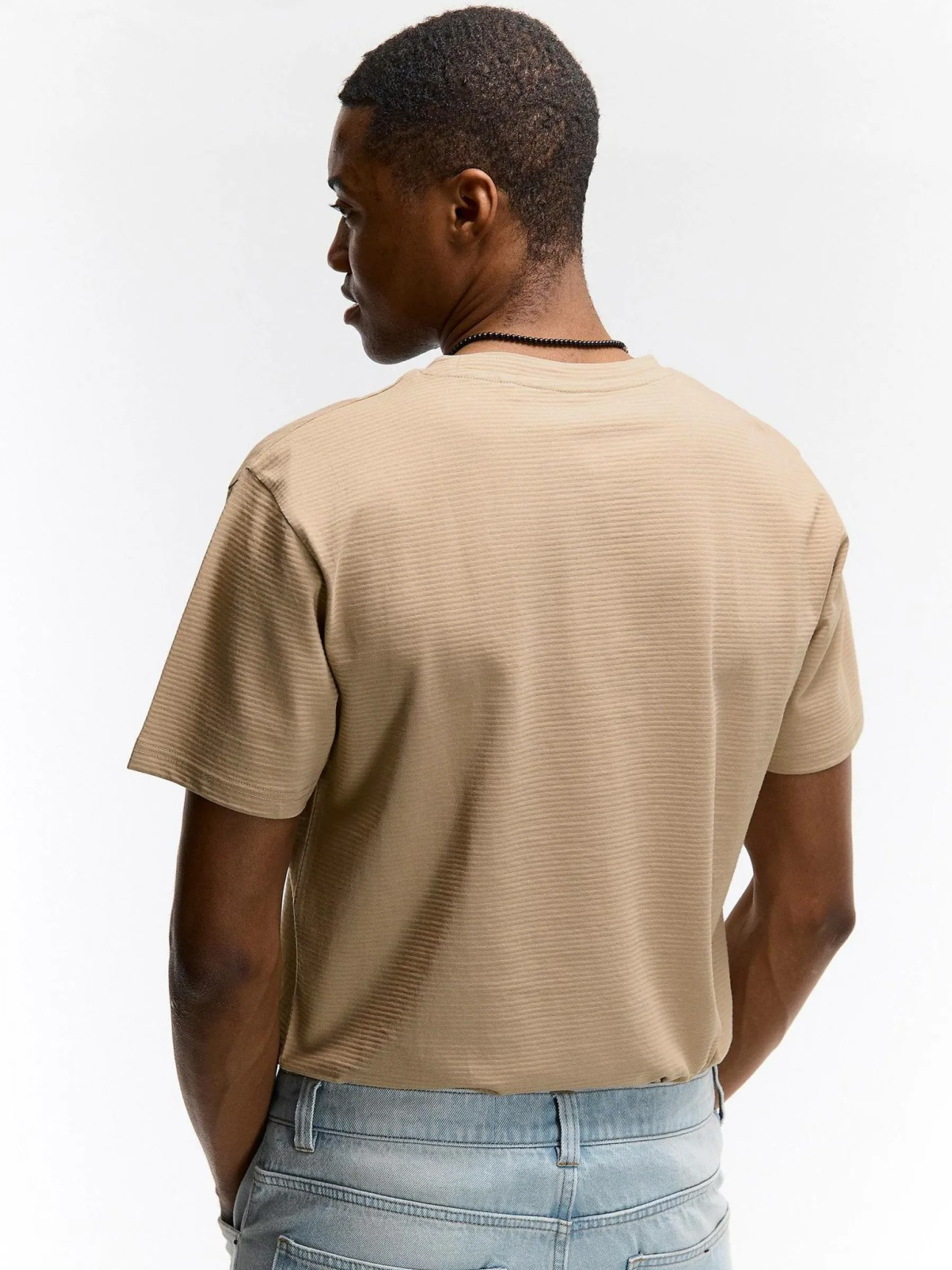 Kolor: beżowyKrój: regularTyp: koszulkaRekaw: krótki rękawPattern style: pojedynczy kolor, żebrowanyDetal: nad gło…