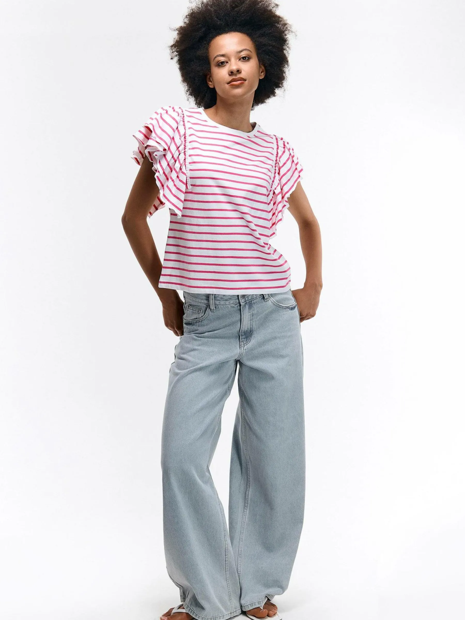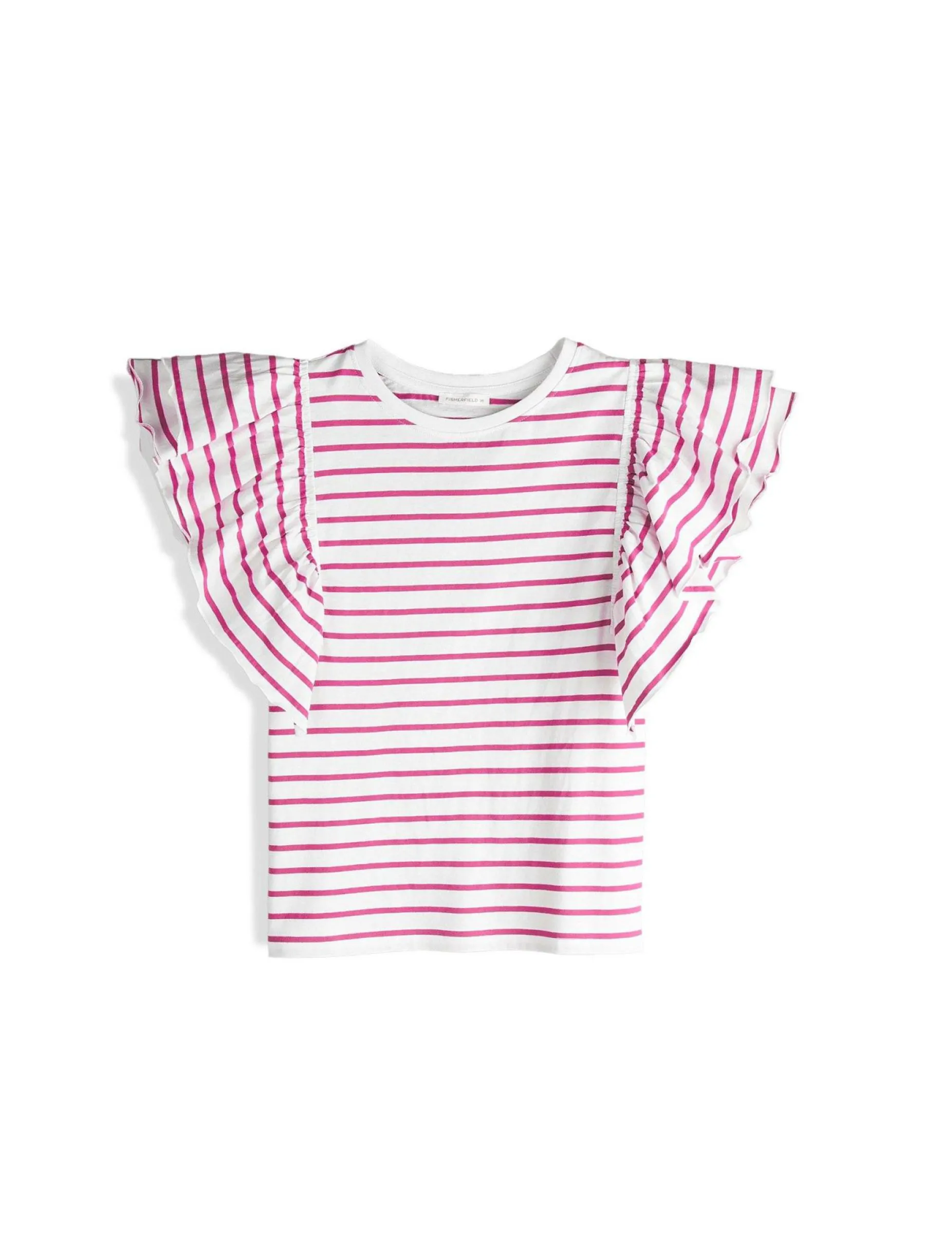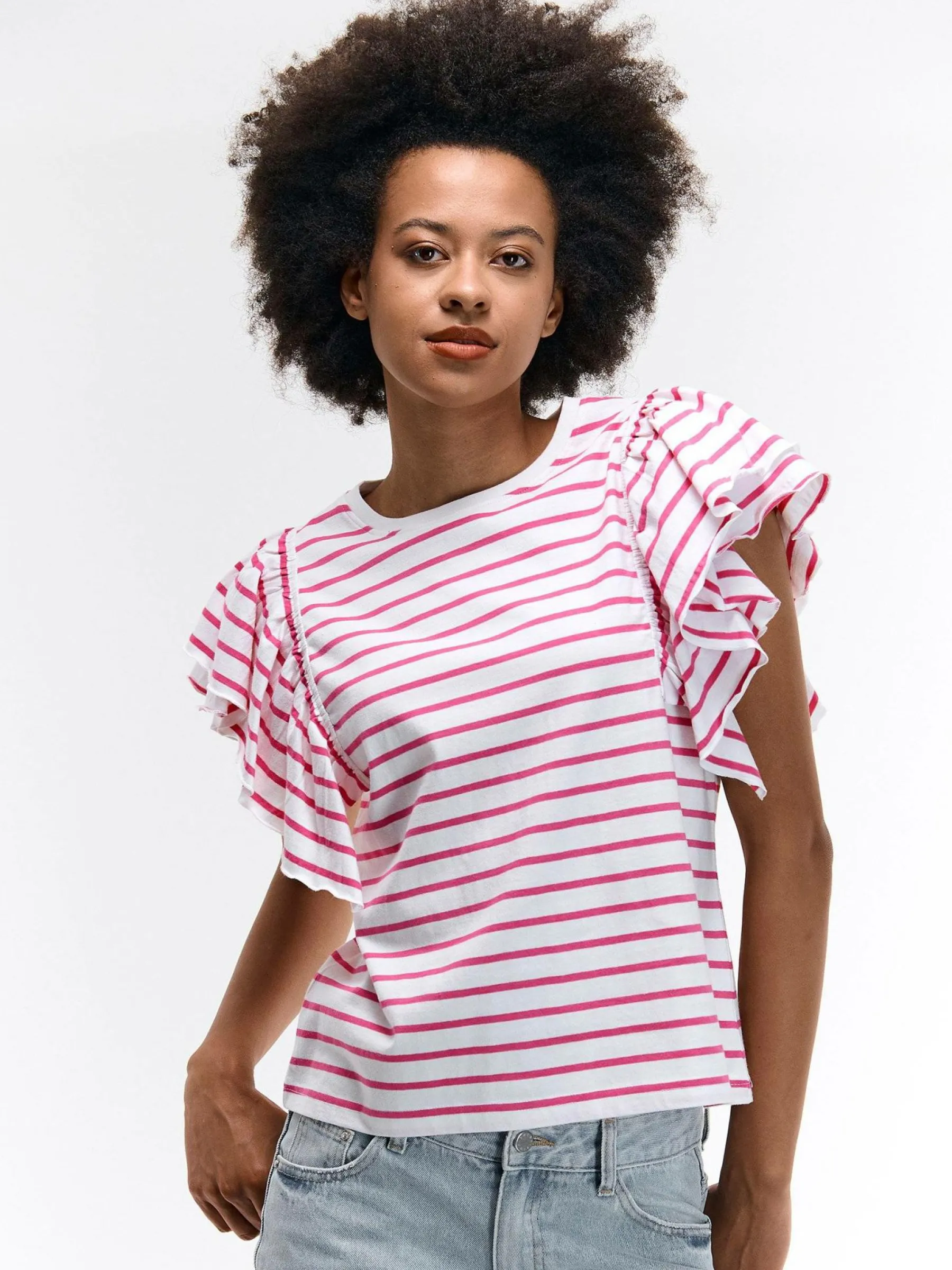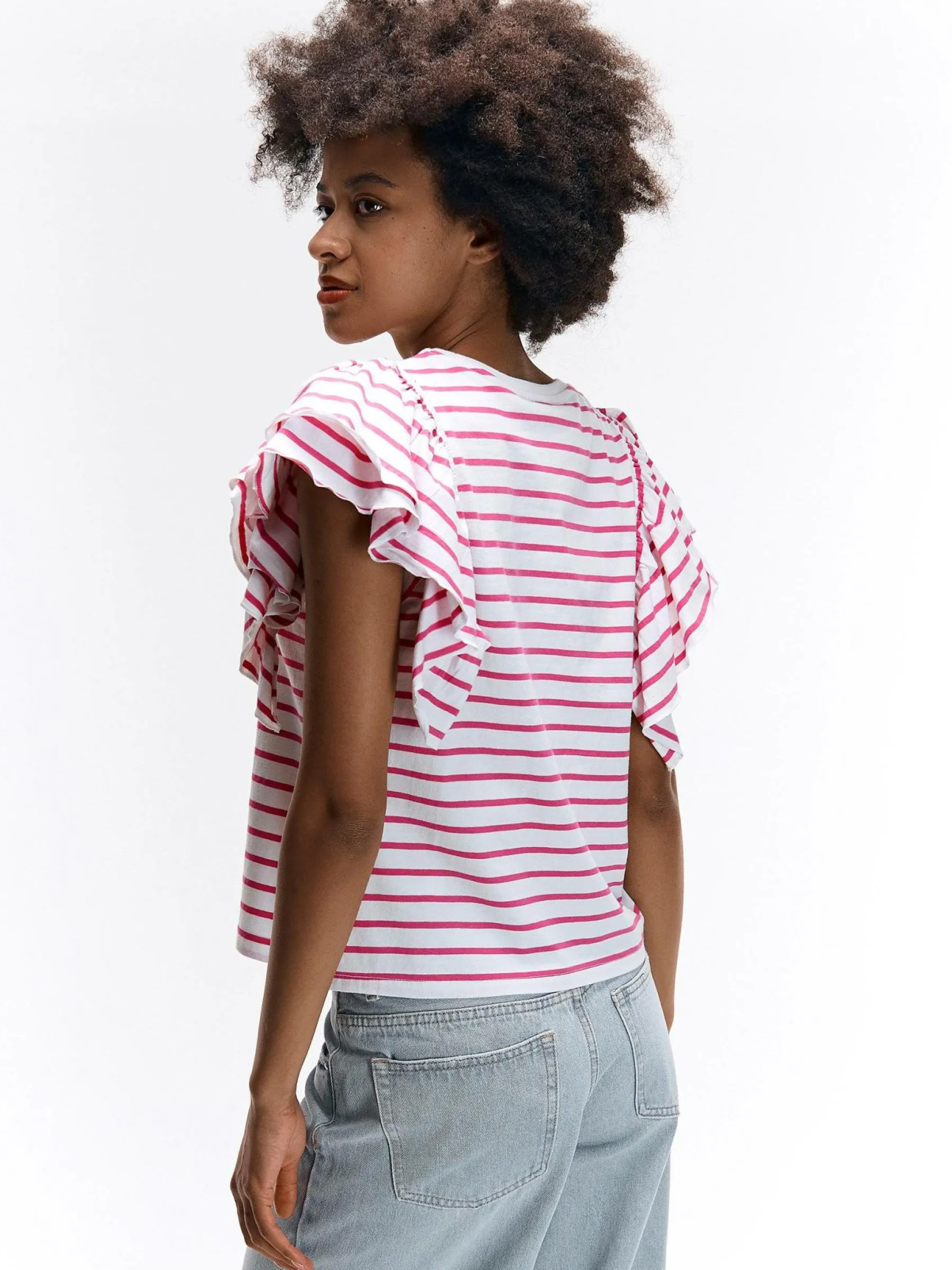 Kolor: różowyKrój: z falbanąTyp: koszulkaRekaw: krótki rękawDługość: krótkiPattern style: w prążkiDetal: nad…