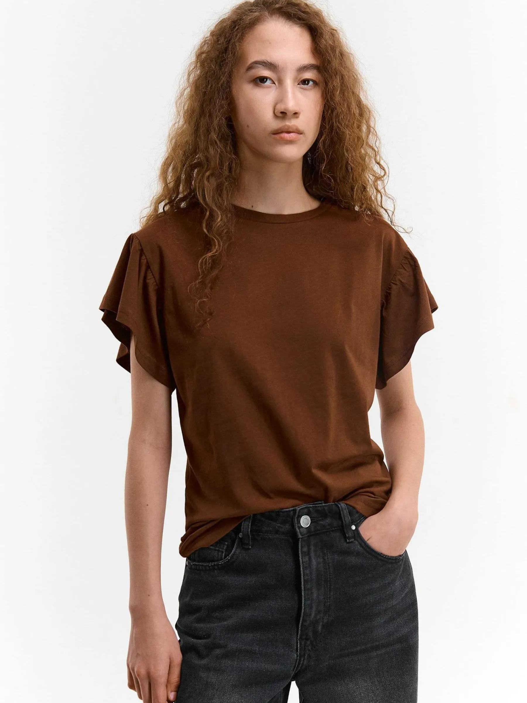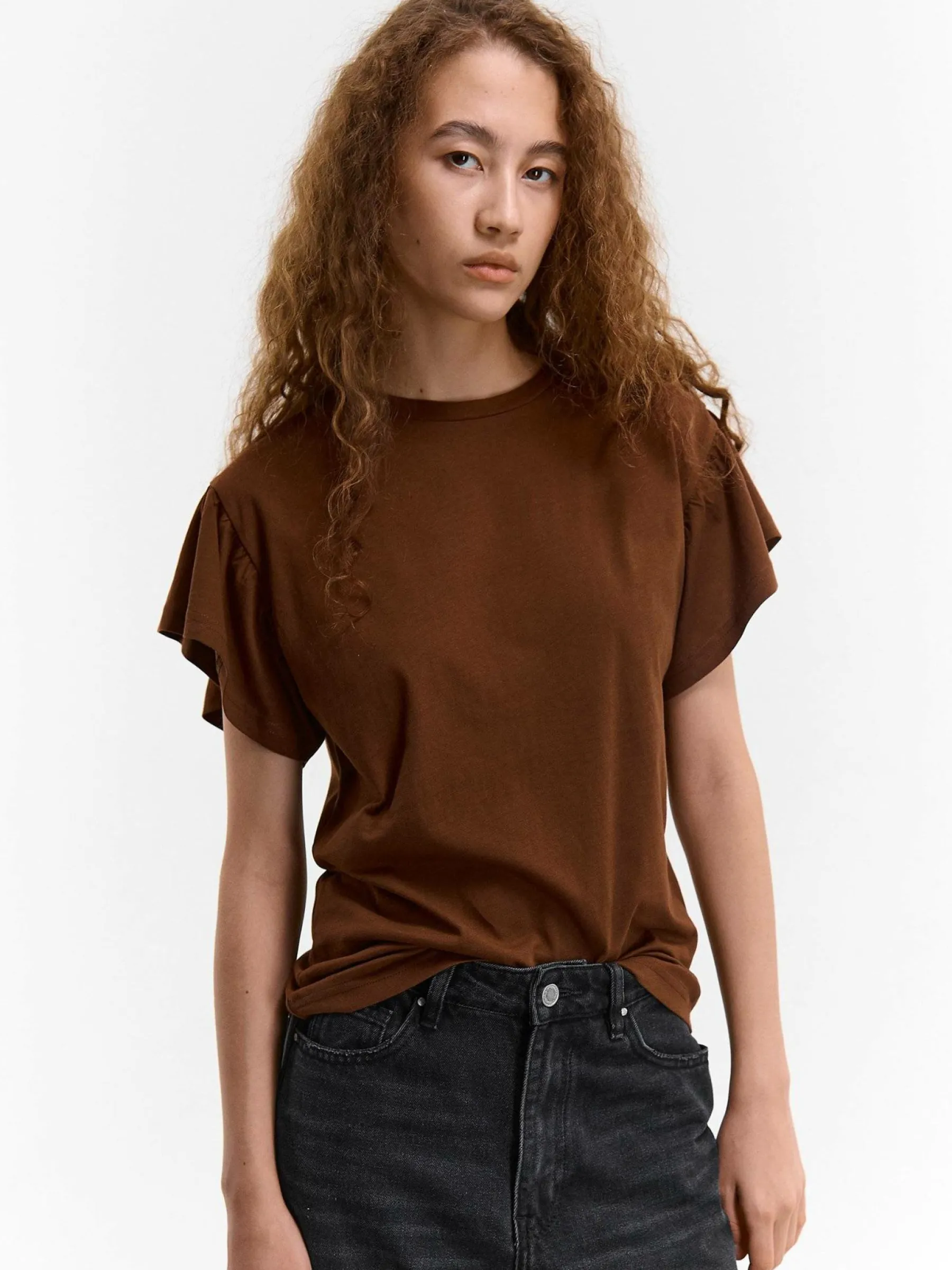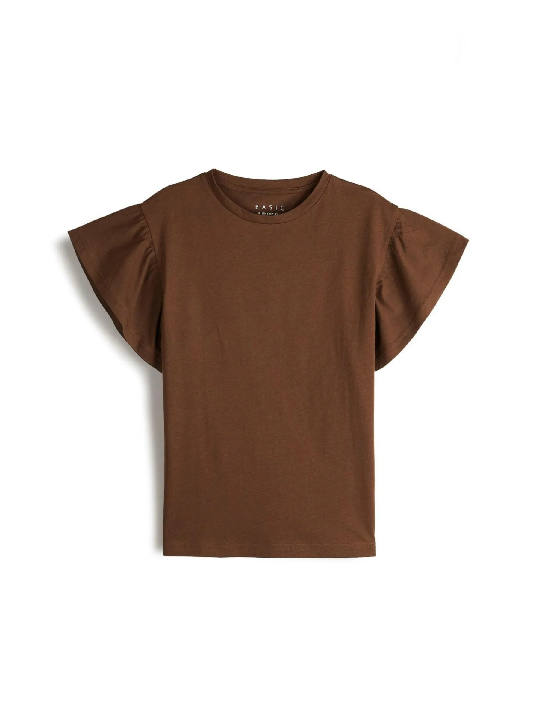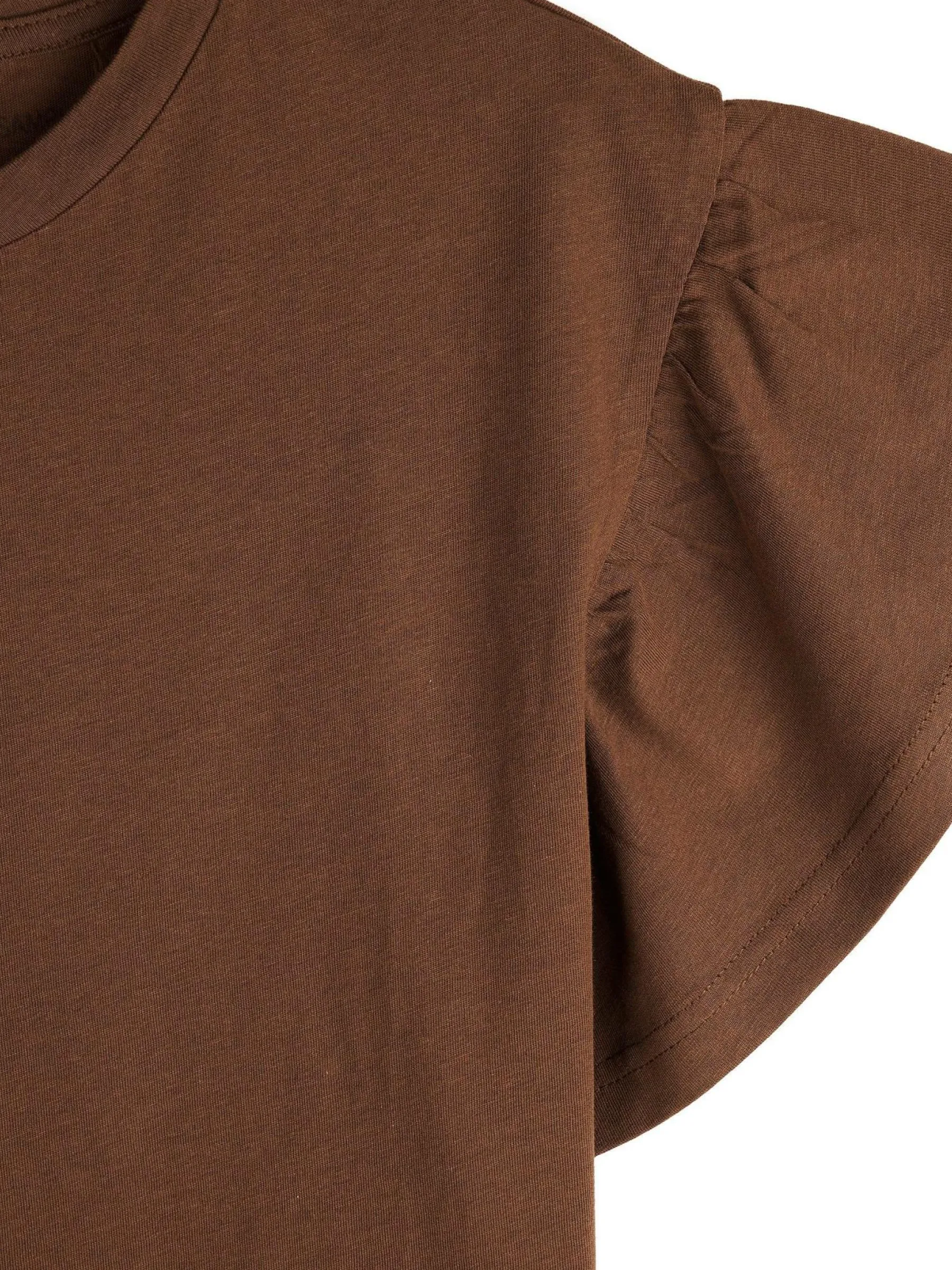 Kolor: brązowyKrój: z falbanąTyp: koszulkaRekaw: krótki rękawDługość: krótkiPattern style: pojedynczy kolorDeta…