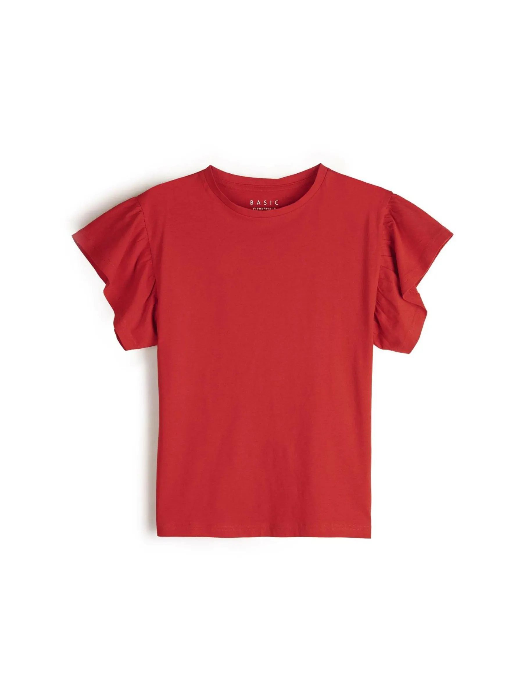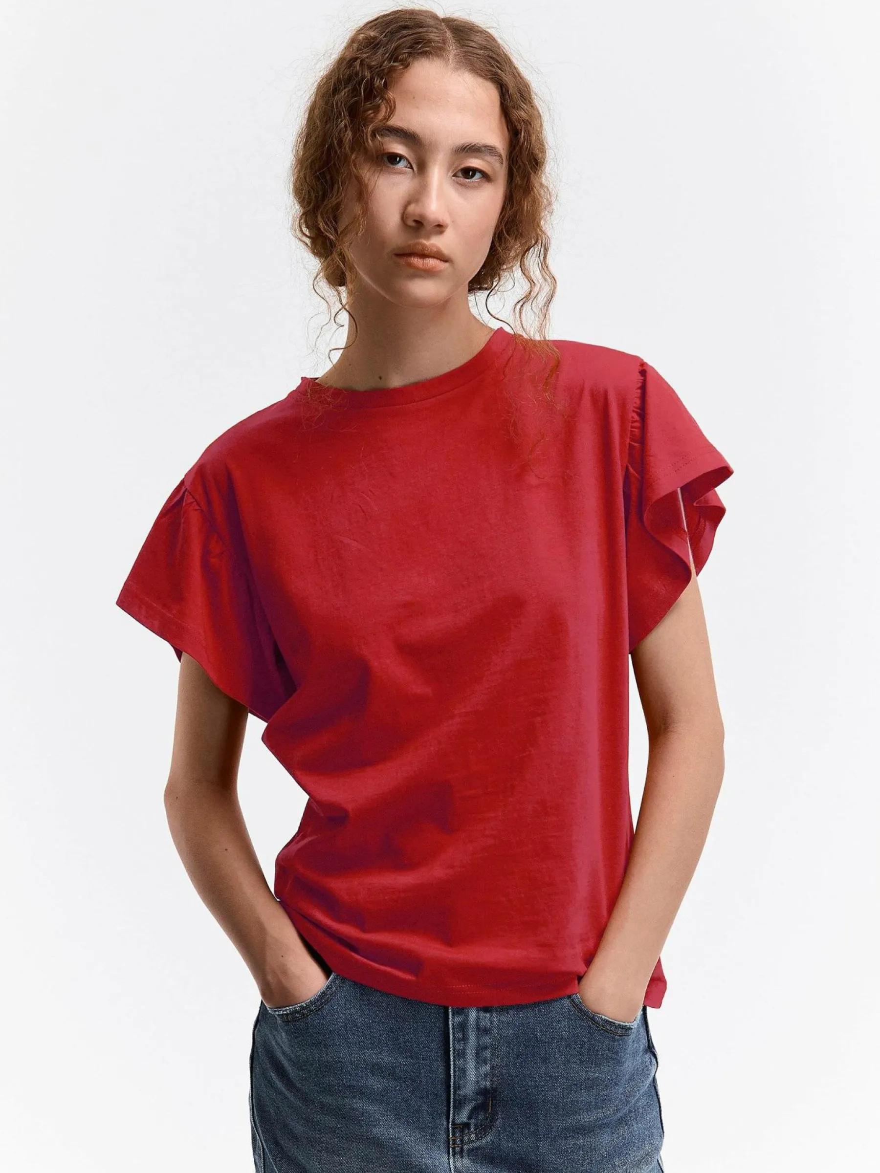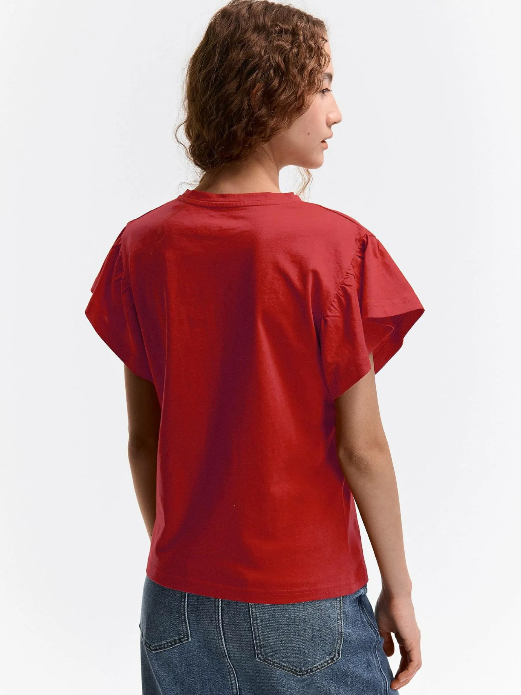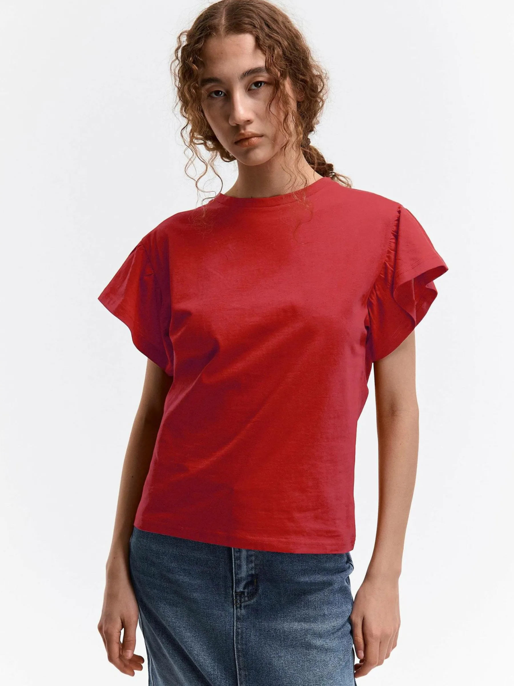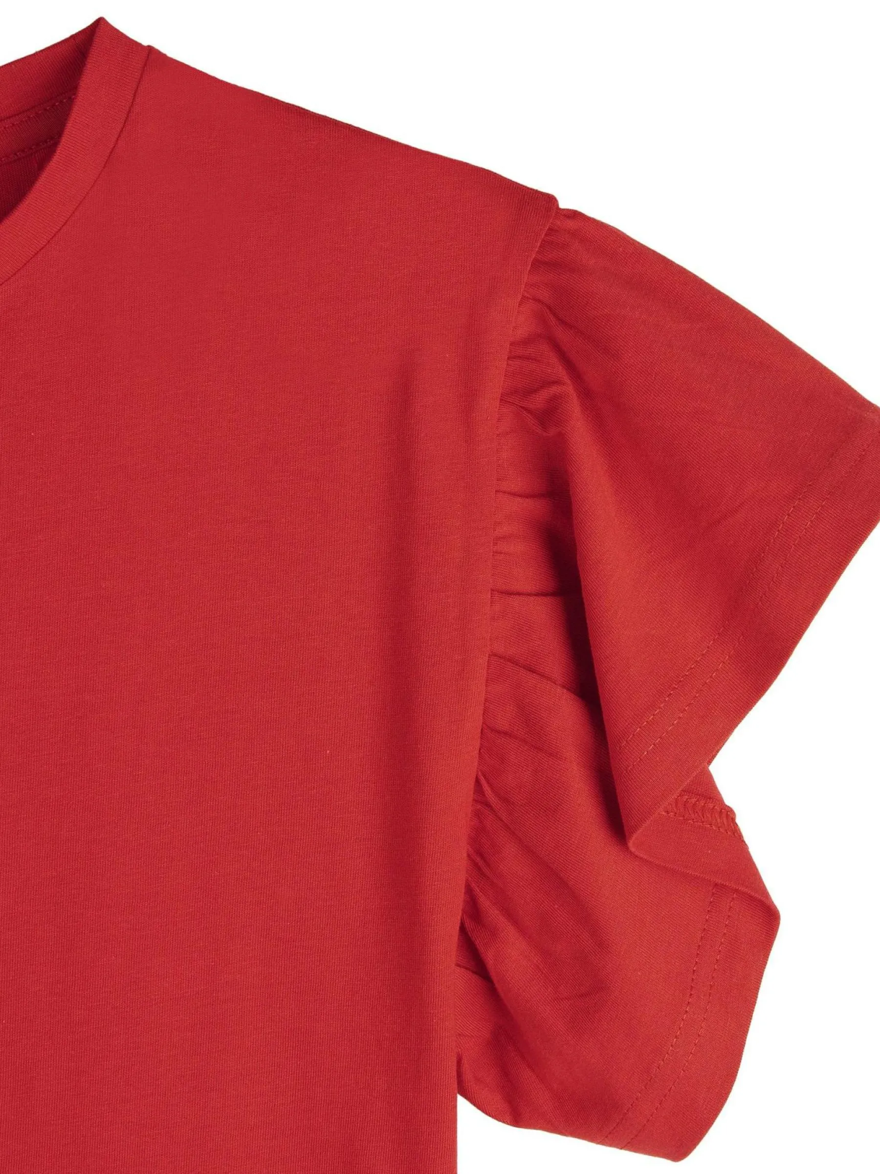 Kolor: czerwonyKrój: z falbanąTyp: koszulkaRekaw: krótki rękawDługość: krótkiPattern style: pojedynczy kolorDeta…