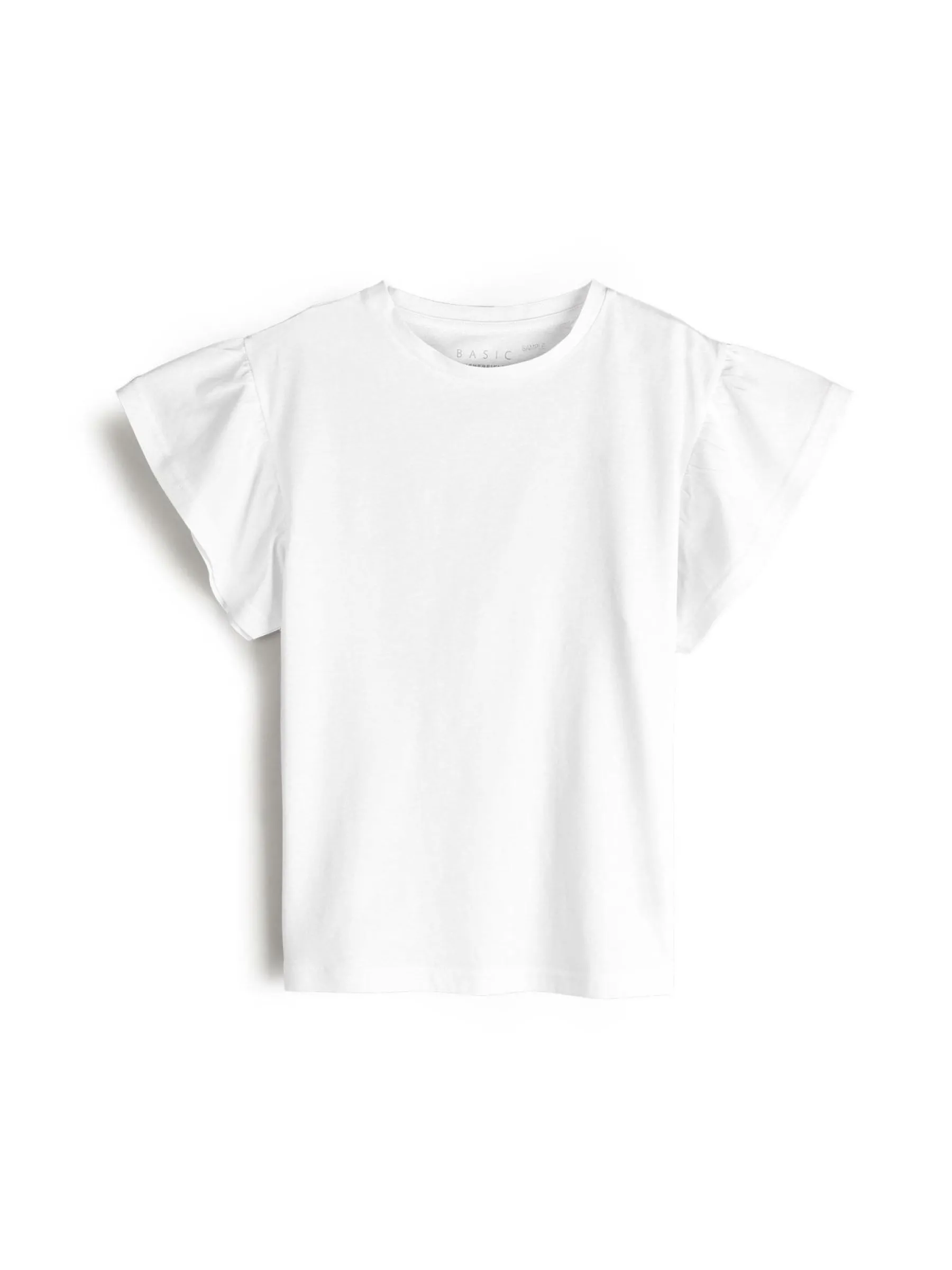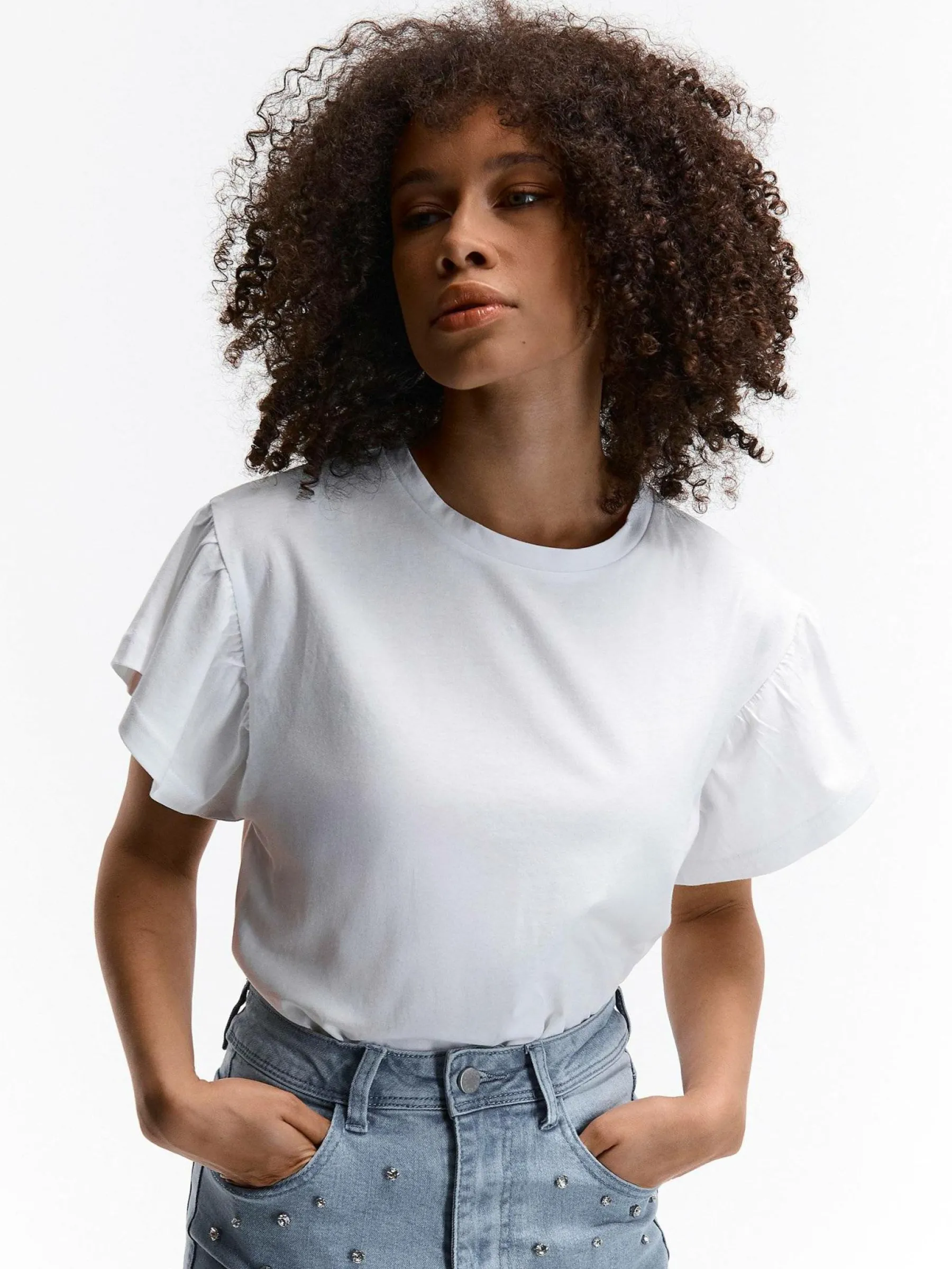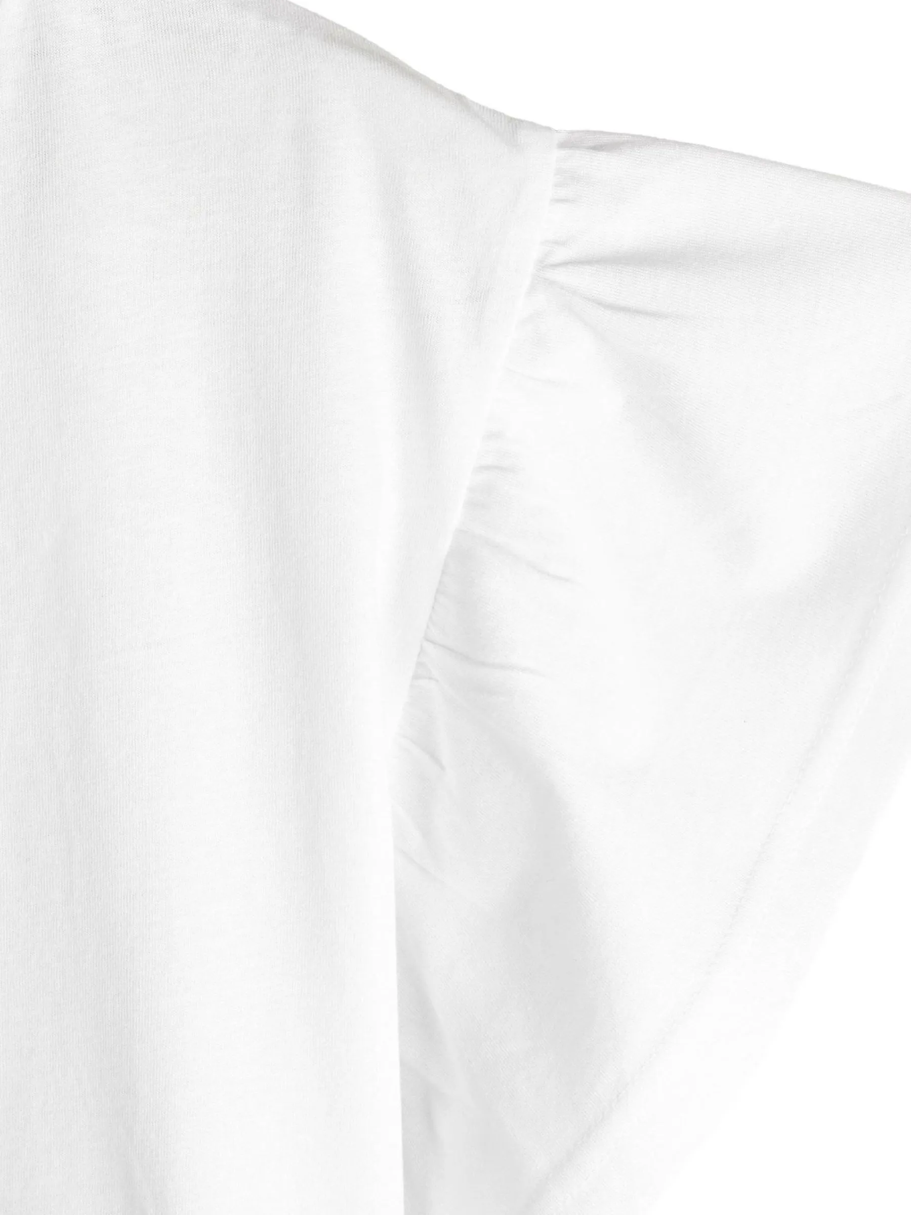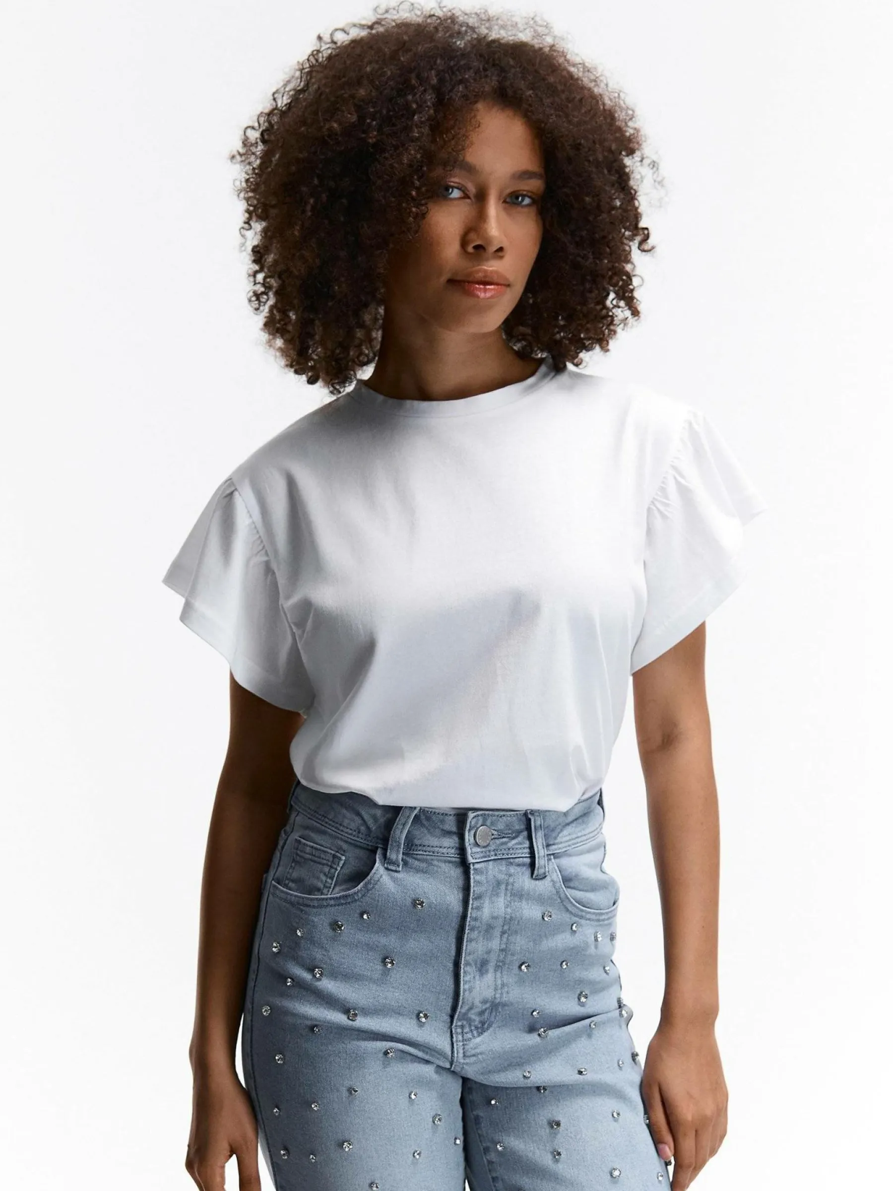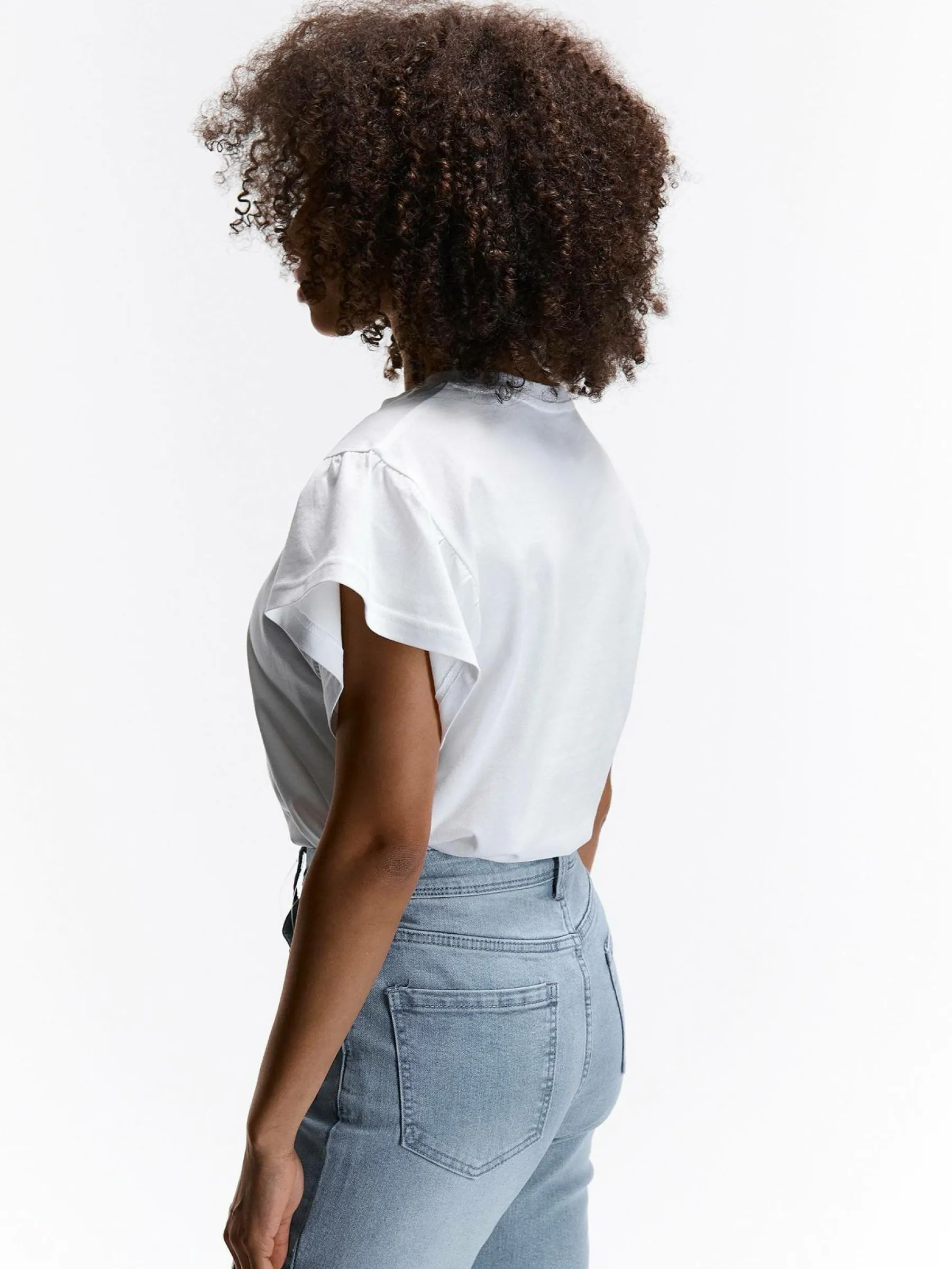 Kolor: białyKrój: z falbanąTyp: koszulkaRekaw: krótki rękawDługość: krótkiPattern style: pojedynczy kolorDetal:…